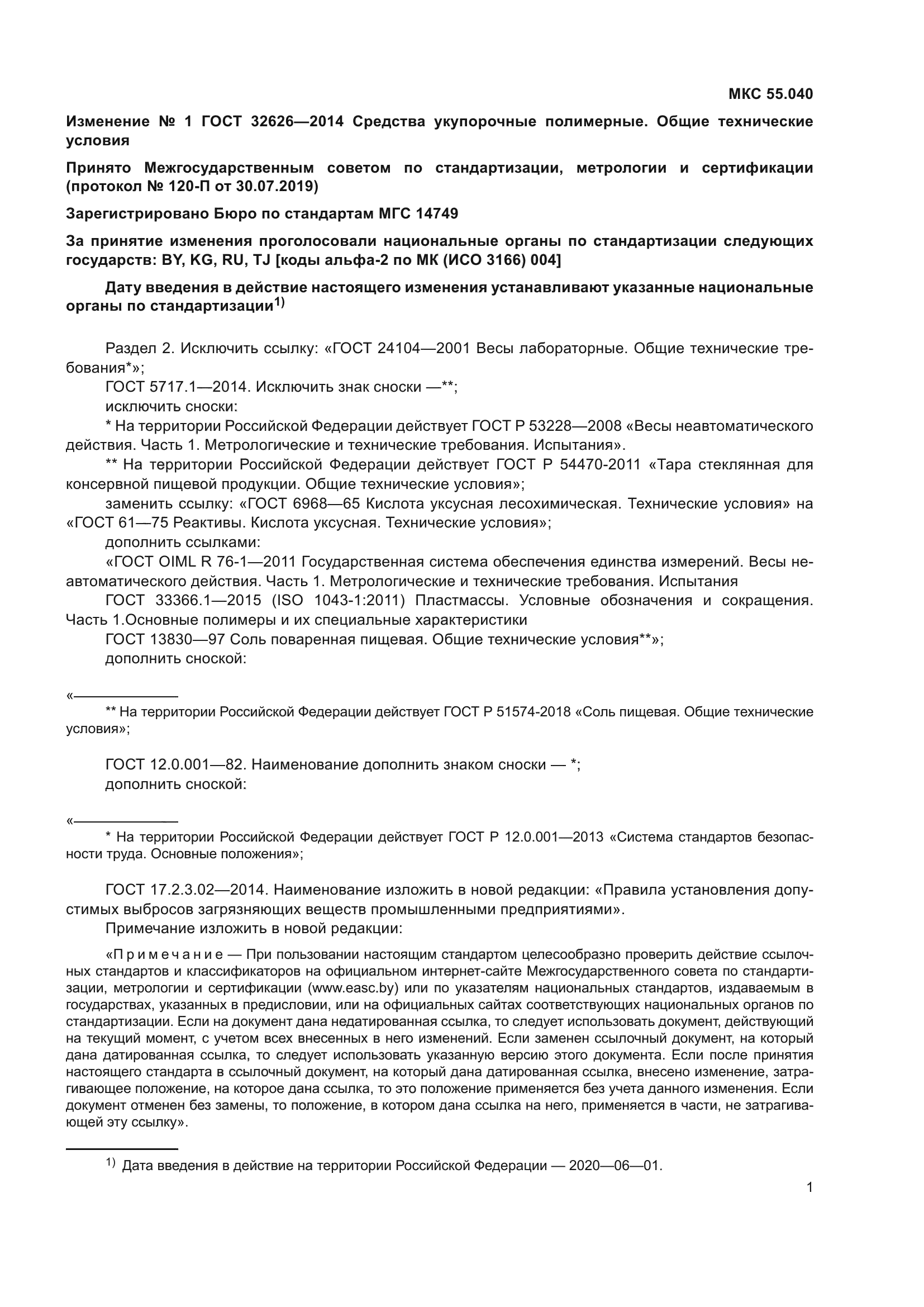| Приложение №1: | Изменение к ГОСТ 32626-2014. Изменены ссылочные НД; Текстовое изменение |