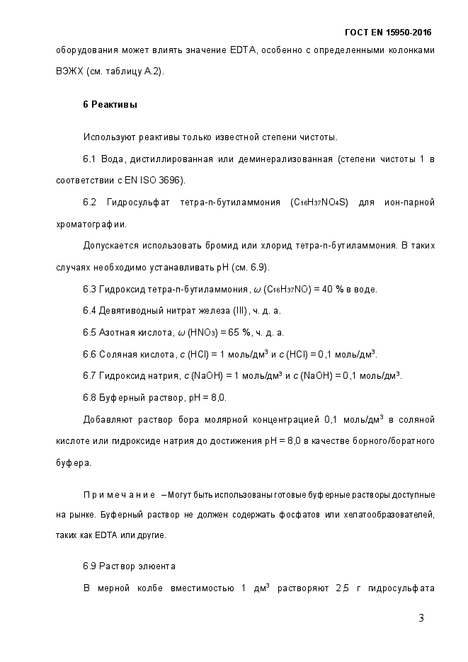 | Название рус.: | Удобрения. Определение N-(1,2-дикарбоксиэтила)-D,L-аспаргиновой кислоты методом высокоэффективной жидкостной хроматографии | | Дата актуализации текста: | 01.12.2016 | | Дата актуализации описания: | 01.07.2023 | | Дата регистрации: | 29.03.2016 | | Дата издания: | 05.11.2020 | | Дата введения: | 01.03.2017 | | Аутентичен стандартам: | EN 15950:2010 | | Нормативные ссылки: | EN 1482-2:2007;EN 12944-1:1999;EN 12944-2:1999;EN ISO 3696:1995 | | Область применения: | Настоящий стандарт устанавливает метод определения N-(1,2-дикарбоксиэтила)-D,L-аспаргиновой кислоты (иминодиянтарной кислоты (IDHA))в удобрениях. Метод применим ко всем удобрениям, содержащим IDHA как хелатообразователь, в количестве больше 0,5 % (г/100 г) | |