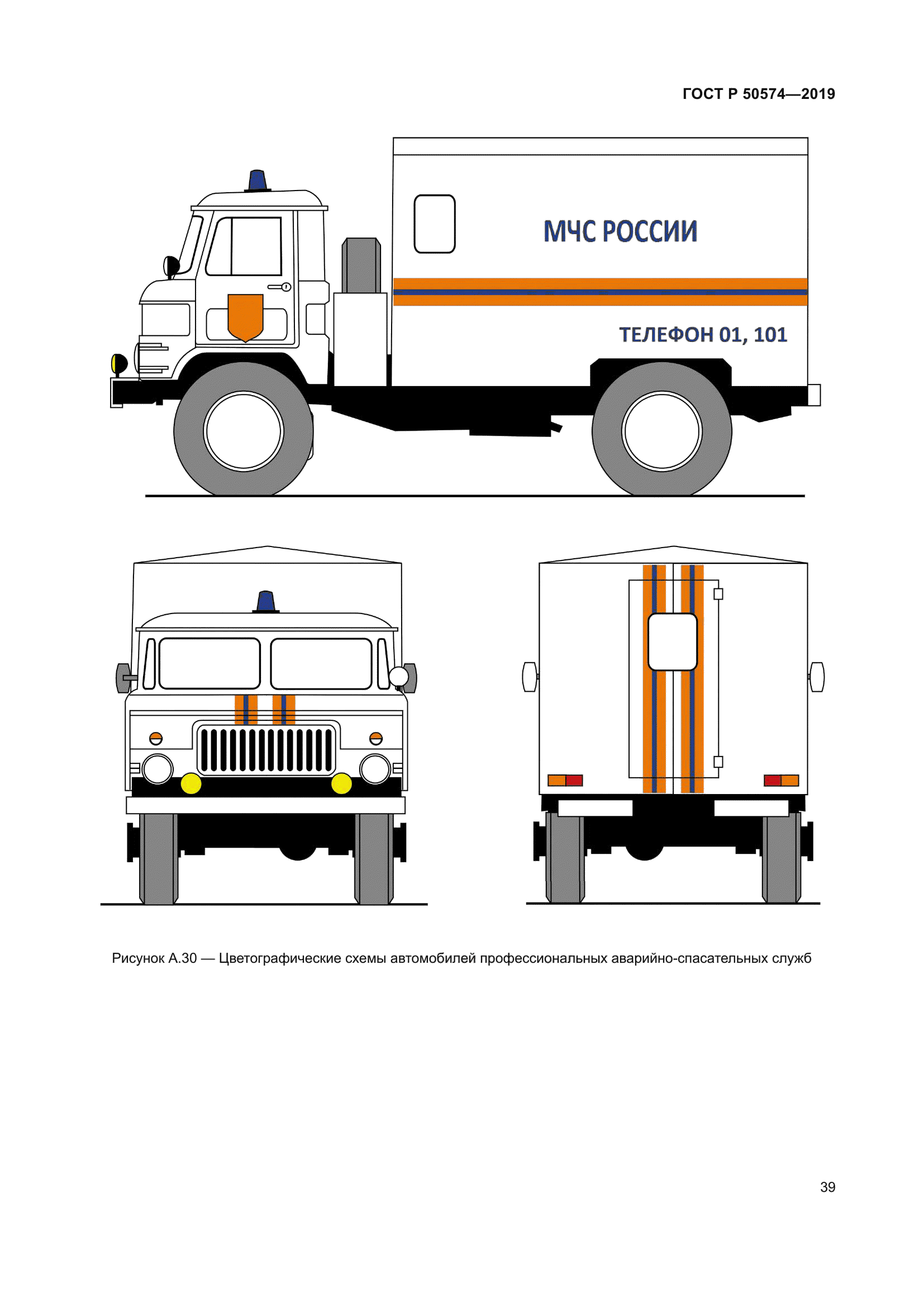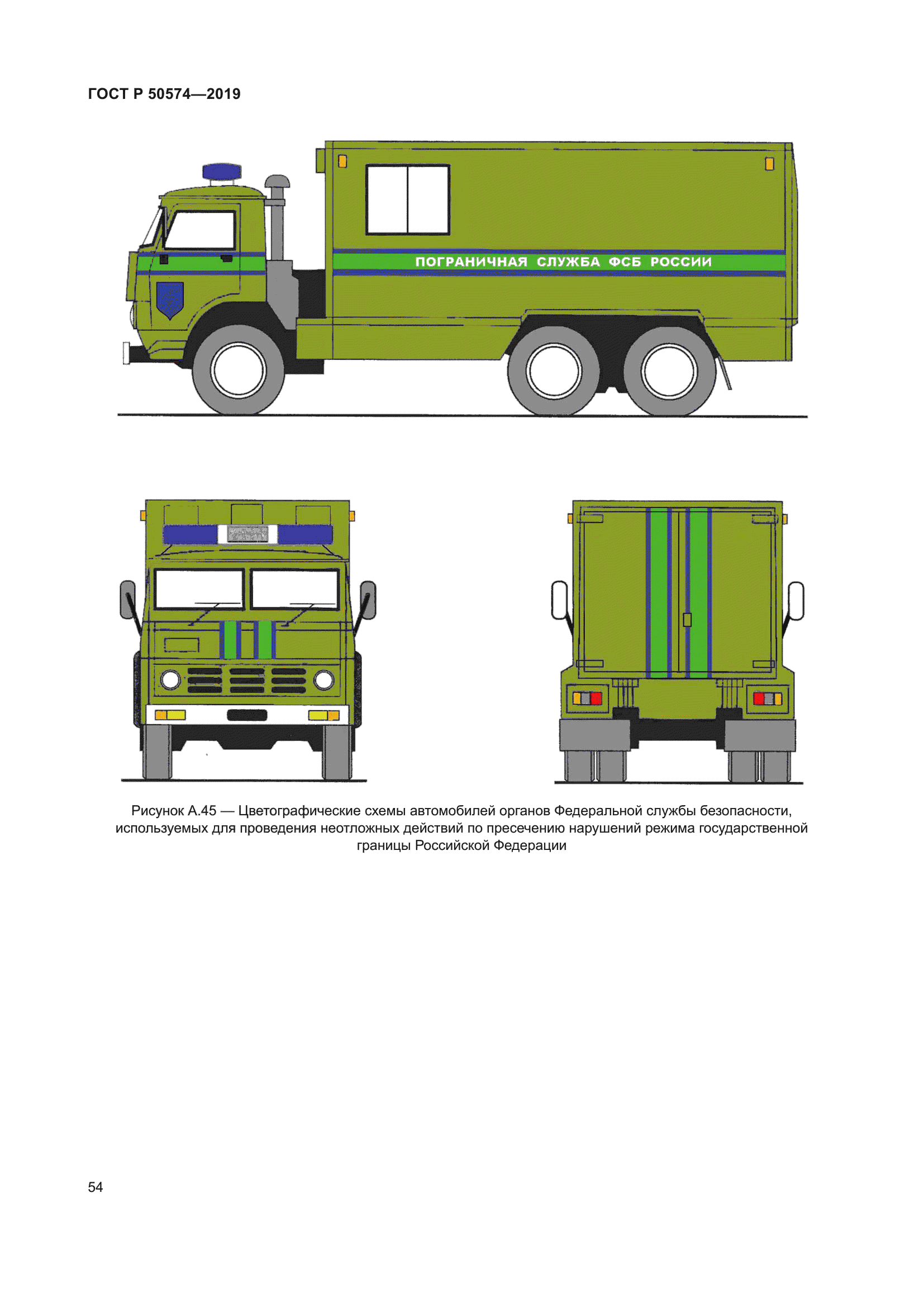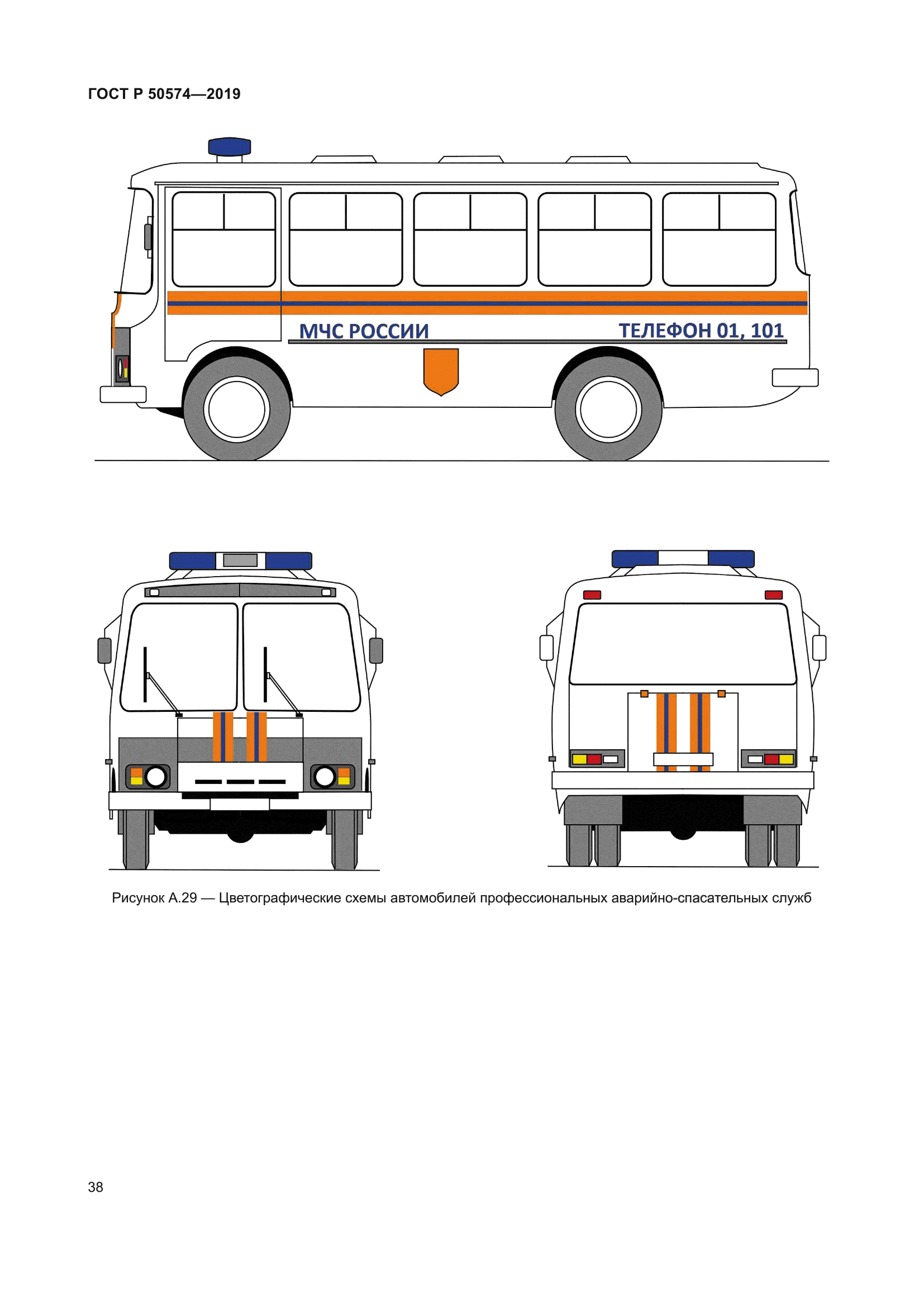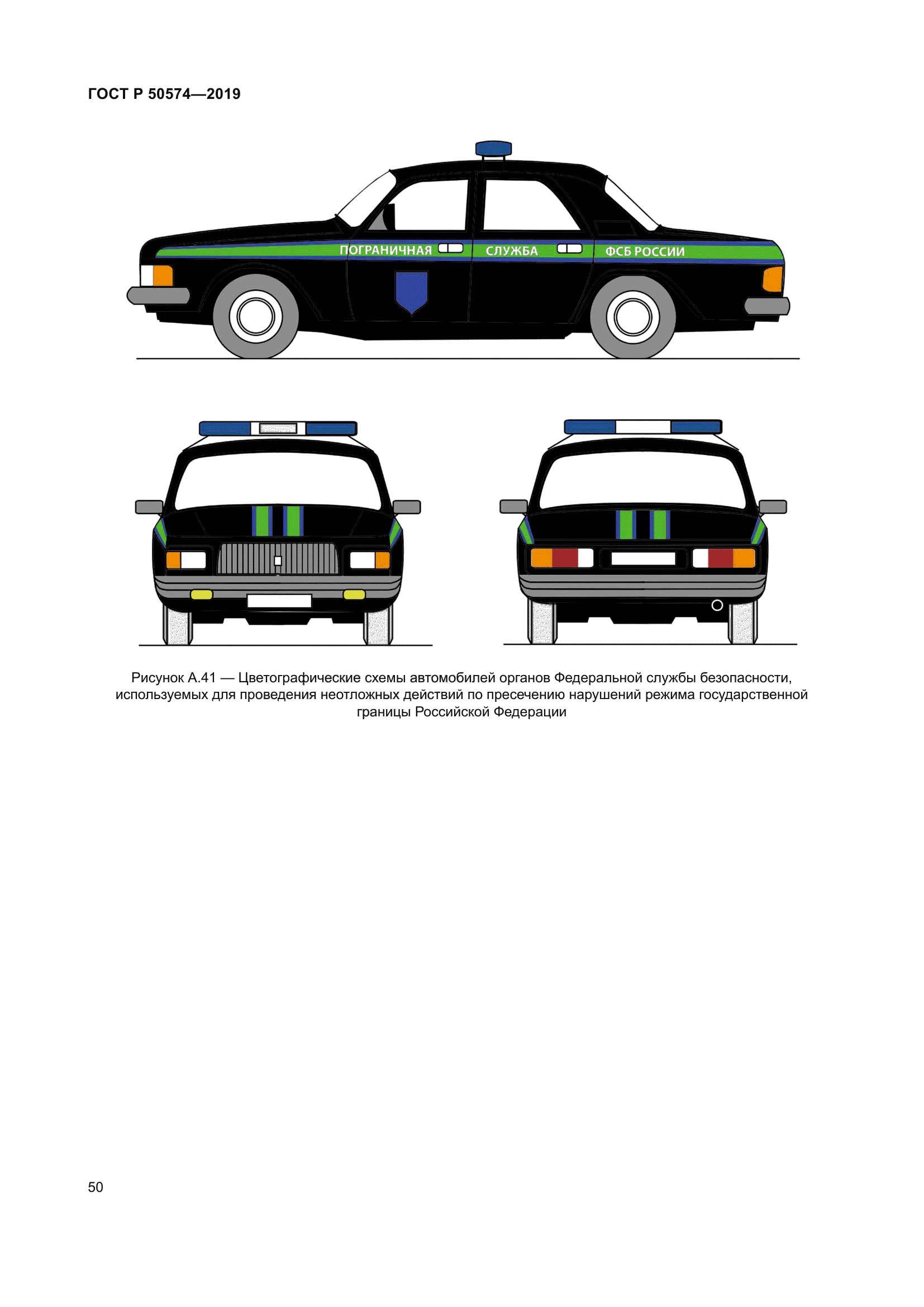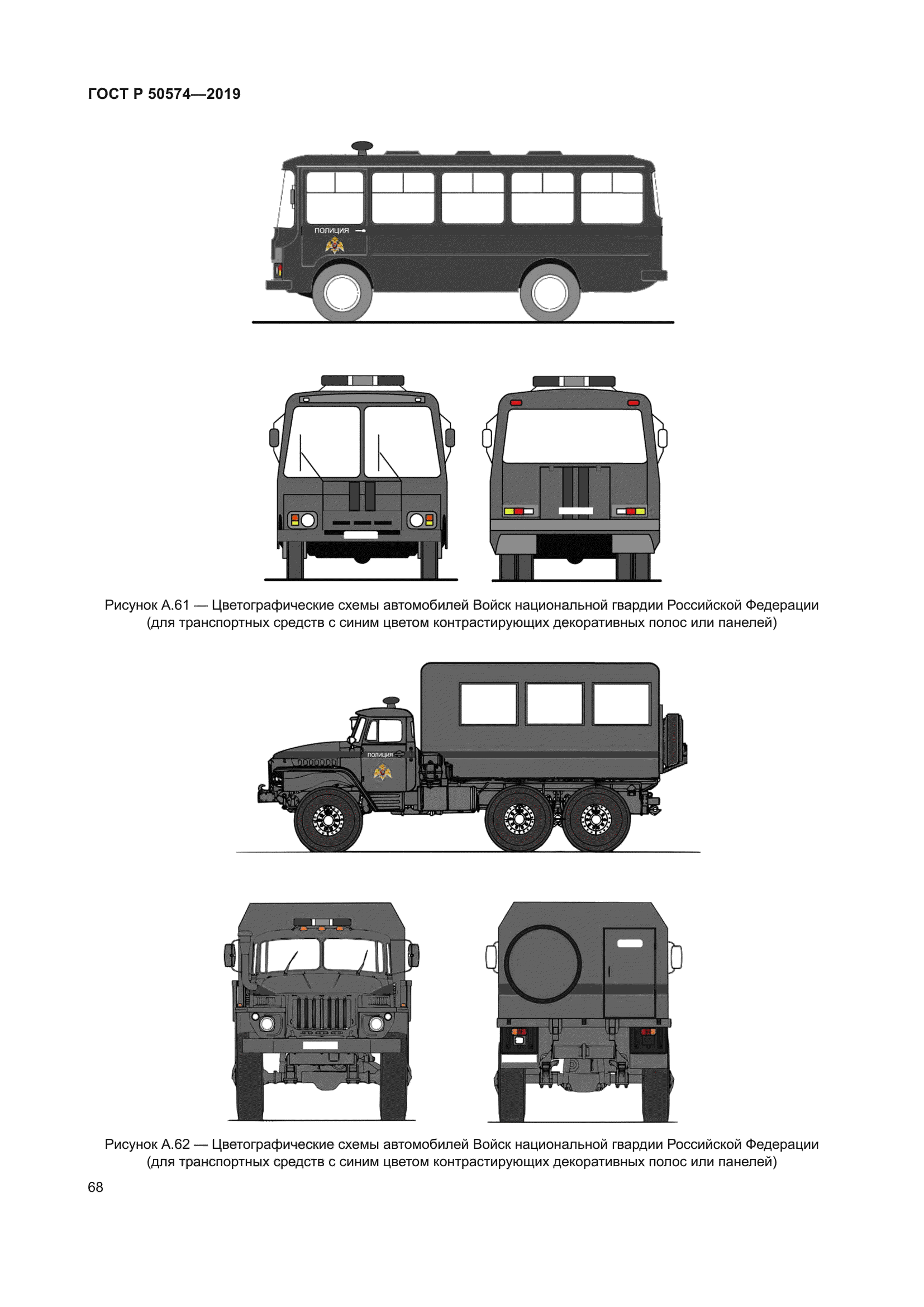 | Название рус.: | Автомобили, автобусы и мотоциклы оперативных служб. Цветографические схемы, опознавательные знаки, надписи, специальные световые и звуковые сигналы. Общие требования | | Название англ.: | Automobiles, buses and motorcycles of emergency services. Colours diagrams, identification symbols, inscriptions, special light and sound signals. General requirements | | Дата актуализации текста: | 01.06.2024 | | Дата актуализации описания: | 01.01.2024 | | Дата издания: | 04.03.2019 | | Дата введения: | 01.07.2019 | | Код ОКП: | 452300 | | Взамен: | ГОСТ Р 50574-2002 | | Нормативные ссылки: | ГОСТ 9.032; ГОСТ 19715; ГОСТ Р 52290; ГОСТ Р 52662 | | Область применения: | Настоящий стандарт распространяется на автомобили, автобусы и мотоциклы, оборудованные в соответствии с назначением и принадлежащие оперативным службам: а) скорой медицинской помощи; б) пожарной охраны; в) полиции; г) военной автомобильной инспекции (ВАИ); е) аварийно-спасательным; ж) органов Федеральной службы безопасности Российской Федерации (ФСБ России); з) следственных органов Следственного комитета Российской Федерации. и) военной полиции Вооруженных сил Российской Федерации; к) Войск национальной гвардии Российской Федерации. Стандарт устанавливает общие требования к цветографическим схемам наружных поверхностей транспортных средств оперативных служб и их элементам, а также технические требования к устанавливаемым специальным световым и звуковым сигналам | | Приложение №1: | Изменение №1 к ГОСТ Р 50574-2019 | | Приложение №2: | Изменение №2 к ГОСТ Р 50574-2019 | | Приложение №3: | Изменение №3 к ГОСТ Р 50574-2019 | | Приложение №4: | Поправка к ГОСТ Р 50574-2019 | | Приложение №5: | Поправка к ГОСТ Р 50574-2019 | |