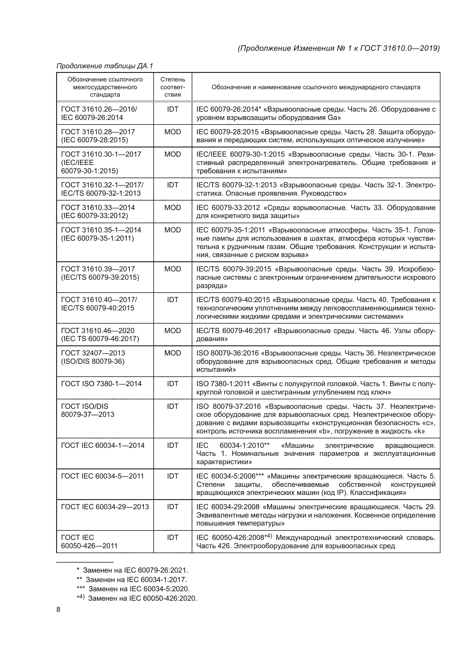 | Нормативные ссылки: | ГОСТ 1481; ГОСТ 4647; ГОСТ 4648; ГОСТ 5915; ГОСТ 5927; ГОСТ 7795; ГОСТ 7796; ГОСТ 7798; ГОСТ 7805; ГОСТ 8724; ГОСТ 8878; ГОСТ 10605; ГОСТ 11074; ГОСТ 11075; ГОСТ 11262; ГОСТ 11284; ГОСТ 11738; ГОСТ 12876; ГОСТ 14254; ГОСТ 16093; ГОСТ 21341; ГОСТ 27174; ГОСТ 28964; ГОСТ 31610.5; ГОСТ 31610.6/IEC 60079-6:2015; ГОСТ 31610.7; ГОСТ 31610.11; ГОСТ 31610.13; ГОСТ 31610.15/IEC 60079-15:2010; ГОСТ 31610.18/IEC 60079-18:2014; ГОСТ 31610.20-1/IEC 60079-20-1:2010; ГОСТ 31610.20-2/ISO/IEC 80079-20-2:2016; ГОСТ 31610.26/IEC 60079-26:2014; ГОСТ 31610.28; ГОСТ 31610.30-1; ГОСТ 31610.32-1/IEC/TS 60079-32-1:2013; ГОСТ 31610.33; ГОСТ 31610.35-1; ГОСТ 31610.39; ГОСТ 31610.40/IEC/TS 60079-40:2015; ГОСТ 32407;ГОСТ ISO 7380-1;ГОСТ ISO/DIS 80079-37;ГОСТ IEC 60034-1;ГОСТ IEC 60034-5;ГОСТ IEC 60034-29;ГОСТ IEC 60079-1;ГОСТ IEC 60079-2;ГОСТ IEC 60079-14;ГОСТ IEC 60079-25; ГОСТ Р МЭК 60079-25-2012;ГОСТ IEC 60079-29-1;ГОСТ IEC 60079-31;ГОСТ IEC 60079-35-2;ГОСТ IEC 60947-1;ГОСТ IEC 62626-1; ГОСТ Р ИСО 4029-2013; ГОСТ Р МЭК 60079-20-1-2011; ГОСТ Р ИСО 4014-2013; ГОСТ Р ИСО 4027-2013; ГОСТ Р ИСО 4026-2013; ГОСТ Р ИСО 4028-2013; ГОСТ 31610.46-2020;ГОСТ IEC 60050-426 |