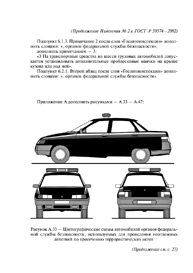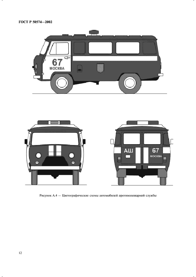 | Название рус.: | Автомобили, автобусы и мотоциклы оперативных служб. Цветографические схемы, опознавательные знаки, надписи, специальные световые и звуковые сигналы. Общие требования | | Название англ.: | Automobiles, buses and motorcycles of emergency services. Colours diagrams, identification symbols, inscriptions, special light and sound signals. General requirements | | Дата актуализации текста: | 06.04.2015 | | Дата актуализации описания: | 01.07.2023 | | Дата издания: | 03.03.2003 | | Дата введения: | 01.01.2004 | | Дата окончания срока действия: | 01.07.2019 | | Код ОКП: | 452330 | | Взамен: | ГОСТ Р 50574-93 | | Заменяющий: | ГОСТ Р 50574-2019 | | Нормативные ссылки: | ГОСТ 9.032-74; ГОСТ 19715-74; ГОСТ Р 12.4.026-2001; ГОСТ Р 41.4-99; ГОСТ Р 41.6-99; ГОСТ Р 41.7-99; ГОСТ Р 41.23-99; ГОСТ Р 41.38-99; ГОСТ Р 41.65-99; ГОСТ Р 41.77-99; ГОСТ Р 41.91-99; ГОСТ Р 41.104-2002; ГОСТ Р 52290-2004 | | Область применения: | Настоящий стандарт распространяется на автомобили, автобусы и мотоциклы, оборудованные в соответствии с назначением и принадлежащие оперативным службам: а) скорой медицинской помощи; б) пожарной охраны; в) милиции; г) военной автомобильной инспекции (ВАИ); д) аварийно-спасательных; е) органов федеральной службы безопасности. Стандарт устанавливает общие требования к цветографическим схемам наружных поверхностей транспортных средств оперативных служб и ее элементам, а также технические требования к устанавливаемым специальным световым и звуковым сигналам. Стандарт не распространяется на транспортные средства оперативных служб, не предназначенные для эксплуатации на автомобильных дорогах общего пользования | | Список изменений: | №1 от 31.03.2009 (рег. 18.12.2008) «Текстовое изменение; Изменены ссылочные НД» №2 от 30.09.2009 (рег. 05.04.2009) «Срок действия продлен» №3 от 31.03.2012 (рег. 15.02.2012) «Срок действия продлен» №4 от 31.03.2013 (рег. 06.03.2013) «Срок действия продлен» | | Приложение №1: | Изменение №1 к ГОСТ Р 50574-2002 | | Приложение №2: | Изменение №2 к ГОСТ Р 50574-2002 | | Приложение №3: | Изменение №3 к ГОСТ Р 50574-2002 | | Приложение №4: | Изменение №4 к ГОСТ Р 50574-2002 | |