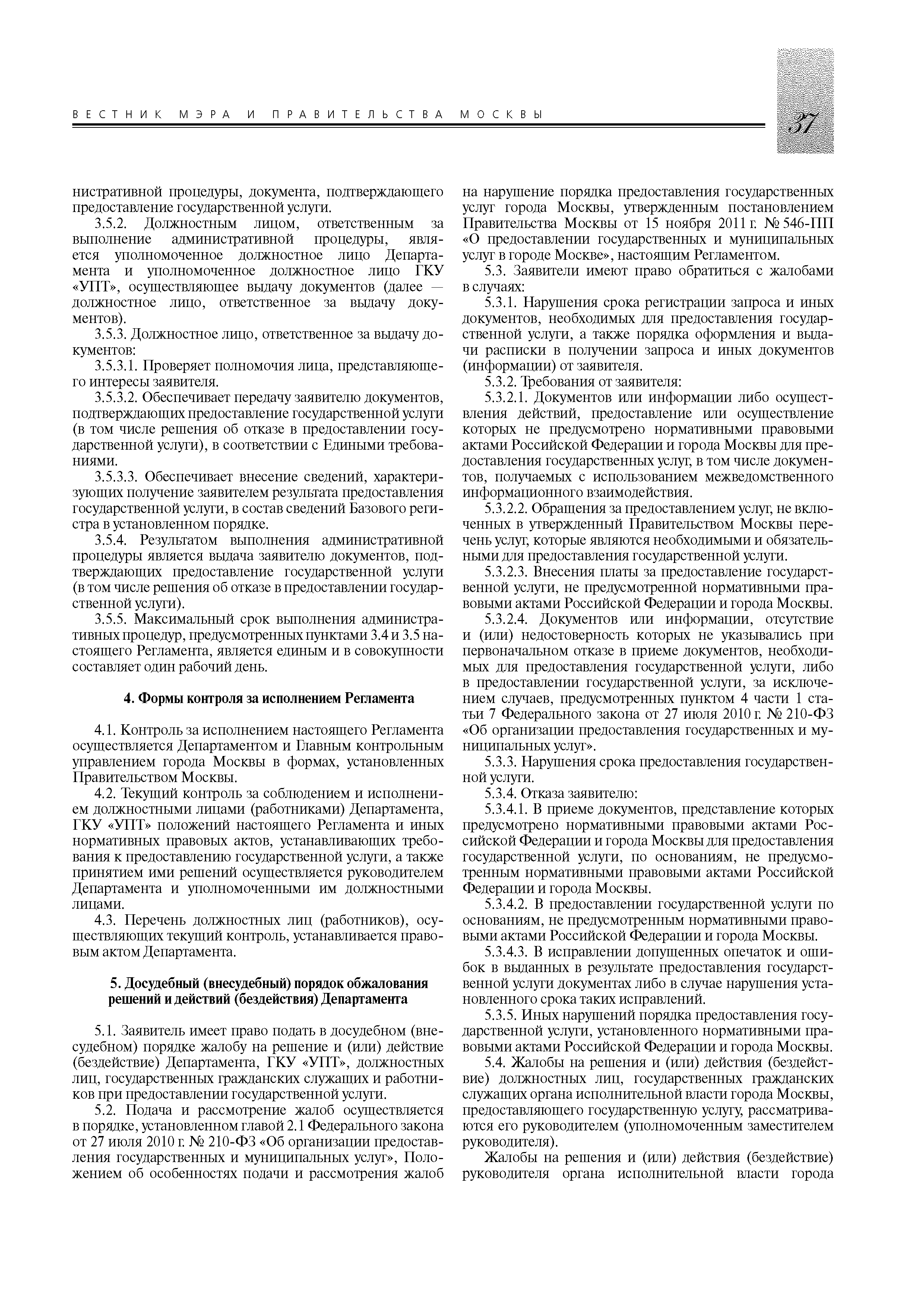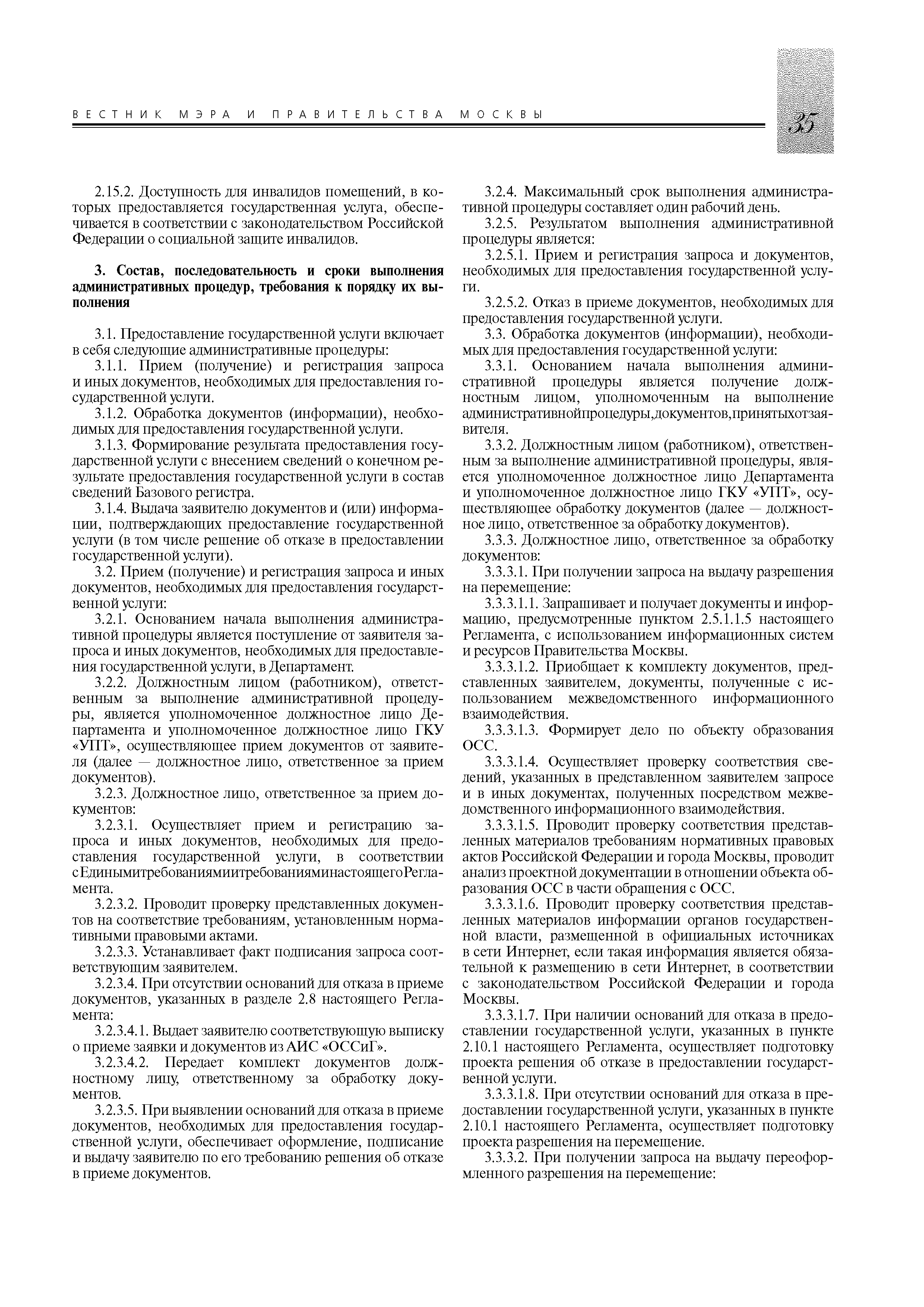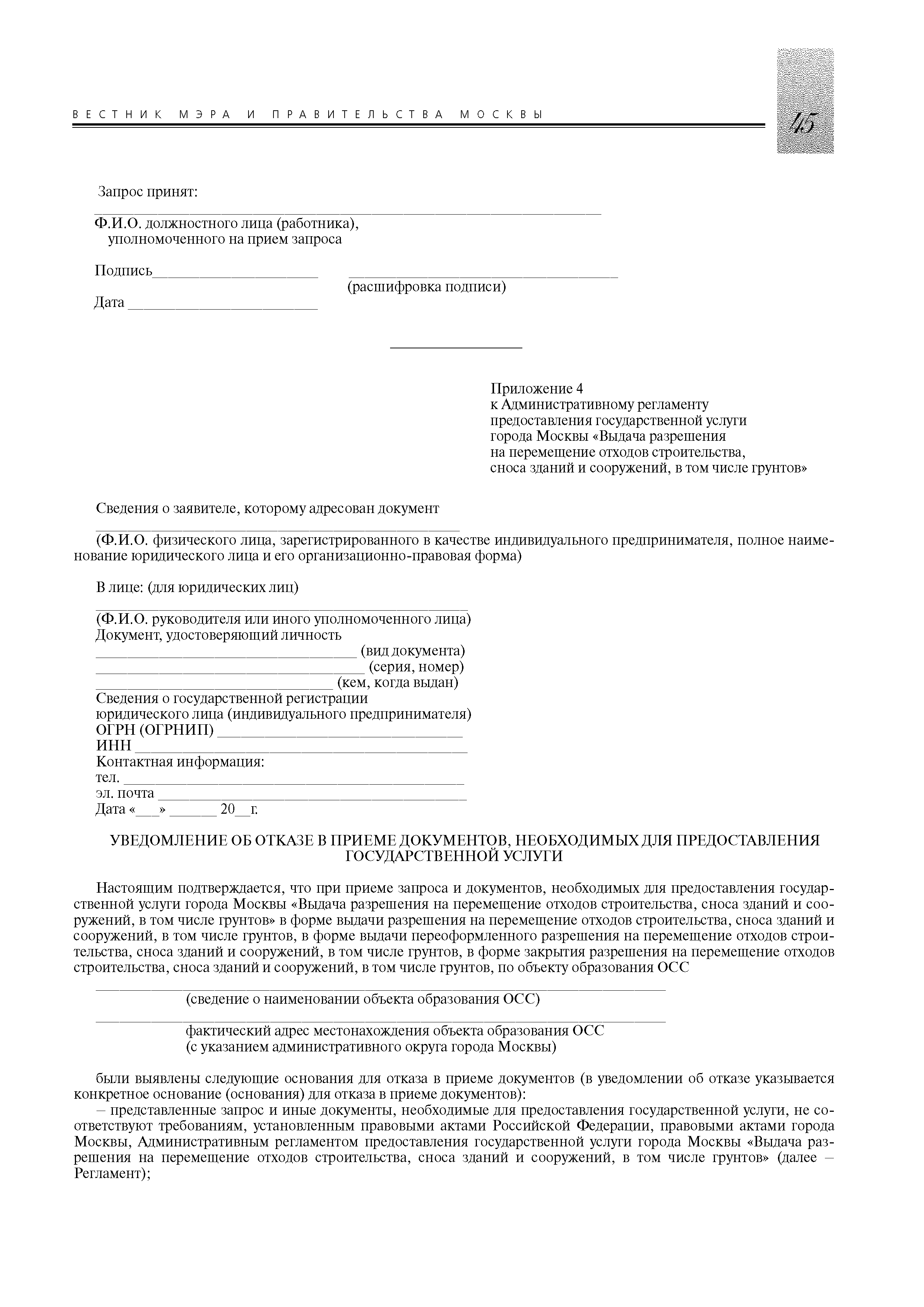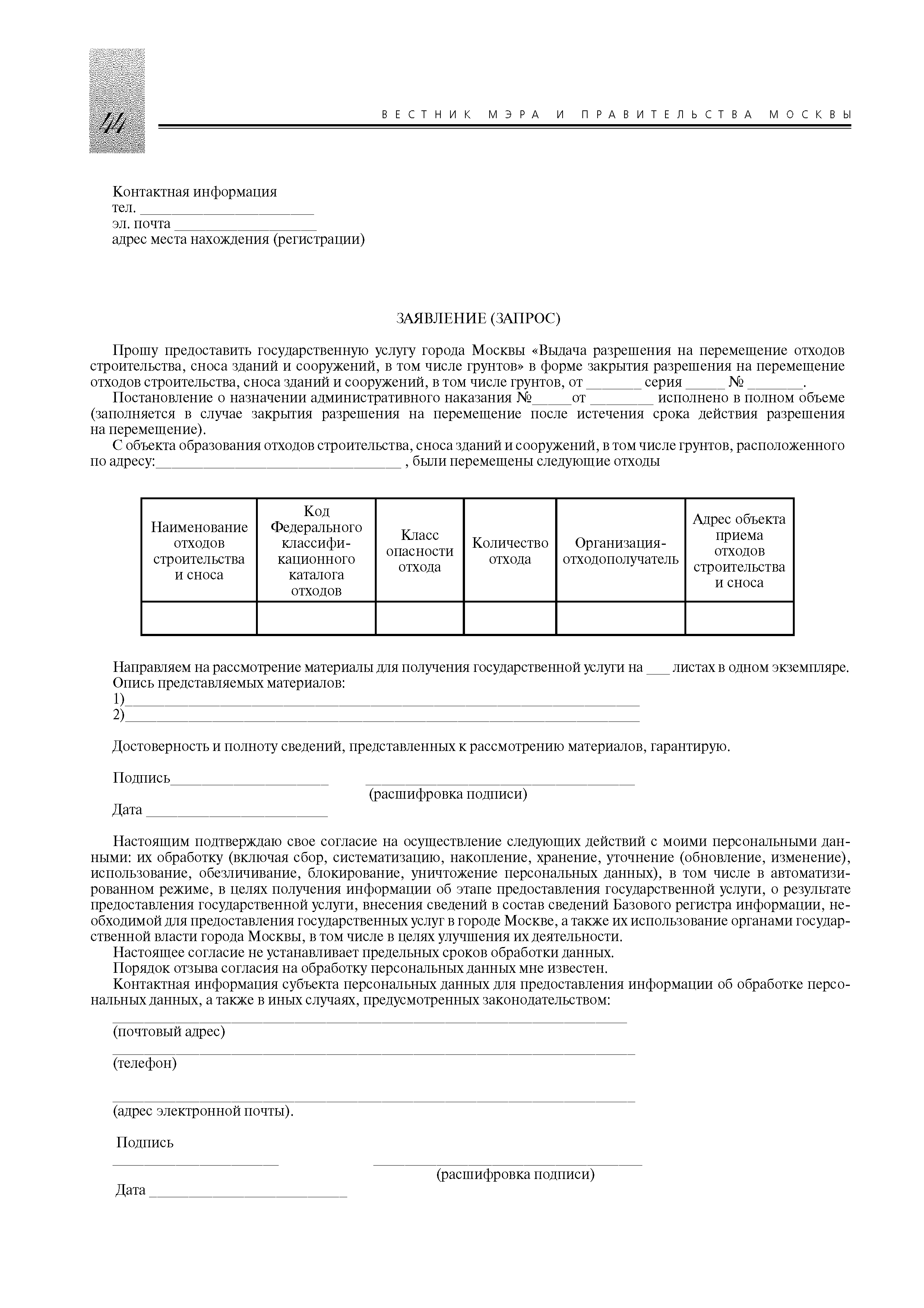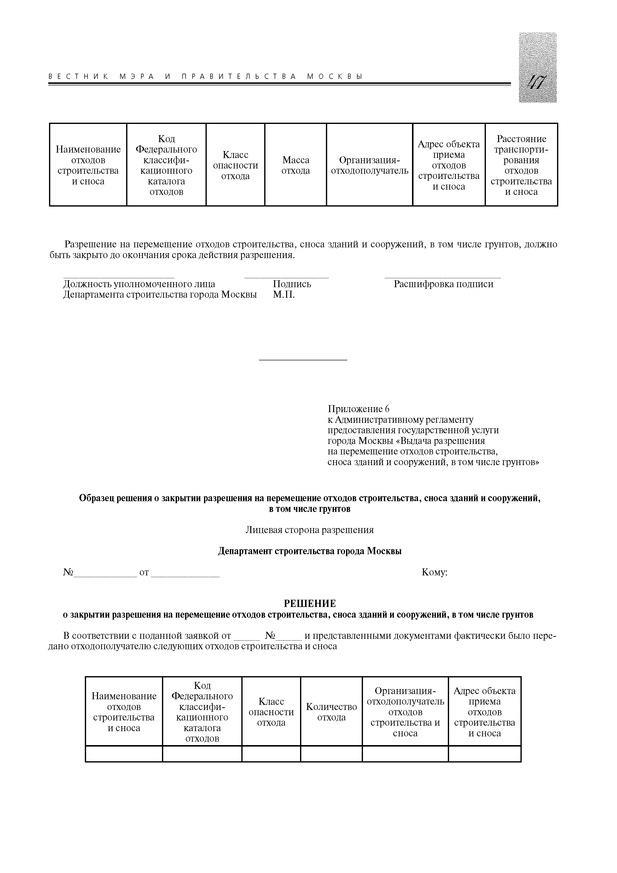 | Оглавление: | 1. Общие положения 2. Стандарт предоставления государственной услуги 3. Состав, последовательность и сроки выполнения административных процедур, требования к порядку их выполнения 4. Формы контроля за исполнением Регламента 5. Досудебный (внесудебный) порядок обжалования решений и действий (бездействия) Департамента Приложение 1. Заявление (запрос) Приложение 2. Заявление (запрос) Приложение 3. Заявление (запрос) Приложение 4. Форма уведомления об отказе в приеме документов, необходимых для предоставления государственной услуги Приложение 5. Образец разрешения на перемещение отходов строительства, сноса зданий и сооружений, в том числе грунтов Приложение 6. Образец решения о закрытии разрешения на перемещение отходов строительства, сноса зданий и сооружений, в том числе грунтов |