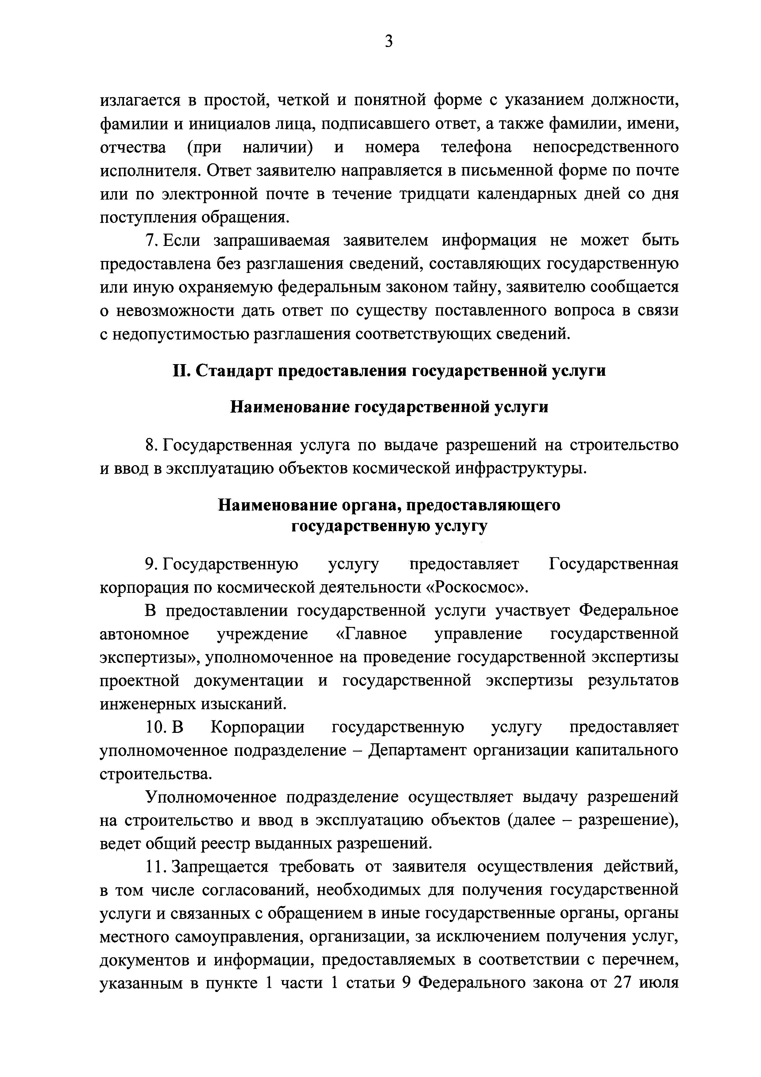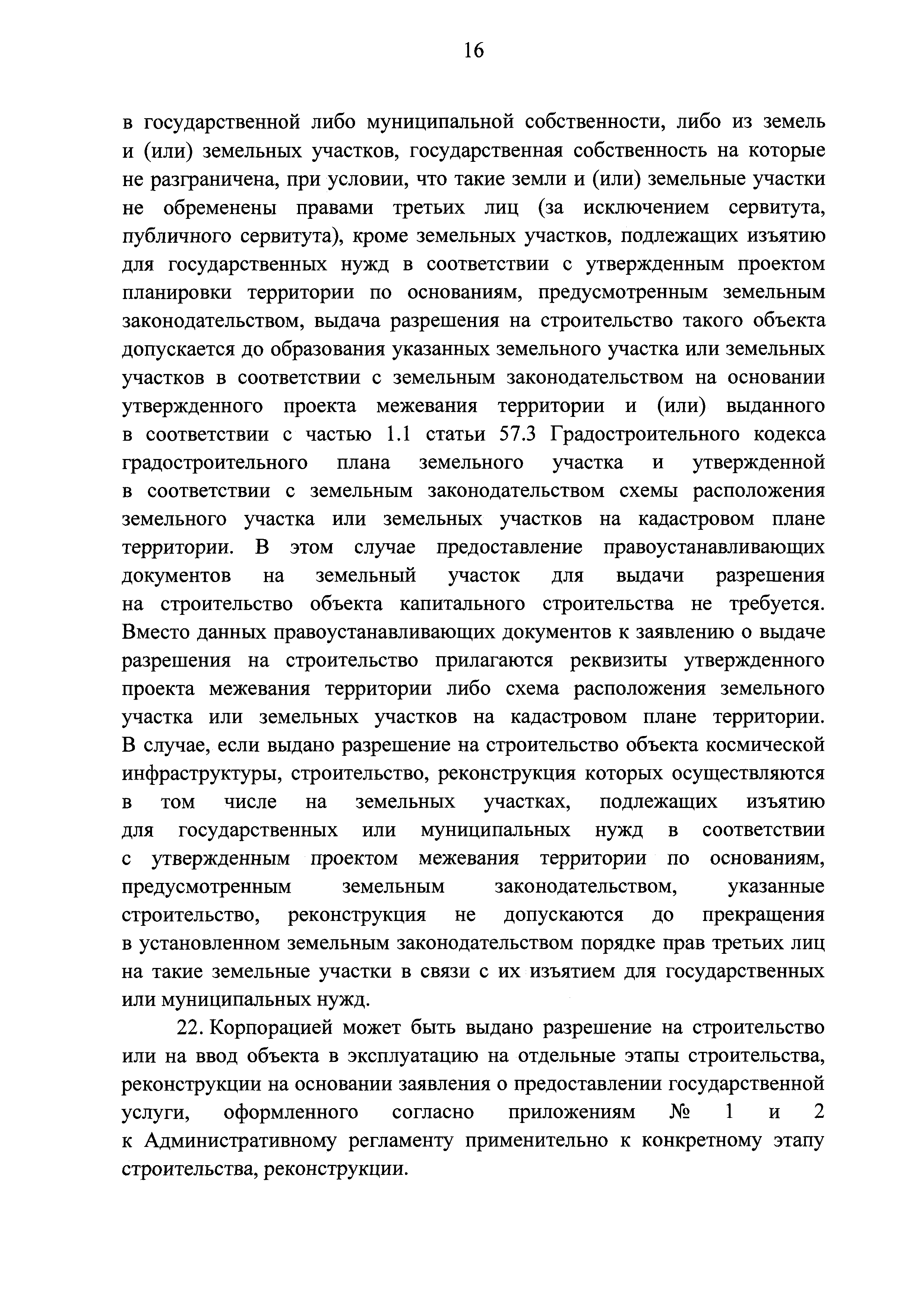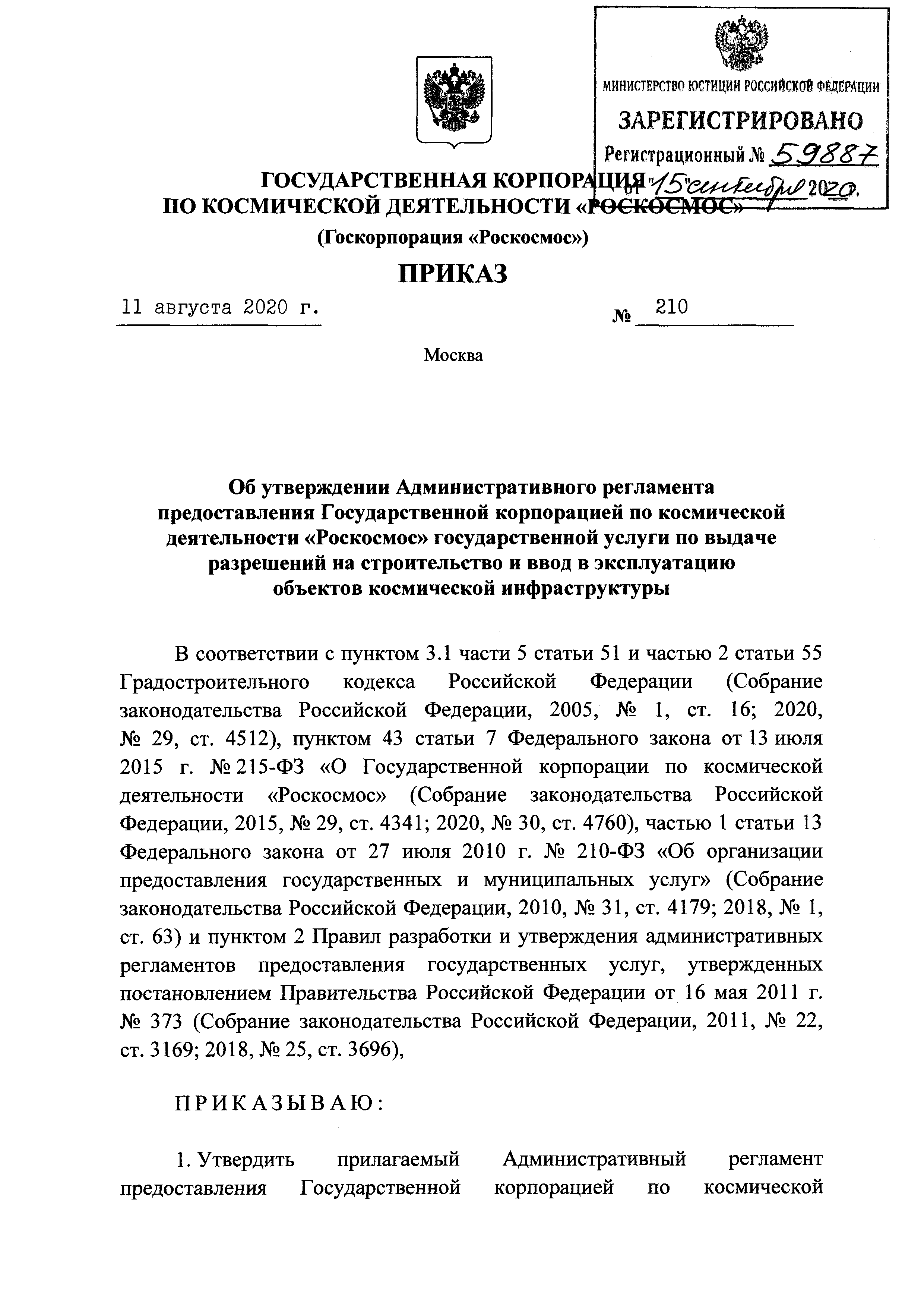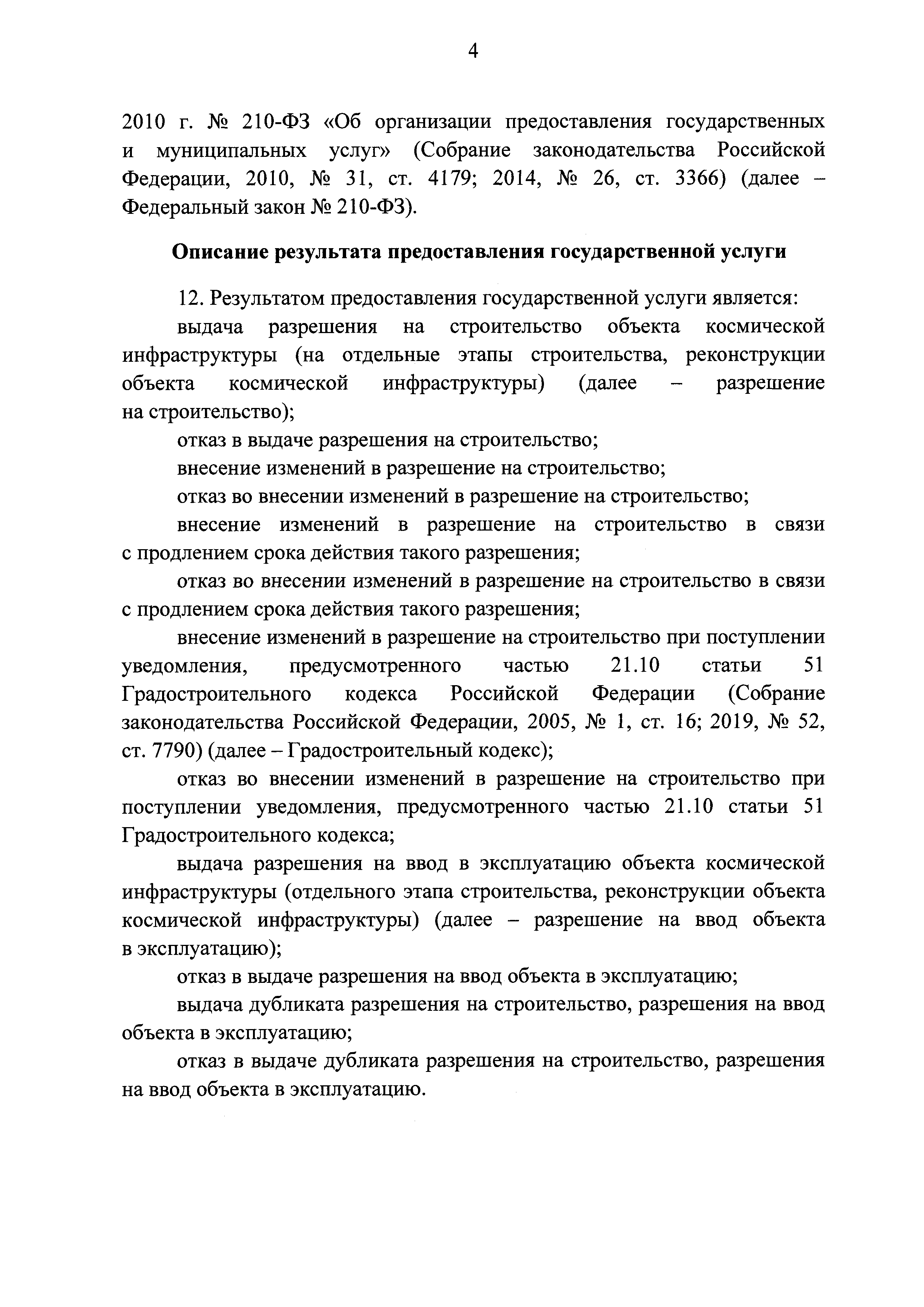 | | Заменяет собой: | | | Нормативные ссылки: |   Кодекс «Градостроительный кодекс Российской Федерации»  «Положение об организации и проведении государственной экспертизы проектной документации и результатов инженерных изысканий»  Федеральный закон 225-ФЗ «Об обязательном страховании гражданской ответственности владельца опасного объекта за причинение вреда в результате аварии на опасном объекте»  Федеральный закон 73-ФЗ «Об объектах культурного наследия (памятниках истории и культуры) народов Российской Федерации»  Федеральный закон 63-ФЗ «Об электронной подписи» Постановление 373 «О разработке и утверждении административных регламентов осуществления государственного контроля (надзора) и административных регламентов предоставления государственных услуг»  Федеральный закон 210-ФЗ «Об организации предоставления государственных и муниципальных услуг»  Федеральный закон 215-ФЗ «О Государственной корпорации по космической деятельности "Роскосмос"»  Федеральный закон 218-ФЗ «О государственной регистрации недвижимости» Постановление 352 «Об утверждении перечня услуг, которые являются необходимыми и обязательными для предоставления федеральными органами исполнительной власти, Государственной корпорацией по атомной энергии "Росатом" государственных услуг и предоставляются организациями, участвующими в предоставлении государственных услуг, и определении размера платы за их оказание» «Правила подачи и рассмотрения жалоб на решения и действия (бездействие) федеральных органов исполнительной власти и их должностных лиц, федеральных государственных служащих, должностных лиц государственных внебюджетных фондов Российской Федерации, государственных корпораций, наделенных в соответствии с федеральными законами полномочиями по предоставлению государственных услуг в установленной сфере деятельности, и их должностных лиц, организаций, предусмотренных частью 1.1 статьи 16 Федерального закона "Об организации предоставления государственных и муниципальных услуг", и их работников, а также многофункциональных центров предоставления государственных и муниципальных услуг и их работников»  «Правила направления документов в уполномоченные на выдачу разрешений на строительство и (или) разрешений на ввод объекта в эксплуатацию федеральные органы исполнительной власти, органы исполнительной власти субъектов Российской Федерации, органы местного самоуправления, Государственную корпорацию по атомной энергии "Росатом", Государственную корпорацию по космической деятельности "Роскосмос" в электронной форме» «Правила определения видов электронной подписи, использование которых допускается при обращении за получением государственных и муниципальных услуг» «Административный регламент предоставления Государственной корпорацией по космической деятельности "Роскосмос" государственной услуги по выдаче разрешений на строительство и ввод в эксплуатацию объектов космической инфраструктуры, находящихся в ведении Государственной корпорации по космической деятельности "Роскосмос" и ее организаций»