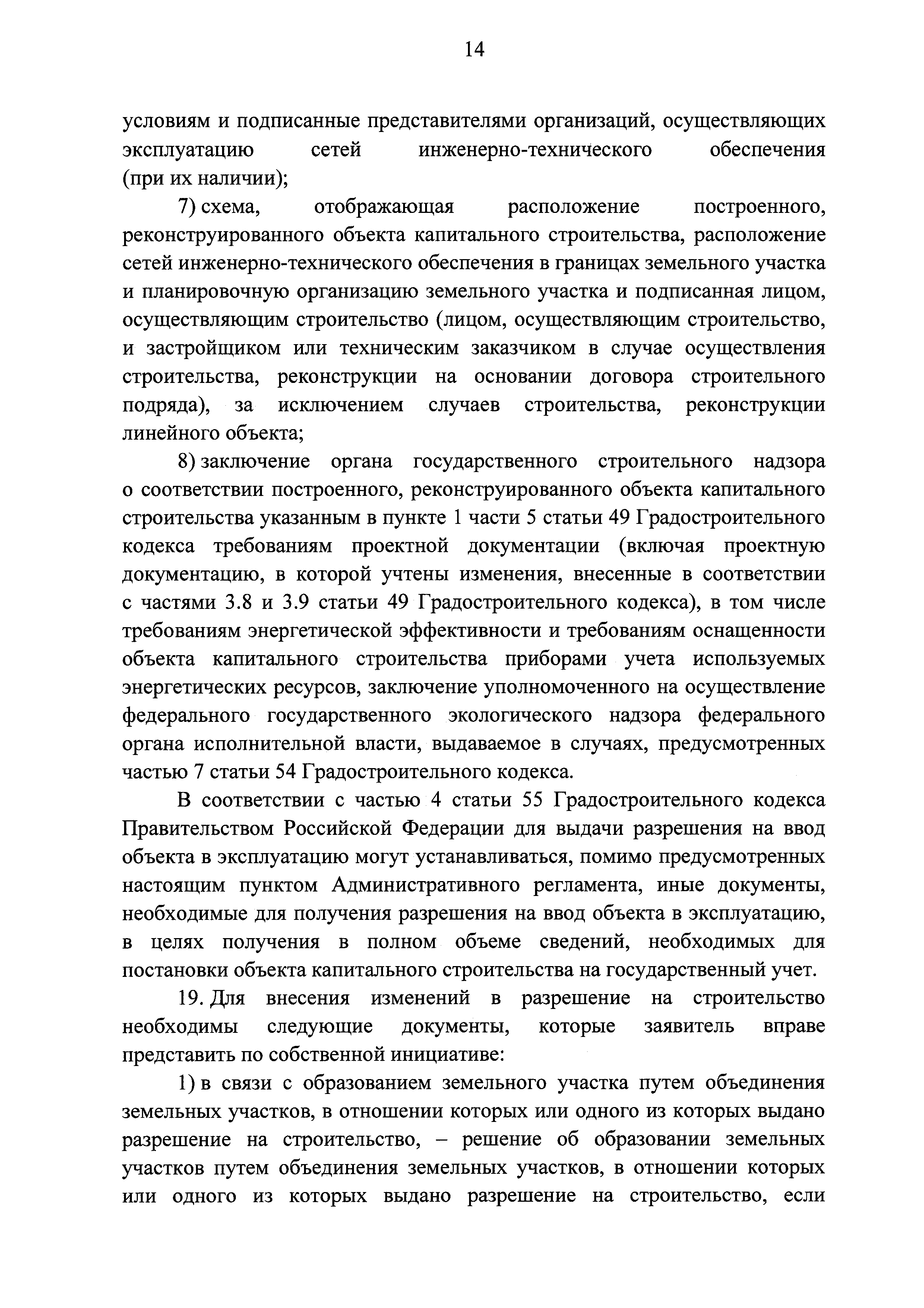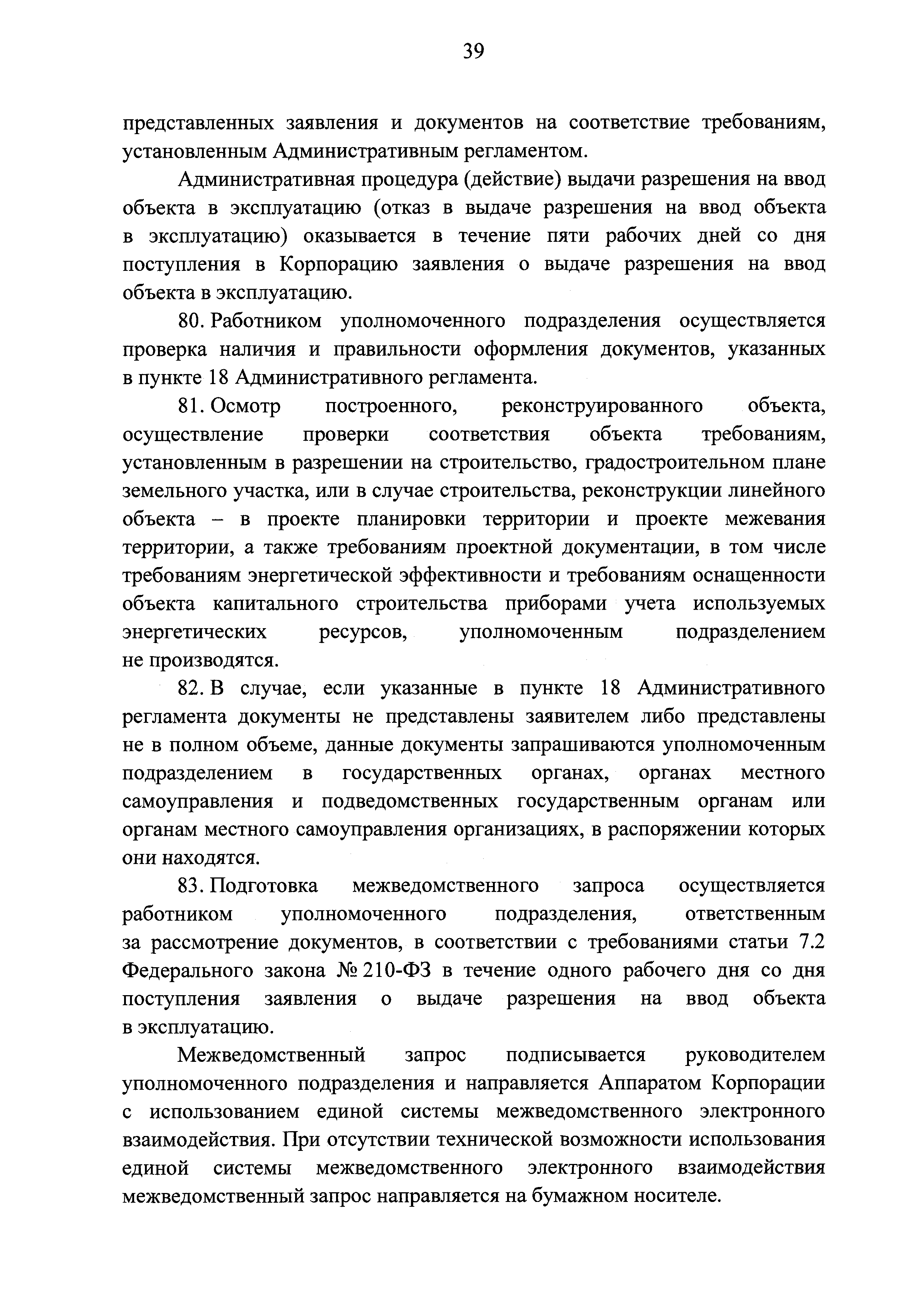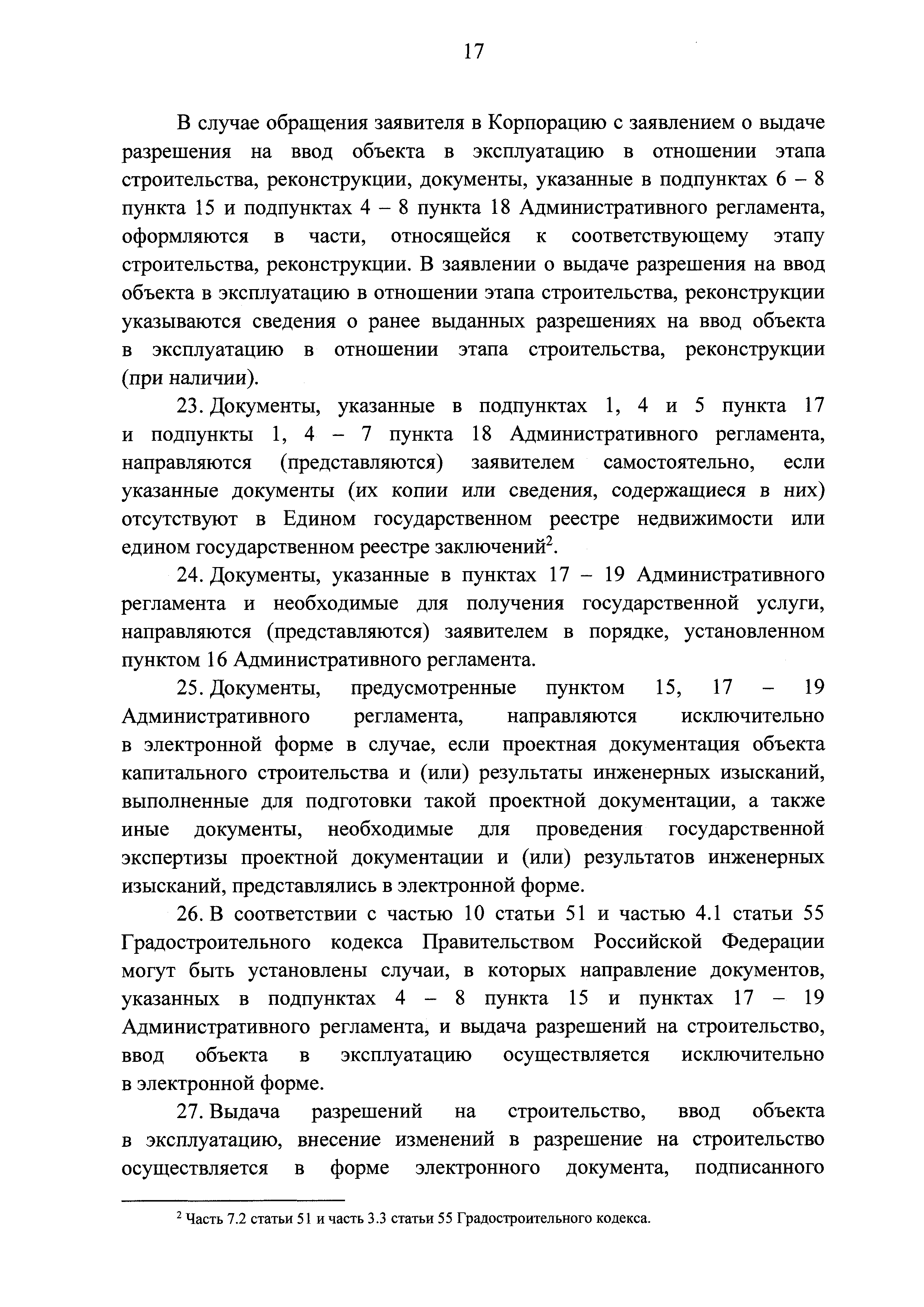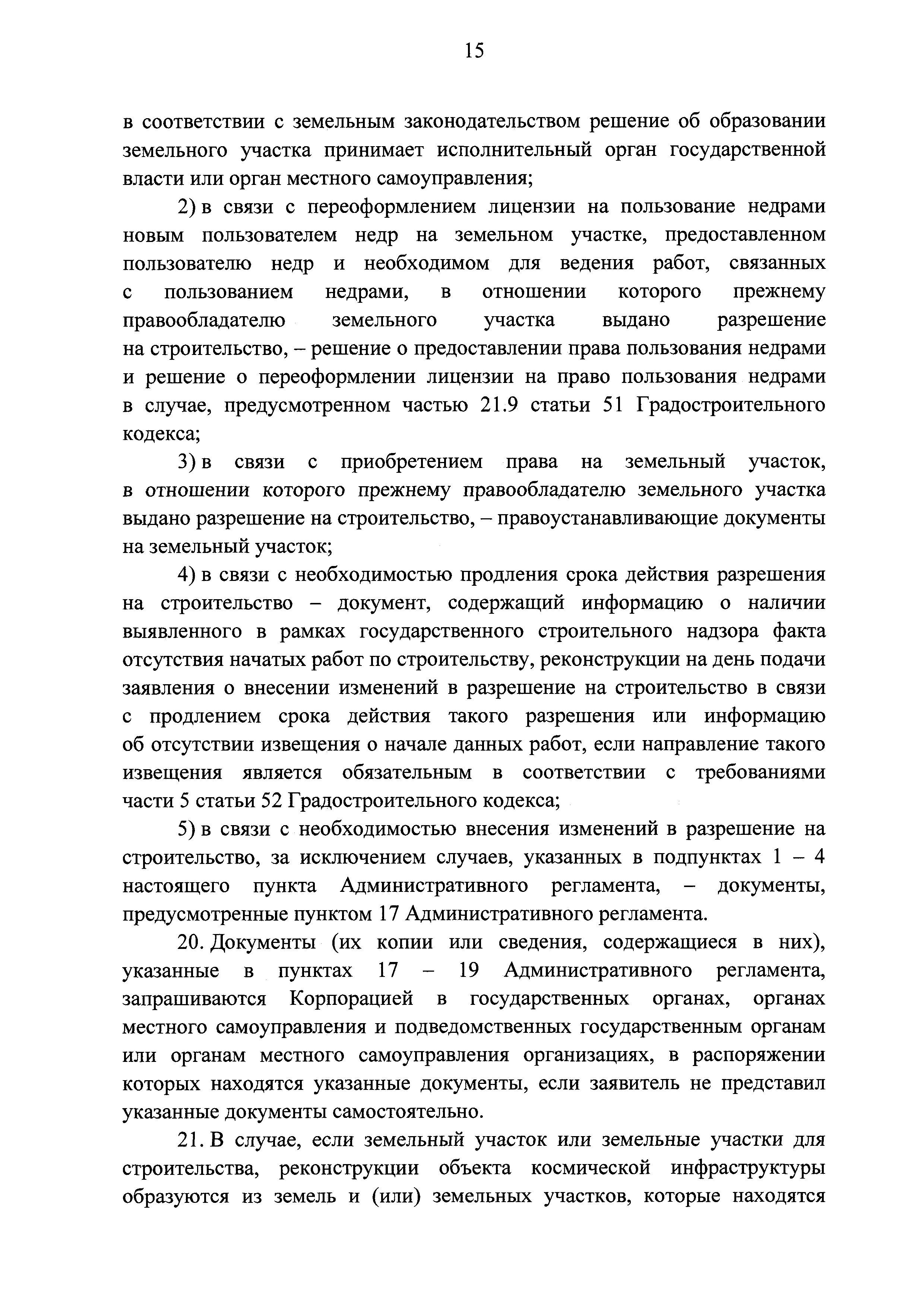 | | Заменяет собой: | | | Нормативные ссылки: |   Кодекс «Градостроительный кодекс Российской Федерации»  «Положение об организации и проведении государственной экспертизы проектной документации и результатов инженерных изысканий»  Федеральный закон 225-ФЗ «Об обязательном страховании гражданской ответственности владельца опасного объекта за причинение вреда в результате аварии на опасном объекте»  Федеральный закон 73-ФЗ «Об объектах культурного наследия (памятниках истории и культуры) народов Российской Федерации»  Федеральный закон 63-ФЗ «Об электронной подписи» Постановление 373 «О разработке и утверждении административных регламентов осуществления государственного контроля (надзора) и административных регламентов предоставления государственных услуг»  Федеральный закон 210-ФЗ «Об организации предоставления государственных и муниципальных услуг»  Федеральный закон 215-ФЗ «О Государственной корпорации по космической деятельности "Роскосмос"»  Федеральный закон 218-ФЗ «О государственной регистрации недвижимости» Постановление 352 «Об утверждении перечня услуг, которые являются необходимыми и обязательными для предоставления федеральными органами исполнительной власти, Государственной корпорацией по атомной энергии "Росатом" государственных услуг и предоставляются организациями, участвующими в предоставлении государственных услуг, и определении размера платы за их оказание» «Правила подачи и рассмотрения жалоб на решения и действия (бездействие) федеральных органов исполнительной власти и их должностных лиц, федеральных государственных служащих, должностных лиц государственных внебюджетных фондов Российской Федерации, государственных корпораций, наделенных в соответствии с федеральными законами полномочиями по предоставлению государственных услуг в установленной сфере деятельности, и их должностных лиц, организаций, предусмотренных частью 1.1 статьи 16 Федерального закона "Об организации предоставления государственных и муниципальных услуг", и их работников, а также многофункциональных центров предоставления государственных и муниципальных услуг и их работников»  «Правила направления документов в уполномоченные на выдачу разрешений на строительство и (или) разрешений на ввод объекта в эксплуатацию федеральные органы исполнительной власти, органы исполнительной власти субъектов Российской Федерации, органы местного самоуправления, Государственную корпорацию по атомной энергии "Росатом", Государственную корпорацию по космической деятельности "Роскосмос" в электронной форме» «Правила определения видов электронной подписи, использование которых допускается при обращении за получением государственных и муниципальных услуг» «Административный регламент предоставления Государственной корпорацией по космической деятельности "Роскосмос" государственной услуги по выдаче разрешений на строительство и ввод в эксплуатацию объектов космической инфраструктуры, находящихся в ведении Государственной корпорации по космической деятельности "Роскосмос" и ее организаций»
