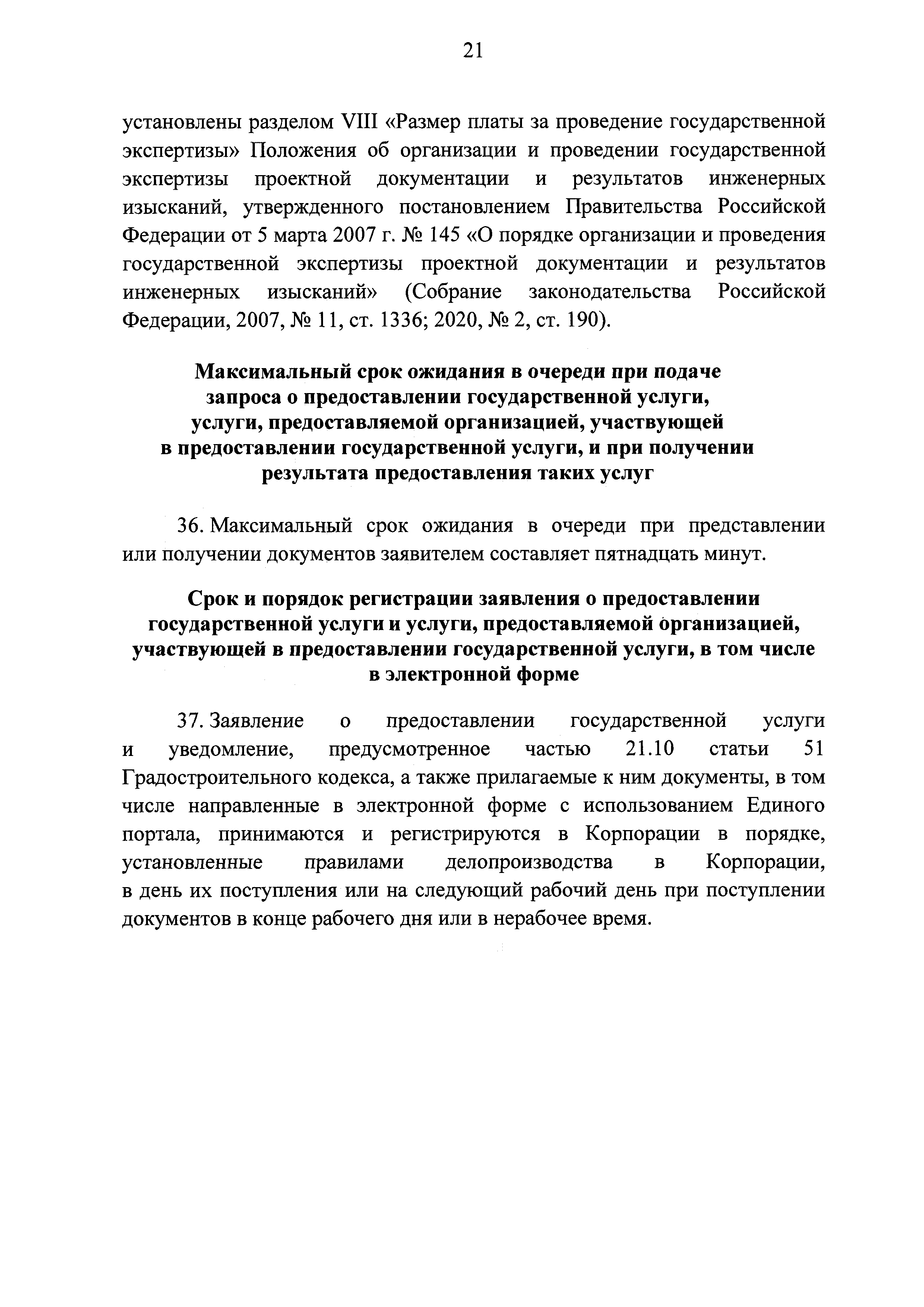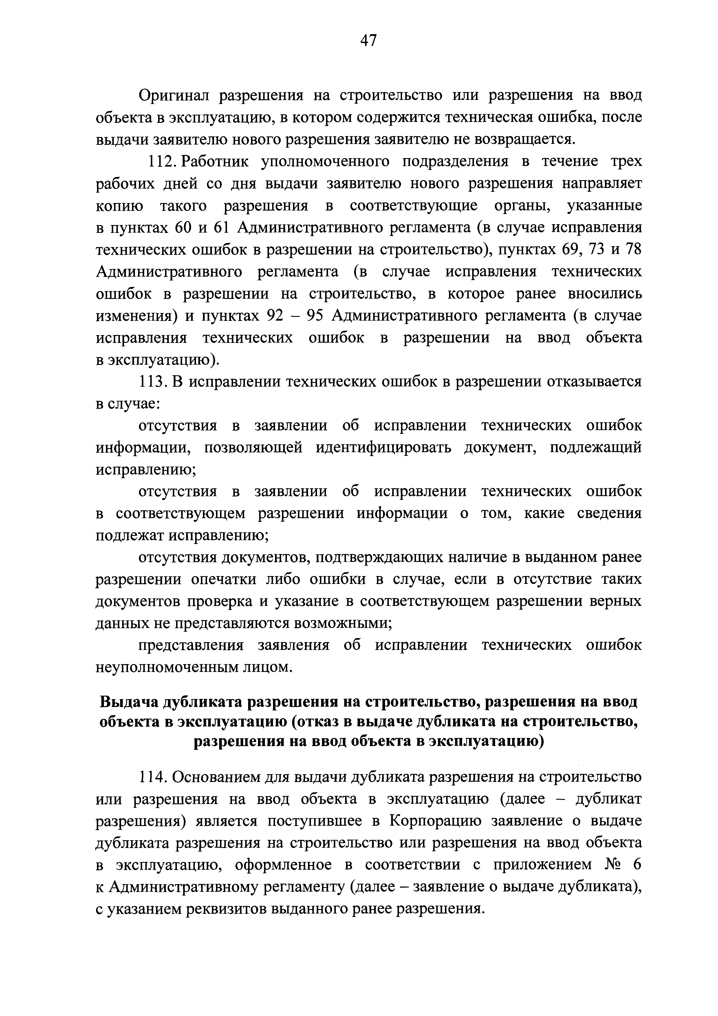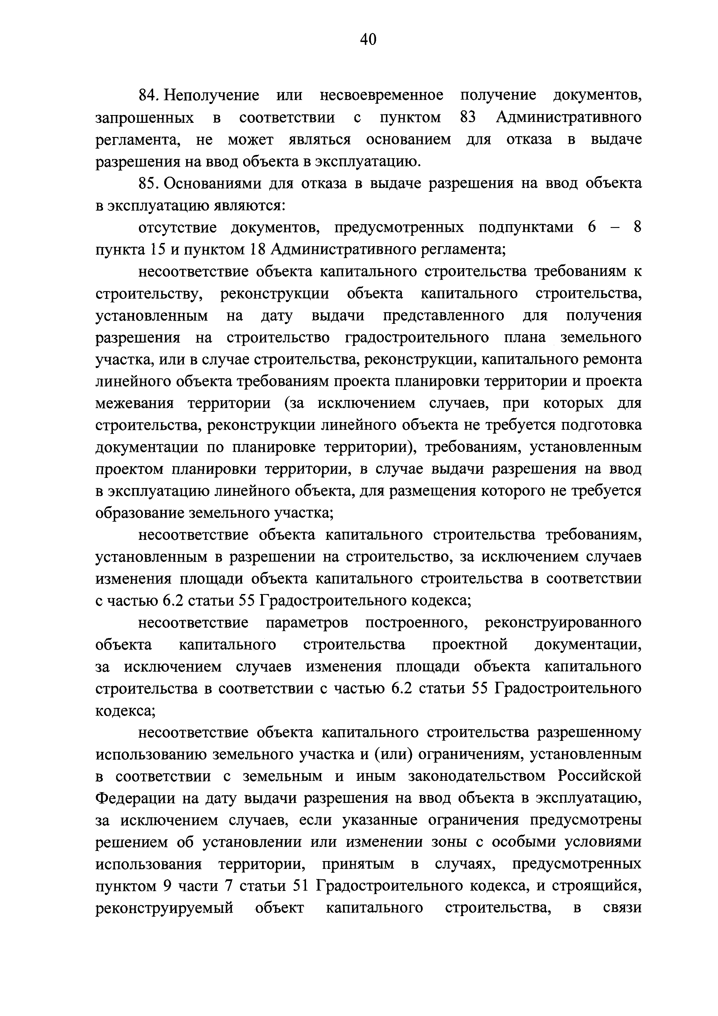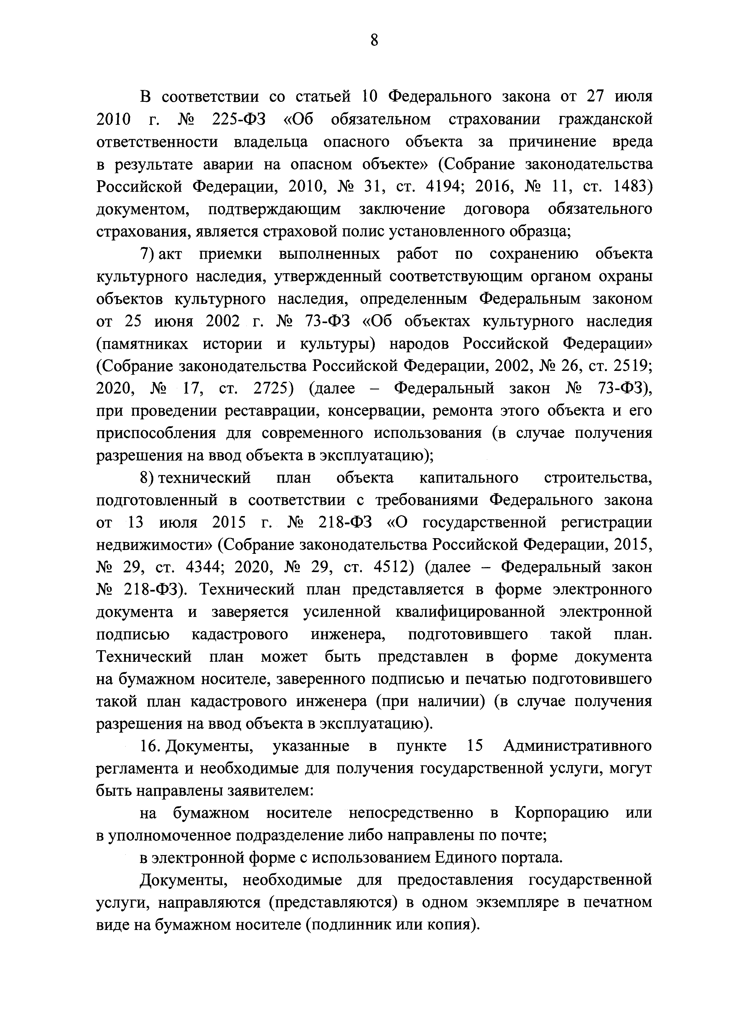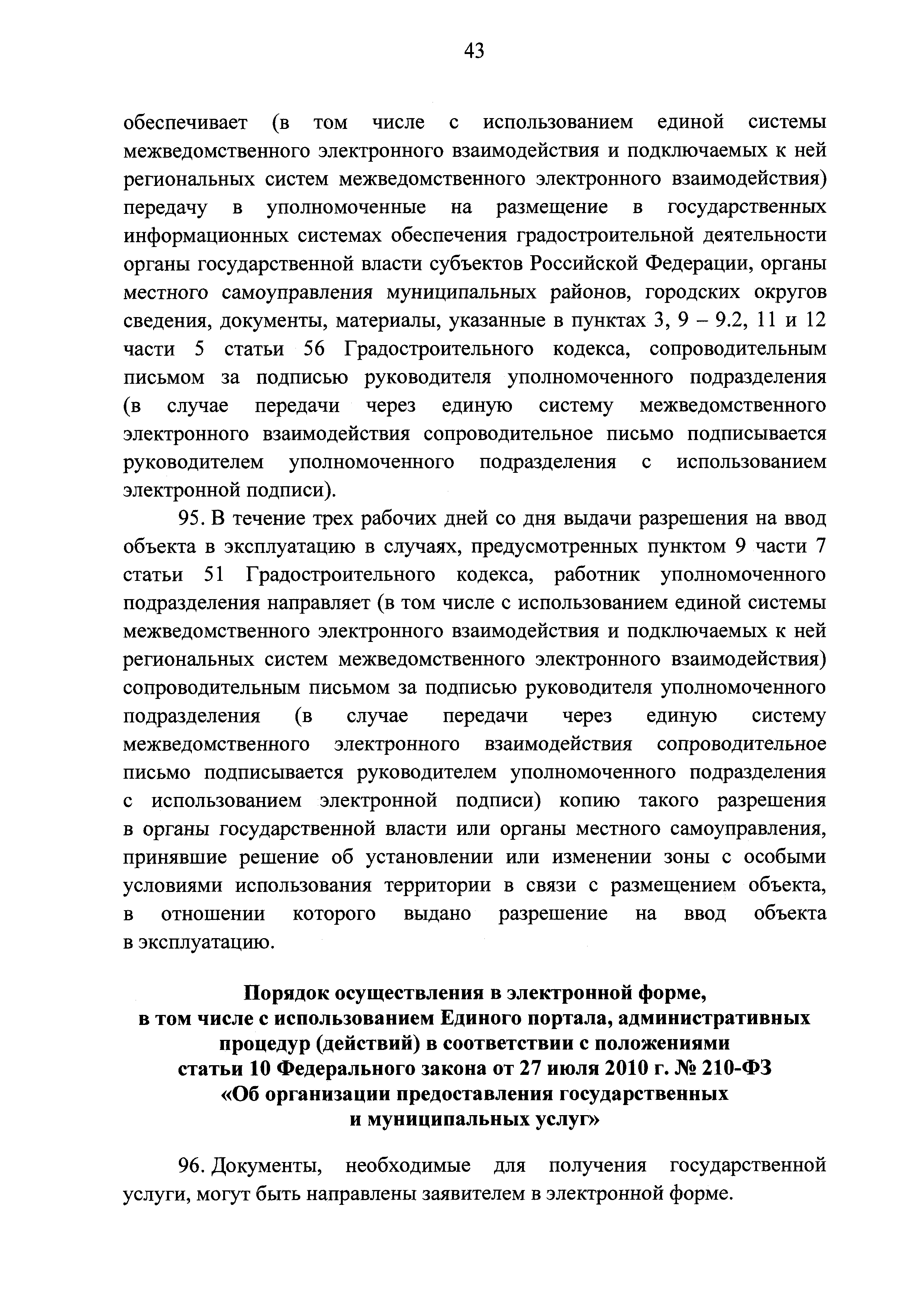 | | Заменяет собой: | | | Нормативные ссылки: |   Кодекс «Градостроительный кодекс Российской Федерации»  «Положение об организации и проведении государственной экспертизы проектной документации и результатов инженерных изысканий»  Федеральный закон 225-ФЗ «Об обязательном страховании гражданской ответственности владельца опасного объекта за причинение вреда в результате аварии на опасном объекте»  Федеральный закон 73-ФЗ «Об объектах культурного наследия (памятниках истории и культуры) народов Российской Федерации»  Федеральный закон 63-ФЗ «Об электронной подписи» Постановление 373 «О разработке и утверждении административных регламентов осуществления государственного контроля (надзора) и административных регламентов предоставления государственных услуг»  Федеральный закон 210-ФЗ «Об организации предоставления государственных и муниципальных услуг»  Федеральный закон 215-ФЗ «О Государственной корпорации по космической деятельности "Роскосмос"»  Федеральный закон 218-ФЗ «О государственной регистрации недвижимости» Постановление 352 «Об утверждении перечня услуг, которые являются необходимыми и обязательными для предоставления федеральными органами исполнительной власти, Государственной корпорацией по атомной энергии "Росатом" государственных услуг и предоставляются организациями, участвующими в предоставлении государственных услуг, и определении размера платы за их оказание» «Правила подачи и рассмотрения жалоб на решения и действия (бездействие) федеральных органов исполнительной власти и их должностных лиц, федеральных государственных служащих, должностных лиц государственных внебюджетных фондов Российской Федерации, государственных корпораций, наделенных в соответствии с федеральными законами полномочиями по предоставлению государственных услуг в установленной сфере деятельности, и их должностных лиц, организаций, предусмотренных частью 1.1 статьи 16 Федерального закона "Об организации предоставления государственных и муниципальных услуг", и их работников, а также многофункциональных центров предоставления государственных и муниципальных услуг и их работников»  «Правила направления документов в уполномоченные на выдачу разрешений на строительство и (или) разрешений на ввод объекта в эксплуатацию федеральные органы исполнительной власти, органы исполнительной власти субъектов Российской Федерации, органы местного самоуправления, Государственную корпорацию по атомной энергии "Росатом", Государственную корпорацию по космической деятельности "Роскосмос" в электронной форме» «Правила определения видов электронной подписи, использование которых допускается при обращении за получением государственных и муниципальных услуг» «Административный регламент предоставления Государственной корпорацией по космической деятельности "Роскосмос" государственной услуги по выдаче разрешений на строительство и ввод в эксплуатацию объектов космической инфраструктуры, находящихся в ведении Государственной корпорации по космической деятельности "Роскосмос" и ее организаций»