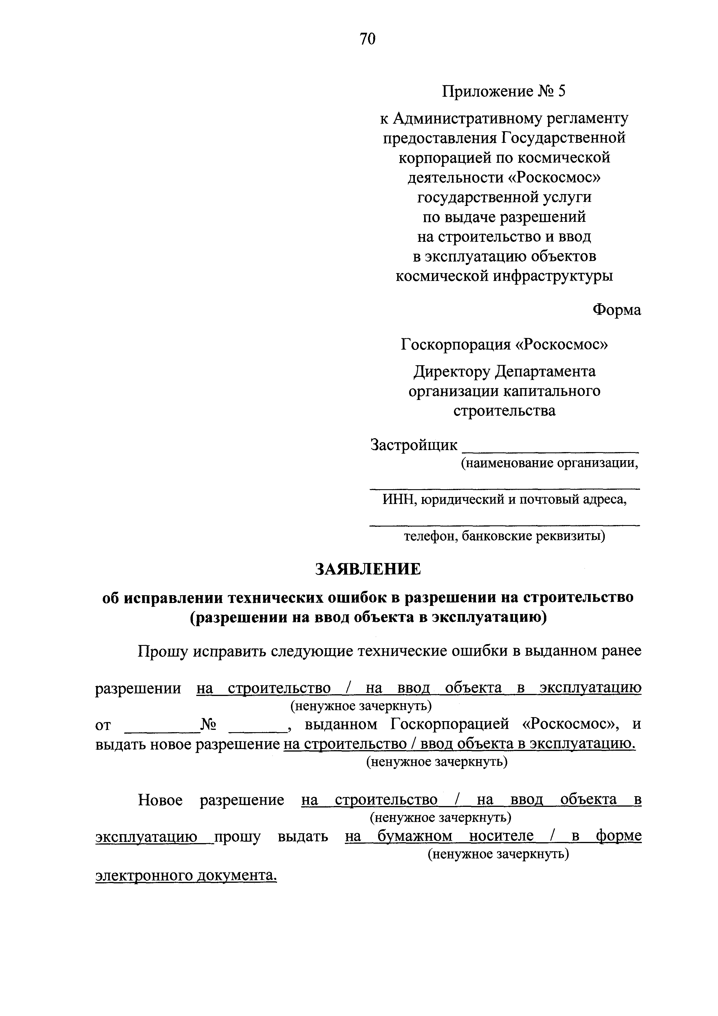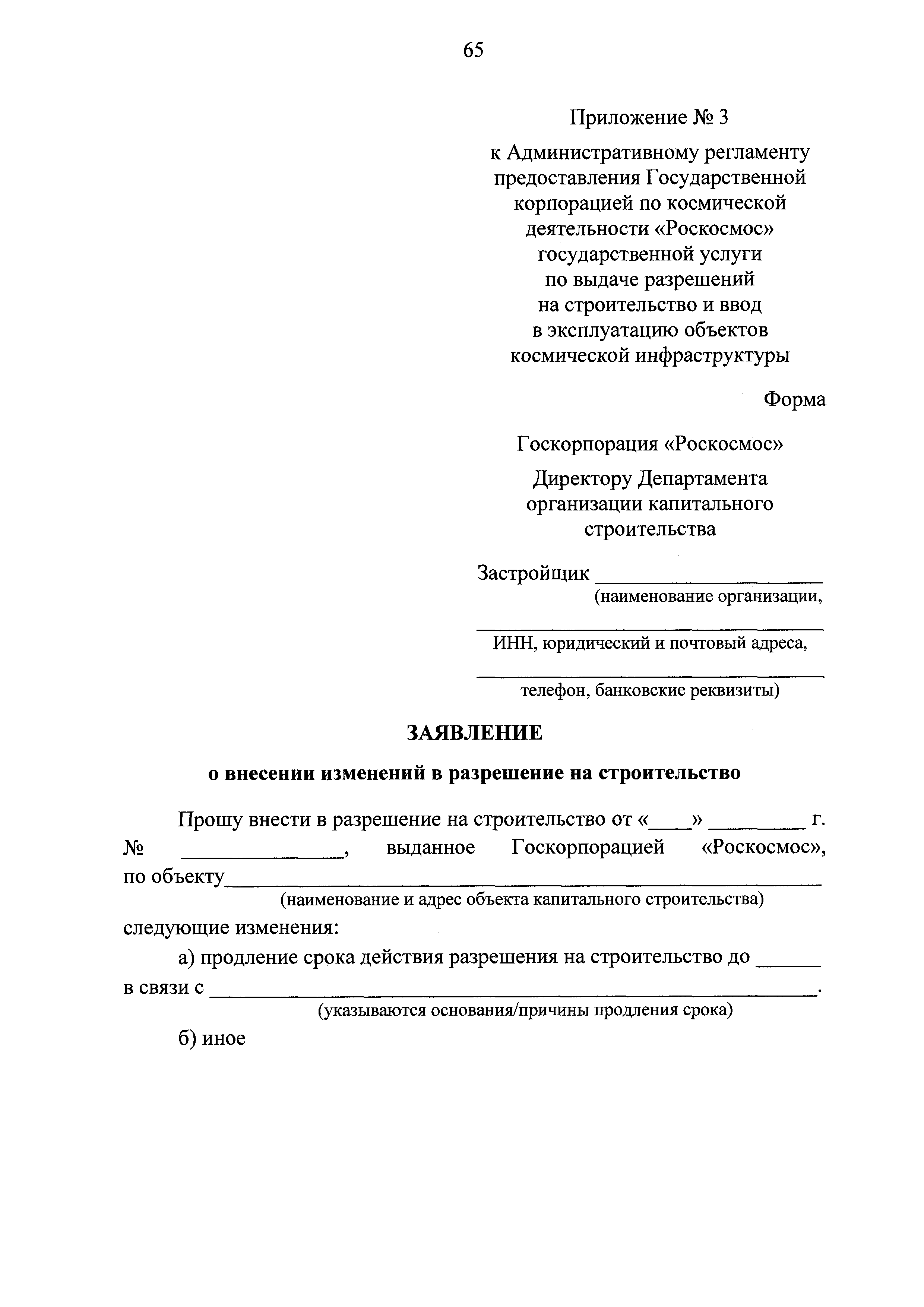 Административный регламент предоставления Государственной корпорацией по космической деятельности "Роскосмос" государственной услуги по выдаче разрешений на строительство и ввод в эксплуатацию объектов космической инфраструктуры| Статус: | действует | | Название рус.: | Административный регламент предоставления Государственной корпорацией по космической деятельности "Роскосмос" государственной услуги по выдаче разрешений на строительство и ввод в эксплуатацию объектов космической инфраструктуры | | Дата добавления в базу: | 01.01.2021 | | Дата актуализации: | 01.01.2021 | | Дата введения: | 27.09.2020 | | Область применения: | Административный регламент устанавливает сроки и последовательность административных процедур (действий), осуществляемых Государственной корпорацией по космической деятельности "Роскосмос" в процессе предоставления государственной услуги | | Оглавление: | I. Общие положения II. Стандарт предоставления государственной услуги III. Состав, последовательность и сроки выполнения административных процедур (действий), требования к порядку их выполнения, в том числе особенности выполнения административных процедур (действий) в электронной форме IV. Формы контроля за предоставлением государственной услуги V. Досудебный (внесудебный) порядок обжалования решений и действий (бездействия) органов, предоставляющих государственные услуги, а также их должностных лиц Приложение № 1. Форма заявления о выдаче разрешения на строительство Приложение № 2. Форма заявления о выдаче разрешения на ввод объекта в эксплуатацию Приложение № 3. Форма заявления о внесении изменений в разрешение на строительство Приложение № 4. Форма уведомления о переходе прав на земельный участок, права пользования недрами, об образовании земельного участка в целях внесения изменений в разрешение на строительство Приложение № 5. Форма заявления об исправлении технических ошибок в разрешении на строительство (разрешении на ввод объекта в эксплуатацию) Приложение № 6. Форма заявления о выдаче дубликата разрешения на строительство (разрешения на ввод объекта в эксплуатацию) | | Утверждён: | 11.08.2020 Государственная корпорация по космической деятельности Роскосмос (210)