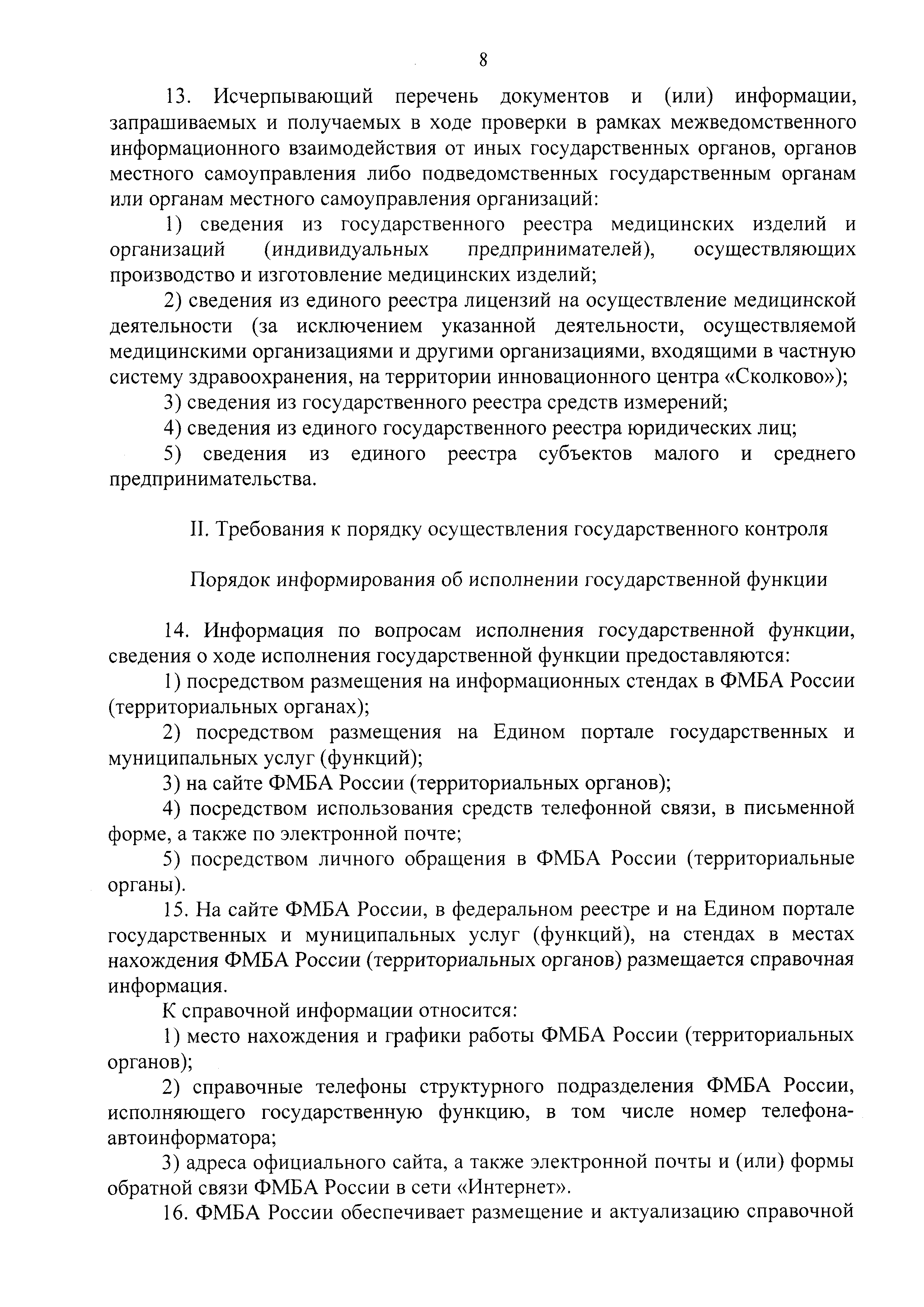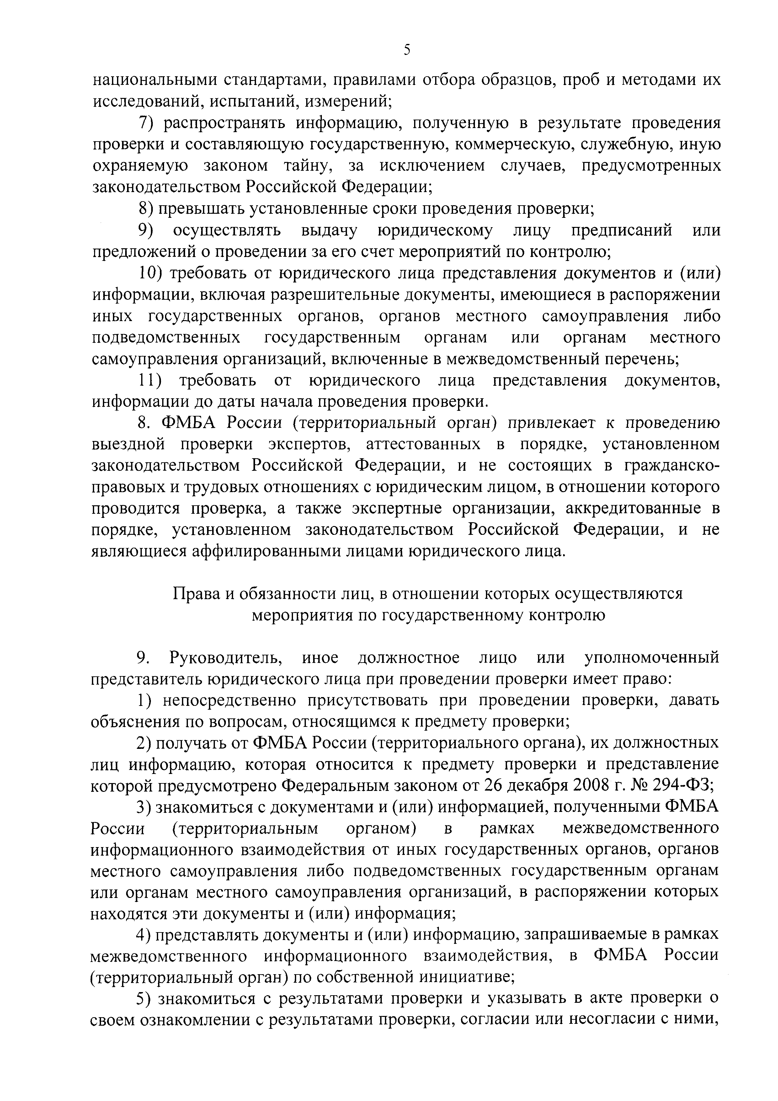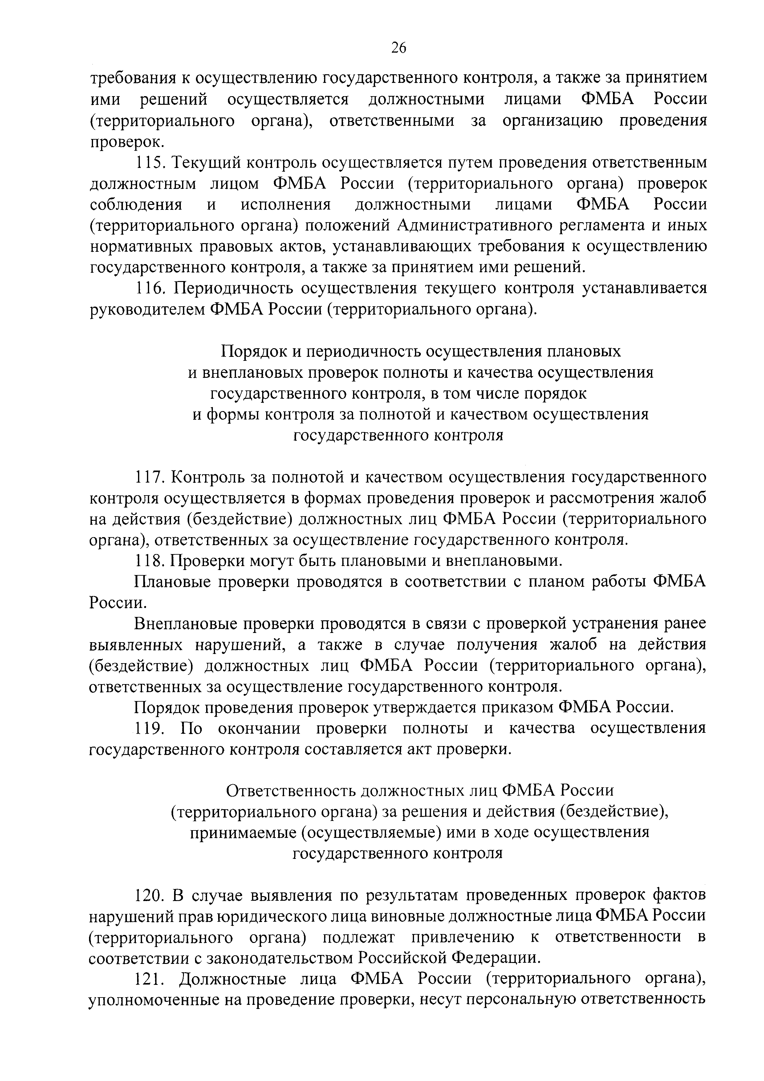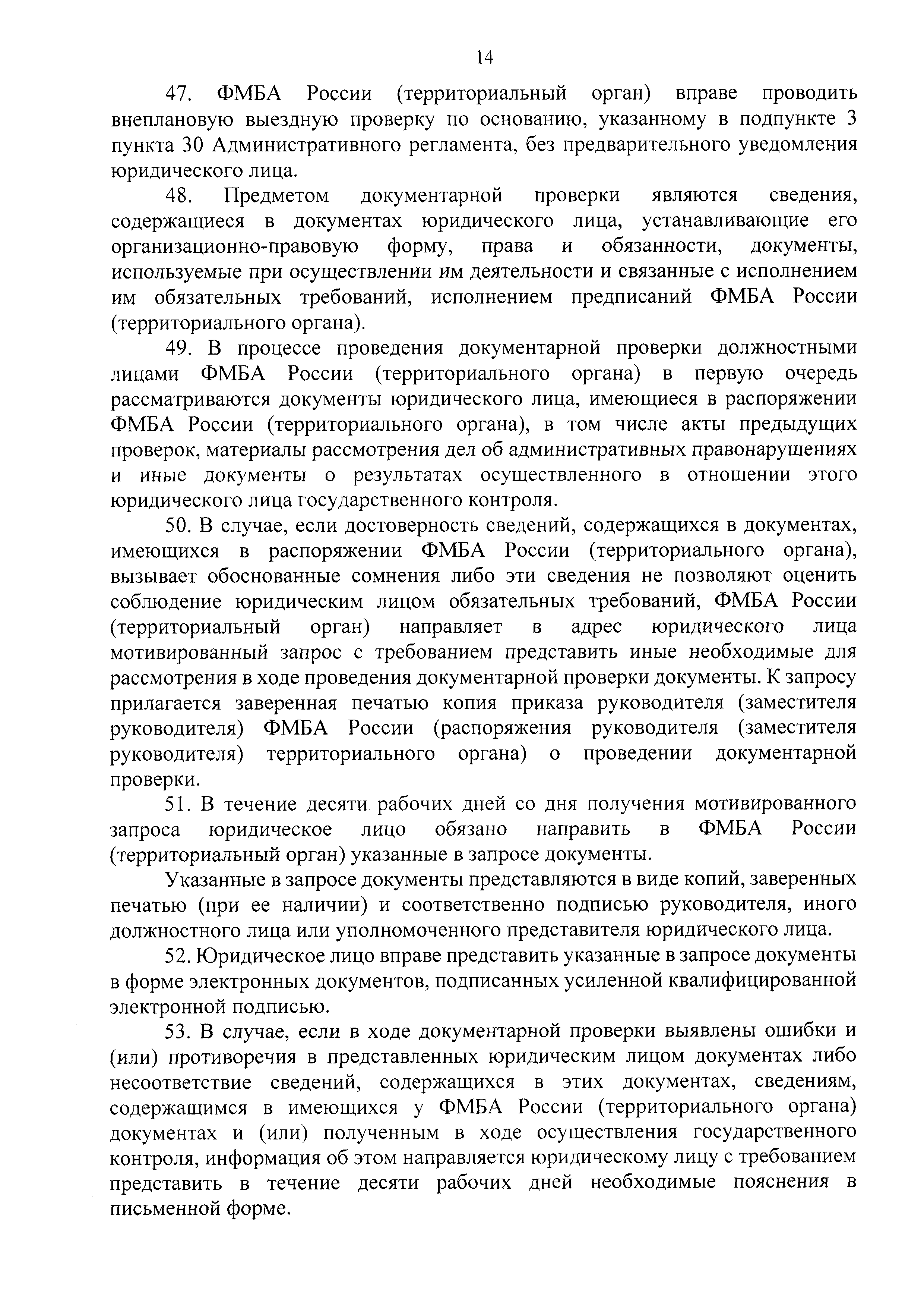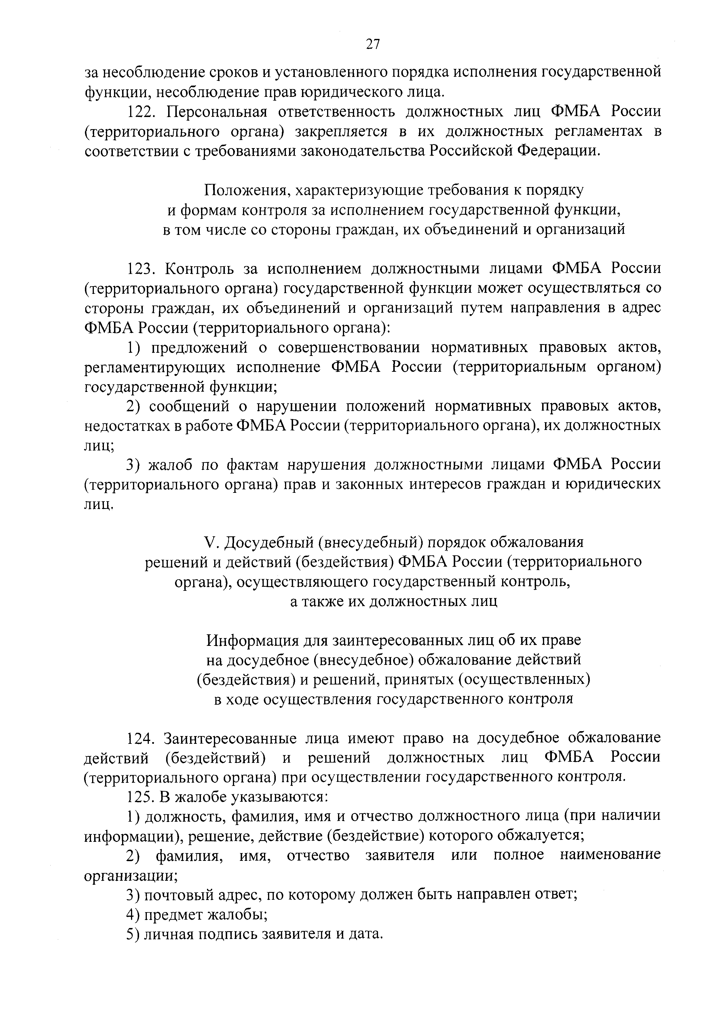 | Оглавление: | I. Общие положения II. Требования к порядку осуществления государственного контроля III. Состав, последовательность и сроки выполнения административных процедур (действий), требования к порядку их выполнения, в том числе особенности выполнения административных процедур (действий) в электронной форме IV. Порядок и формы контроля за осуществлением государственного контроля V. Досудебный (внесудебный) порядок обжалования решений и действий (бездействия) ФМБА России (территориального органа), осуществляющего государственный контроль, а также их должностных лиц |