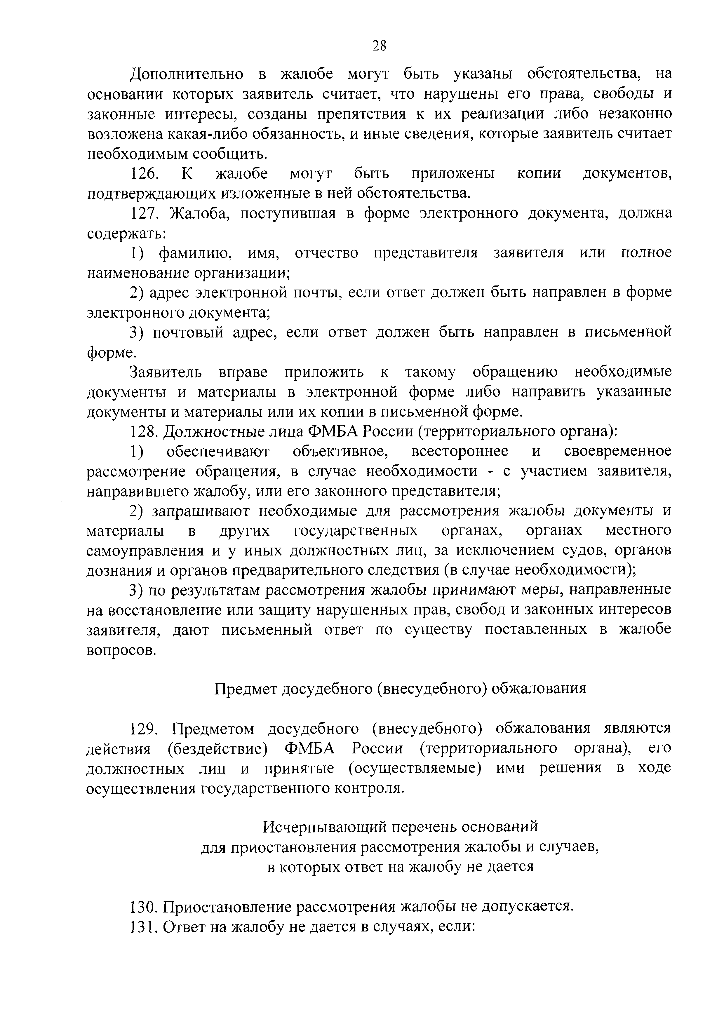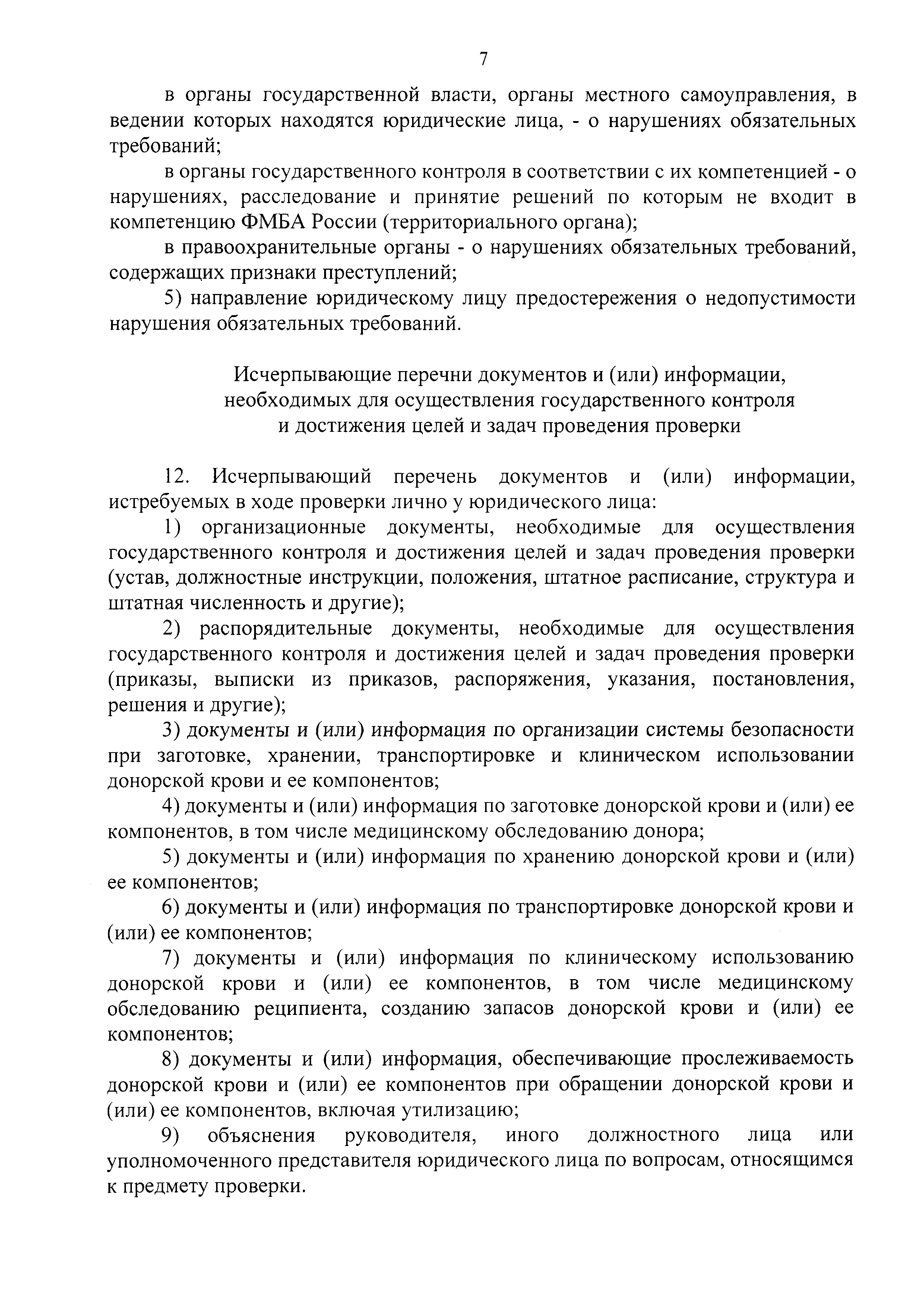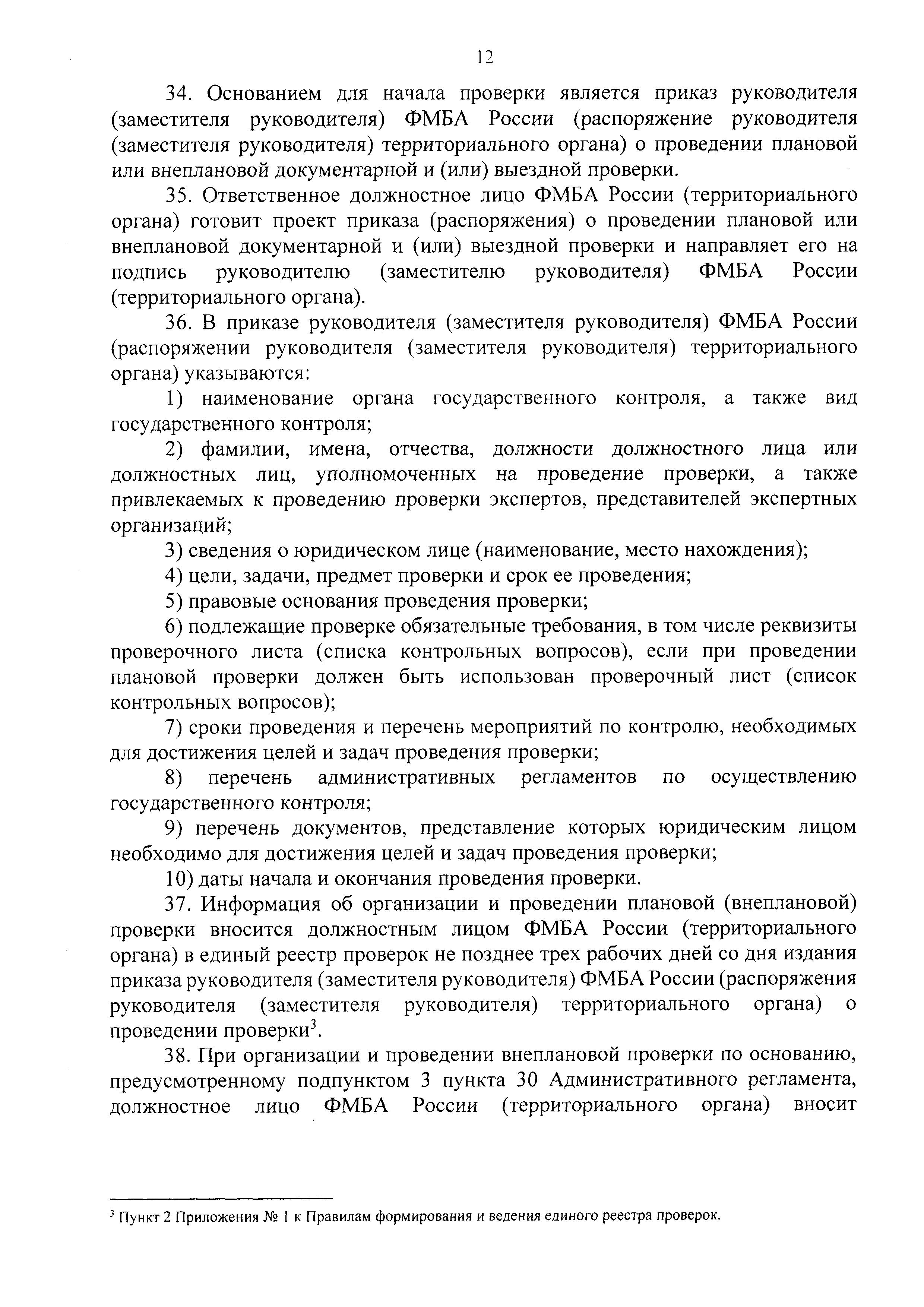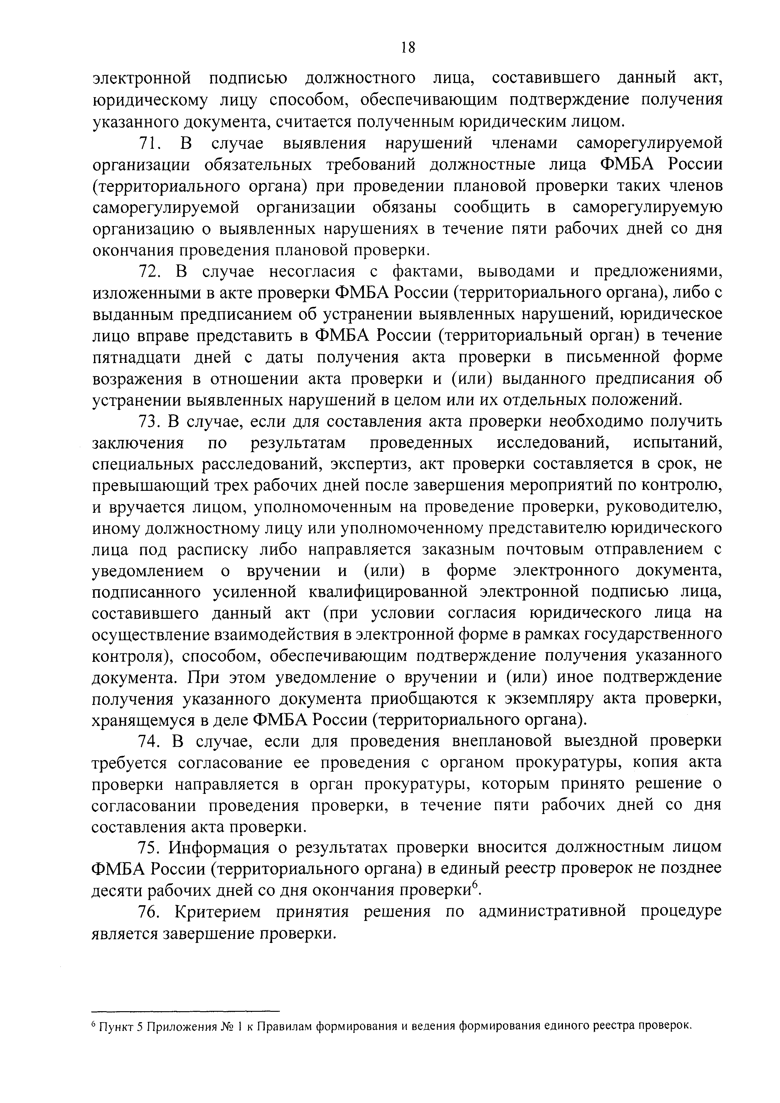 | Оглавление: | I. Общие положения II. Требования к порядку осуществления государственного контроля III. Состав, последовательность и сроки выполнения административных процедур (действий), требования к порядку их выполнения, в том числе особенности выполнения административных процедур (действий) в электронной форме IV. Порядок и формы контроля за осуществлением государственного контроля V. Досудебный (внесудебный) порядок обжалования решений и действий (бездействия) ФМБА России (территориального органа), осуществляющего государственный контроль, а также их должностных лиц |