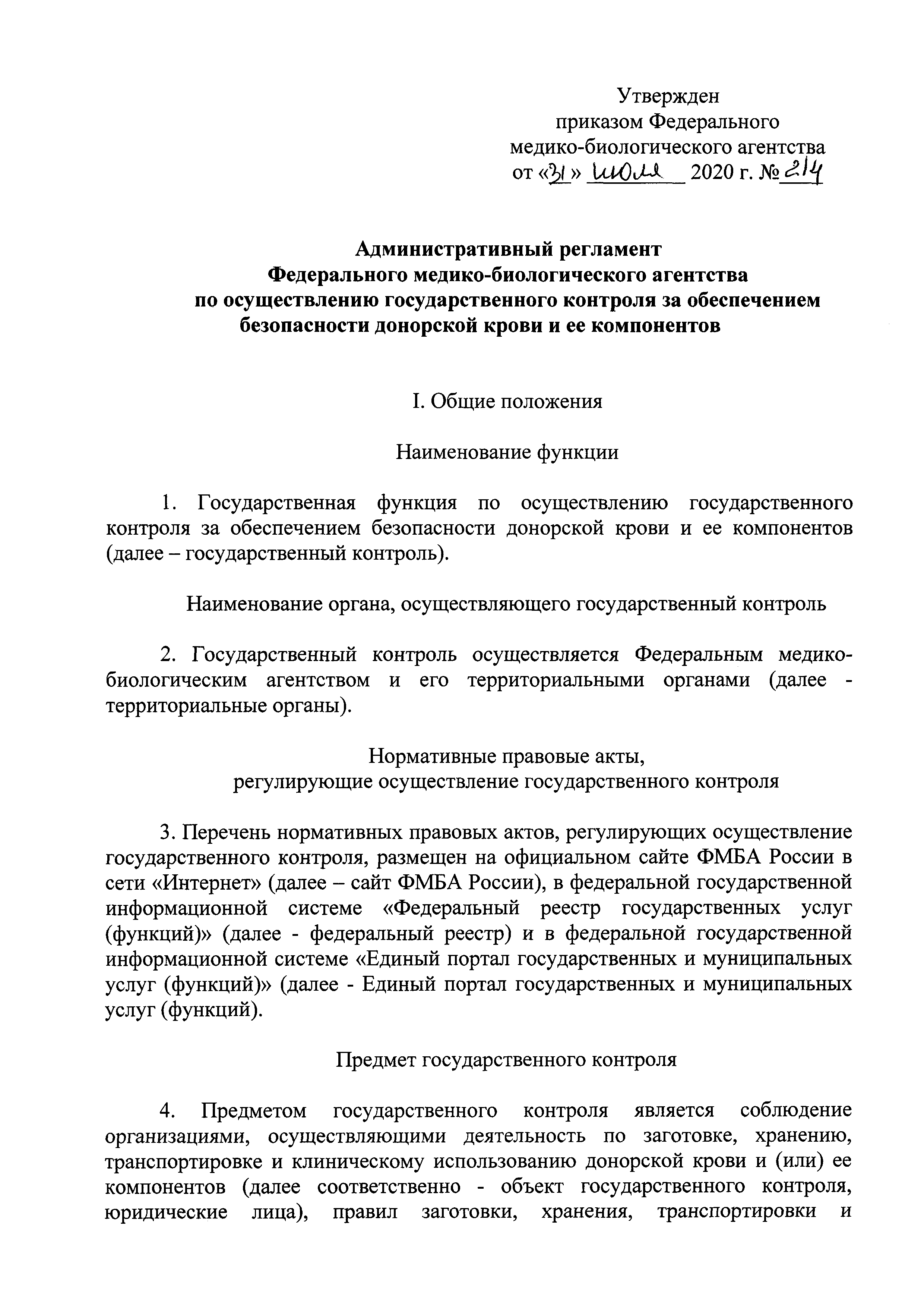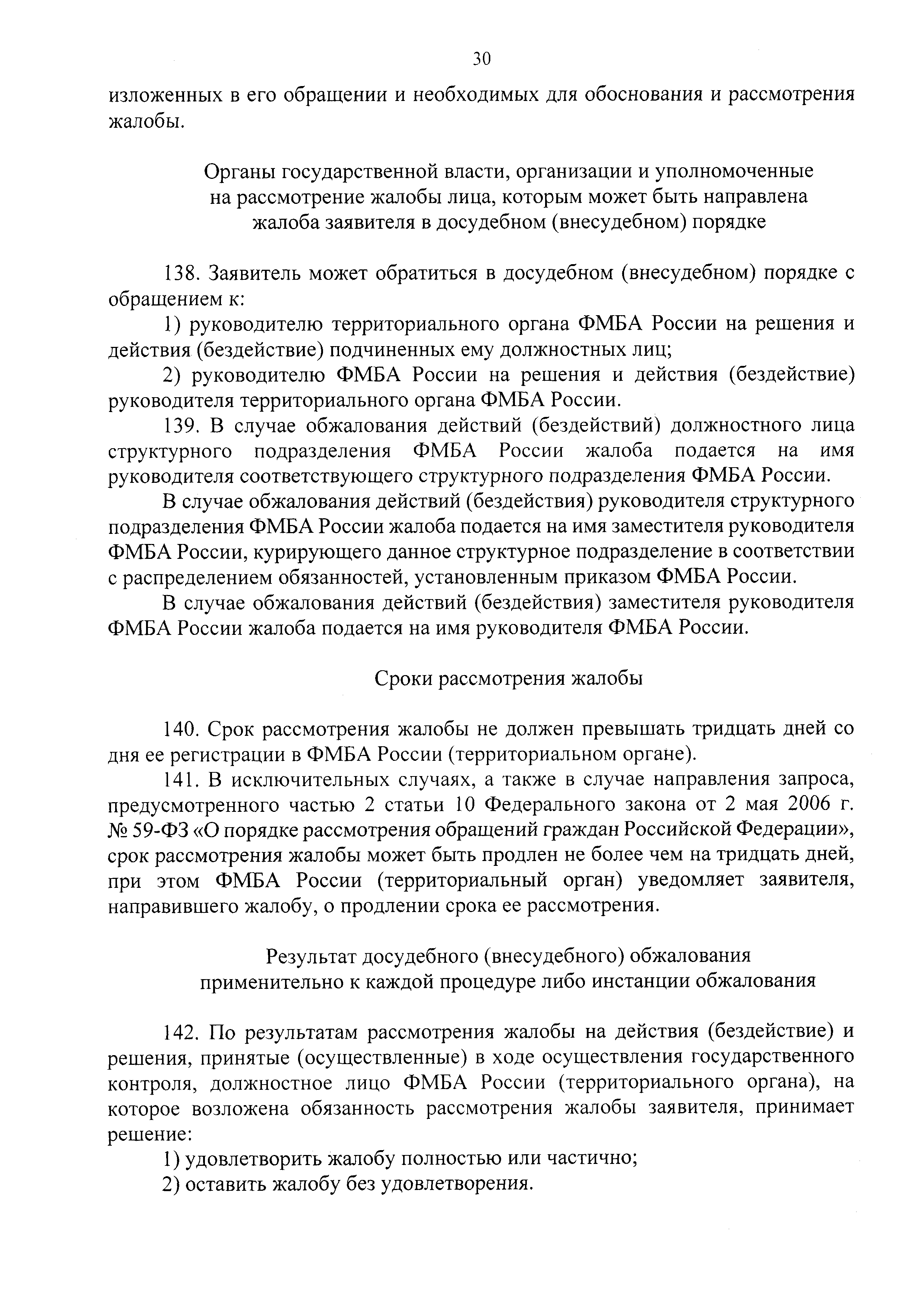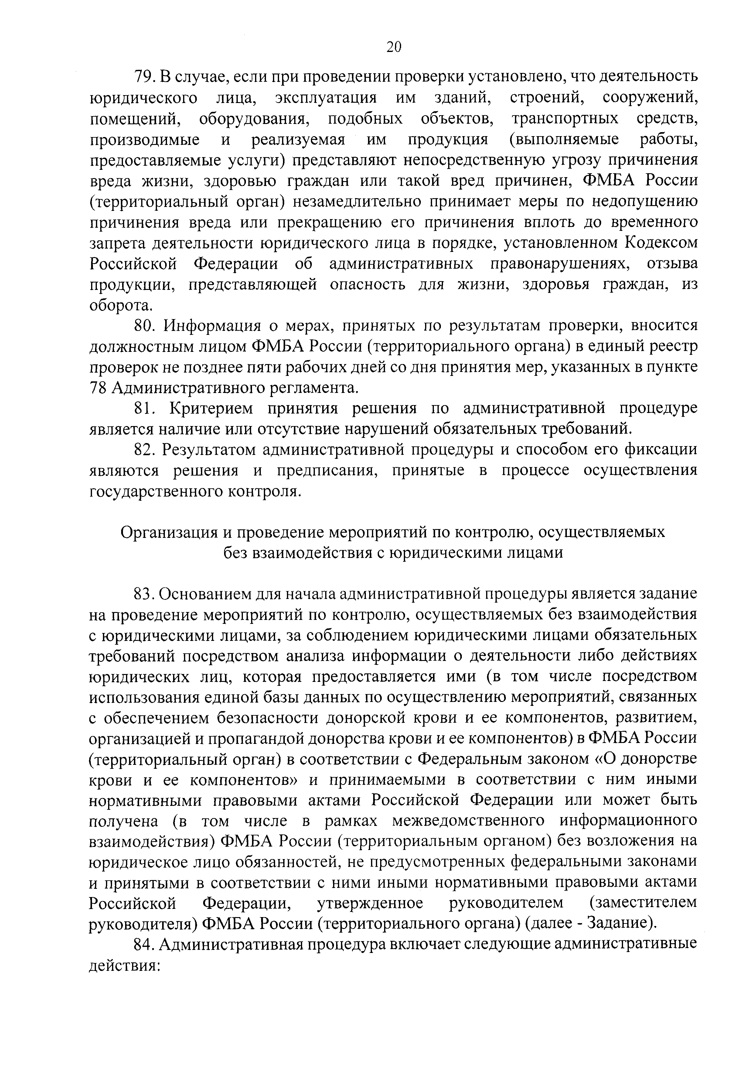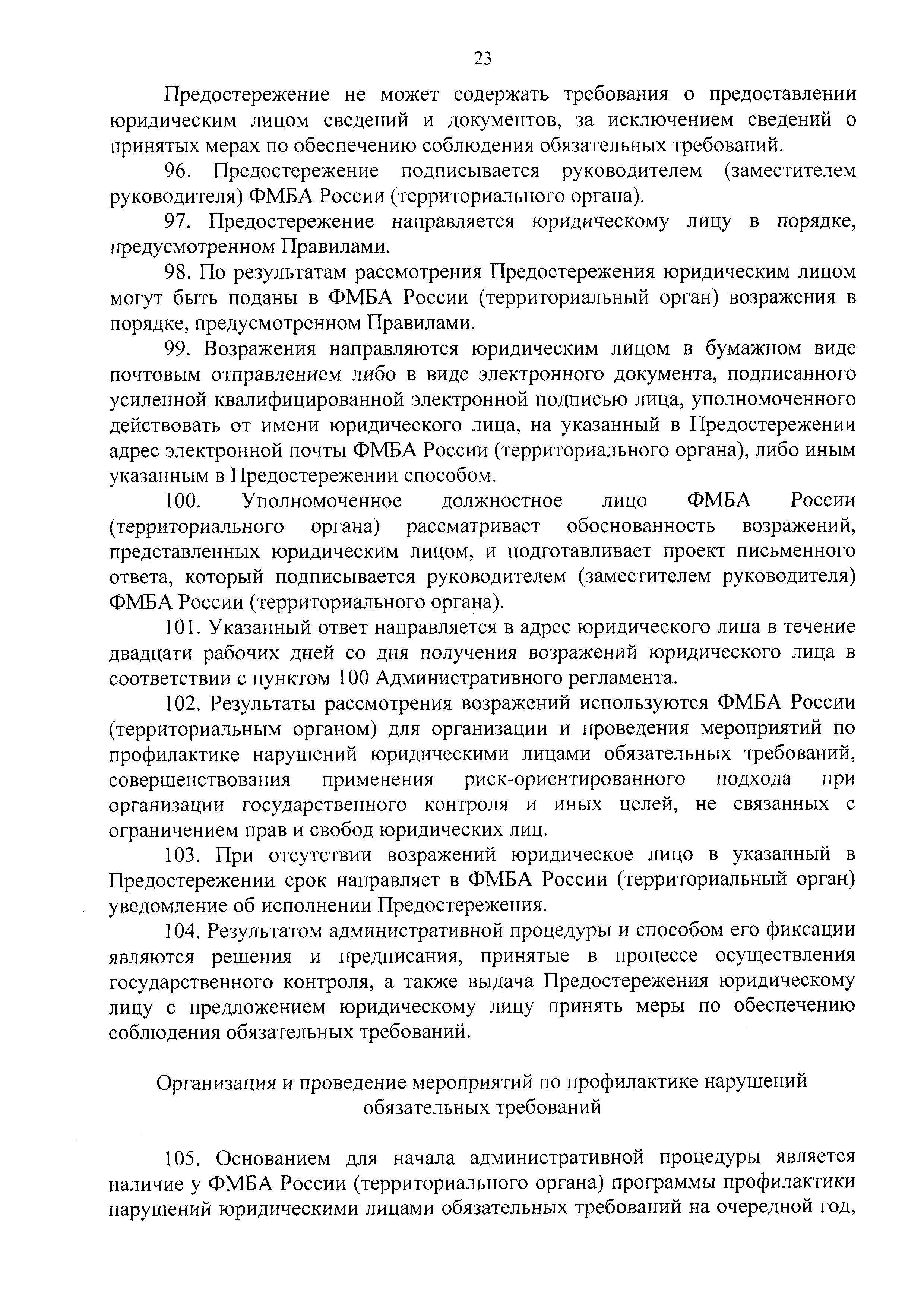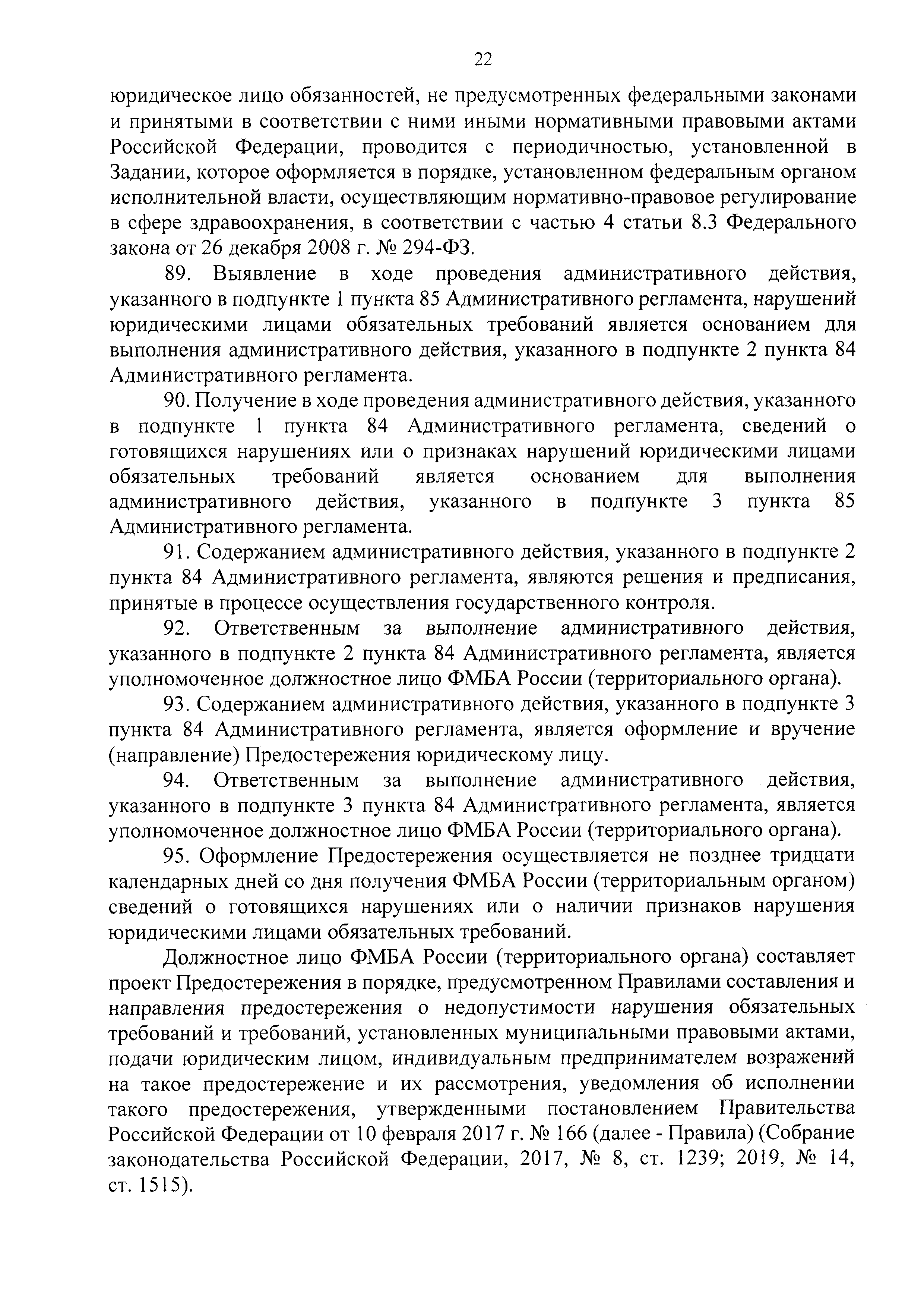 | Оглавление: | I. Общие положения II. Требования к порядку осуществления государственного контроля III. Состав, последовательность и сроки выполнения административных процедур (действий), требования к порядку их выполнения, в том числе особенности выполнения административных процедур (действий) в электронной форме IV. Порядок и формы контроля за осуществлением государственного контроля V. Досудебный (внесудебный) порядок обжалования решений и действий (бездействия) ФМБА России (территориального органа), осуществляющего государственный контроль, а также их должностных лиц |