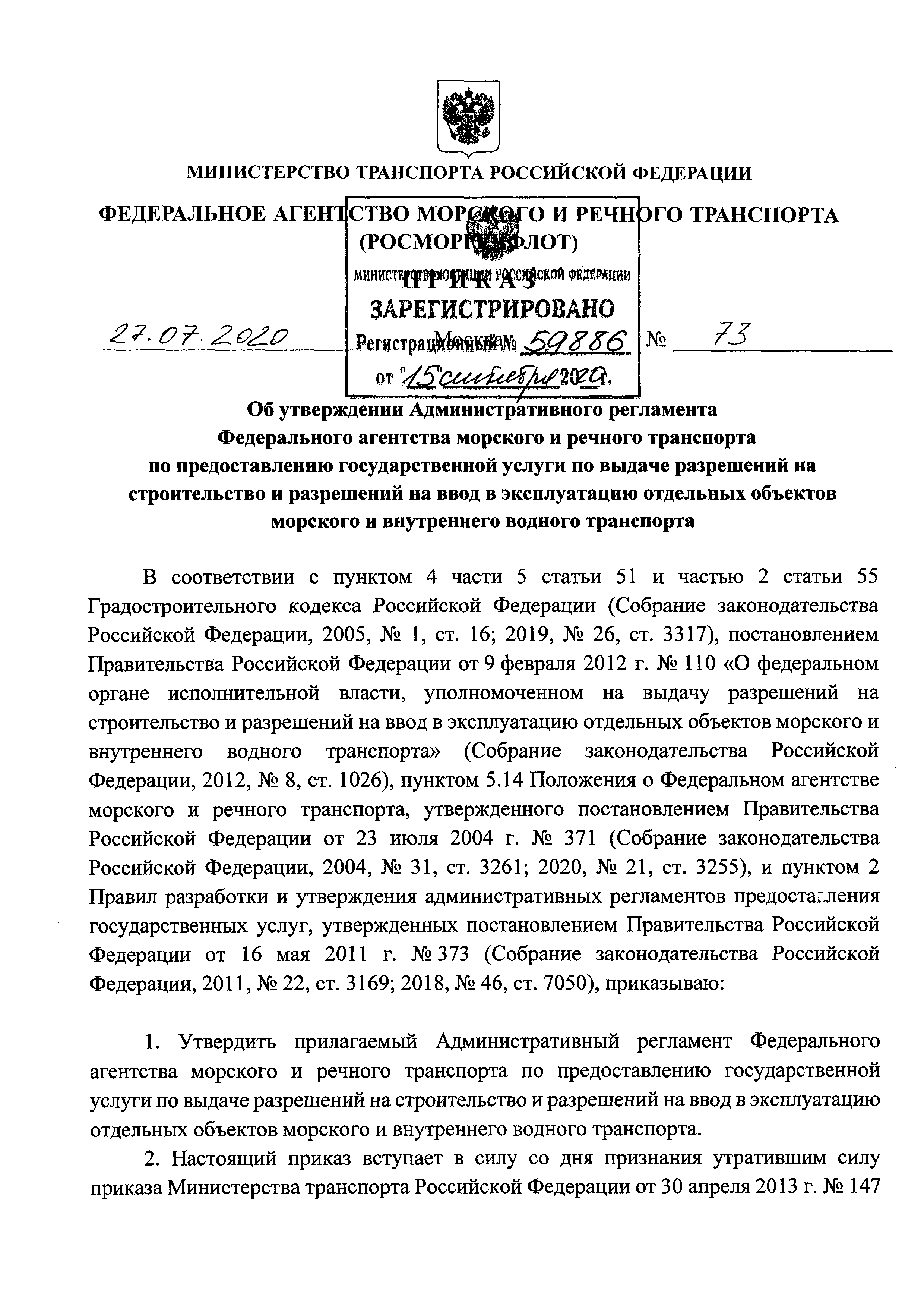 | Название рус.: | Административный регламент Федерального агентства морского и речного транспорта по предоставлению государственной услуги по выдаче разрешений на строительство и разрешений на ввод в эксплуатацию отдельных объектов морского и внутреннего водного транспорта |