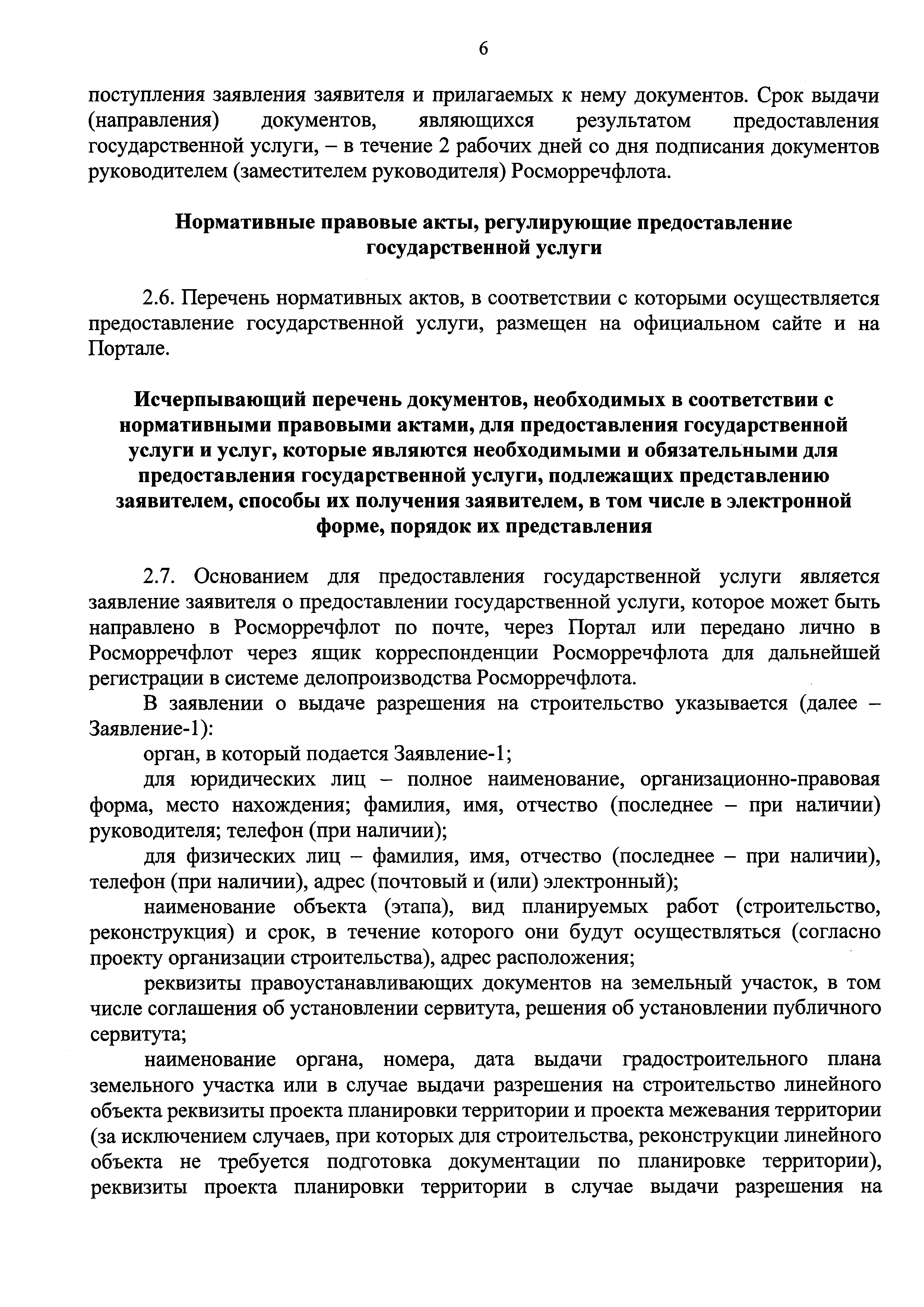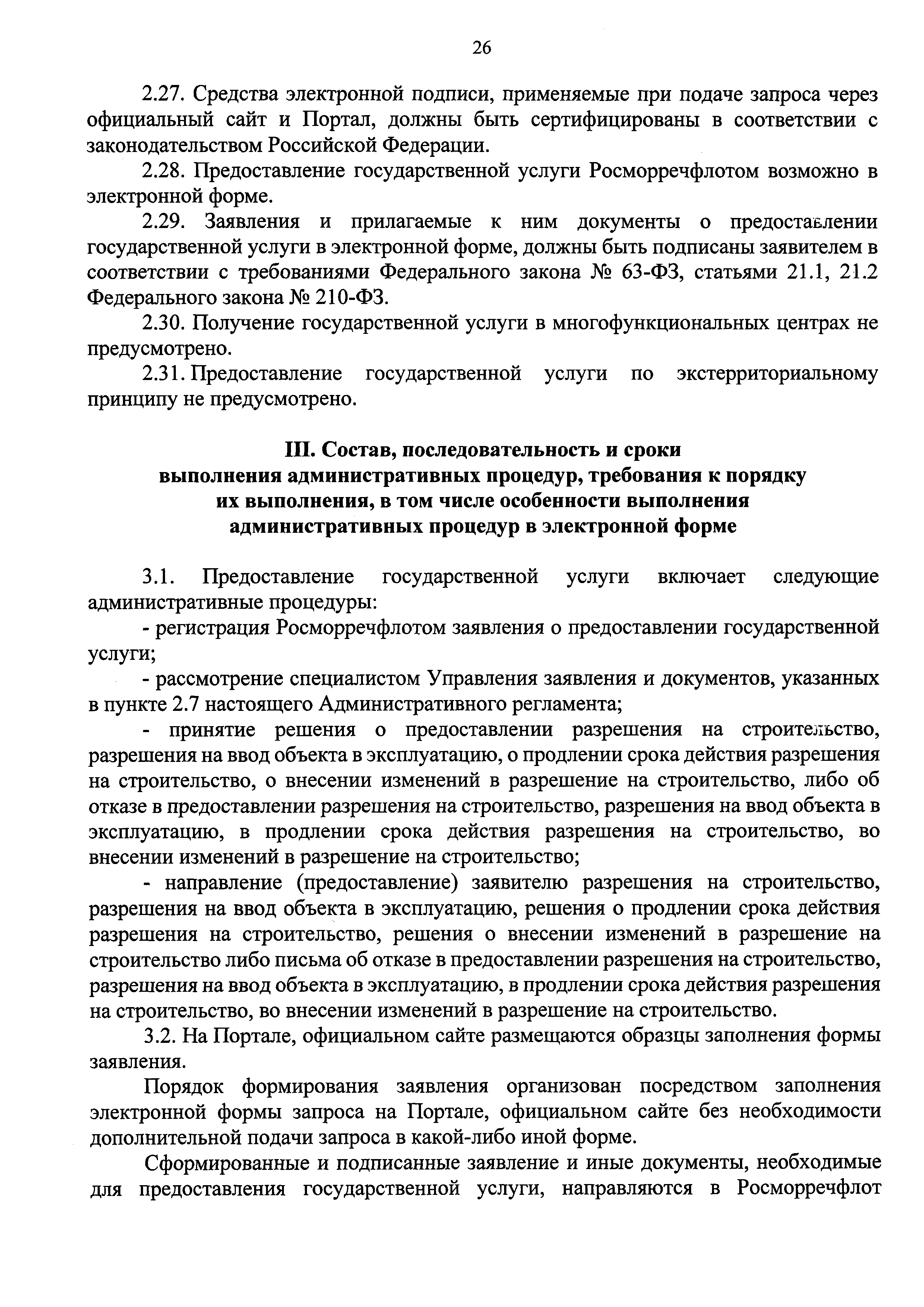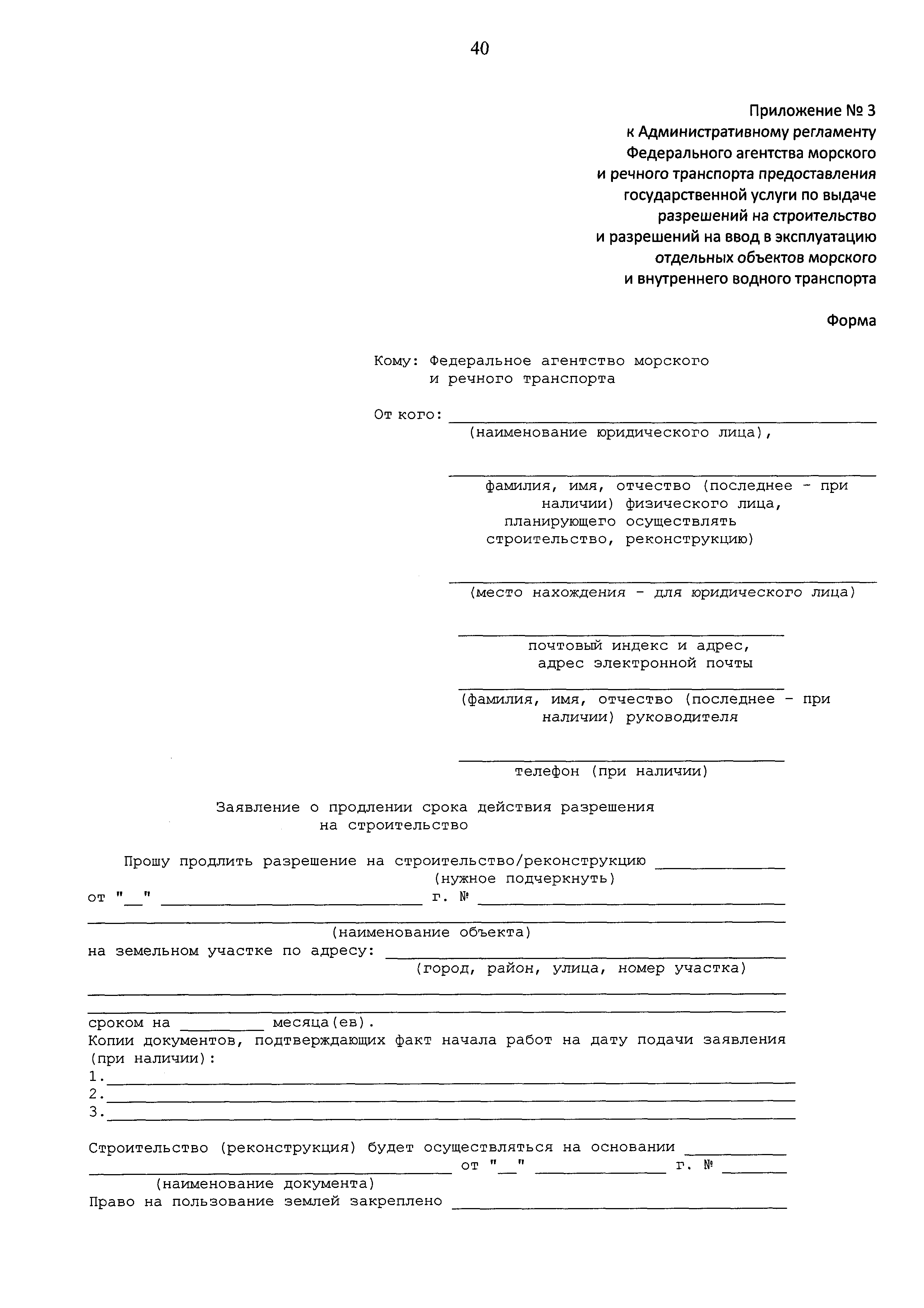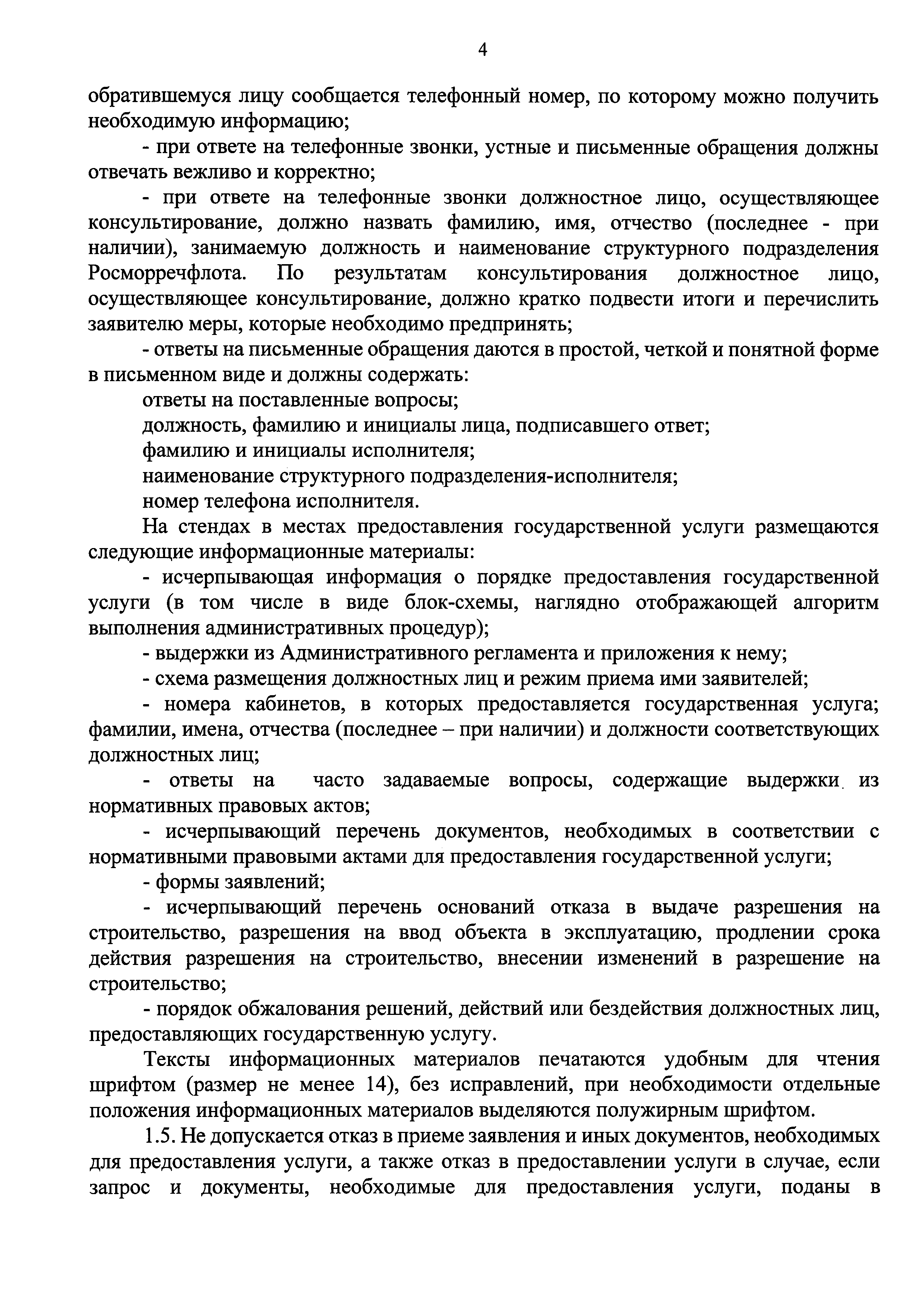 | Оглавление: | I. Общие положения II. Стандарт предоставления государственной услуги III. Состав, последовательность и сроки выполнения административных процедур, требования к порядку их выполнения, в том числе особенности выполнения административных процедур (действий) в электронной форме IV. Формы контроля за предоставлением государственной услуги V. Досудебное (внесудебное) обжалование заявителем решений и действий (бездействия) Росморречфлота, а так же их должностных лиц Приложение № 1. Форма заявления о выдаче разрешения на строительство Приложение № 2. Форма заявления о выдаче разрешения на ввод объекта в эксплуатацию Приложение № 3. Форма заявления о продлении срока действия разрешения на строительство |