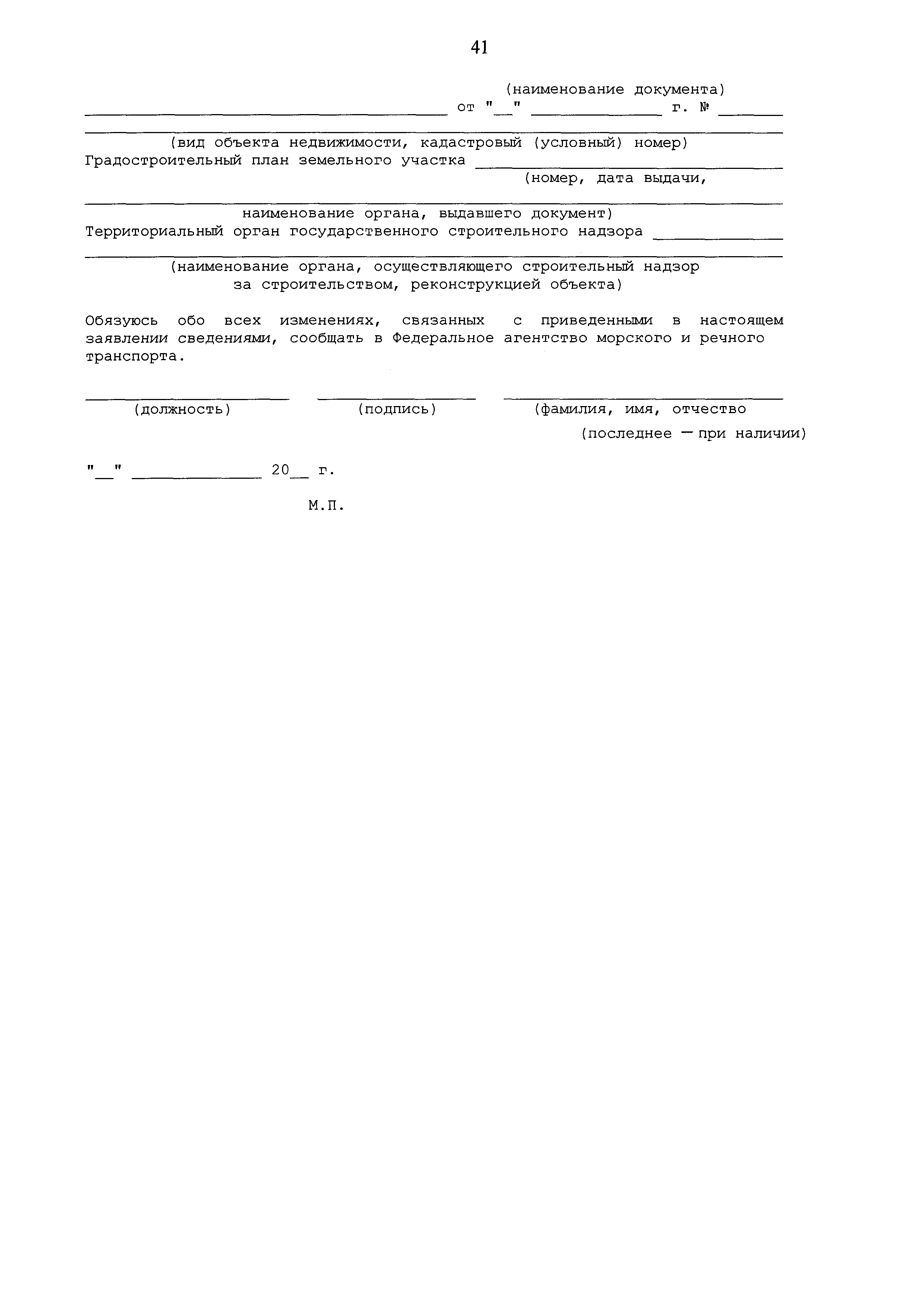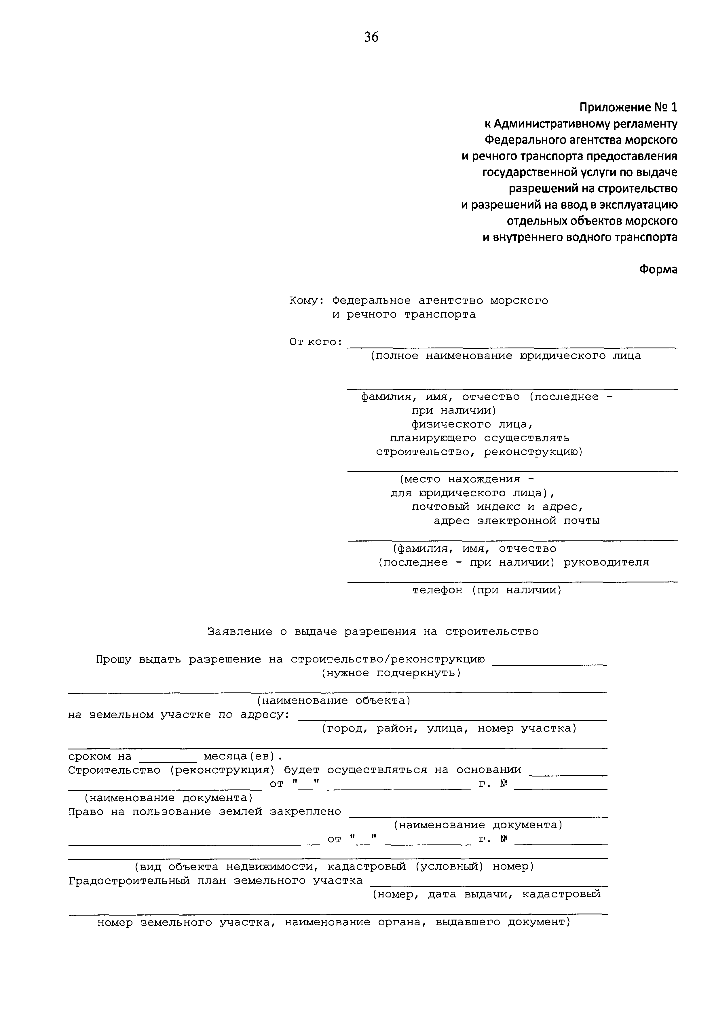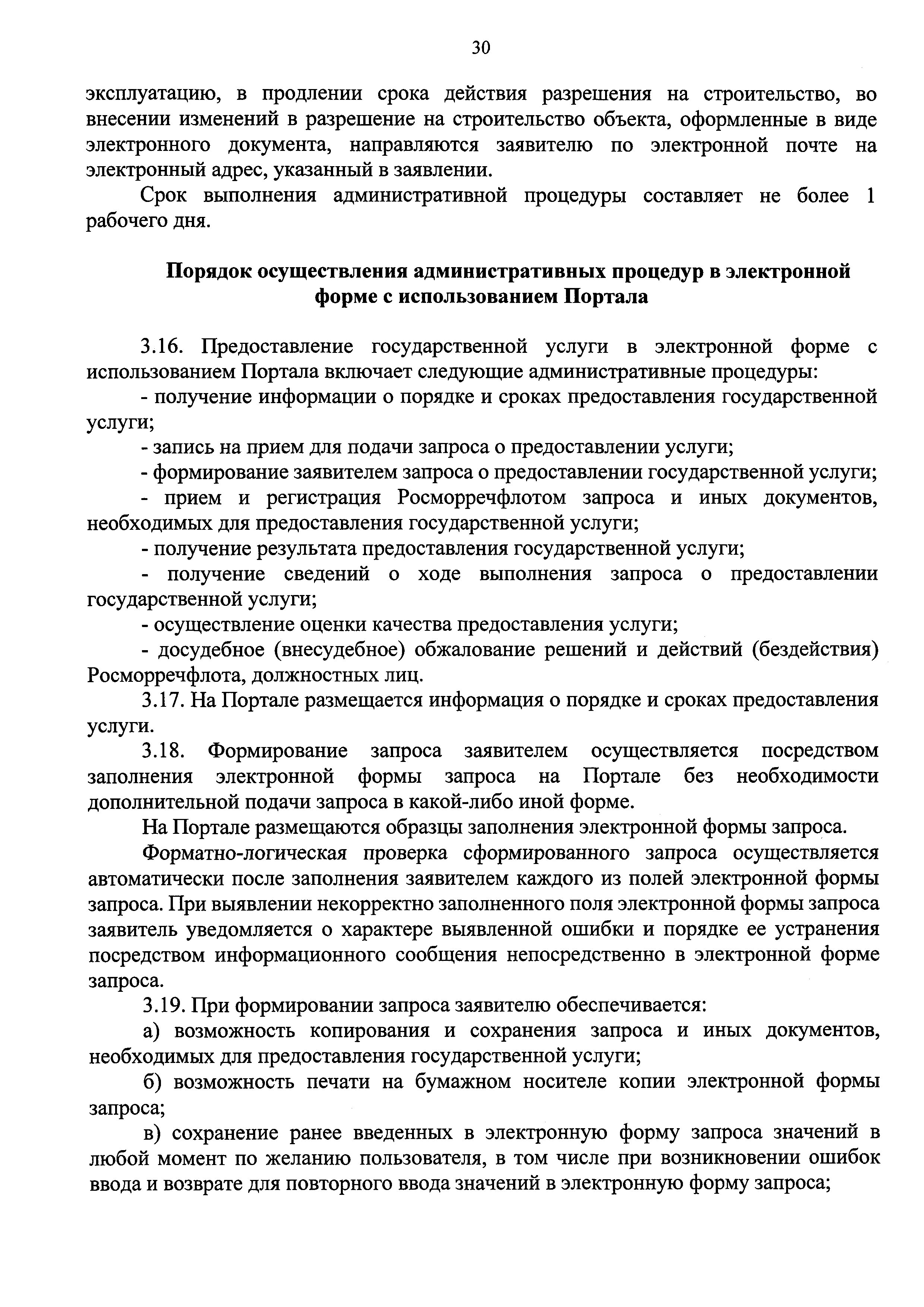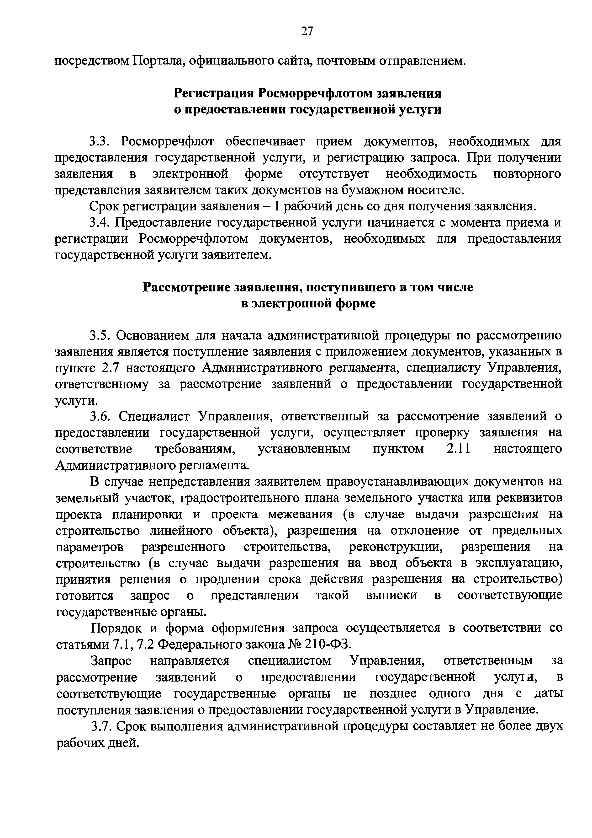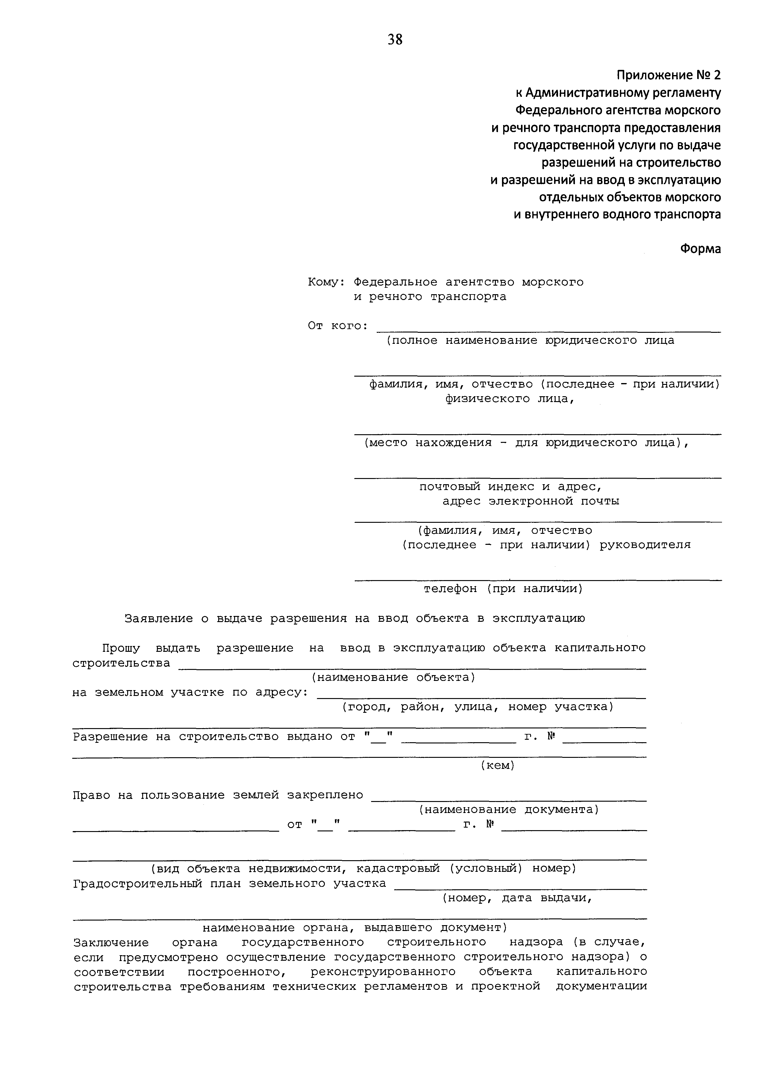 | Оглавление: | I. Общие положения II. Стандарт предоставления государственной услуги III. Состав, последовательность и сроки выполнения административных процедур, требования к порядку их выполнения, в том числе особенности выполнения административных процедур (действий) в электронной форме IV. Формы контроля за предоставлением государственной услуги V. Досудебное (внесудебное) обжалование заявителем решений и действий (бездействия) Росморречфлота, а так же их должностных лиц Приложение № 1. Форма заявления о выдаче разрешения на строительство Приложение № 2. Форма заявления о выдаче разрешения на ввод объекта в эксплуатацию Приложение № 3. Форма заявления о продлении срока действия разрешения на строительство |