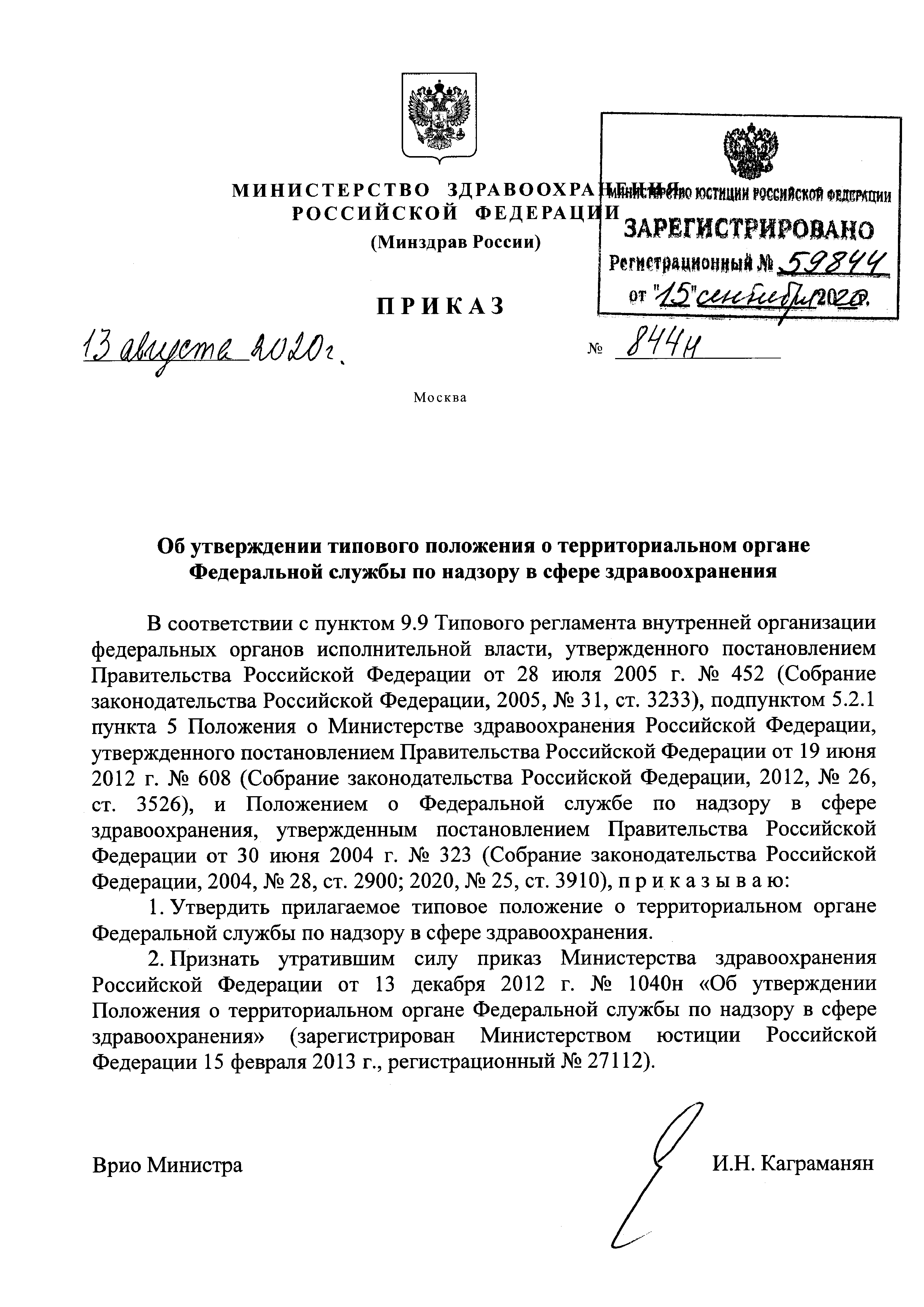 | Утверждён: | 13.08.2020 Министерство здравоохранения Российской Федерации (844н) |
