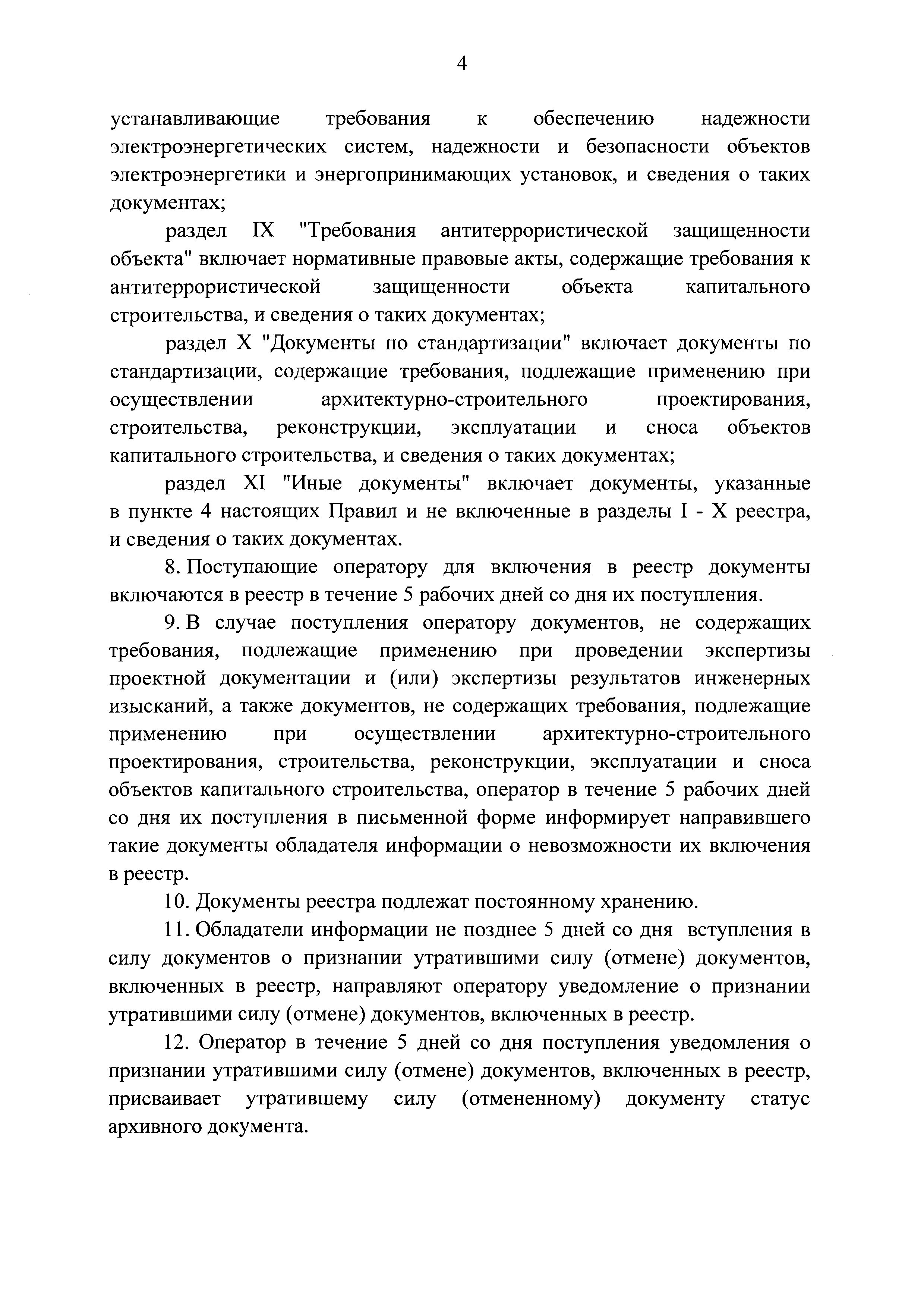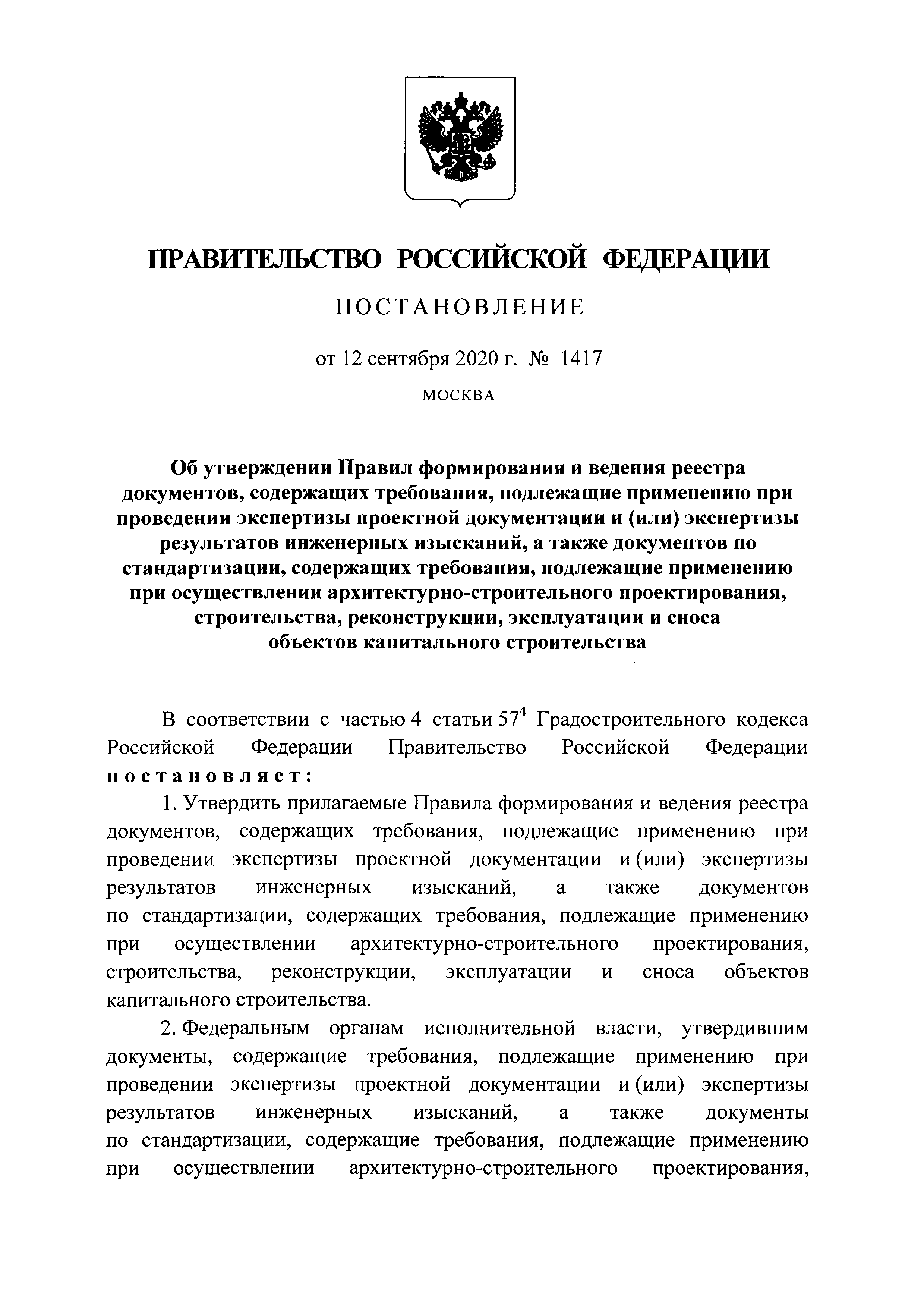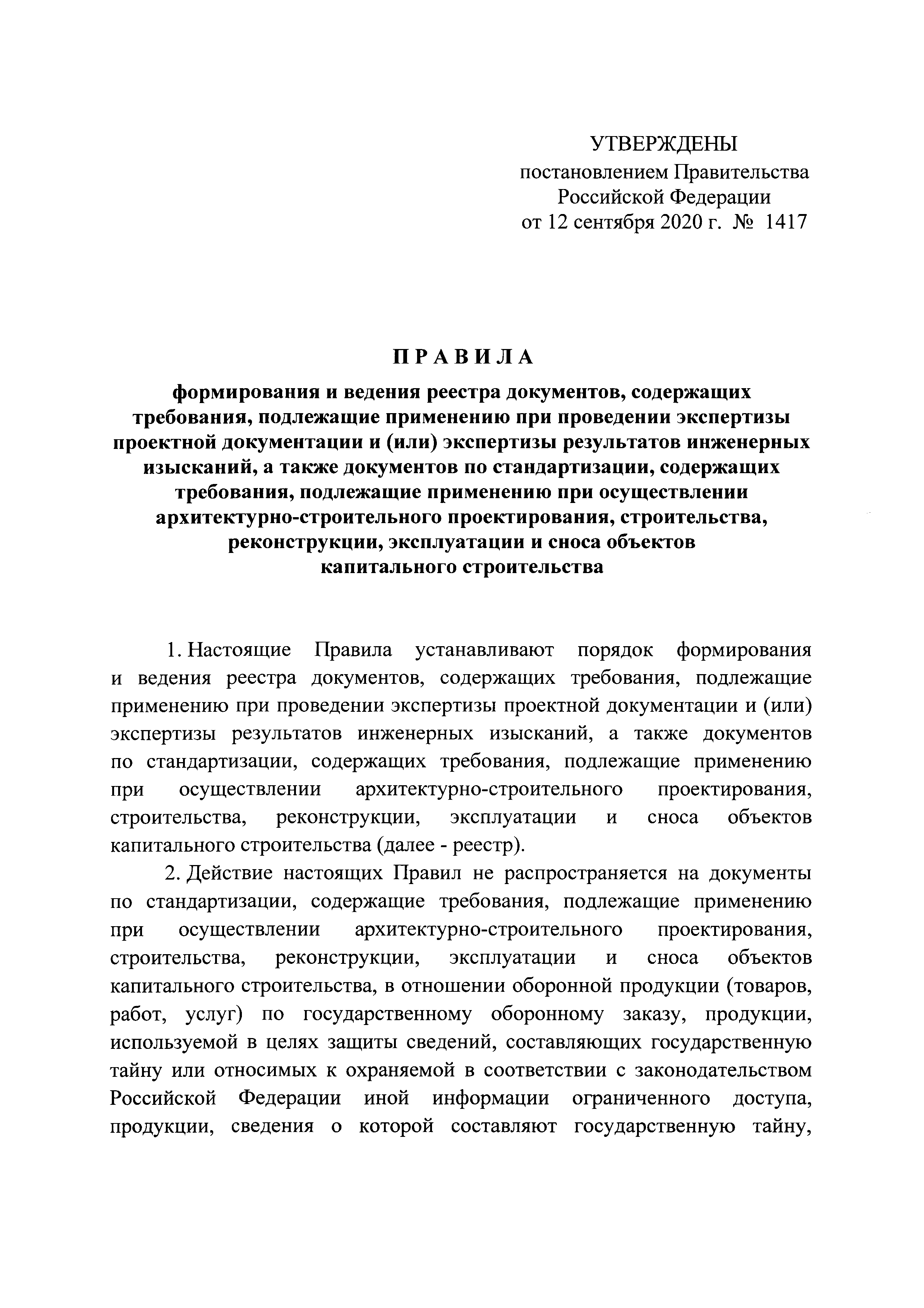 Правила формирования и ведения реестра документов, содержащих требования, подлежащие применению при проведении экспертизы проектной документации и (или) экспертизы результатов инженерных изысканий, а также документов по стандартизации, содержащих требования, подлежащие применению при осуществлении архитектурно-строительного проектирования, строительства, реконструкции, эксплуатации и сноса объектов капитального строительства| Статус: | действует | | Название рус.: | Правила формирования и ведения реестра документов, содержащих требования, подлежащие применению при проведении экспертизы проектной документации и (или) экспертизы результатов инженерных изысканий, а также документов по стандартизации, содержащих требования, подлежащие применению при осуществлении архитектурно-строительного проектирования, строительства, реконструкции, эксплуатации и сноса объектов капитального строительства | | Дата добавления в базу: | 01.01.2021 | | Дата актуализации: | 01.01.2021 | | Дата введения: | 24.09.2020 | | Область применения: | Правила устанавливают порядок формирования и ведения реестра документов, содержащих требования, подлежащие применению при проведении экспертизы проектной документации и (или) экспертизы результатов инженерных изысканий, а также документов по стандартизации, содержащих требования, подлежащие применению при осуществлении архитектурно-строительного проектирования, строительства, реконструкции, эксплуатации и сноса объектов капитального строительства | | Утверждён: | 12.09.2020 Правительство Российской Федерации (1417)