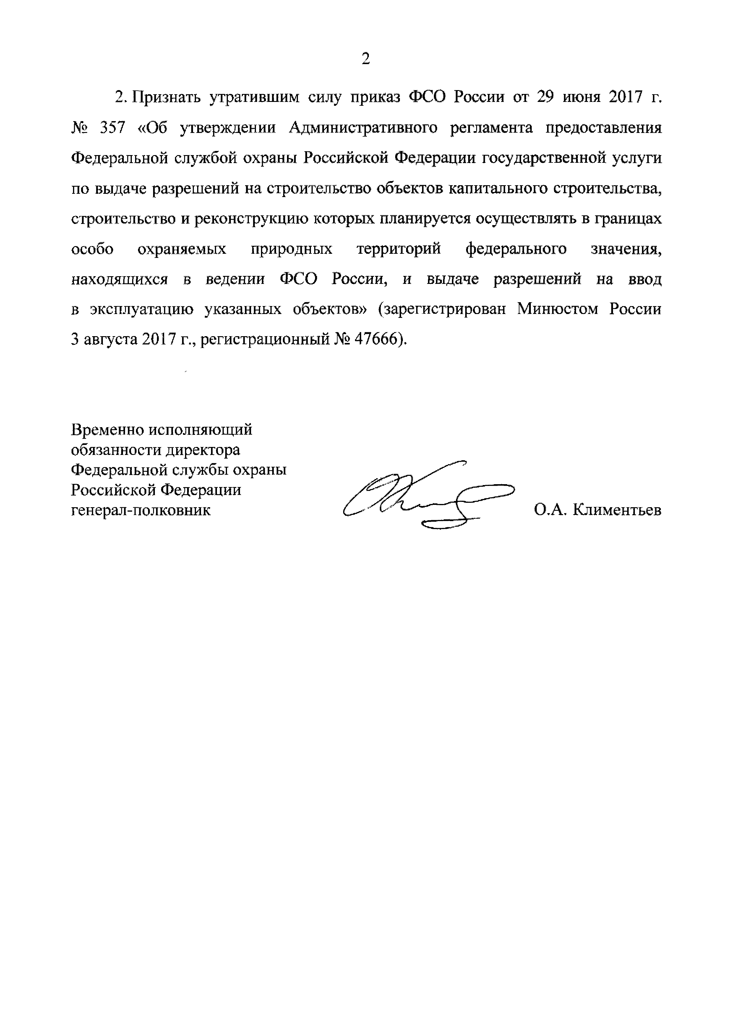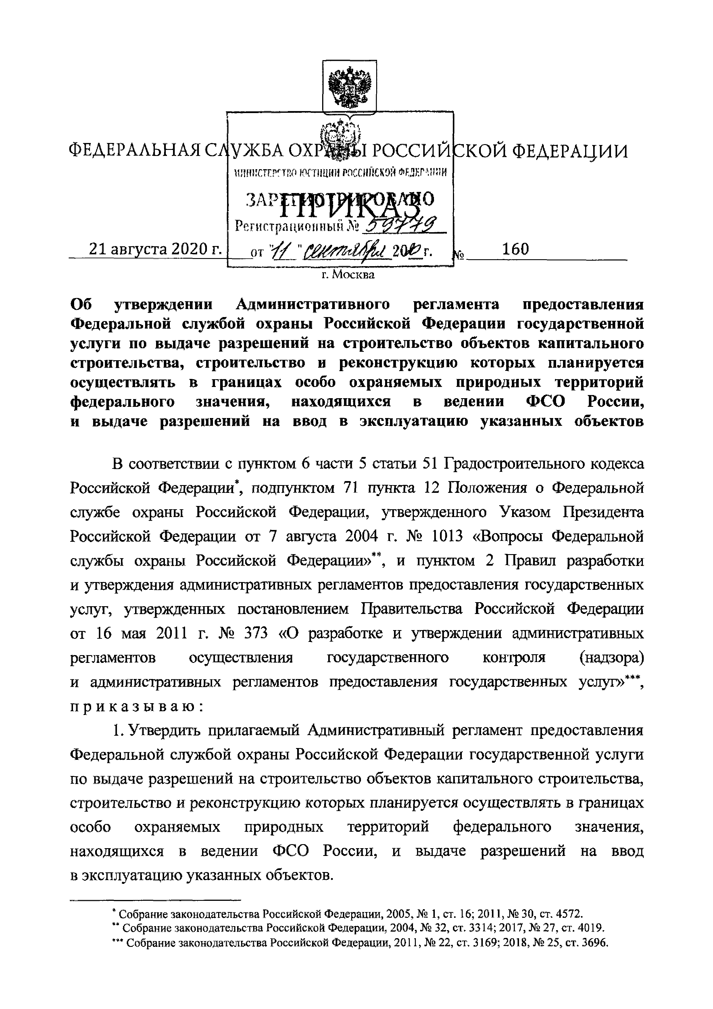 | Название рус.: | Административный регламент предоставления Федеральной службой охраны Российской Федерации государственной услуги по выдаче разрешений на строительство объектов капитального строительства, строительство и реконструкцию которых планируется осуществлять в границах особо охраняемых природных территорий федерального значения, находящихся в ведении ФСО России, и выдаче разрешений на ввод в эксплуатацию указанных объектов |
