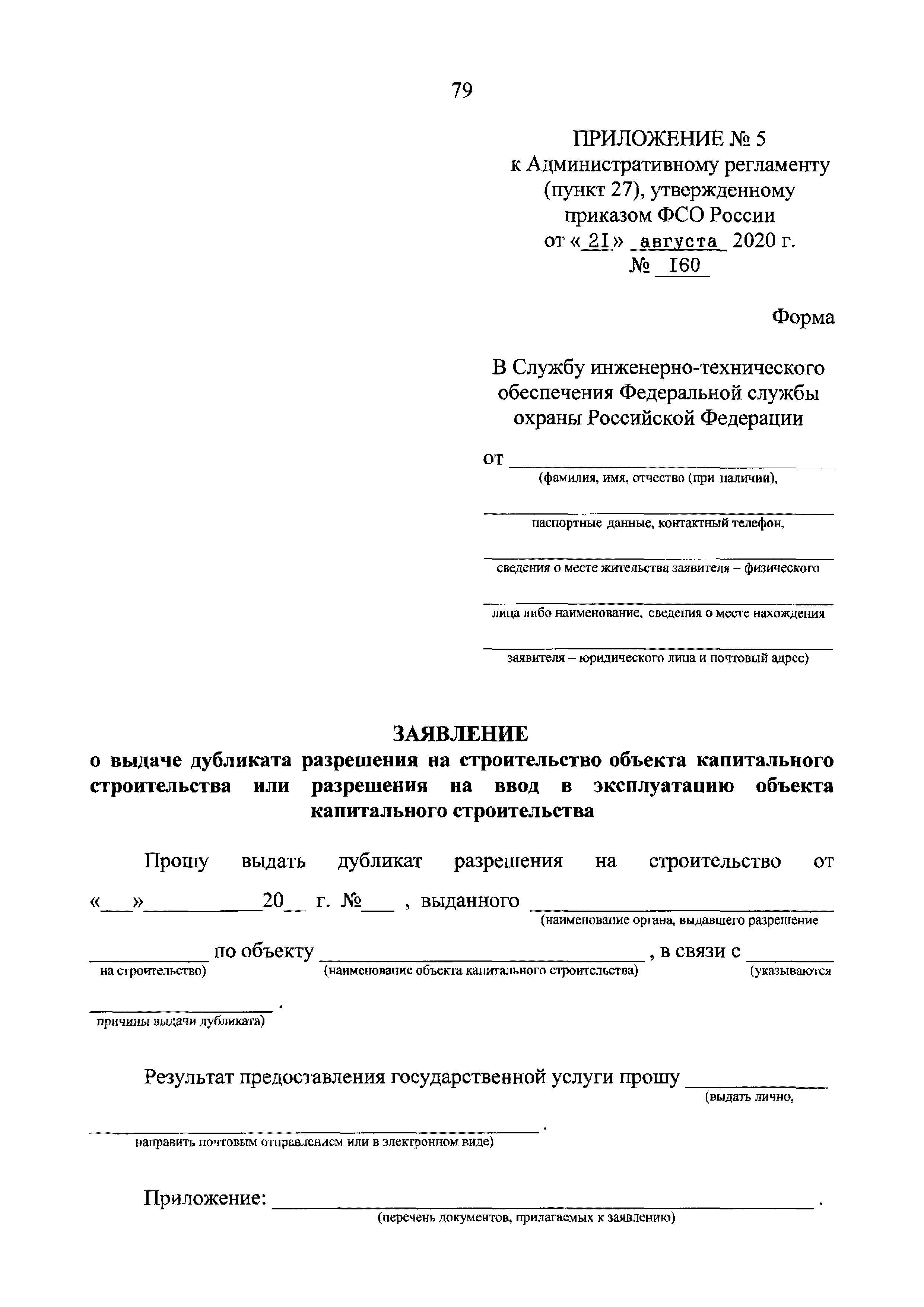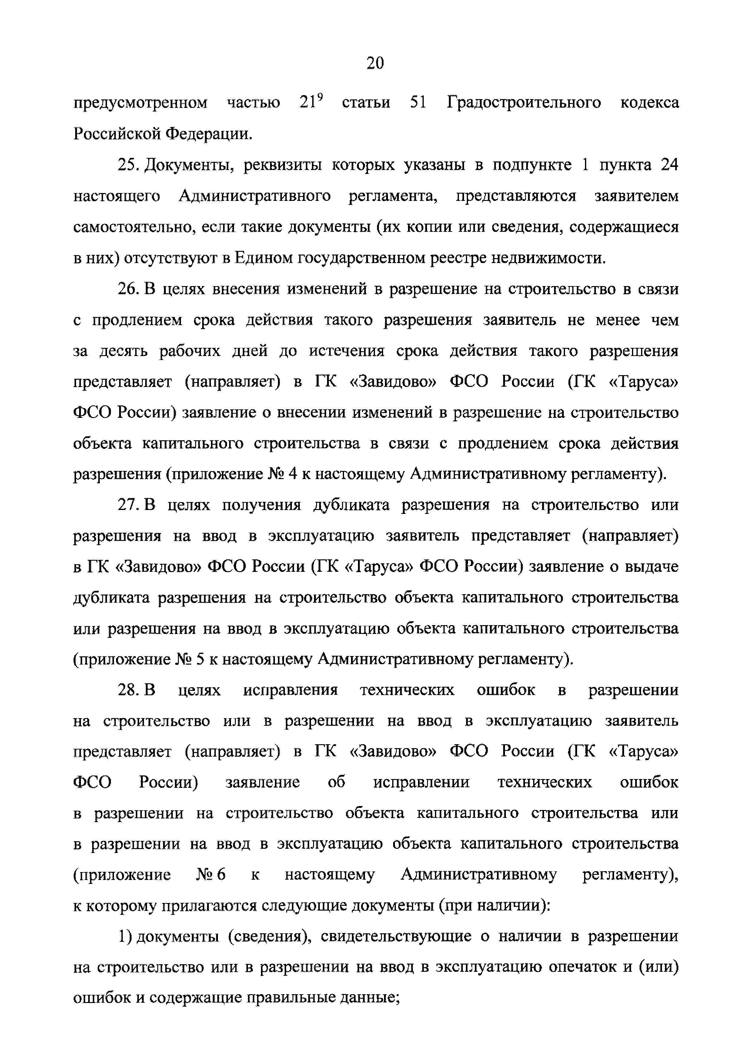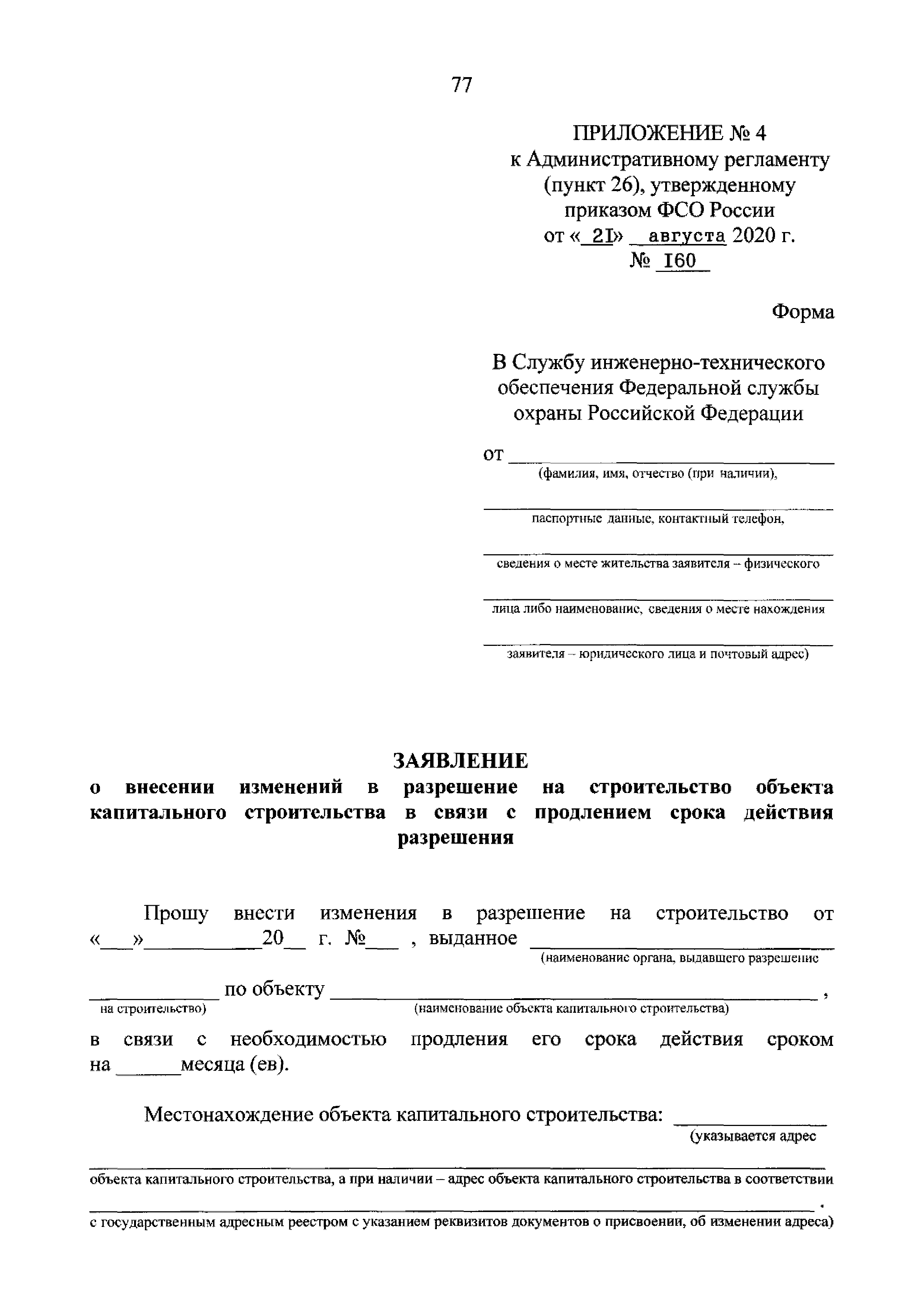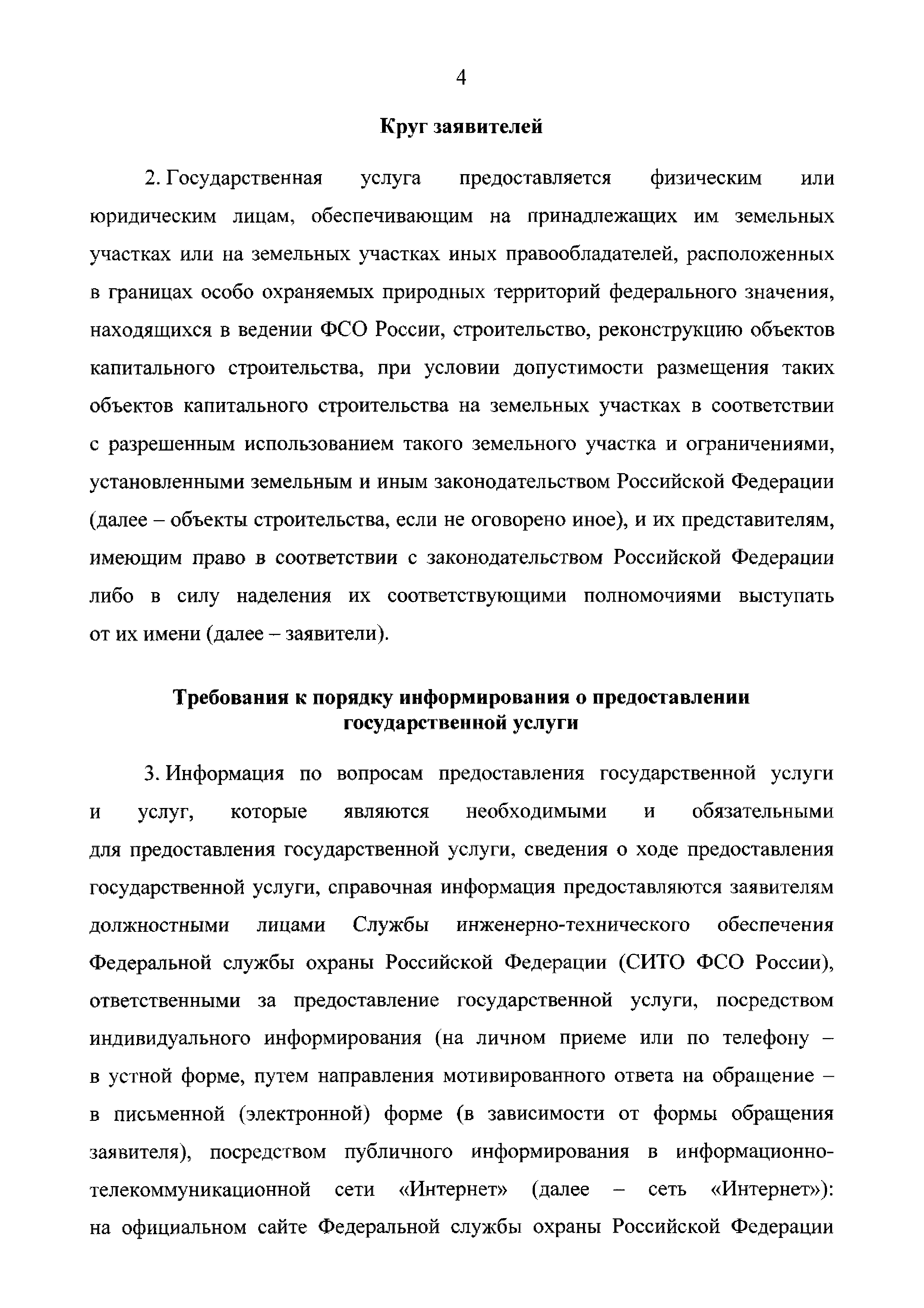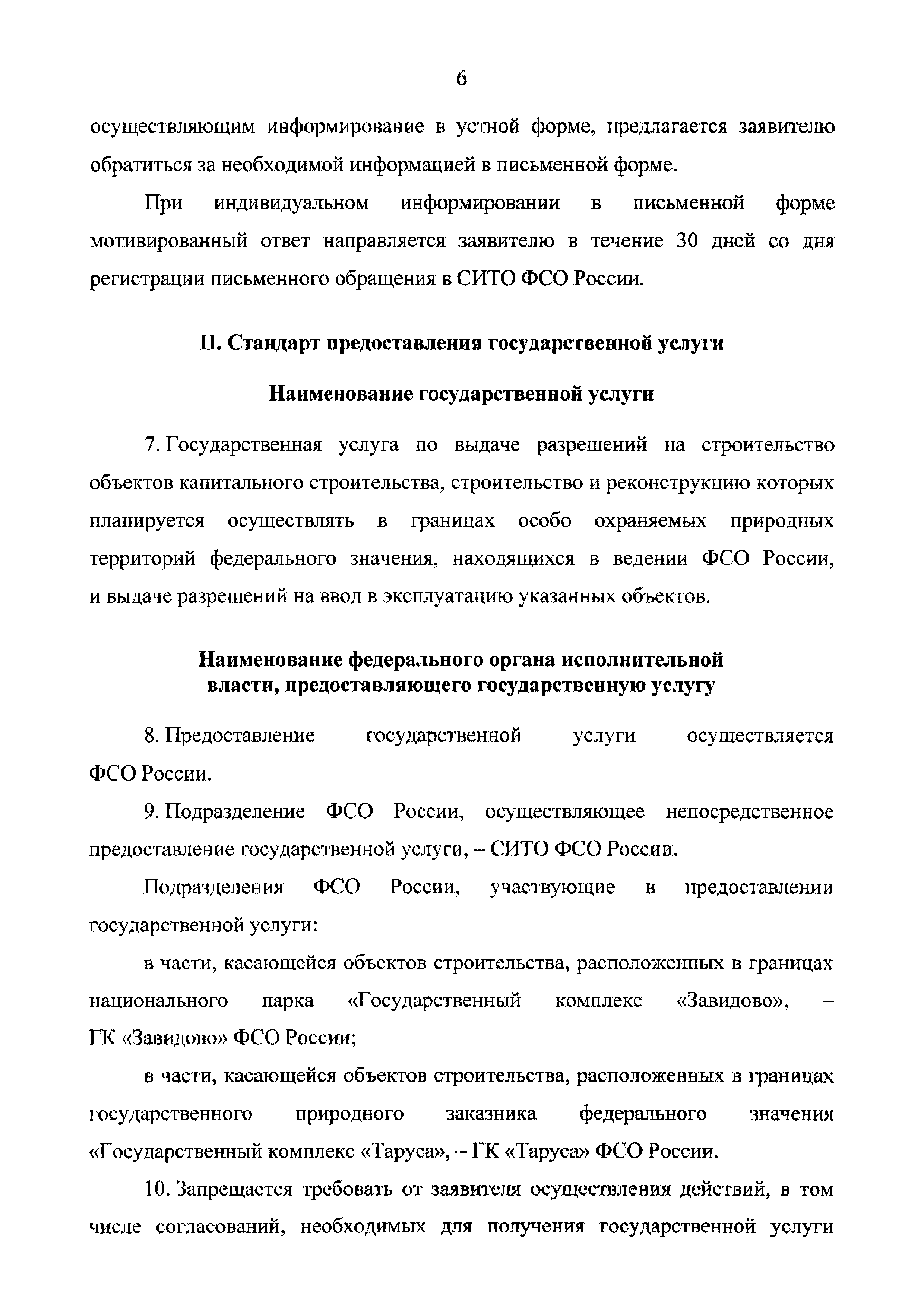| Оглавление: | I. Общие положения II. Стандарт предоставления государственной услуги Наименование государственной услуги III. Состав, последовательность и сроки выполнения административных процедур (действий), требования к порядку их выполнения, в том числе особенности выполнения административных процедур (действий) IV. Формы контроля за предоставлением государственной услуги V. Досудебный (внесудебный) порядок обжалования решений и действий (бездействия) подразделений ФСО России, а также должностных лиц подразделений ФСО России, участвующих в предоставлении государственной услуги Приложение № 1. Форма заявления о выдаче разрешения на строительство объекта капитального строительства Приложение № 2. Форма заявления о выдаче разрешения на ввод в эксплуатацию объекта капитального строительства Приложение № 3. Форма заявления о внесении изменений в разрешение на строительство объекта капитального строительства Приложение № 4. Форма заявления о внесении изменений в разрешение на строительство объекта капитального строительства в связи с продлением срока действия разрешения Приложение № 5. Форма заявления о выдаче дубликата разрешения на строительство объекта капитального строительства или разрешения на ввод в эксплуатацию объекта капитального строительства Приложение № 6. Форма заявления об исправлении технических ошибок в разрешении на строительство объекта капитального строительства или в разрешении на ввод в эксплуатацию объекта капитального строительства |
