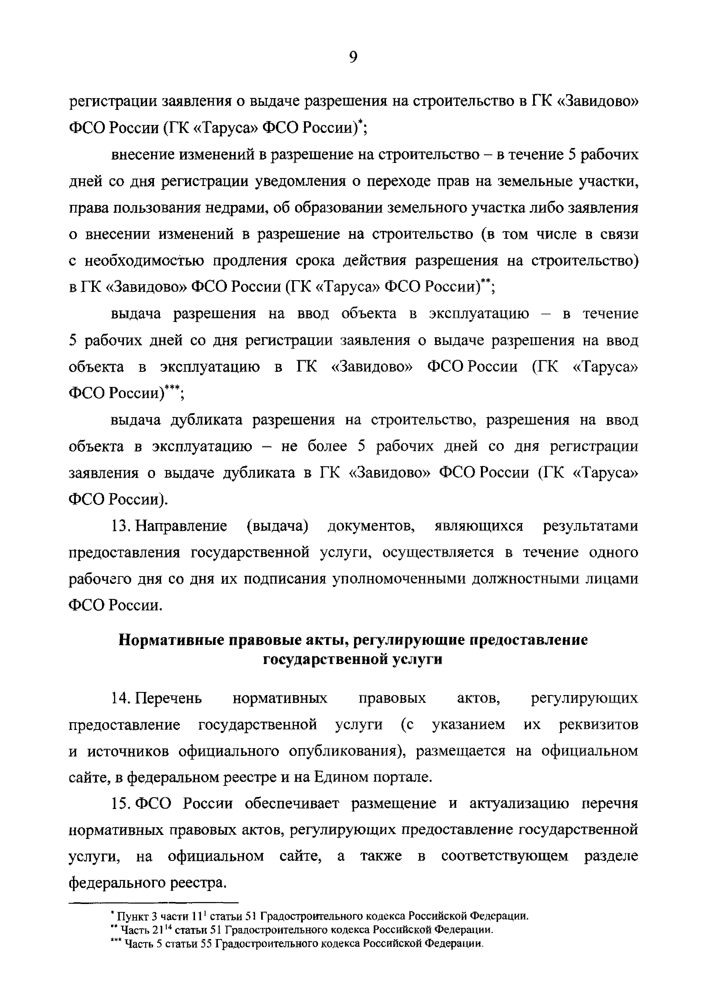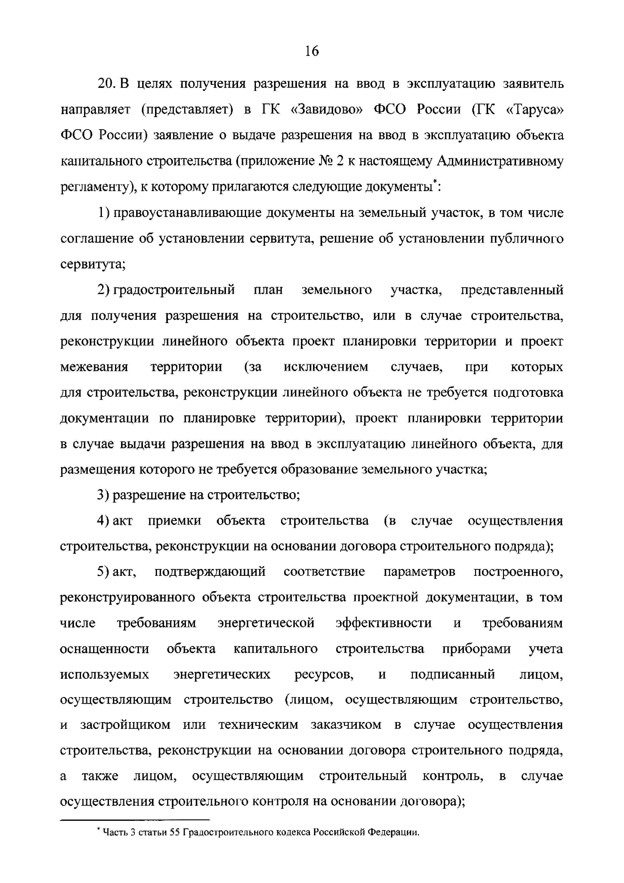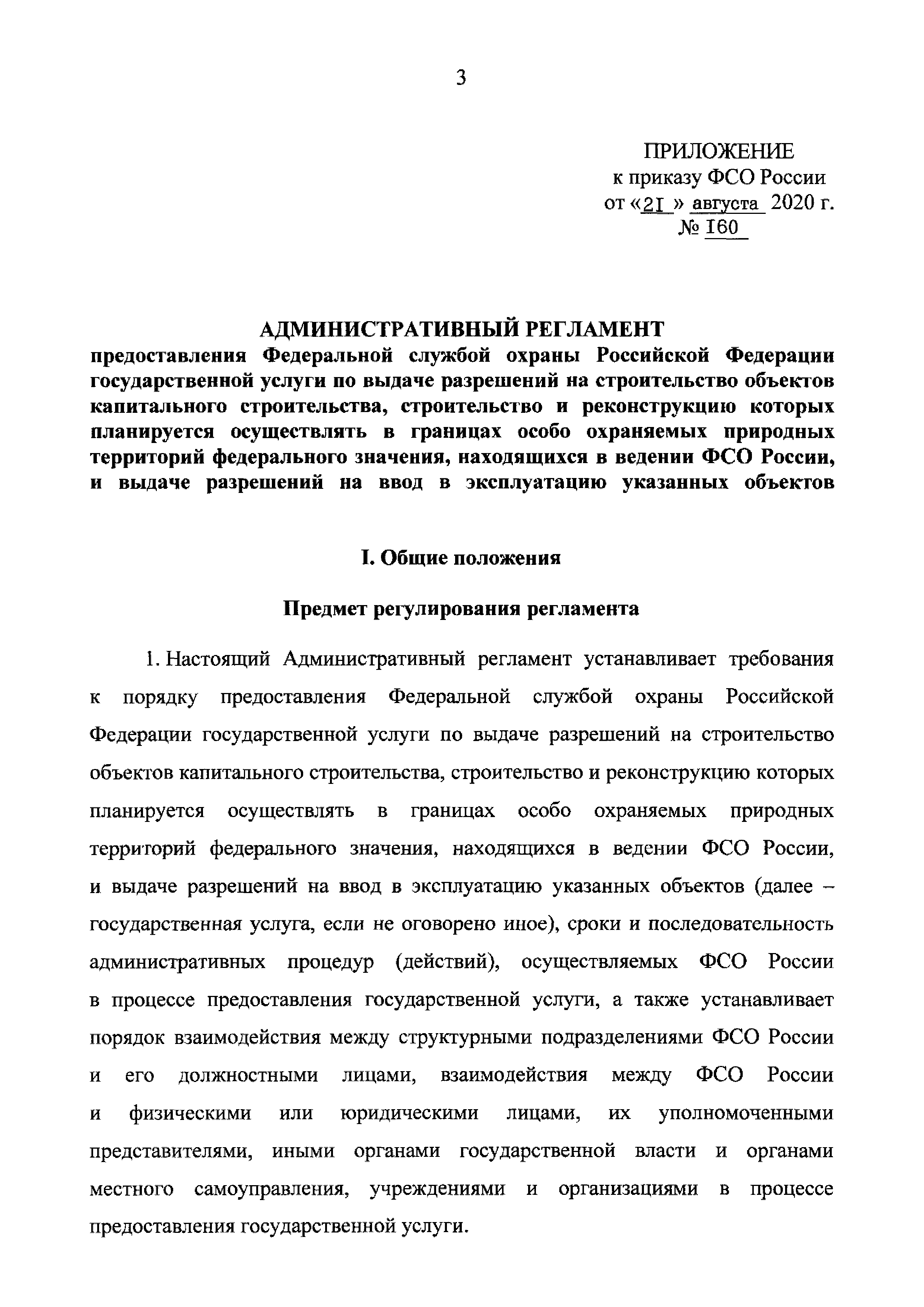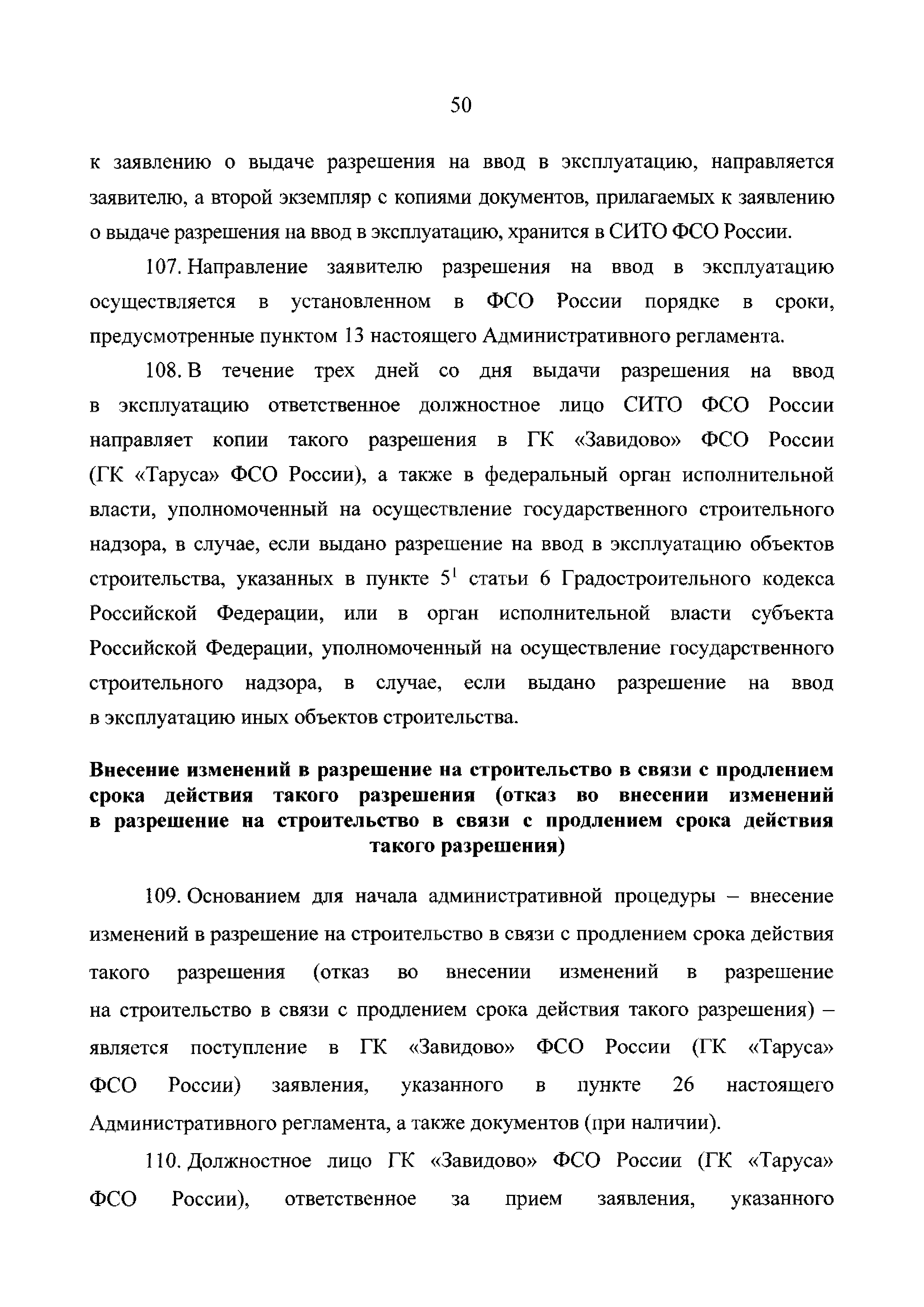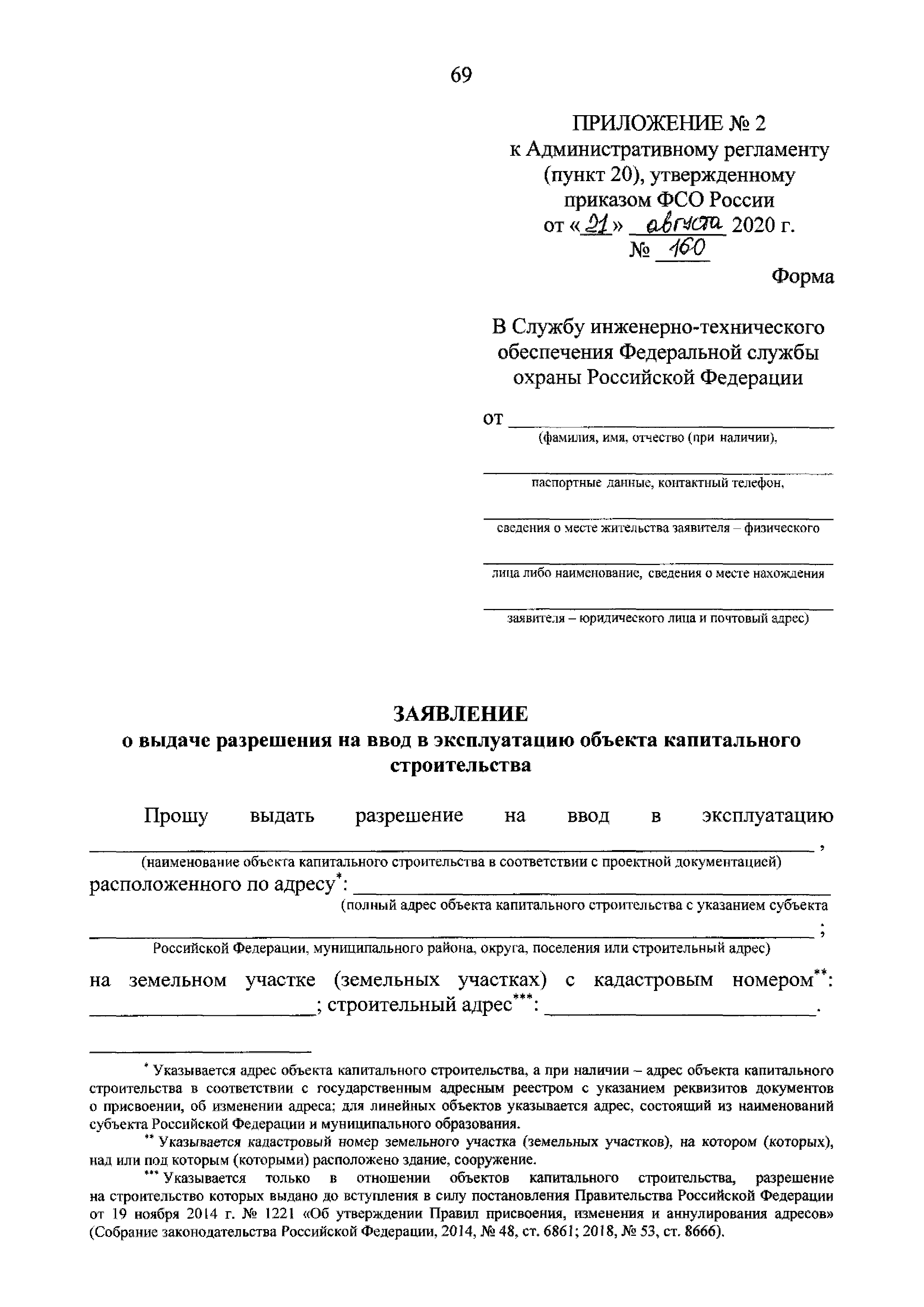 | Оглавление: | I. Общие положения II. Стандарт предоставления государственной услуги Наименование государственной услуги III. Состав, последовательность и сроки выполнения административных процедур (действий), требования к порядку их выполнения, в том числе особенности выполнения административных процедур (действий) IV. Формы контроля за предоставлением государственной услуги V. Досудебный (внесудебный) порядок обжалования решений и действий (бездействия) подразделений ФСО России, а также должностных лиц подразделений ФСО России, участвующих в предоставлении государственной услуги Приложение № 1. Форма заявления о выдаче разрешения на строительство объекта капитального строительства Приложение № 2. Форма заявления о выдаче разрешения на ввод в эксплуатацию объекта капитального строительства Приложение № 3. Форма заявления о внесении изменений в разрешение на строительство объекта капитального строительства Приложение № 4. Форма заявления о внесении изменений в разрешение на строительство объекта капитального строительства в связи с продлением срока действия разрешения Приложение № 5. Форма заявления о выдаче дубликата разрешения на строительство объекта капитального строительства или разрешения на ввод в эксплуатацию объекта капитального строительства Приложение № 6. Форма заявления об исправлении технических ошибок в разрешении на строительство объекта капитального строительства или в разрешении на ввод в эксплуатацию объекта капитального строительства |