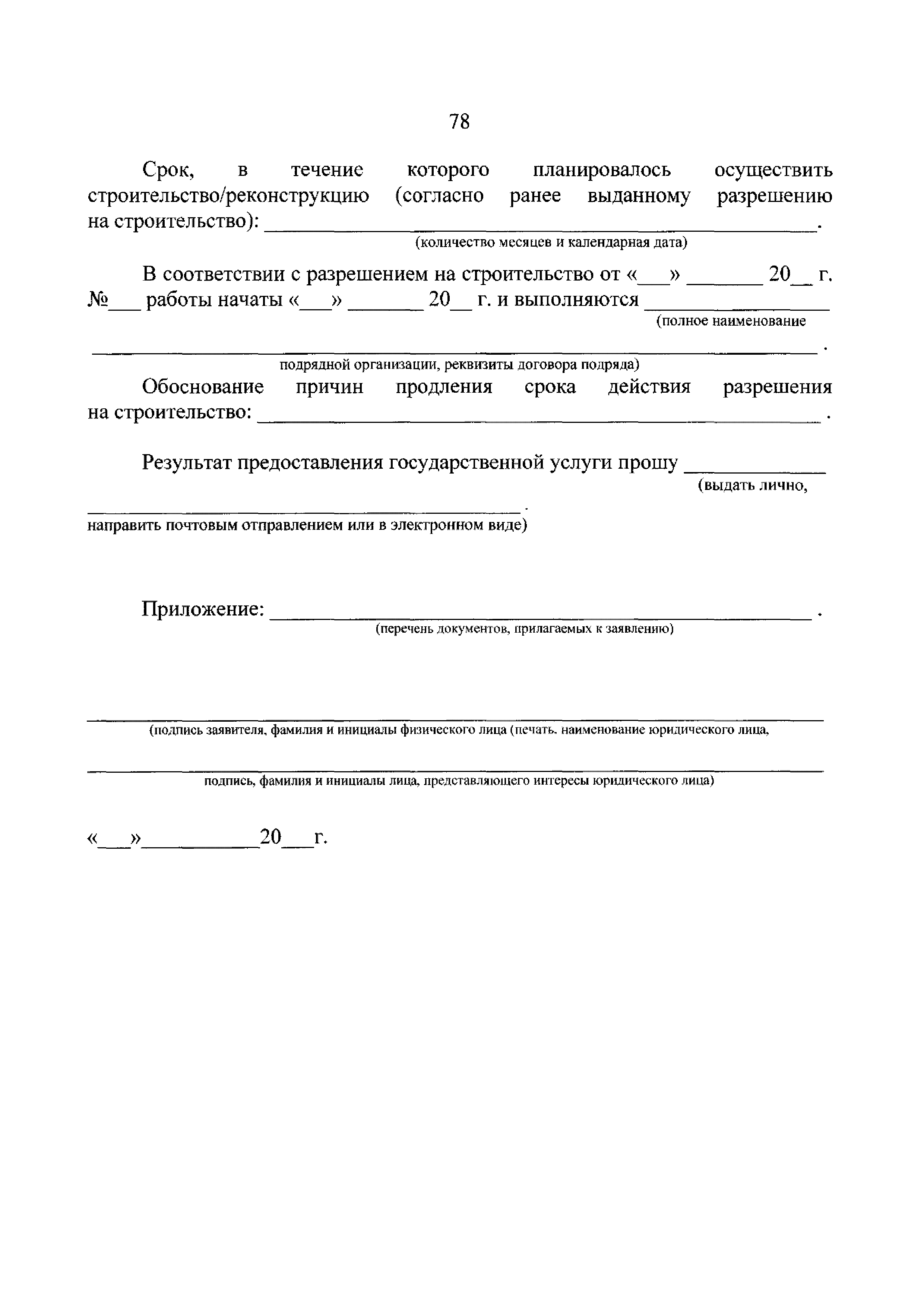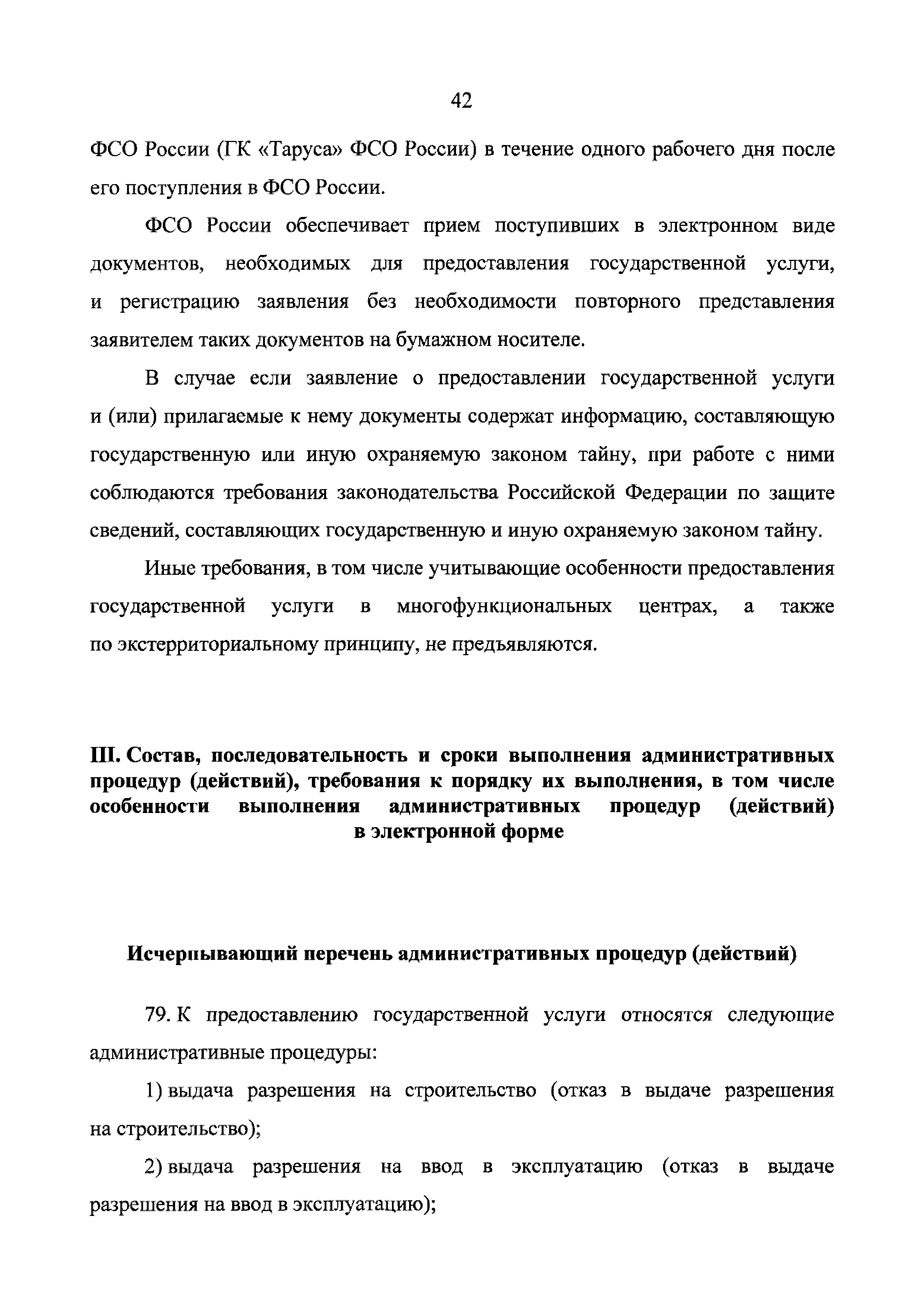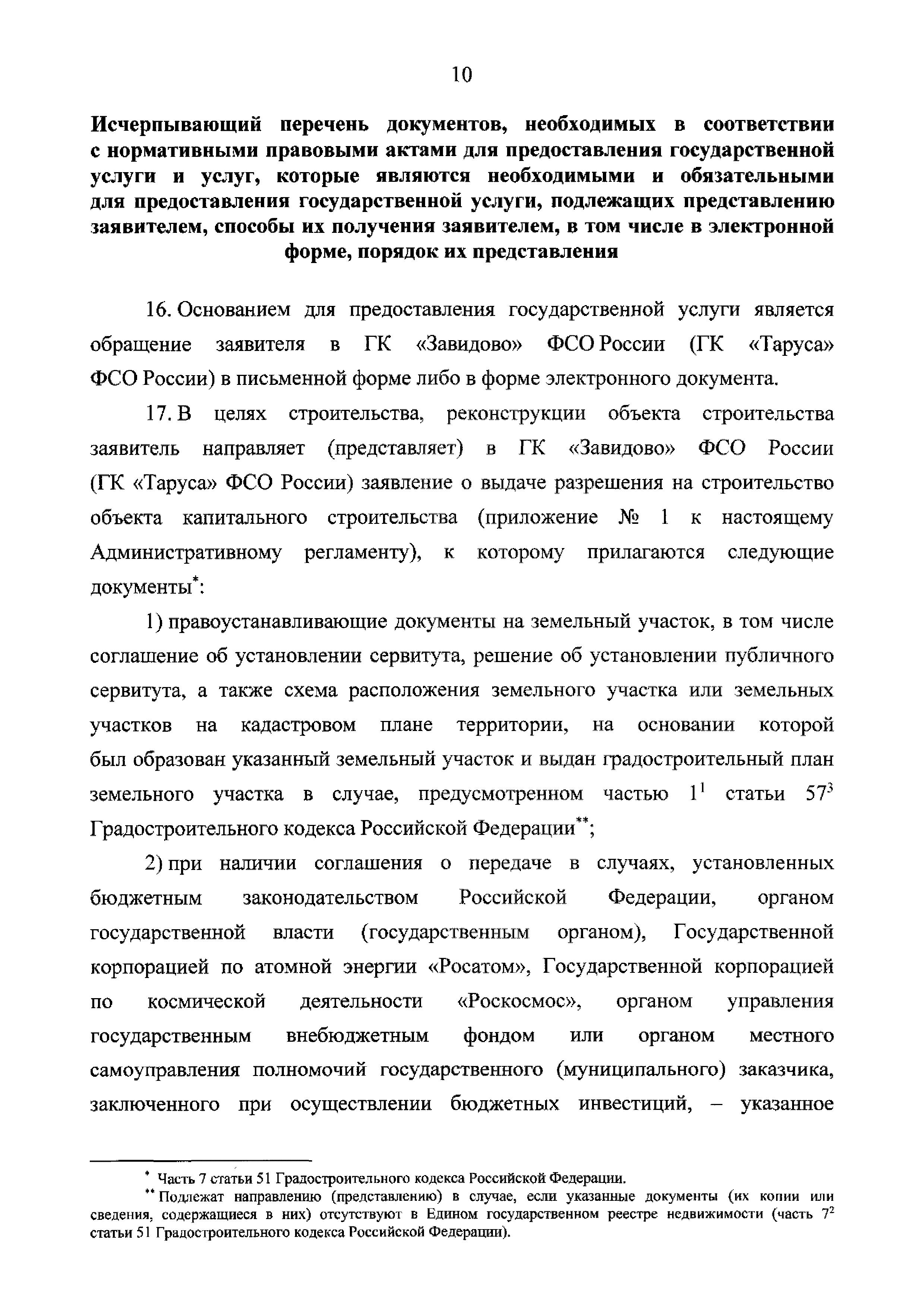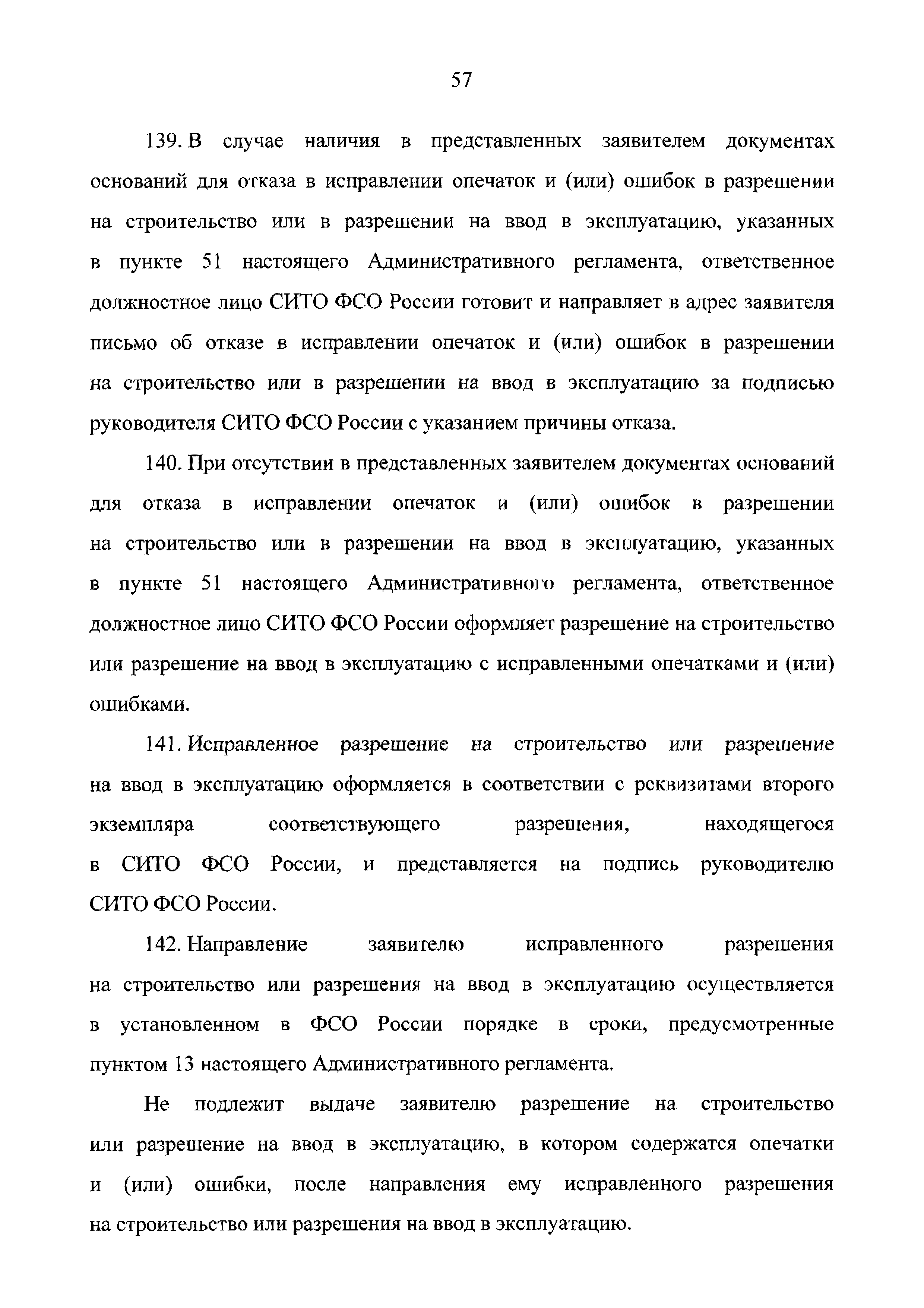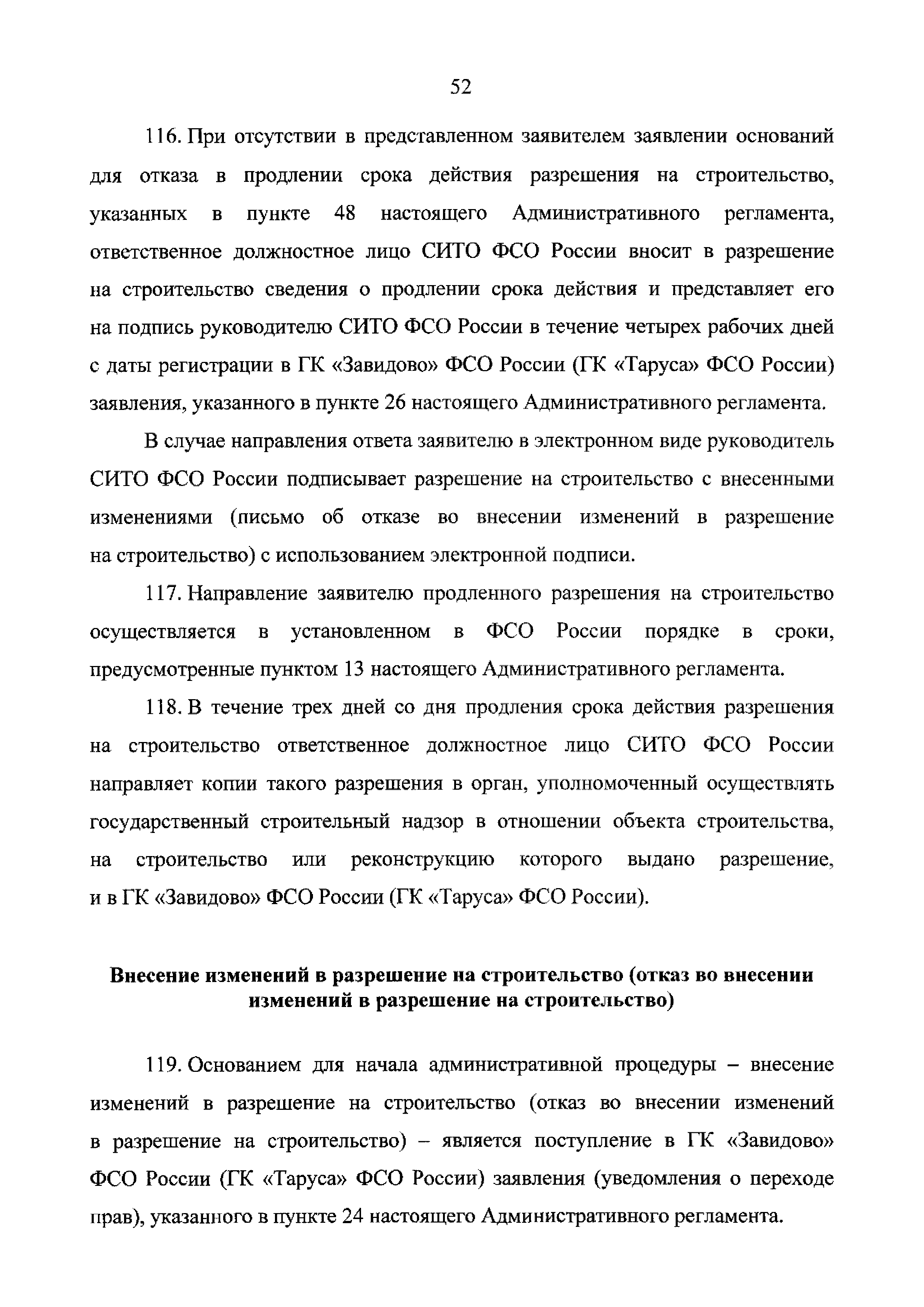 | Оглавление: | I. Общие положения II. Стандарт предоставления государственной услуги Наименование государственной услуги III. Состав, последовательность и сроки выполнения административных процедур (действий), требования к порядку их выполнения, в том числе особенности выполнения административных процедур (действий) IV. Формы контроля за предоставлением государственной услуги V. Досудебный (внесудебный) порядок обжалования решений и действий (бездействия) подразделений ФСО России, а также должностных лиц подразделений ФСО России, участвующих в предоставлении государственной услуги Приложение № 1. Форма заявления о выдаче разрешения на строительство объекта капитального строительства Приложение № 2. Форма заявления о выдаче разрешения на ввод в эксплуатацию объекта капитального строительства Приложение № 3. Форма заявления о внесении изменений в разрешение на строительство объекта капитального строительства Приложение № 4. Форма заявления о внесении изменений в разрешение на строительство объекта капитального строительства в связи с продлением срока действия разрешения Приложение № 5. Форма заявления о выдаче дубликата разрешения на строительство объекта капитального строительства или разрешения на ввод в эксплуатацию объекта капитального строительства Приложение № 6. Форма заявления об исправлении технических ошибок в разрешении на строительство объекта капитального строительства или в разрешении на ввод в эксплуатацию объекта капитального строительства |