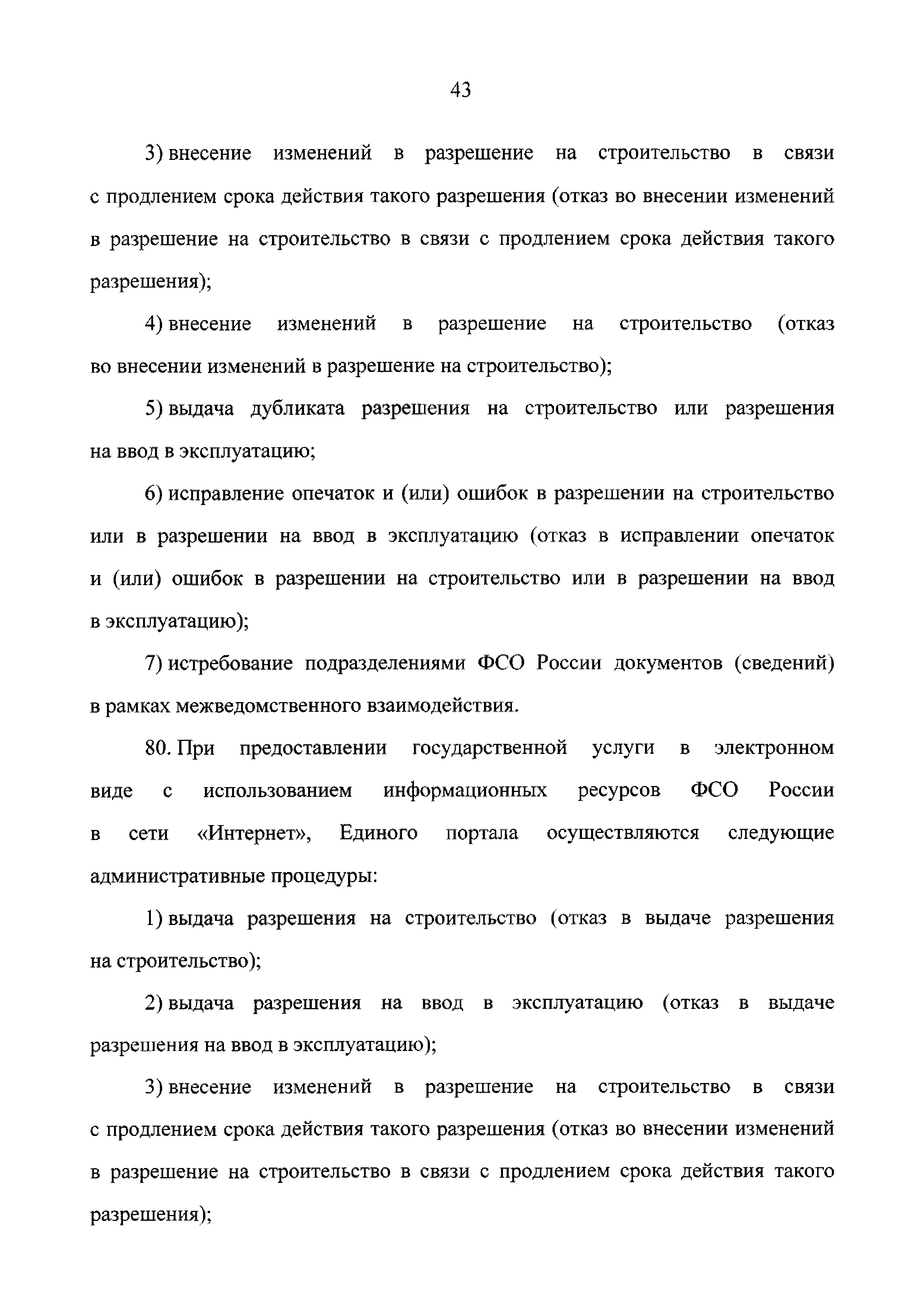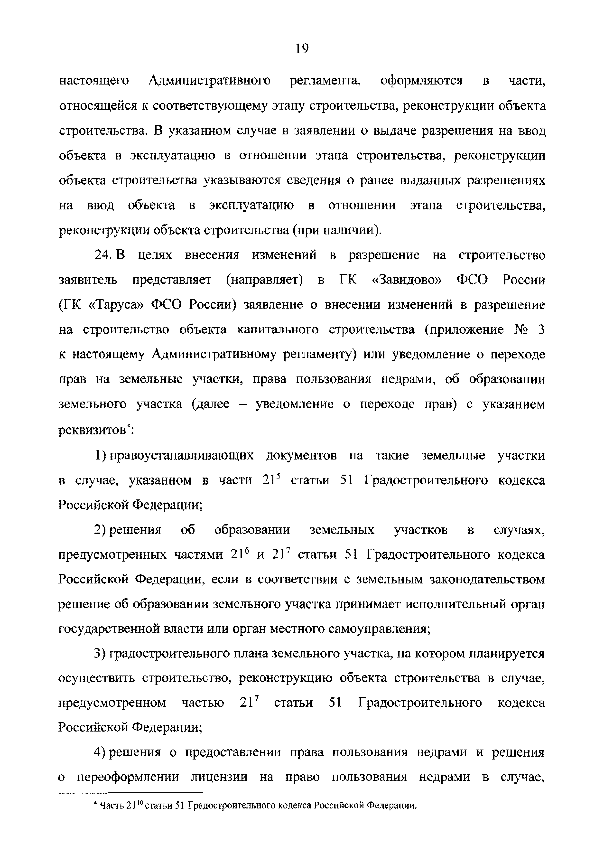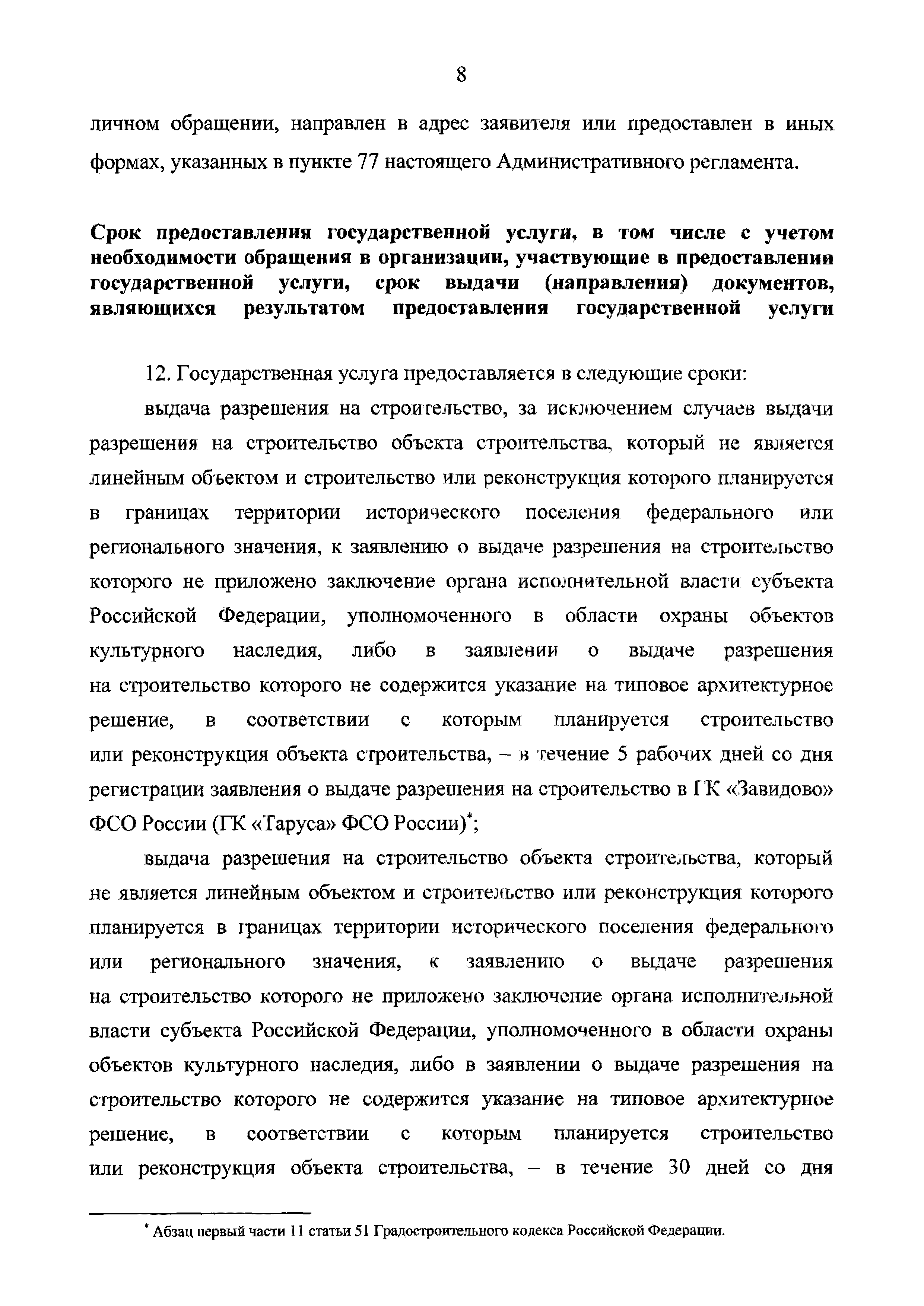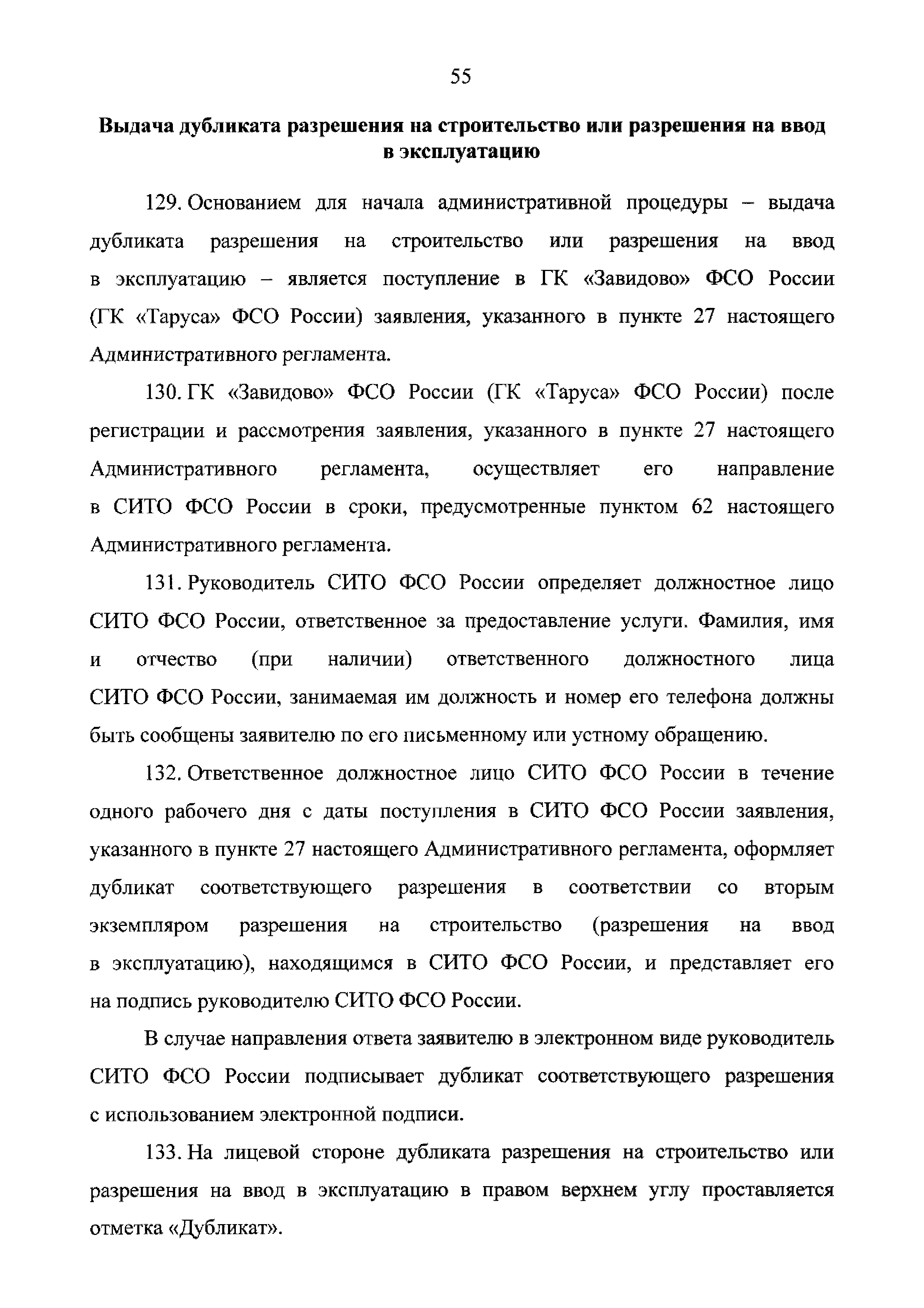 | Оглавление: | I. Общие положения II. Стандарт предоставления государственной услуги Наименование государственной услуги III. Состав, последовательность и сроки выполнения административных процедур (действий), требования к порядку их выполнения, в том числе особенности выполнения административных процедур (действий) IV. Формы контроля за предоставлением государственной услуги V. Досудебный (внесудебный) порядок обжалования решений и действий (бездействия) подразделений ФСО России, а также должностных лиц подразделений ФСО России, участвующих в предоставлении государственной услуги Приложение № 1. Форма заявления о выдаче разрешения на строительство объекта капитального строительства Приложение № 2. Форма заявления о выдаче разрешения на ввод в эксплуатацию объекта капитального строительства Приложение № 3. Форма заявления о внесении изменений в разрешение на строительство объекта капитального строительства Приложение № 4. Форма заявления о внесении изменений в разрешение на строительство объекта капитального строительства в связи с продлением срока действия разрешения Приложение № 5. Форма заявления о выдаче дубликата разрешения на строительство объекта капитального строительства или разрешения на ввод в эксплуатацию объекта капитального строительства Приложение № 6. Форма заявления об исправлении технических ошибок в разрешении на строительство объекта капитального строительства или в разрешении на ввод в эксплуатацию объекта капитального строительства |
