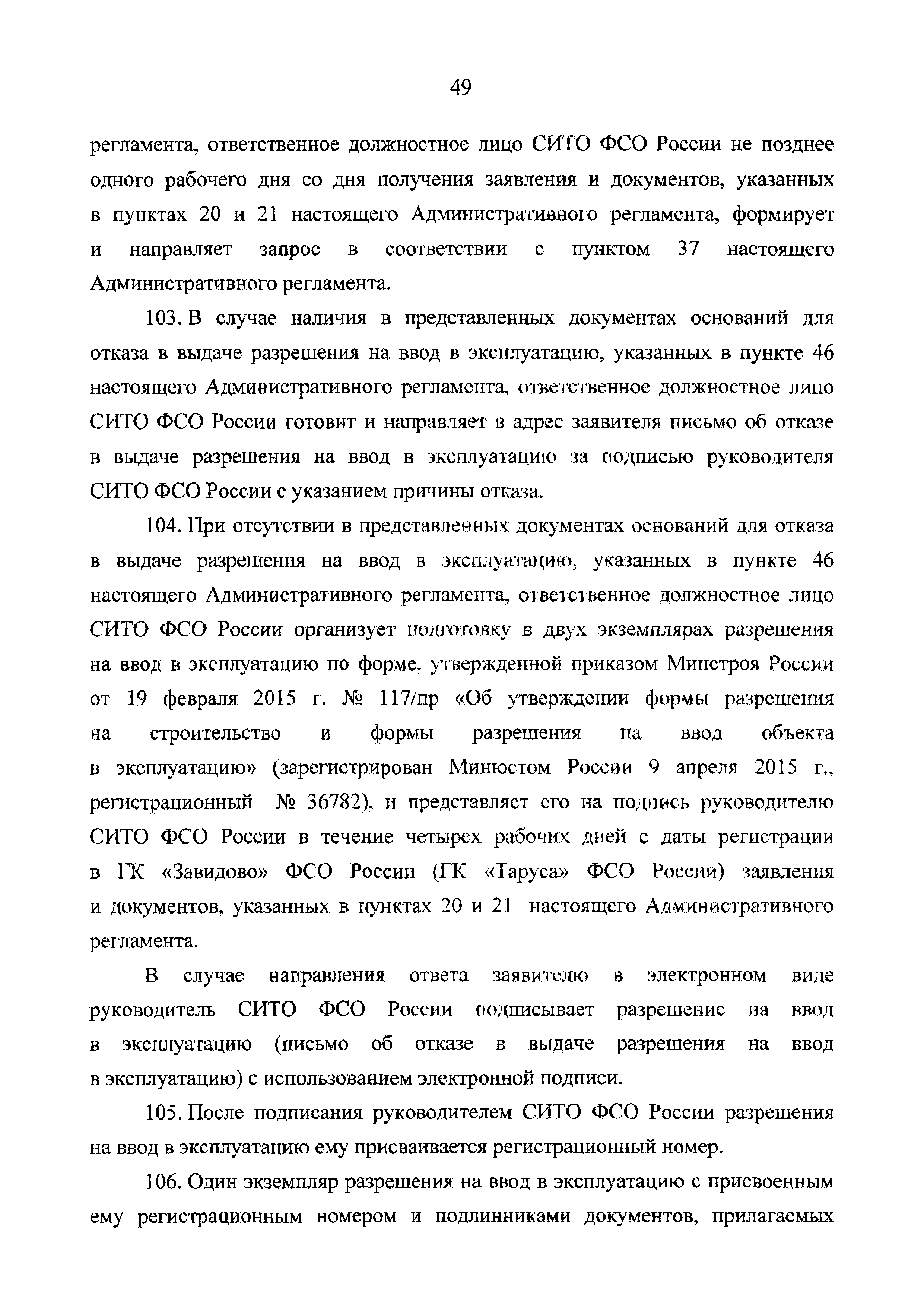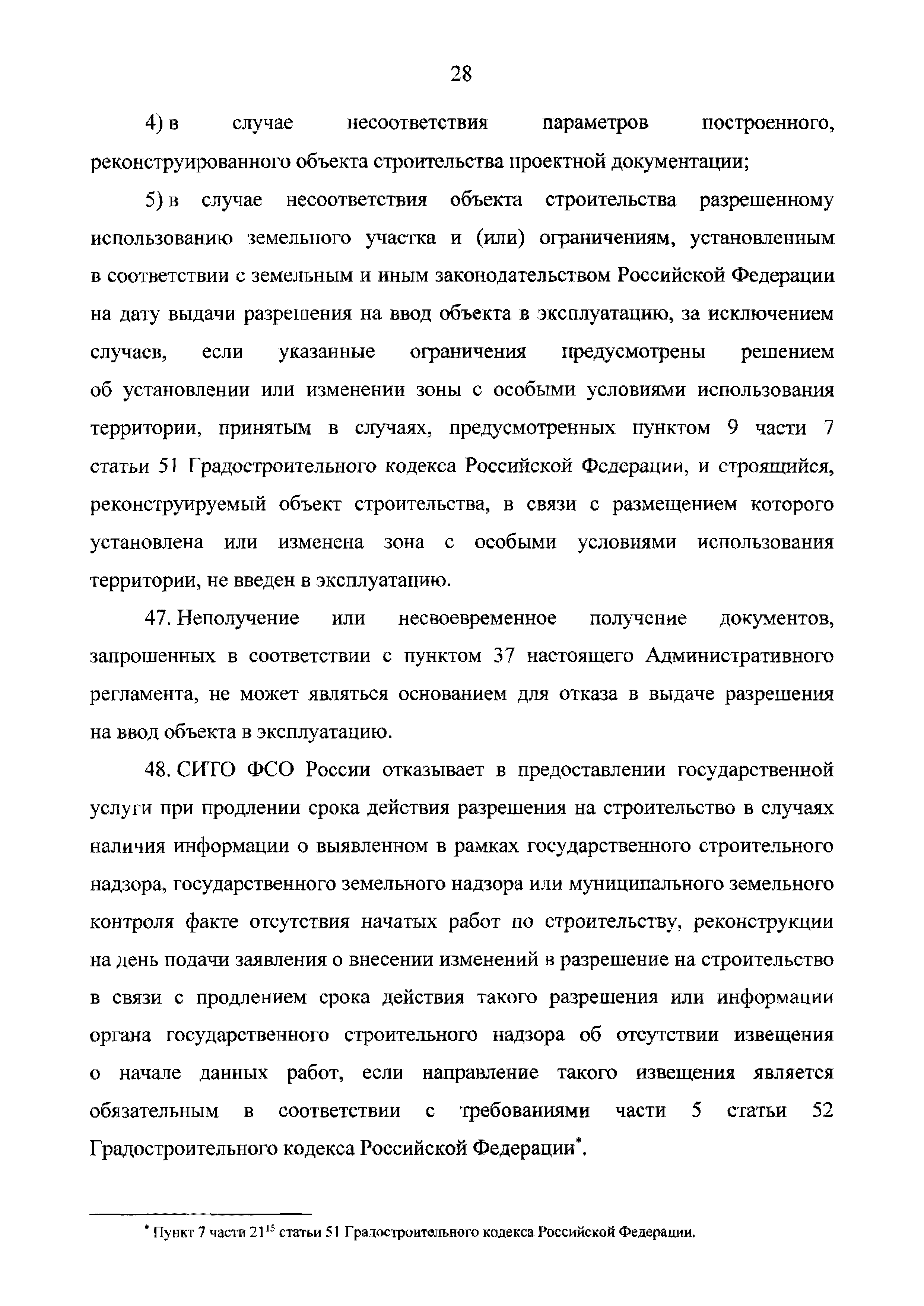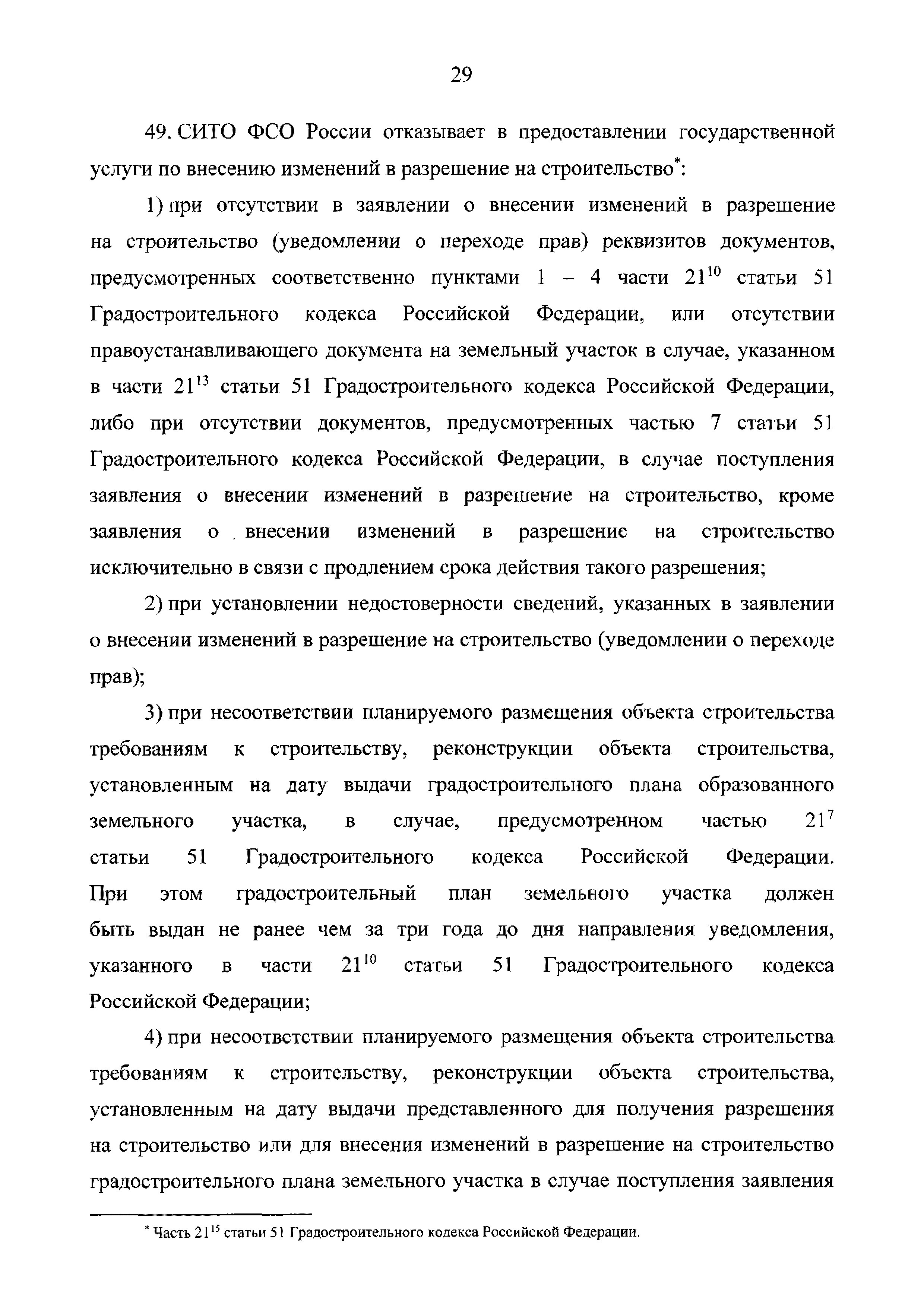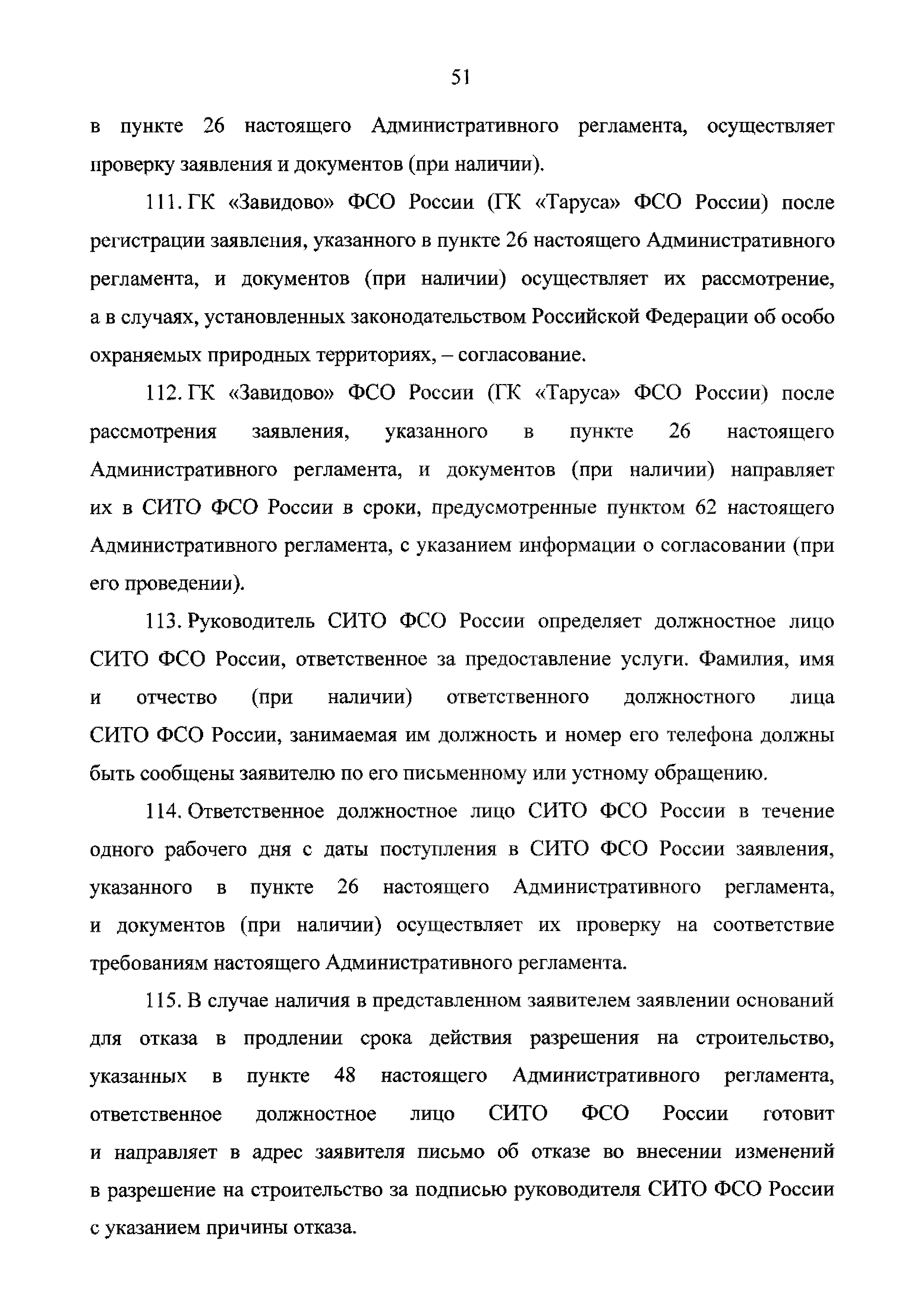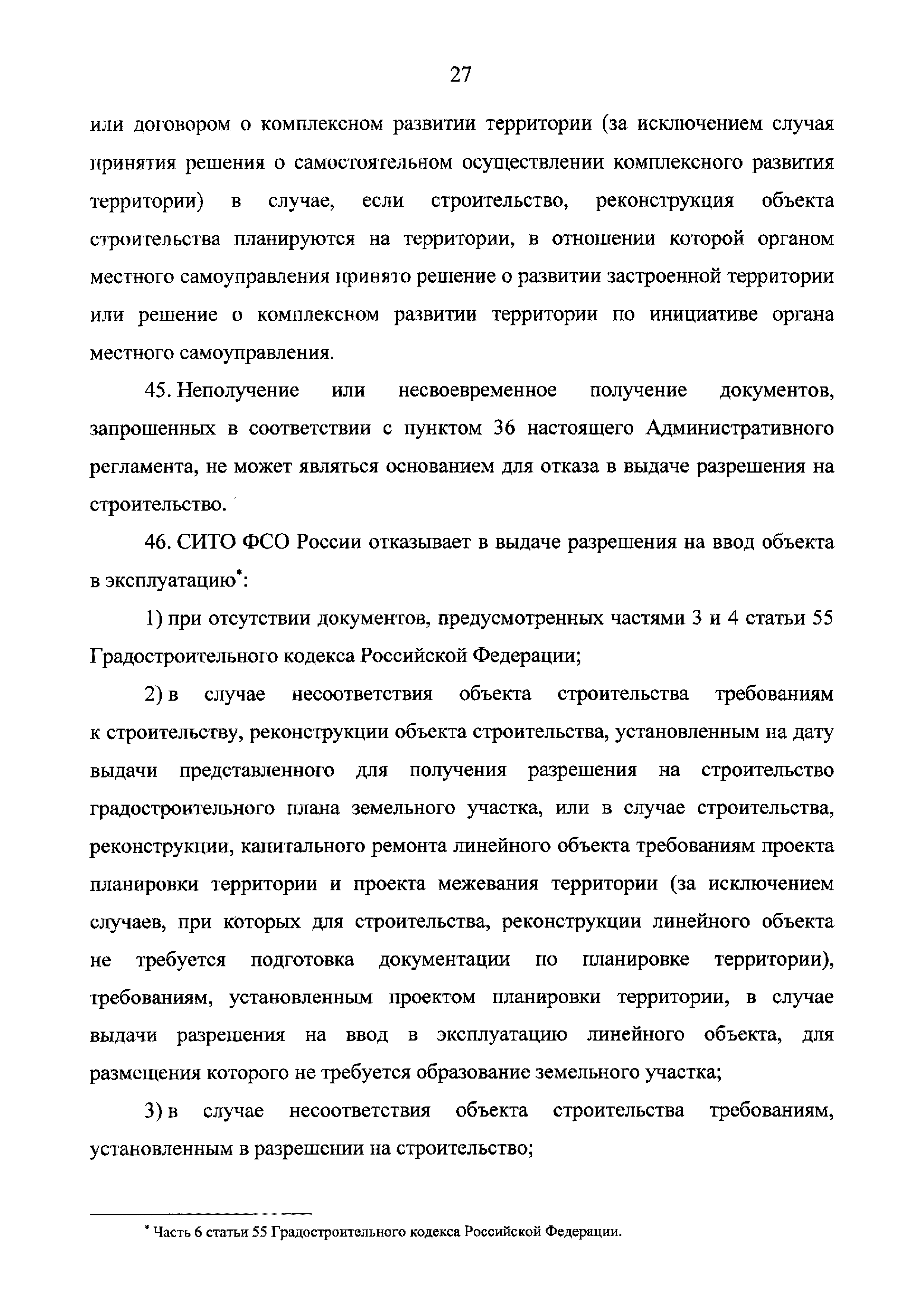 | Оглавление: | I. Общие положения II. Стандарт предоставления государственной услуги Наименование государственной услуги III. Состав, последовательность и сроки выполнения административных процедур (действий), требования к порядку их выполнения, в том числе особенности выполнения административных процедур (действий) IV. Формы контроля за предоставлением государственной услуги V. Досудебный (внесудебный) порядок обжалования решений и действий (бездействия) подразделений ФСО России, а также должностных лиц подразделений ФСО России, участвующих в предоставлении государственной услуги Приложение № 1. Форма заявления о выдаче разрешения на строительство объекта капитального строительства Приложение № 2. Форма заявления о выдаче разрешения на ввод в эксплуатацию объекта капитального строительства Приложение № 3. Форма заявления о внесении изменений в разрешение на строительство объекта капитального строительства Приложение № 4. Форма заявления о внесении изменений в разрешение на строительство объекта капитального строительства в связи с продлением срока действия разрешения Приложение № 5. Форма заявления о выдаче дубликата разрешения на строительство объекта капитального строительства или разрешения на ввод в эксплуатацию объекта капитального строительства Приложение № 6. Форма заявления об исправлении технических ошибок в разрешении на строительство объекта капитального строительства или в разрешении на ввод в эксплуатацию объекта капитального строительства |