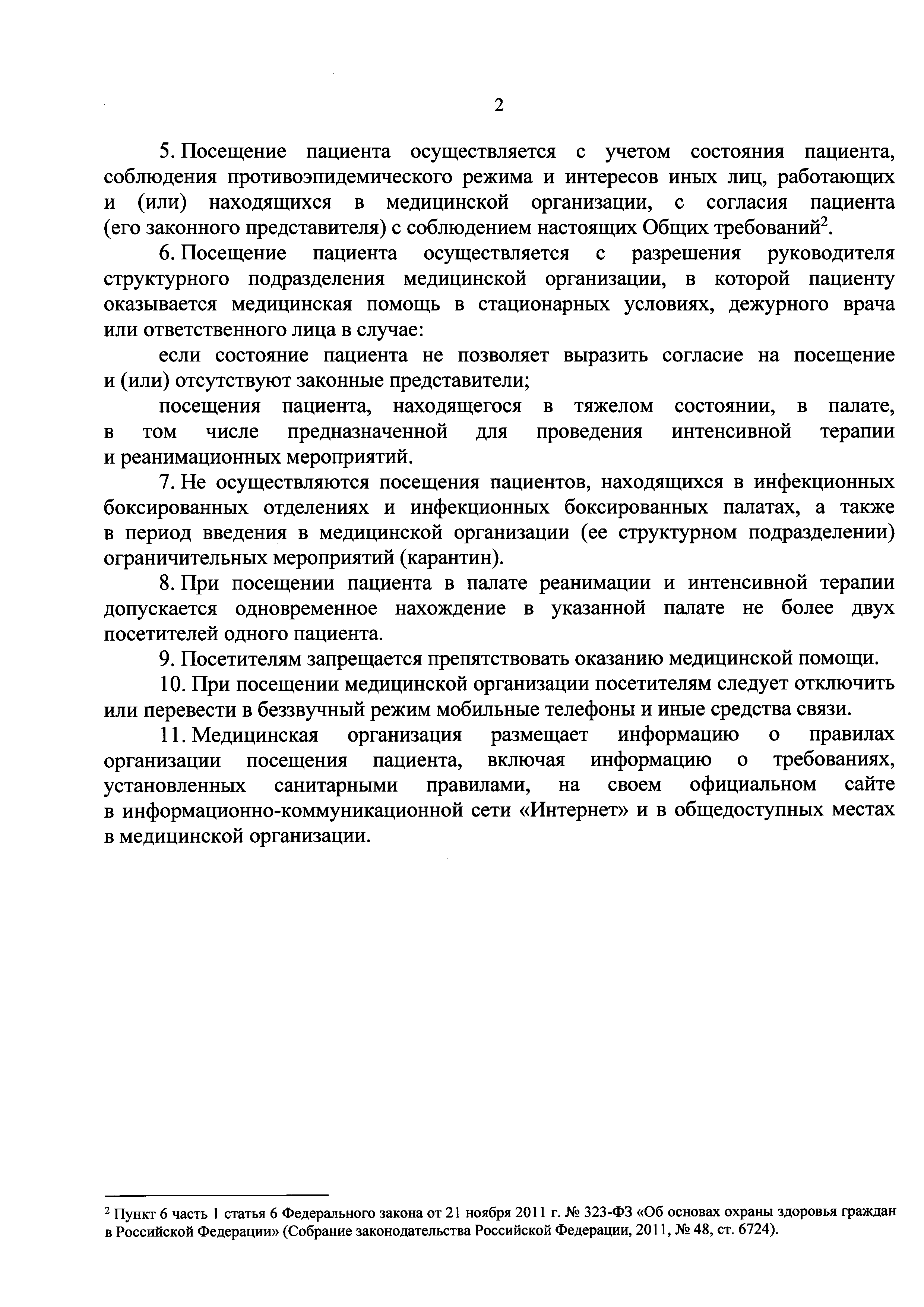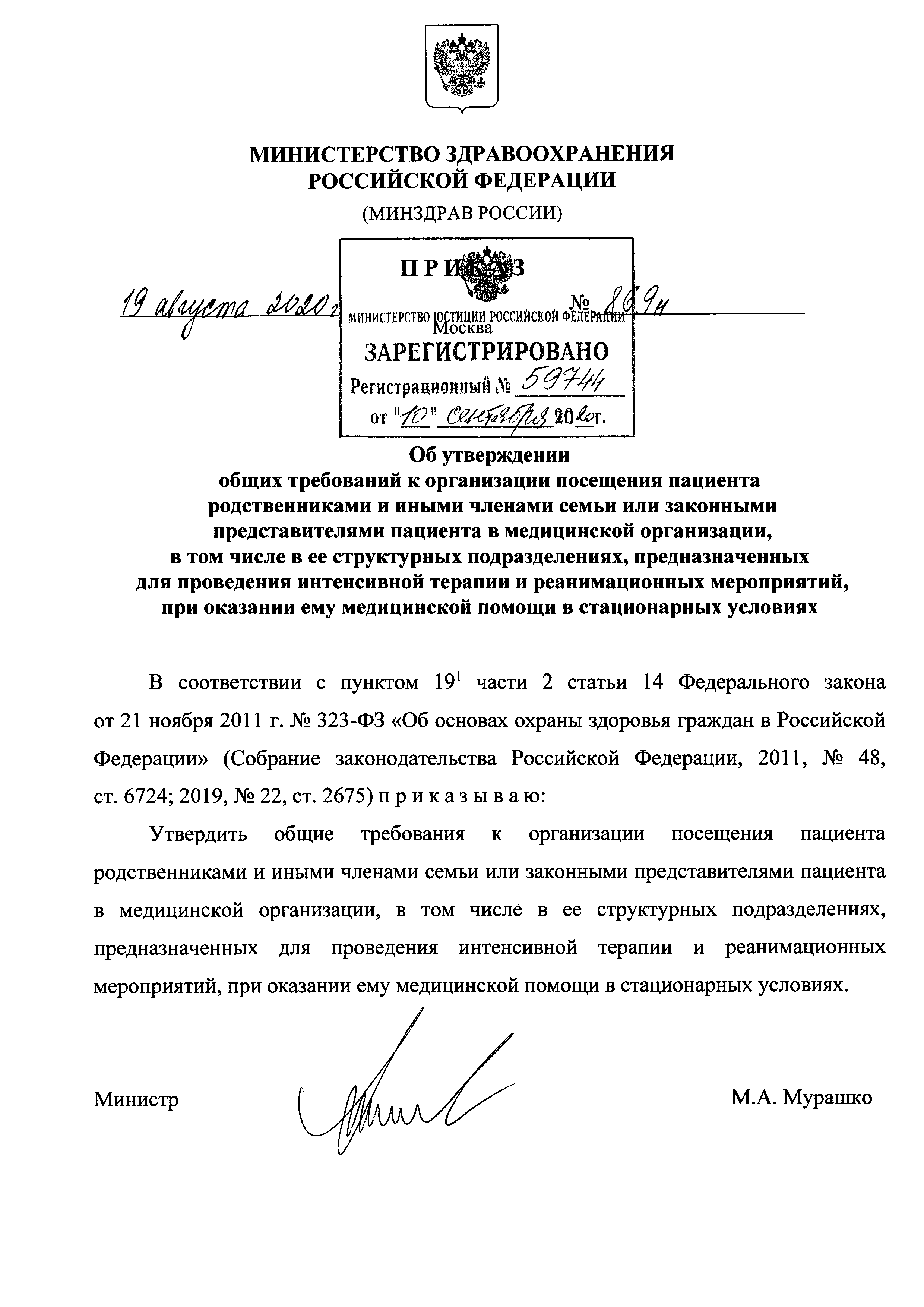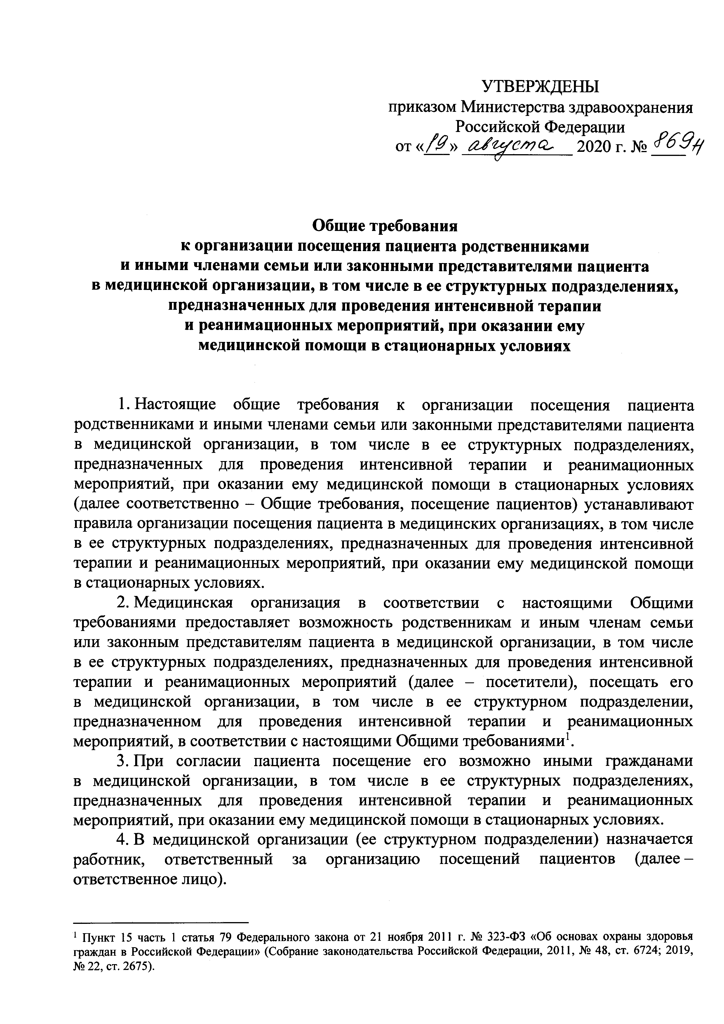 Общие требования к организации посещения пациента родственниками и иными членами семьи или законными представителями пациента в медицинской организации, в том числе в ее структурных подразделениях, предназначенных для проведения интенсивной терапии и реанимационных мероприятий, при оказании ему медицинской помощи в стационарных условиях| Статус: | действует | | Название рус.: | Общие требования к организации посещения пациента родственниками и иными членами семьи или законными представителями пациента в медицинской организации, в том числе в ее структурных подразделениях, предназначенных для проведения интенсивной терапии и реанимационных мероприятий, при оказании ему медицинской помощи в стационарных условиях | | Дата добавления в базу: | 01.01.2021 | | Дата актуализации: | 01.01.2021 | | Дата введения: | 21.09.2020 | | Область применения: | Требования устанавливают правила организации посещения пациента в медицинских организациях, в том числе в ее структурных подразделениях, предназначенных для проведения интенсивной терапии и реанимационных мероприятий, при оказании ему медицинской помощи в стационарных условиях | | Утверждён: | 19.08.2020 Министерство здравоохранения Российской Федерации (869н)