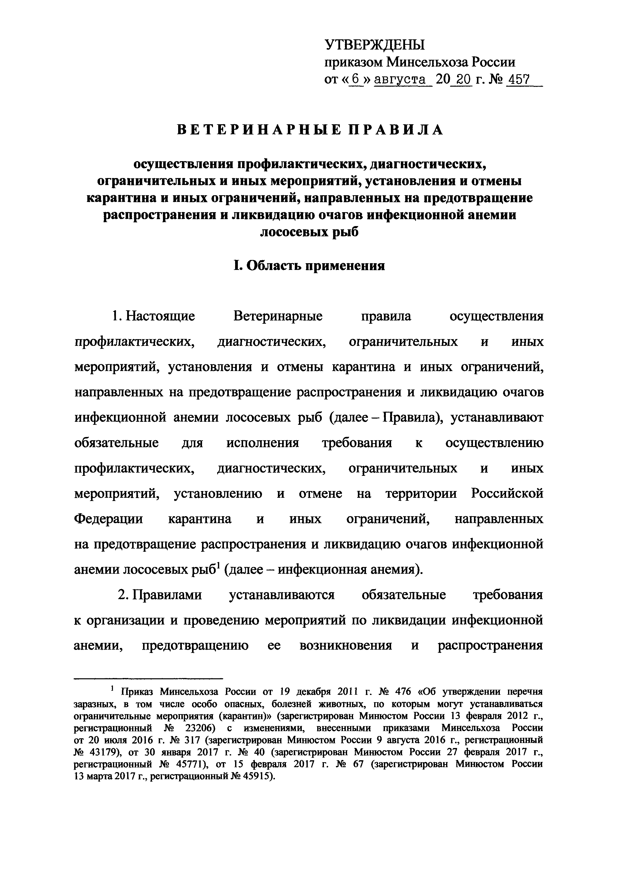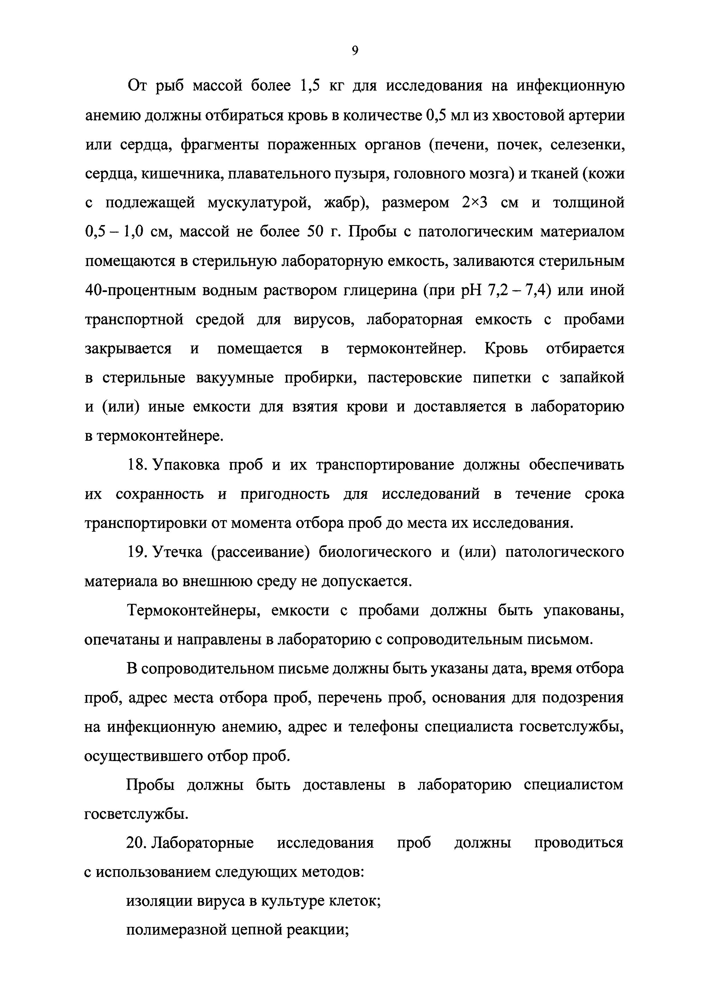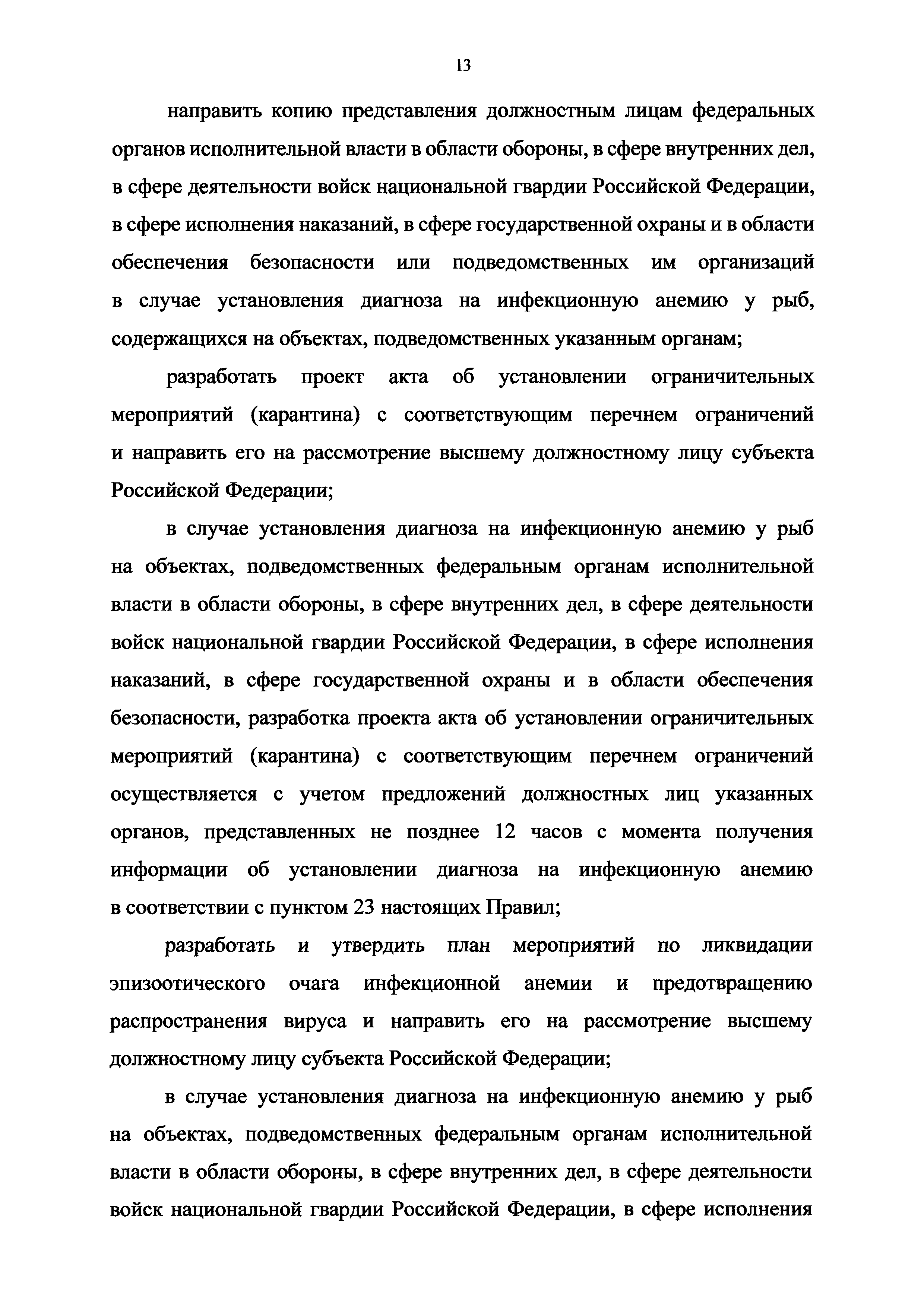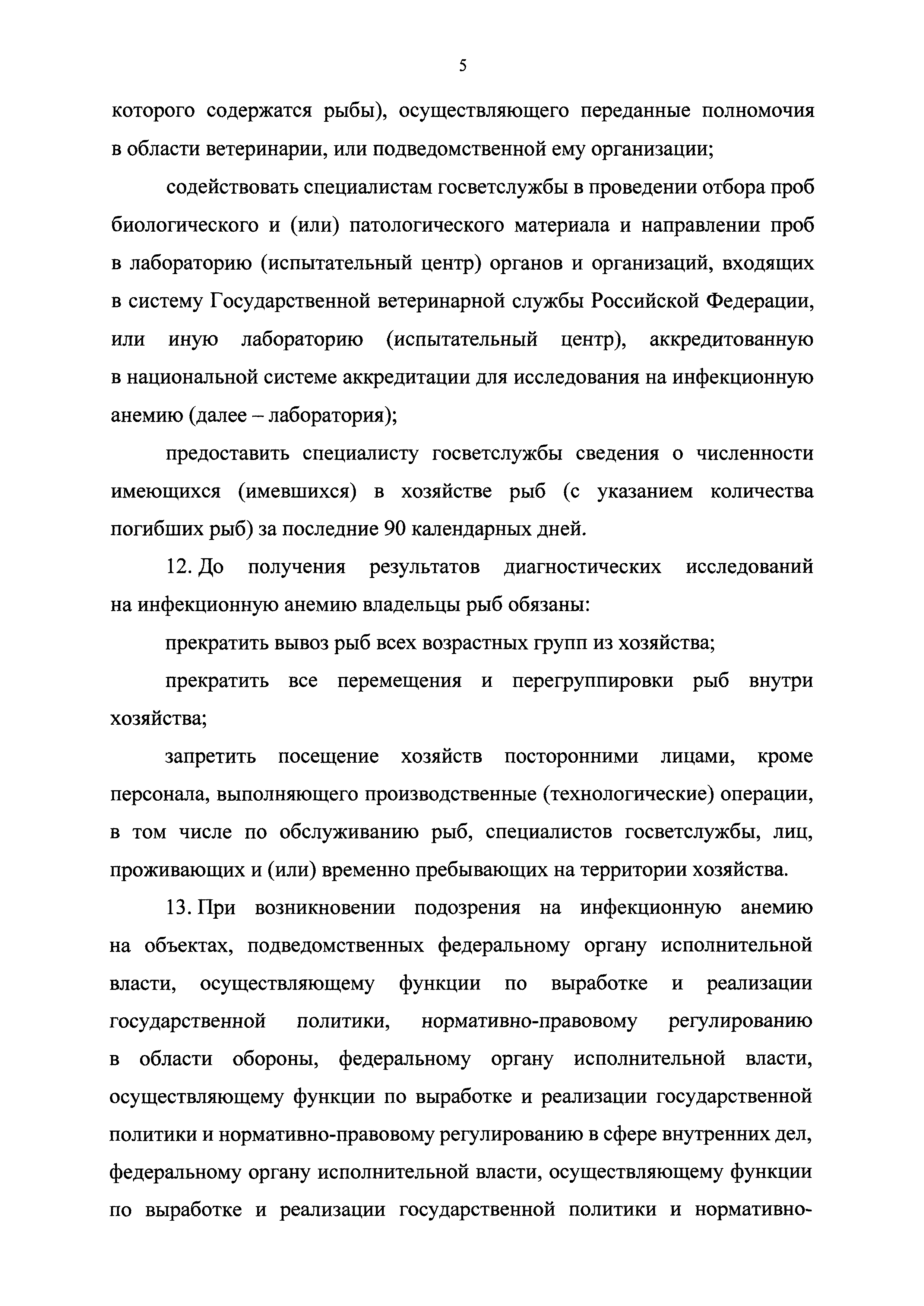 Ветеринарные правила осуществления профилактических, диагностических, ограничительных и иных мероприятий, установления и отмены карантина и иных ограничений, направленных на предотвращение распространения и ликвидацию очагов инфекционной анемии лососевых рыб| Статус: | принят | | Название рус.: | Ветеринарные правила осуществления профилактических, диагностических, ограничительных и иных мероприятий, установления и отмены карантина и иных ограничений, направленных на предотвращение распространения и ликвидацию очагов инфекционной анемии лососевых рыб | | Дата добавления в базу: | 01.01.2021 | | Дата актуализации: | 01.01.2021 | | Дата введения: | 01.01.2021 | | Область применения: | Ветеринарные правила осуществления профилактических, диагностических, ограничительных и иных мероприятий, установления и отмены карантина и иных ограничений, направленных на предотвращение распространения и ликвидацию очагов инфекционной анемии лососевых рыб, устанавливают обязательные для исполнения требования к осуществлению профилактических, диагностических, ограничительных и иных мероприятий, установлению и отмене на территории Российской Федерации карантина и иных ограничений, направленных на предотвращение распространения и ликвидацию очагов инфекционной анемии лососевых рыб | | Оглавление: | I. Область применения II. Общая характеристика инфекционной анемии III. Профилактические мероприятия IV. Мероприятия при подозрении на инфекционную анемию V. Диагностические мероприятия VI. Установление карантина, ограничительные и иные мероприятия, направленные на ликвидацию очагов инфекционной анемии, а также на предотвращение ее распространения VII. Отмена карантина | | Утверждён: | 06.08.2020 Министерство сельского хозяйства Российской Федерации (457)