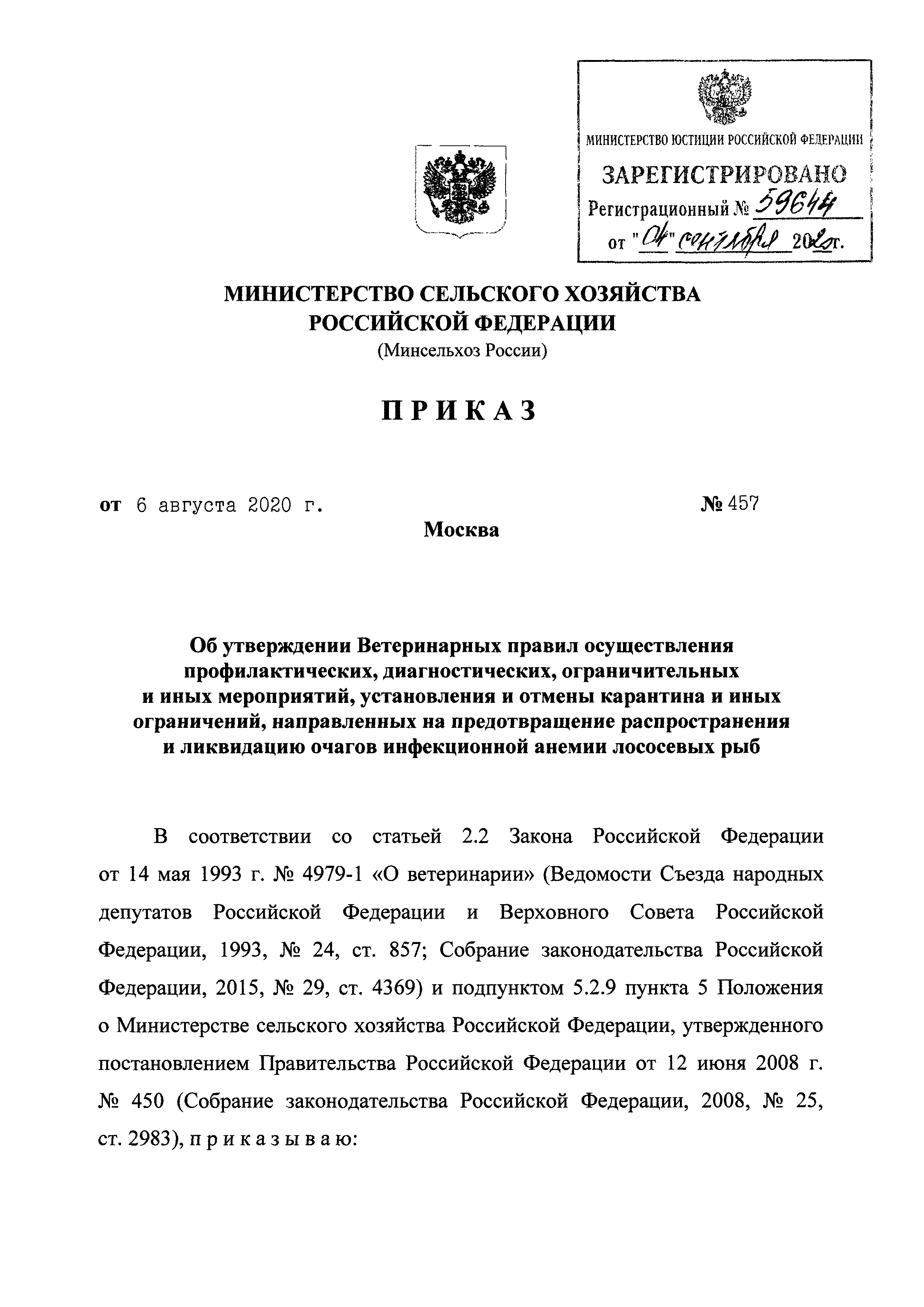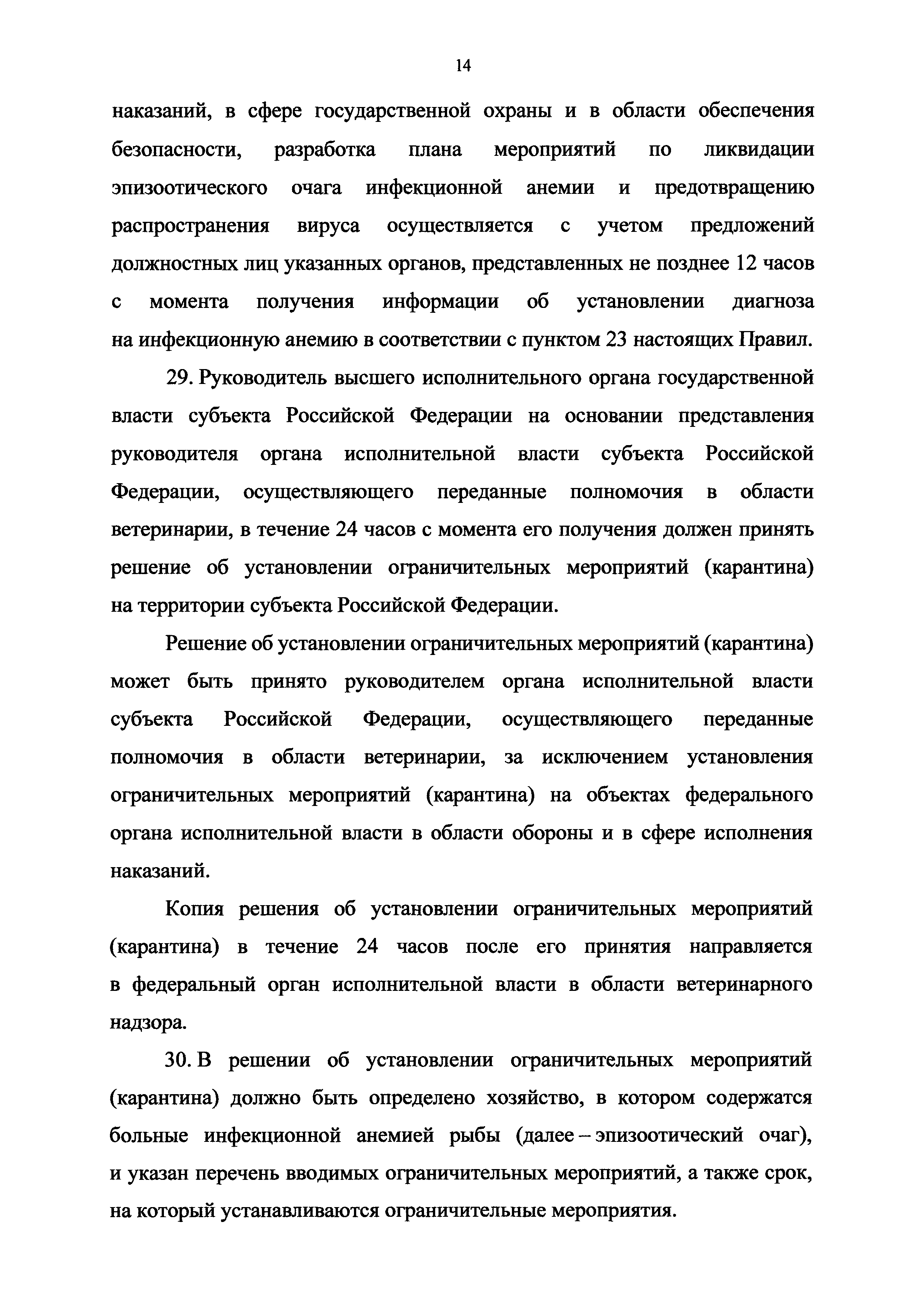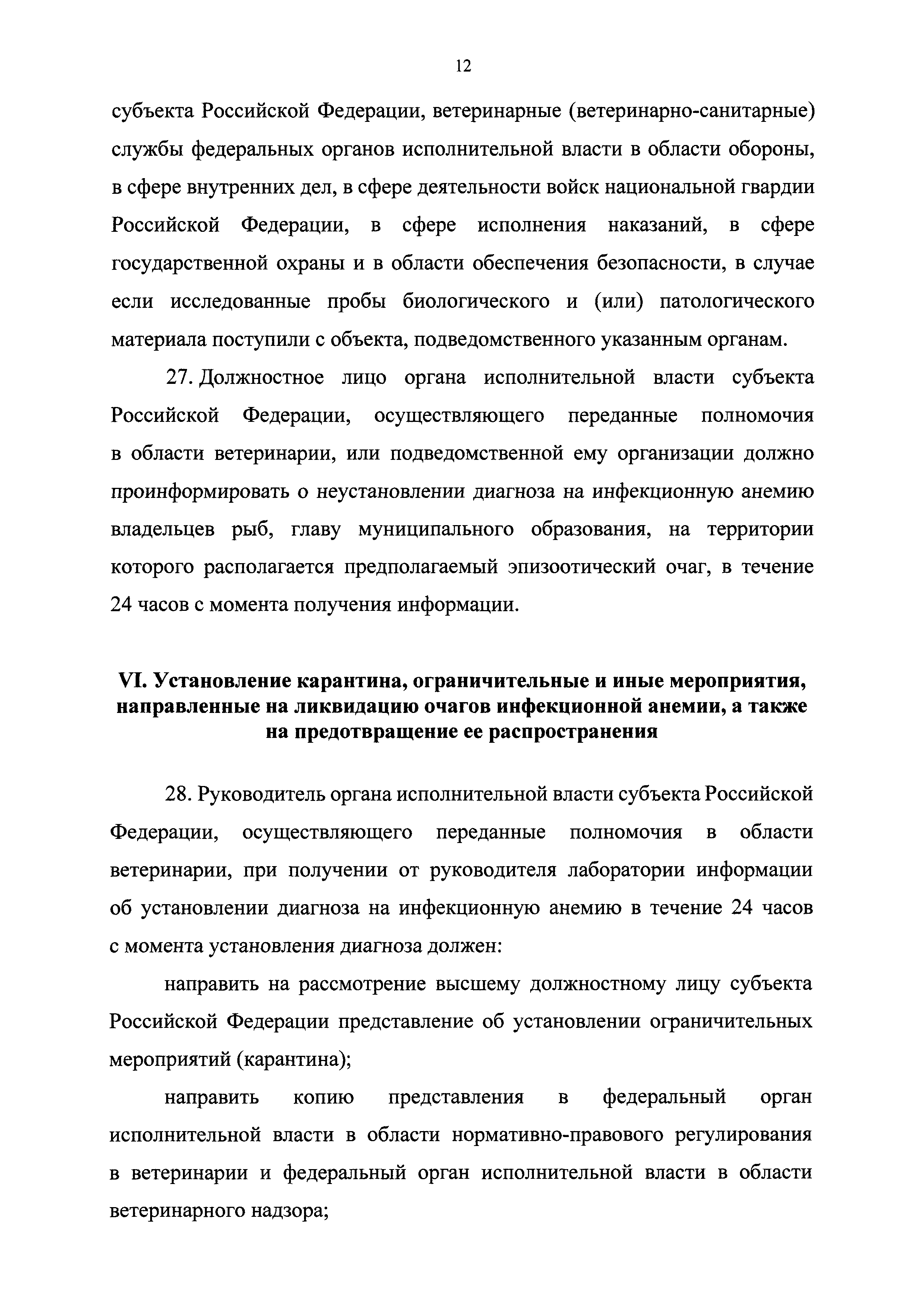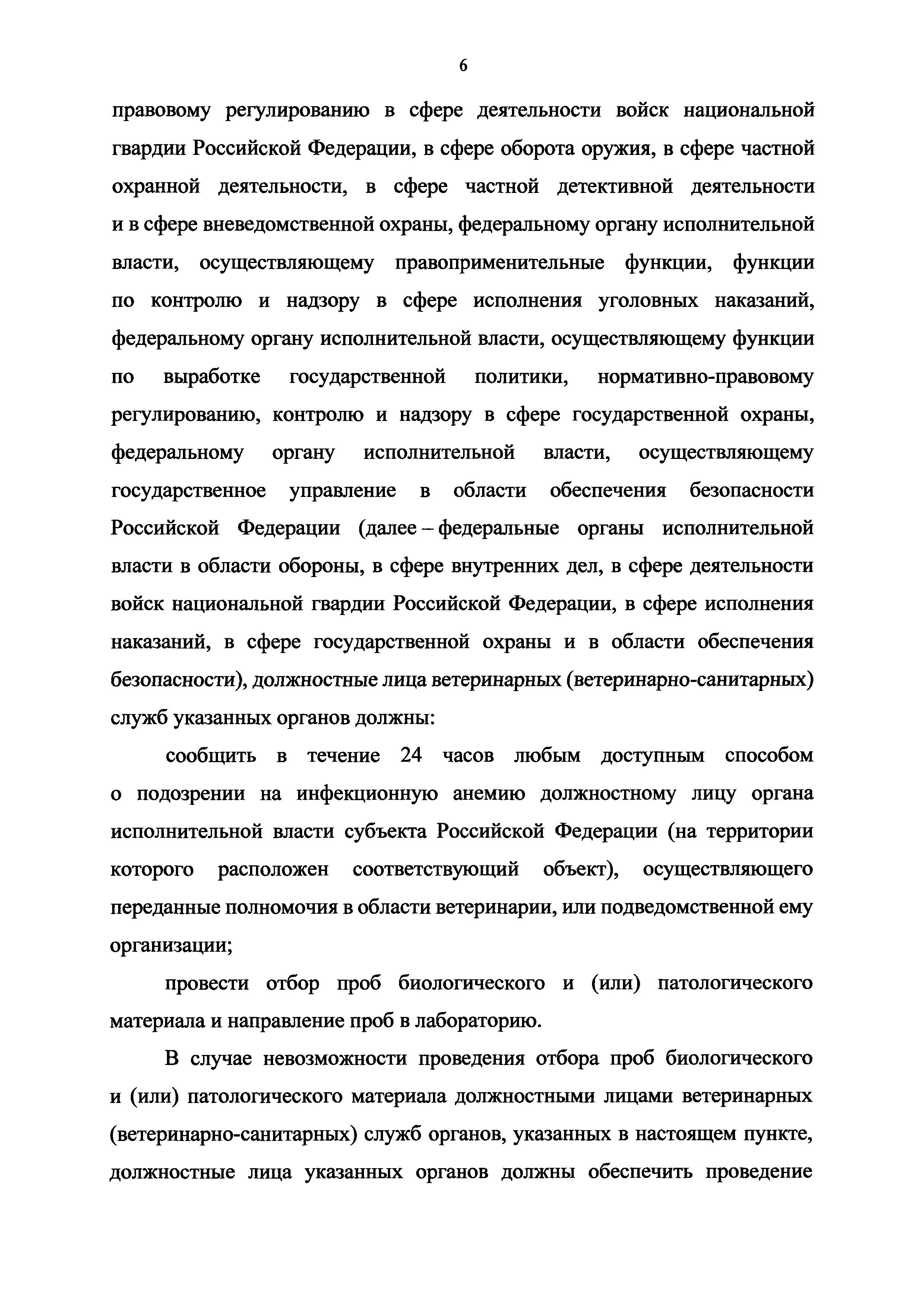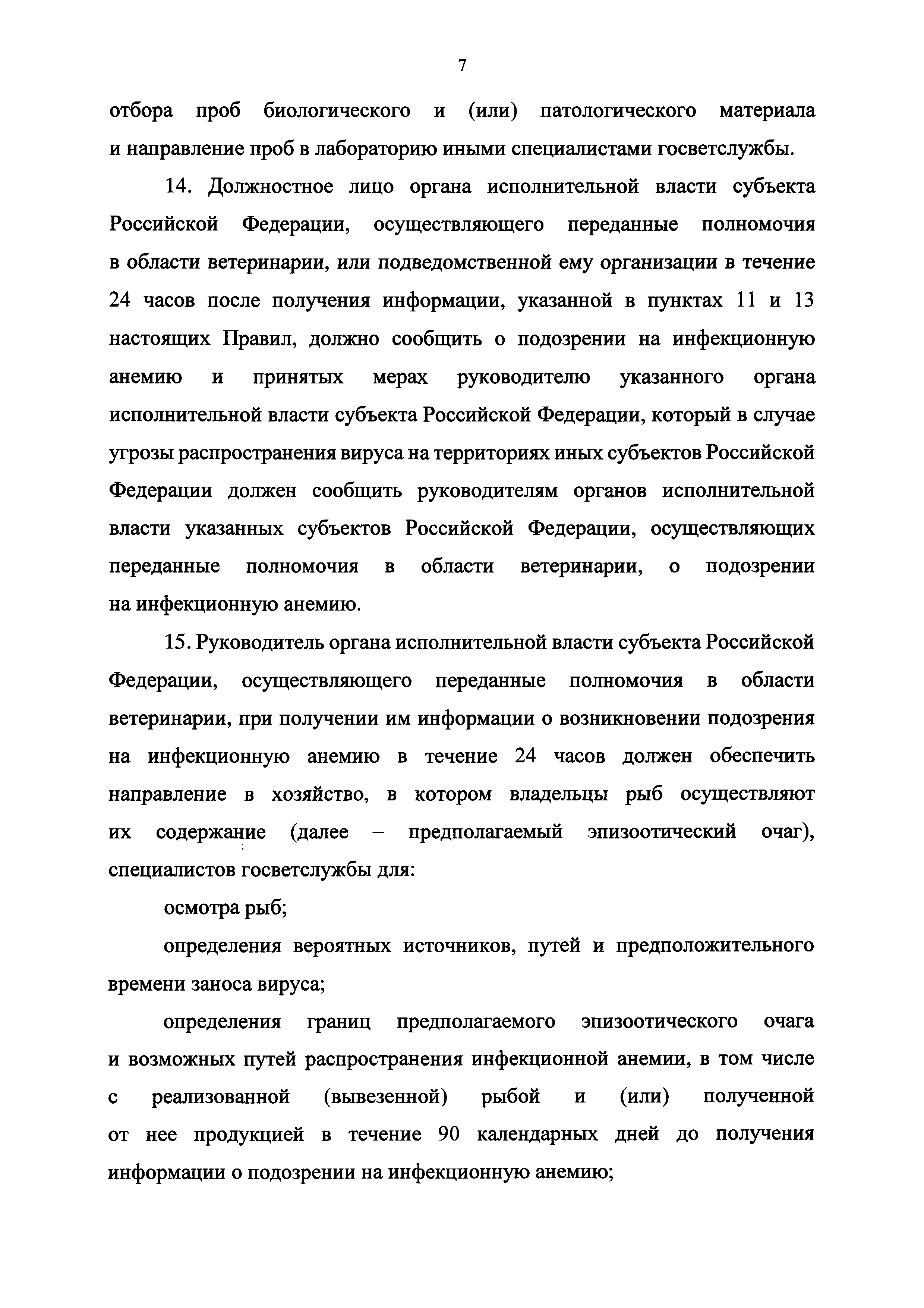 Ветеринарные правила осуществления профилактических, диагностических, ограничительных и иных мероприятий, установления и отмены карантина и иных ограничений, направленных на предотвращение распространения и ликвидацию очагов инфекционной анемии лососевых рыб| Статус: | принят | | Название рус.: | Ветеринарные правила осуществления профилактических, диагностических, ограничительных и иных мероприятий, установления и отмены карантина и иных ограничений, направленных на предотвращение распространения и ликвидацию очагов инфекционной анемии лососевых рыб | | Дата добавления в базу: | 01.01.2021 | | Дата актуализации: | 01.01.2021 | | Дата введения: | 01.01.2021 | | Область применения: | Ветеринарные правила осуществления профилактических, диагностических, ограничительных и иных мероприятий, установления и отмены карантина и иных ограничений, направленных на предотвращение распространения и ликвидацию очагов инфекционной анемии лососевых рыб, устанавливают обязательные для исполнения требования к осуществлению профилактических, диагностических, ограничительных и иных мероприятий, установлению и отмене на территории Российской Федерации карантина и иных ограничений, направленных на предотвращение распространения и ликвидацию очагов инфекционной анемии лососевых рыб | | Оглавление: | I. Область применения II. Общая характеристика инфекционной анемии III. Профилактические мероприятия IV. Мероприятия при подозрении на инфекционную анемию V. Диагностические мероприятия VI. Установление карантина, ограничительные и иные мероприятия, направленные на ликвидацию очагов инфекционной анемии, а также на предотвращение ее распространения VII. Отмена карантина | | Утверждён: | 06.08.2020 Министерство сельского хозяйства Российской Федерации (457)