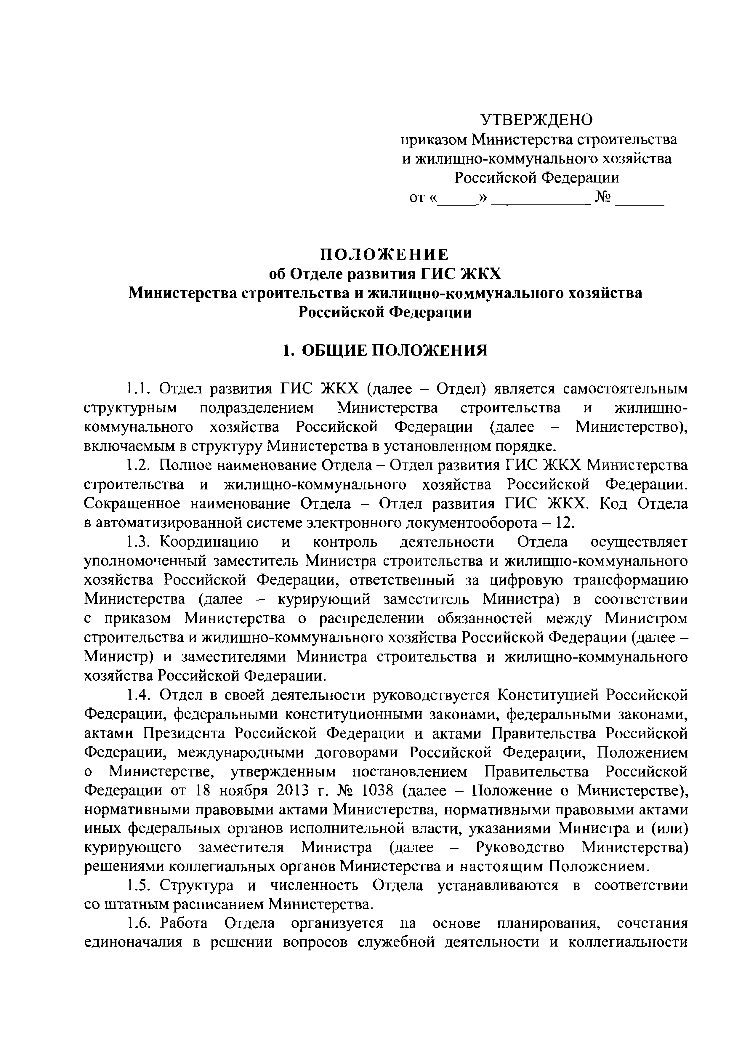 | Название рус.: | Положение об Отделе развития ГИС ЖКХ Министерства строительства и жилищно-коммунального хозяйства Российской Федерации |