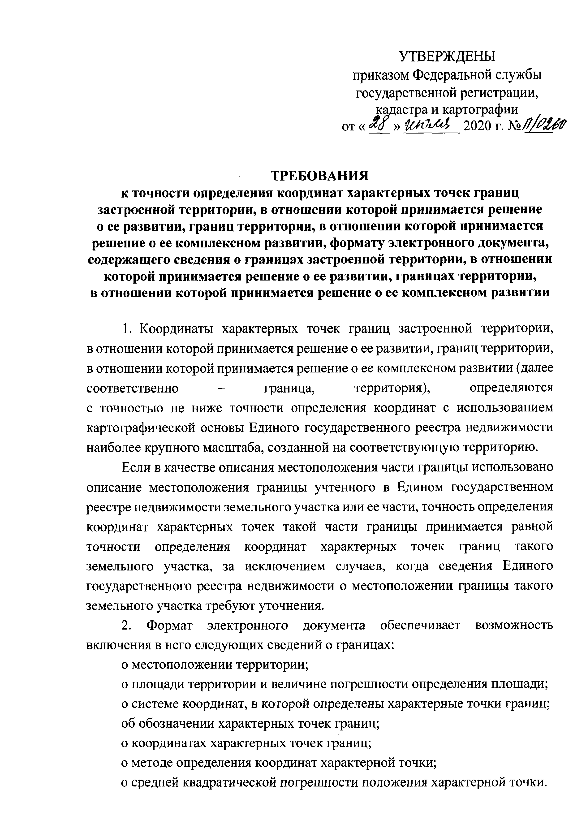 Требования к точности определения координат характерных точек границ застроенной территории, в отношении которой принимается решение о ее развитии, границ территории, в отношении которой принимается решение о ее комплексном развитии, формату электронного документа, содержащего сведения о границах застроенной территории, в отношении которой принимается решение о ее развитии, границах территории, в отношении которой принимается решение о ее комплексном развитии| Статус: | действует | | Название рус.: | Требования к точности определения координат характерных точек границ застроенной территории, в отношении которой принимается решение о ее развитии, границ территории, в отношении которой принимается решение о ее комплексном развитии, формату электронного документа, содержащего сведения о границах застроенной территории, в отношении которой принимается решение о ее развитии, границах территории, в отношении которой принимается решение о ее комплексном развитии | | Дата добавления в базу: | 01.01.2021 | | Дата актуализации: | 01.01.2021 | | Дата введения: | 13.09.2020 | | Утверждён: | 28.07.2020 Федеральная служба государственной регистрации, кадастра и картографии (П/0260)