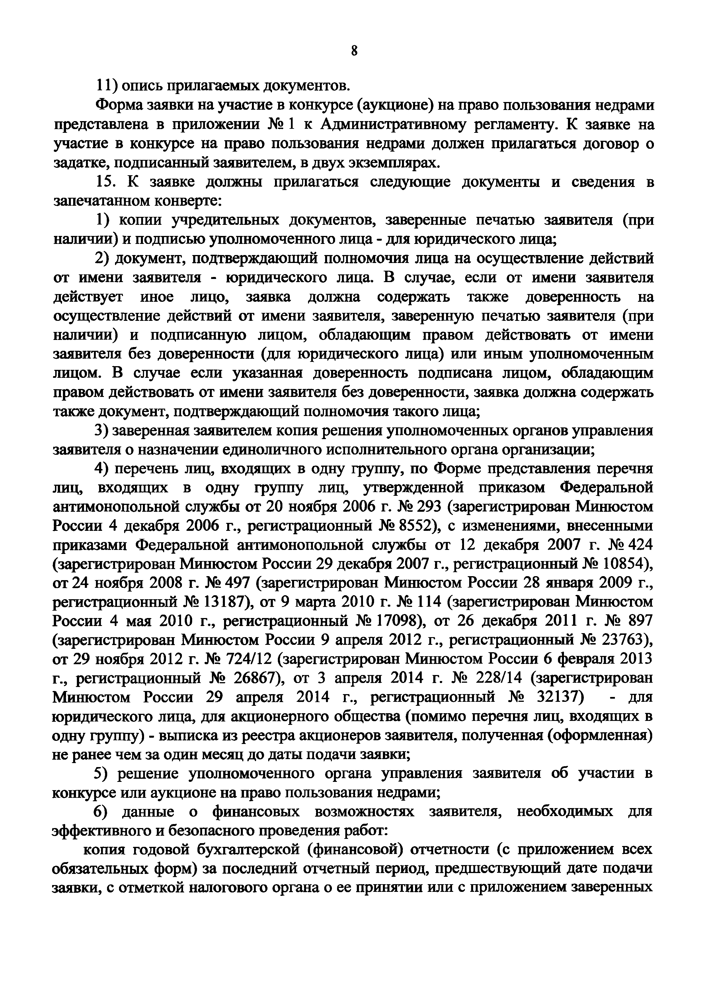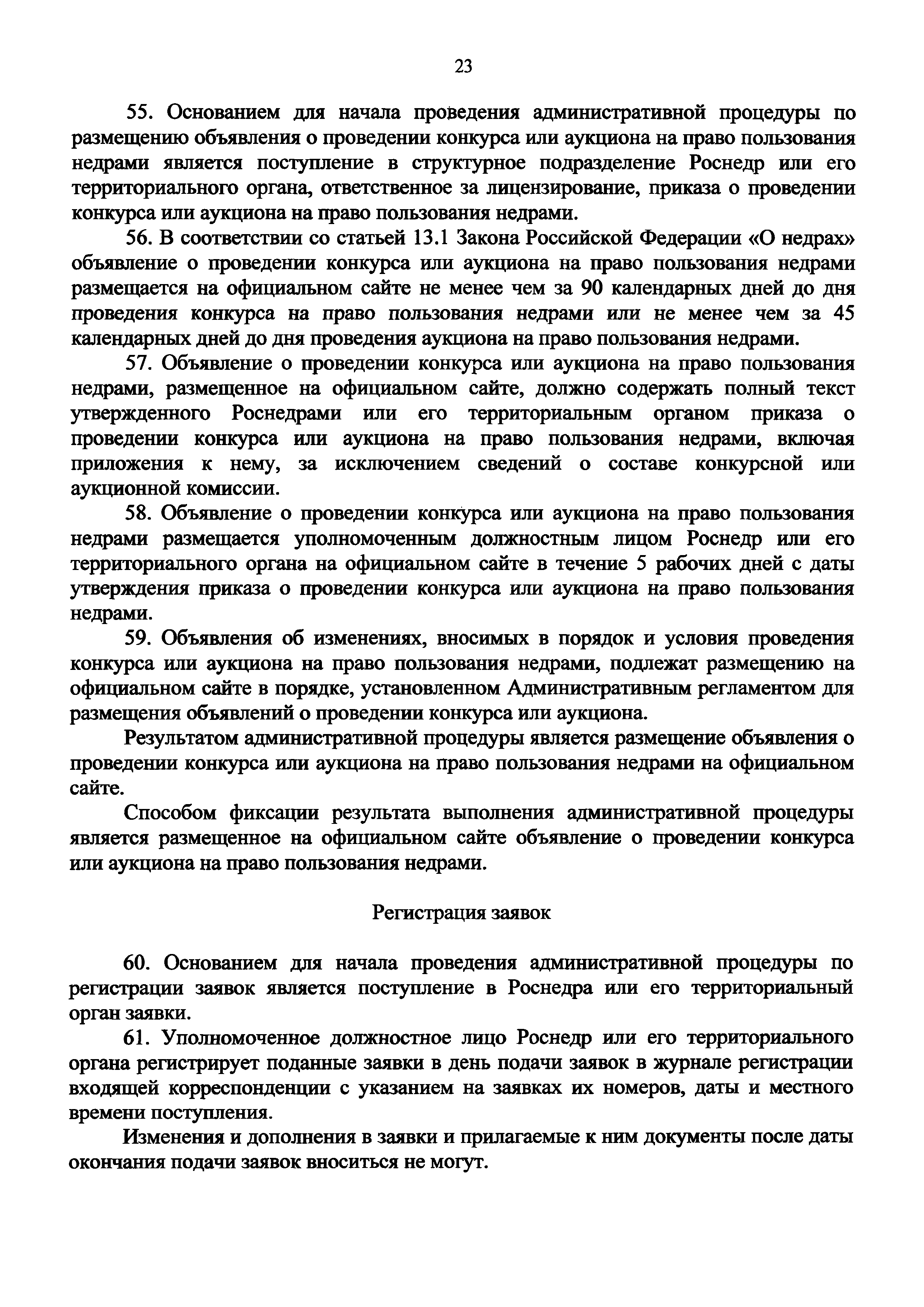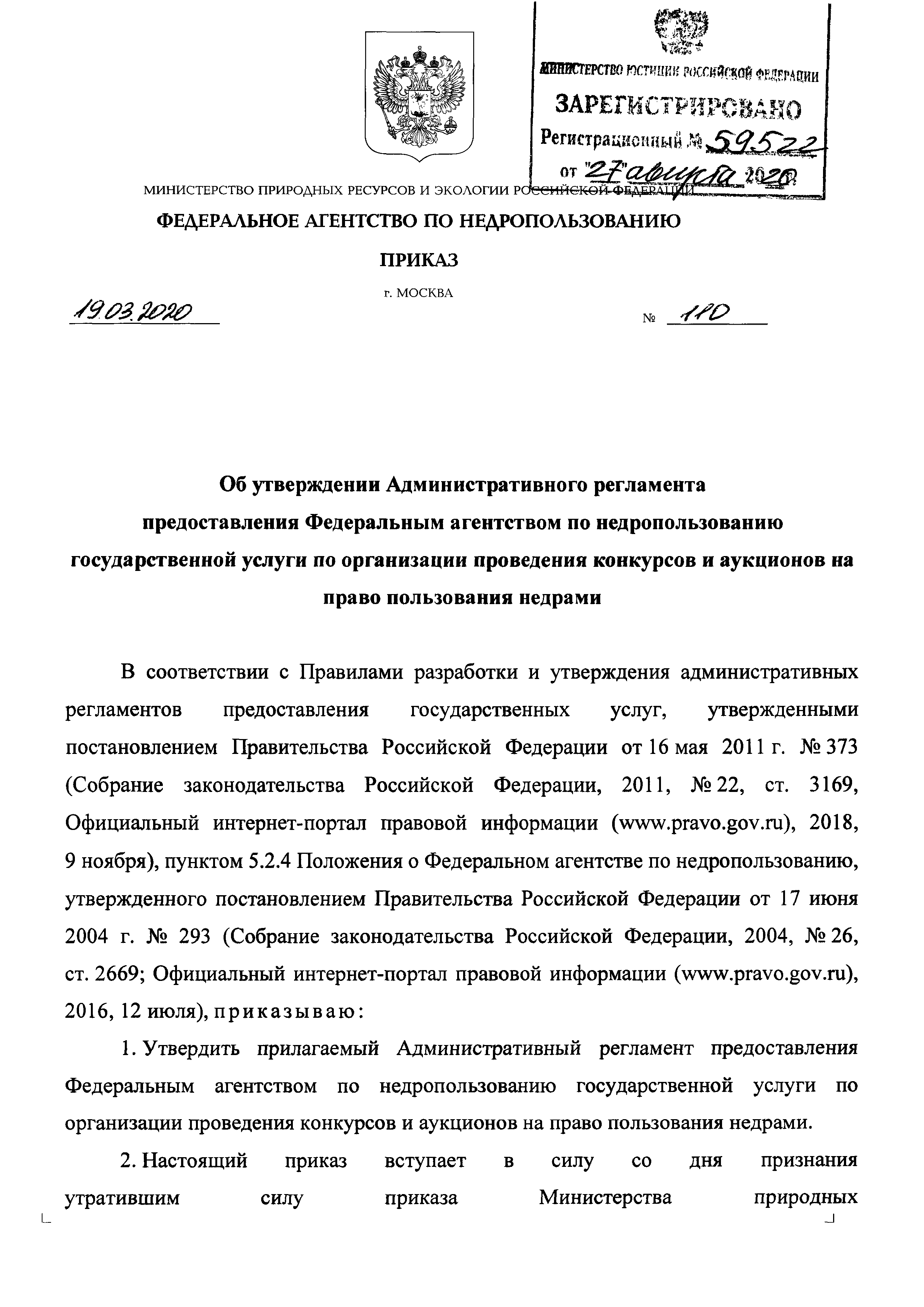 | | Заменяет собой: | - Приказ 698 «Об утверждении Административного регламента предоставления Федеральным агентством по недропользованию государственной услуги по организации проведения в установленном порядке конкурсов и аукционов на право пользования недрами»