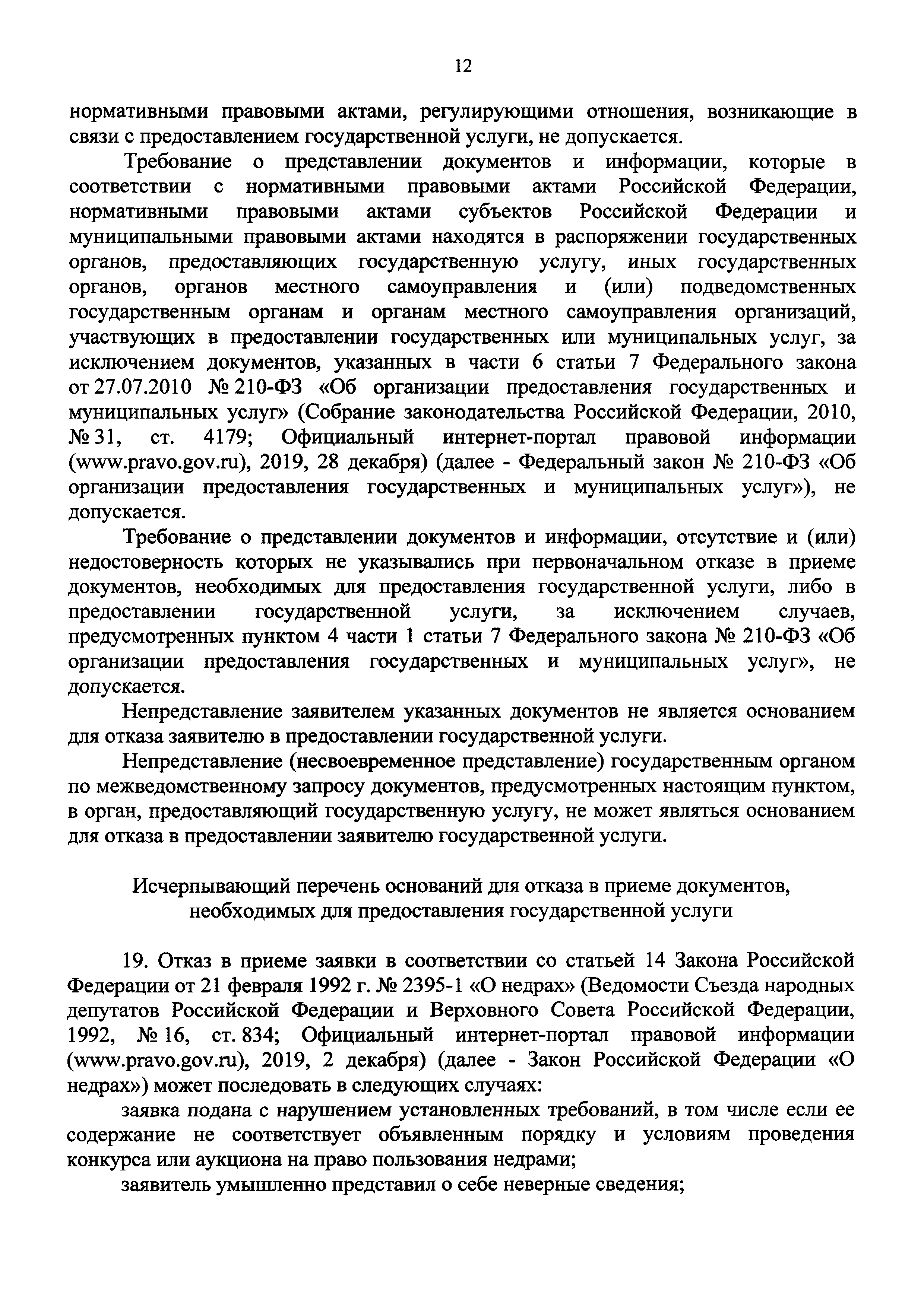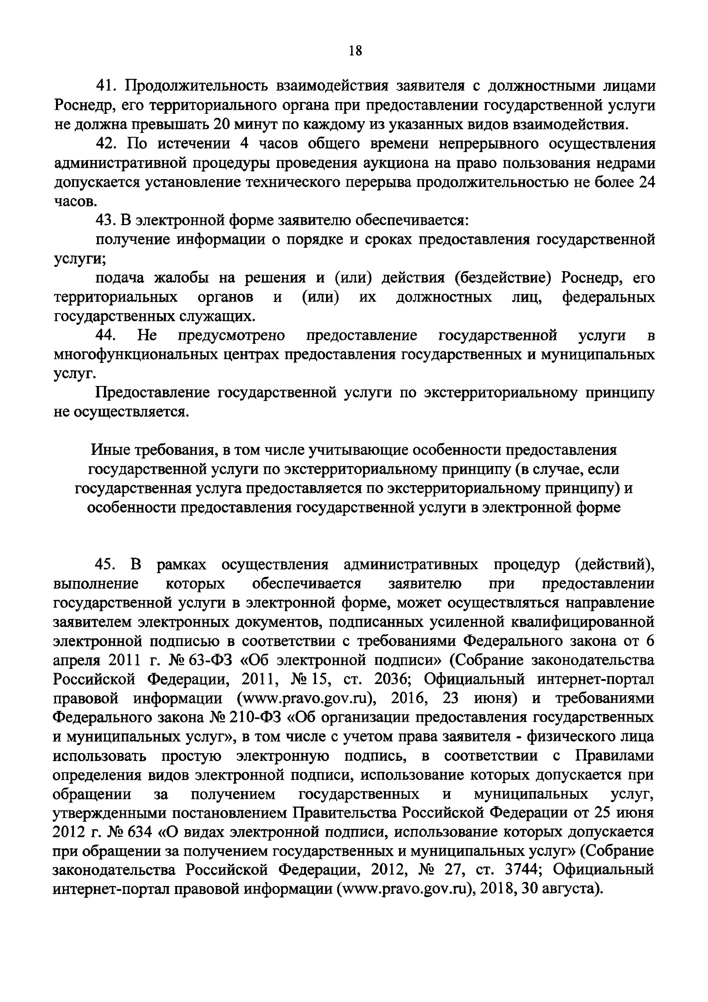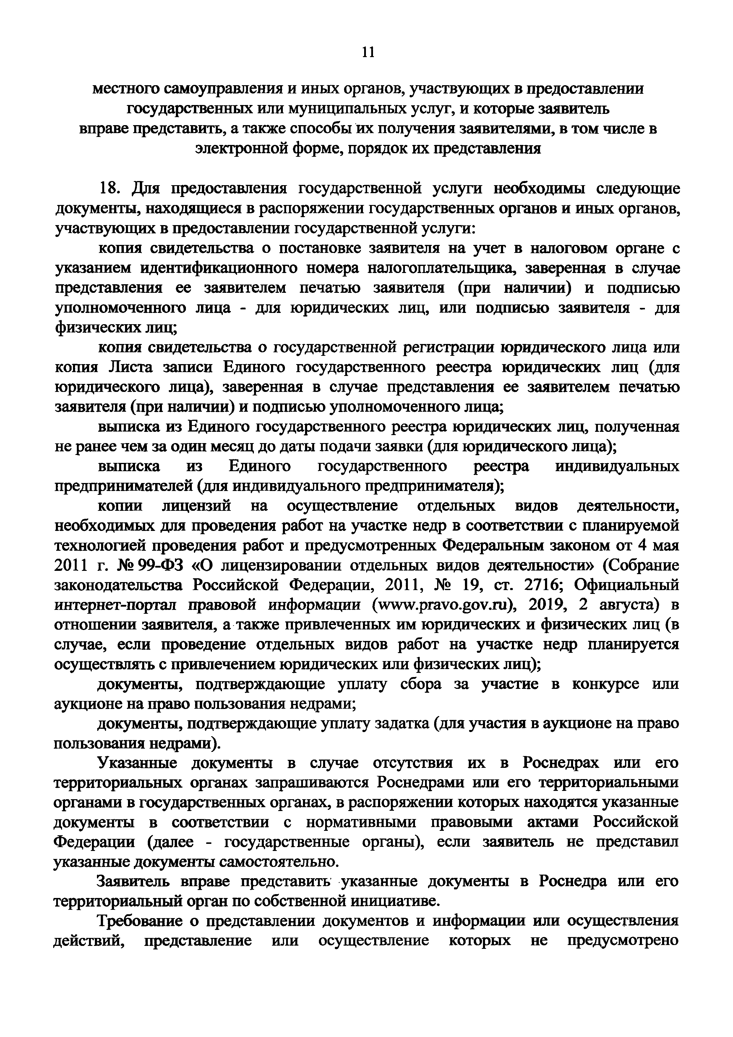 | | Нормативные ссылки: |   Закон Российской Федерации 2395-I «О недрах» Кодекс «Гражданский кодекс Российской Федерации»  Федеральный закон 63-ФЗ «Об электронной подписи»  Федеральный закон 99-ФЗ «О лицензировании отдельных видов деятельности» Постановление 373 «О разработке и утверждении административных регламентов осуществления государственного контроля (надзора) и административных регламентов предоставления государственных услуг»  Федеральный закон 210-ФЗ «Об организации предоставления государственных и муниципальных услуг»  «Правила использования геологической информации о недрах, обладателем которой является Российская Федерация» Постановление 352 «Об утверждении перечня услуг, которые являются необходимыми и обязательными для предоставления федеральными органами исполнительной власти, Государственной корпорацией по атомной энергии "Росатом" государственных услуг и предоставляются организациями, участвующими в предоставлении государственных услуг, и определении размера платы за их оказание» «Правила подачи и рассмотрения жалоб на решения и действия (бездействие) федеральных органов исполнительной власти и их должностных лиц, федеральных государственных служащих, должностных лиц государственных внебюджетных фондов Российской Федерации, государственных корпораций, наделенных в соответствии с федеральными законами полномочиями по предоставлению государственных услуг в установленной сфере деятельности, и их должностных лиц, организаций, предусмотренных частью 1.1 статьи 16 Федерального закона "Об организации предоставления государственных и муниципальных услуг", и их работников, а также многофункциональных центров предоставления государственных и муниципальных услуг и их работников»  «Положение о Федеральном агентстве по недропользованию» «Правила определения видов электронной подписи, использование которых допускается при обращении за получением государственных и муниципальных услуг»