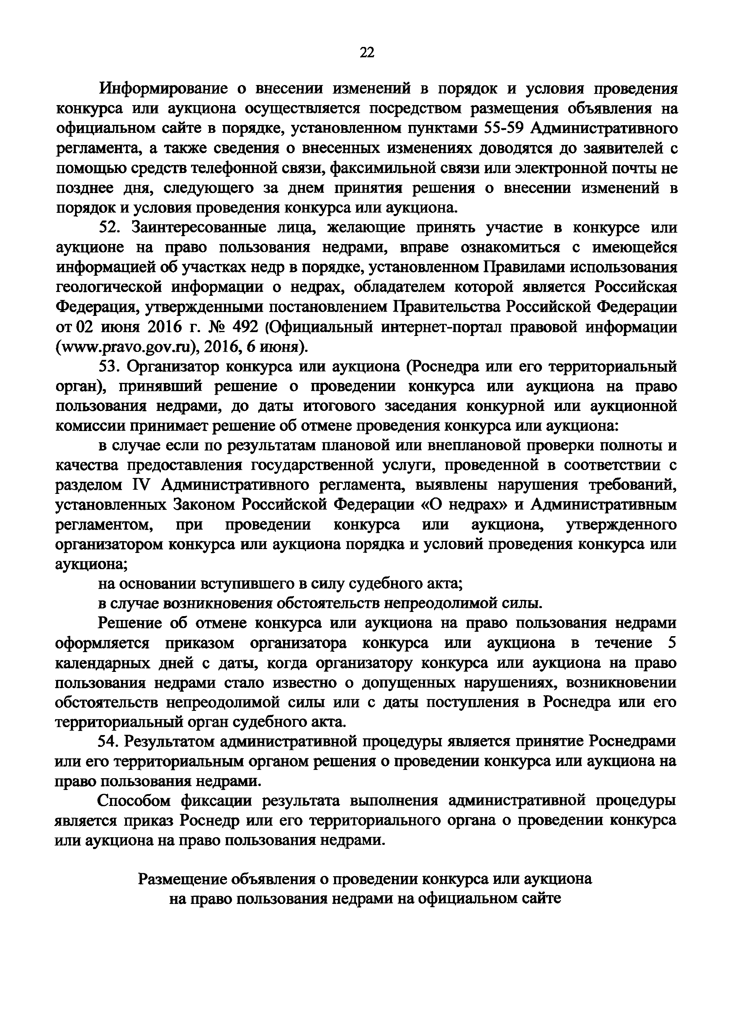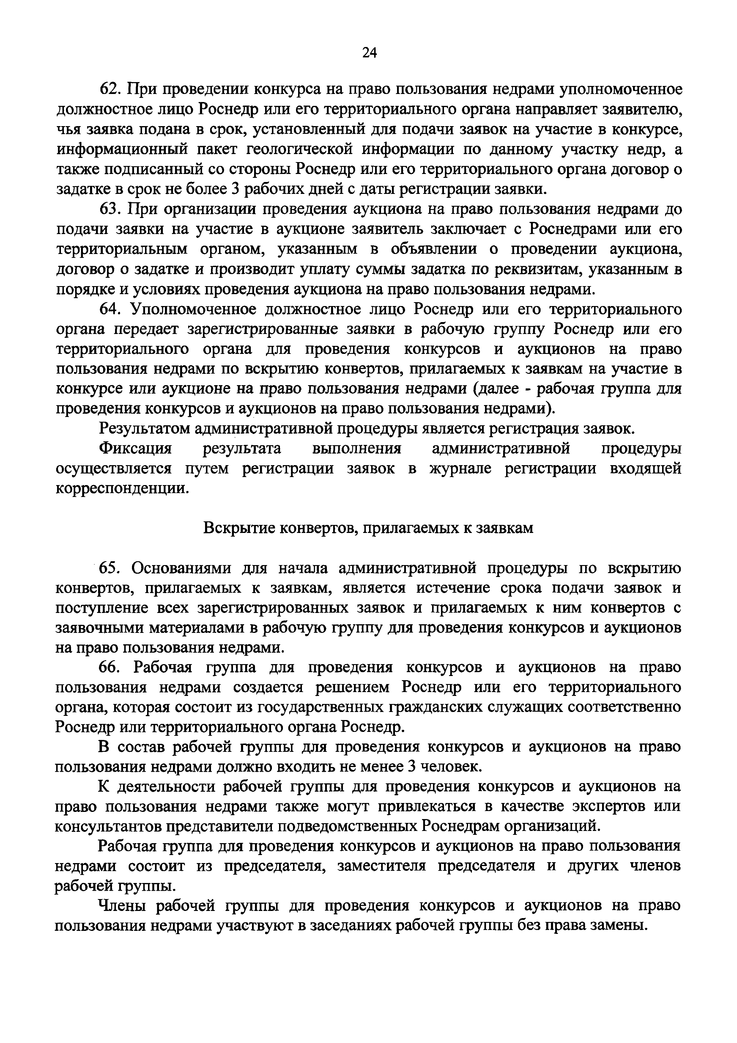 Административный регламент предоставления Федеральным агентством по недропользованию государственной услуги по организации проведения конкурсов и аукционов на право пользования недрами| Статус: | не действует | | Название рус.: | Административный регламент предоставления Федеральным агентством по недропользованию государственной услуги по организации проведения конкурсов и аукционов на право пользования недрами | | Дата добавления в базу: | 01.01.2021 | | Дата актуализации: | 01.01.2021 | | Дата введения: | 19.03.2020 | | Область применения: | Административный определяет сроки и последовательность административных процедур (действий) Федерального агентства по недропользованию и его территориальных органов при осуществлении полномочий по предоставлению государственной услуги по организации проведения конкурсов и аукционов на право пользования недрами, за исключением участков недр федерального значения и участков недр местного значения | | Оглавление: | I. Общие положения II. Стандарт предоставления государственной услуги III. Состав, последовательность и сроки выполнения административных процедур (действий), требования к порядку их выполнения, в том числе особенности выполнения административных процедур (действий) в электронной форме IV. Формы контроля за предоставлением государственной услуги V. Досудебный (внесудебный) порядок обжалования решений и действий (бездействия) Роснедр и территориальных органов Роснедр, предоставляющих государственную услугу, а также их должностных лиц Приложение № 1. Форма заявки на участие в конкурсе (аукционе) на право пользования недрами Приложение № 2. Таблица предельных объемов запасов и прогнозных ресурсов полезных ископаемых, залегающих на участках недр | | Утверждён: | 19.03.2020 Федеральное агентство по недропользованию (110)
