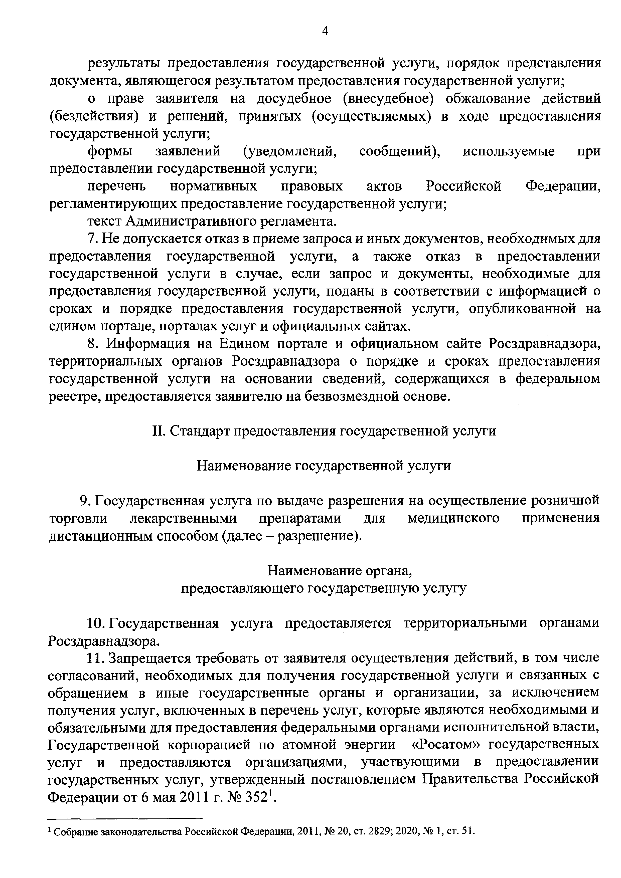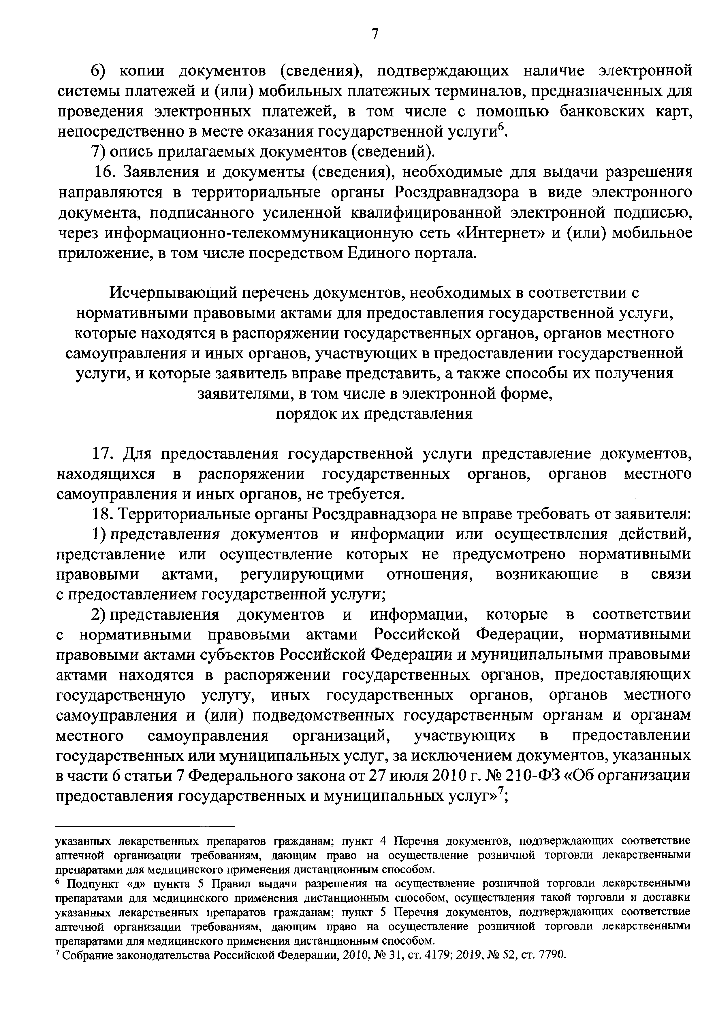 | | Нормативные ссылки: |   Федеральный закон 63-ФЗ «Об электронной подписи» Постановление 373 «О разработке и утверждении административных регламентов осуществления государственного контроля (надзора) и административных регламентов предоставления государственных услуг»  Федеральный закон 210-ФЗ «Об организации предоставления государственных и муниципальных услуг» «Правила надлежащей практики хранения и перевозки лекарственных препаратов для медицинского применения» Постановление 352 «Об утверждении перечня услуг, которые являются необходимыми и обязательными для предоставления федеральными органами исполнительной власти, Государственной корпорацией по атомной энергии "Росатом" государственных услуг и предоставляются организациями, участвующими в предоставлении государственных услуг, и определении размера платы за их оказание» «Правила подачи и рассмотрения жалоб на решения и действия (бездействие) федеральных органов исполнительной власти и их должностных лиц, федеральных государственных служащих, должностных лиц государственных внебюджетных фондов Российской Федерации, государственных корпораций, наделенных в соответствии с федеральными законами полномочиями по предоставлению государственных услуг в установленной сфере деятельности, и их должностных лиц, организаций, предусмотренных частью 1.1 статьи 16 Федерального закона "Об организации предоставления государственных и муниципальных услуг", и их работников, а также многофункциональных центров предоставления государственных и муниципальных услуг и их работников» «Правила определения видов электронной подписи, использование которых допускается при обращении за получением государственных и муниципальных услуг»  Постановление 697 «Об утверждении Правил выдачи разрешения на осуществление розничной торговли лекарственными препаратами для медицинского применения дистанционным способом, осуществления такой торговли и доставки указанных лекарственных препаратов гражданам и внесении изменений в некоторые акты Правительства Российской Федерации по вопросу розничной торговли лекарственными препаратами для медицинского применения дистанционным способом»