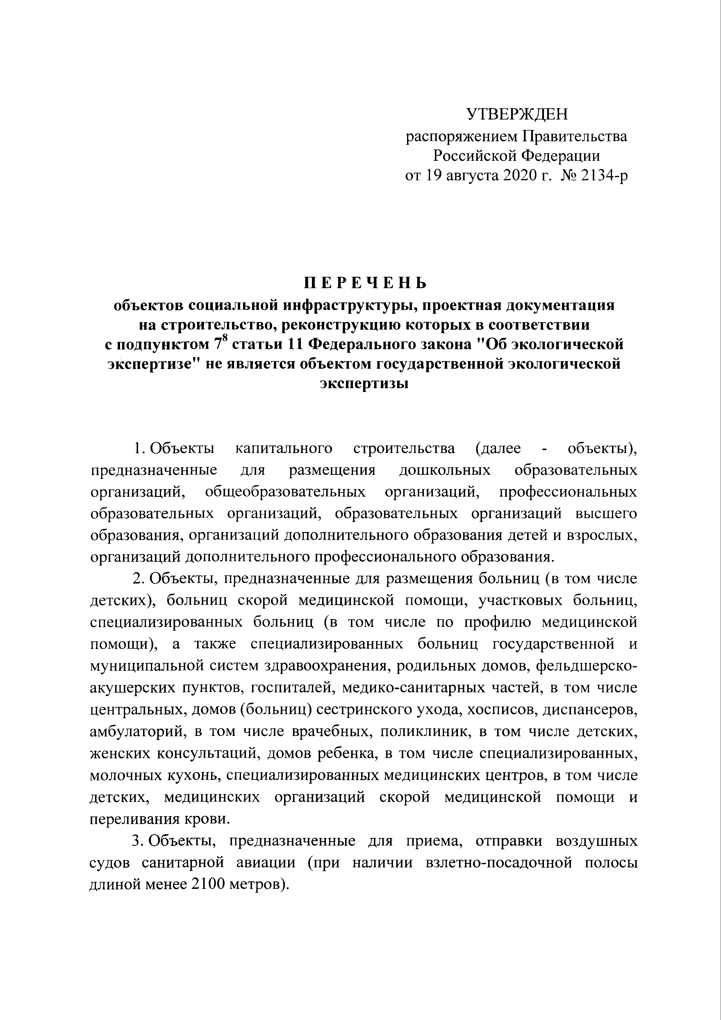 Перечень объектов социальной инфраструктуры, проектная документация на строительство, реконструкцию которых в соответствии с подпунктом 7.8 статьи 11 Федерального закона "Об экологической экспертизе" не является объектом государственной экологической экспертизы| Статус: | действует | | Название рус.: | Перечень объектов социальной инфраструктуры, проектная документация на строительство, реконструкцию которых в соответствии с подпунктом 7.8 статьи 11 Федерального закона "Об экологической экспертизе" не является объектом государственной экологической экспертизы | | Дата добавления в базу: | 01.01.2021 | | Дата актуализации: | 01.01.2021 | | Дата введения: | 19.08.2020 | | Утверждён: | 19.08.2020 Правительство Российской Федерации (2134-р)