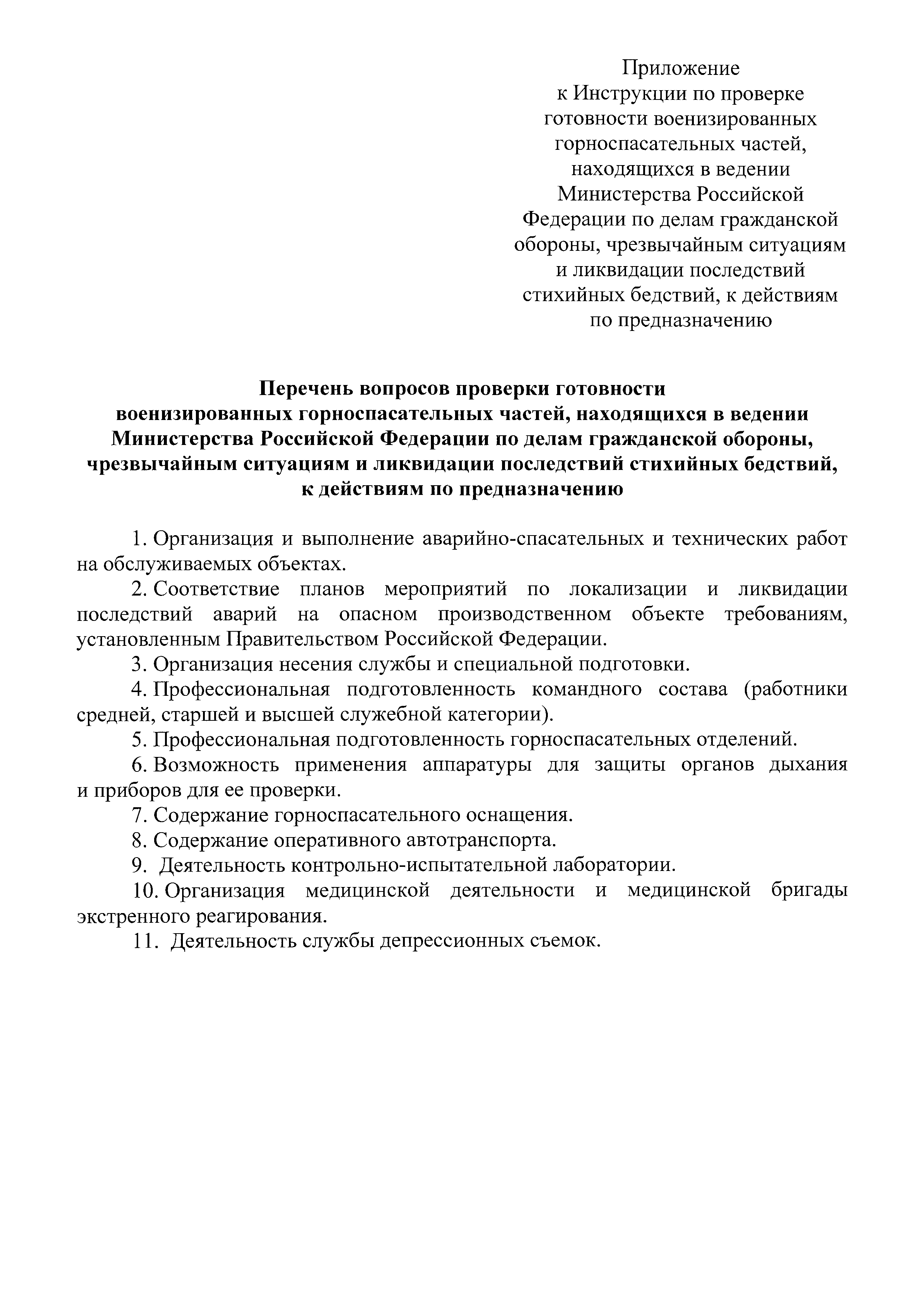 Инструкция по проверке готовности военизированных горноспасательных частей, находящихся в ведении Министерства Российской Федерации по делам гражданской обороны, чрезвычайным ситуациям и ликвидации последствий стихийных бедствий, к действиям по предназначению| Статус: | действует | | Название рус.: | Инструкция по проверке готовности военизированных горноспасательных частей, находящихся в ведении Министерства Российской Федерации по делам гражданской обороны, чрезвычайным ситуациям и ликвидации последствий стихийных бедствий, к действиям по предназначению | | Дата добавления в базу: | 01.01.2021 | | Дата актуализации: | 01.01.2021 | | Область применения: | Инструкция по проверке готовности военизированных горноспасательных частей, находящихся в ведении Министерства Российской Федерации по делам гражданской обороны, чрезвычайным ситуациям и ликвидации последствий стихийных бедствий, к действиям по предназначению определяет порядок организации и проведения проверки готовности оперативных подразделений (горноспасательных отрядов, взводов, пунктов, постов) и вспомогательных подразделений (контрольно-испытательных лабораторий, медицинских бригад экстренного реагирования, служб депрессионных съемок) ВГСЧ к действиям по предназначению. | | Утверждён: | 16.06.2020 МЧС России (Russian Federation MChS 426)
