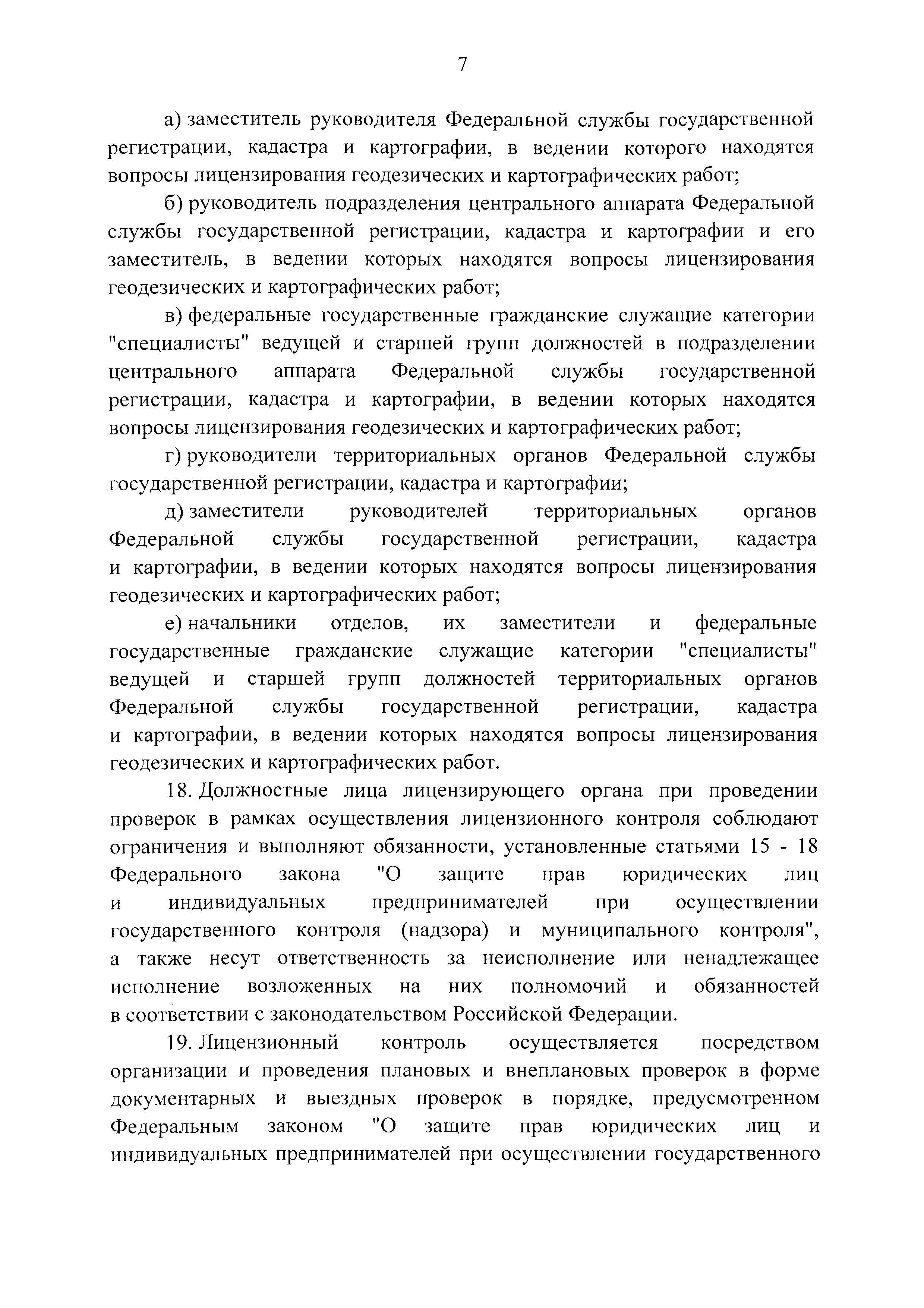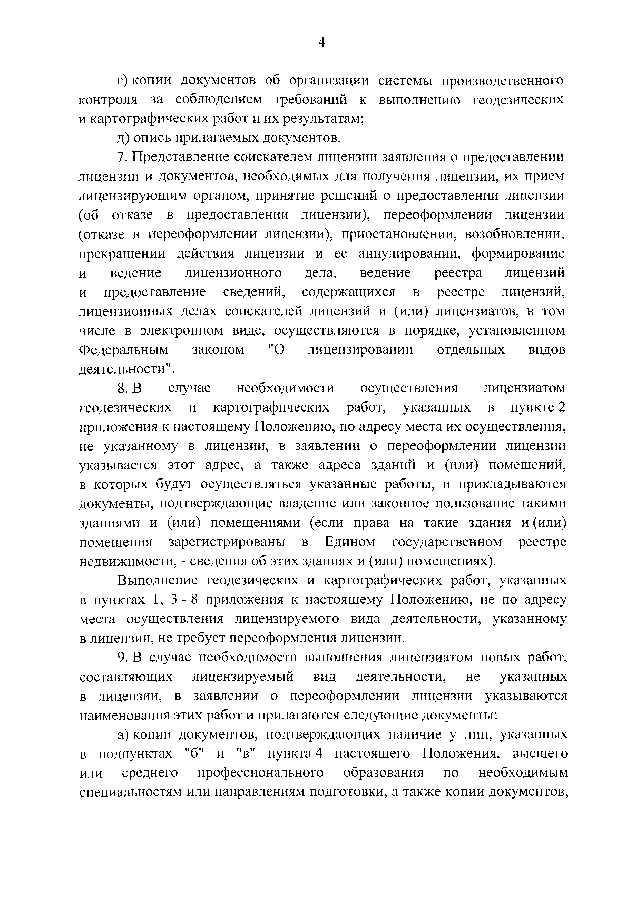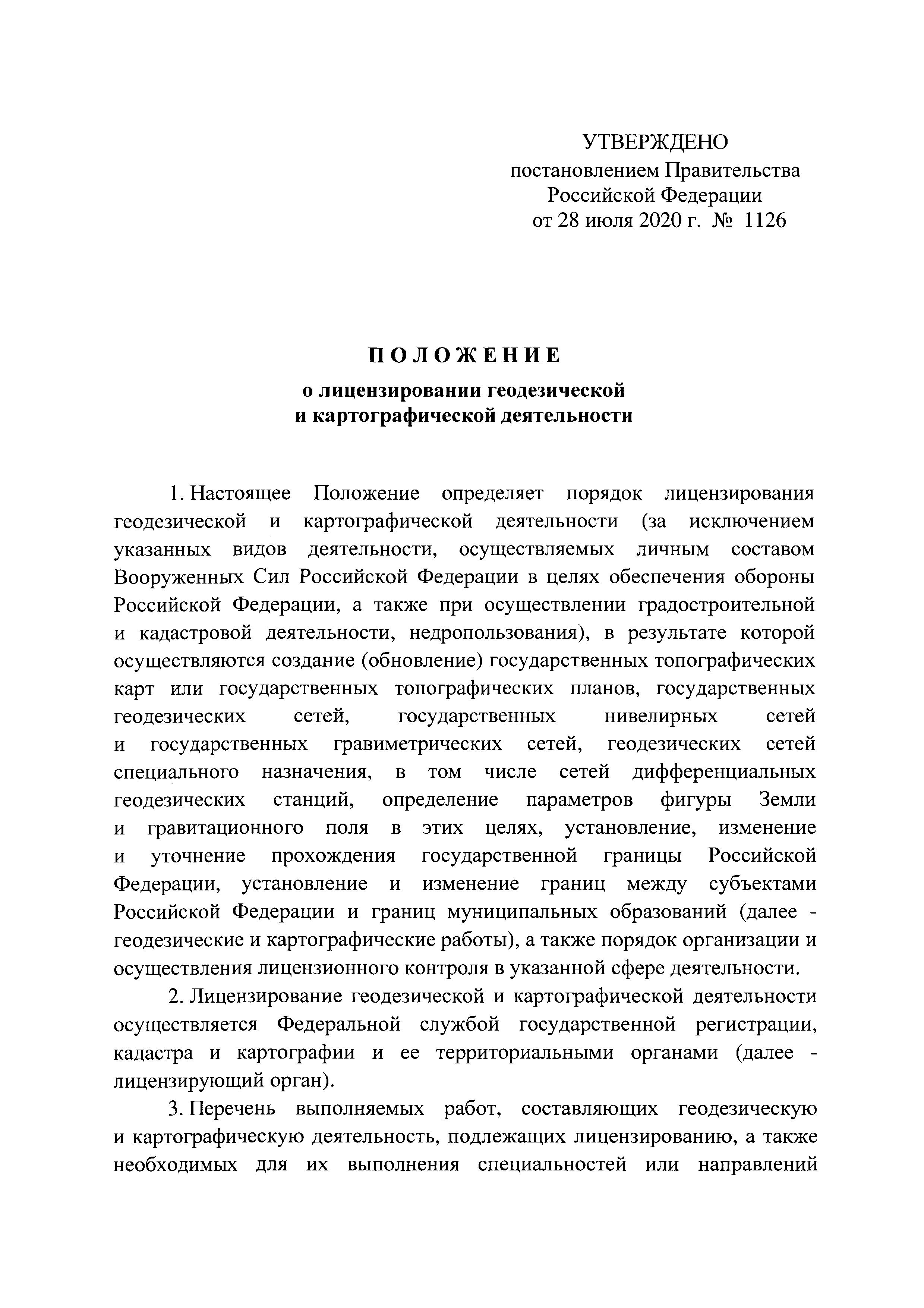 Положение о лицензировании геодезической и картографической деятельности| Статус: | принят | | Название рус.: | Положение о лицензировании геодезической и картографической деятельности | | Дата добавления в базу: | 01.01.2021 | | Дата актуализации: | 01.01.2021 | | Дата введения: | 01.01.2021 | | Область применения: | Положение определяет порядок лицензирования геодезической и картографической деятельности (за исключением указанных видов деятельности, осуществляемых личным составом Вооруженных Сил Российской Федерации в целях обеспечения обороны Российской Федерации, а также при осуществлении градостроительной и кадастровой деятельности, недропользования), в результате которой осуществляются создание (обновление) государственных топографических карт или государственных топографических планов, государственных геодезических сетей, государственных нивелирных сетей и государственных гравиметрических сетей, геодезических сетей специального назначения, в том числе сетей дифференциальных геодезических станций, определение параметров фигуры Земли и гравитационного поля в этих целях, установление, изменение и уточнение прохождения государственной границы Российской Федерации, установление и изменение границ между субъектами Российской Федерации и границ муниципальных образований, а также порядок организации и осуществления лицензионного контроля в указанной сфере деятельности | | Оглавление: | Приложение. Перечень выполняемых работ, составляющих геодезическую и картографическую деятельность, подлежащих лицензированию, а также необходимых для их выполнения специальностей или направлений подготовки работников юридического лица(индивидуального предпринимателя), обратившегося в лицензирующий орган с заявлением о предоставлении лицензии, или работников юридического лица (индивидуального предпринимателя), имеющего лицензию | | Утверждён: | 28.07.2020 Правительство Российской Федерации (1126)