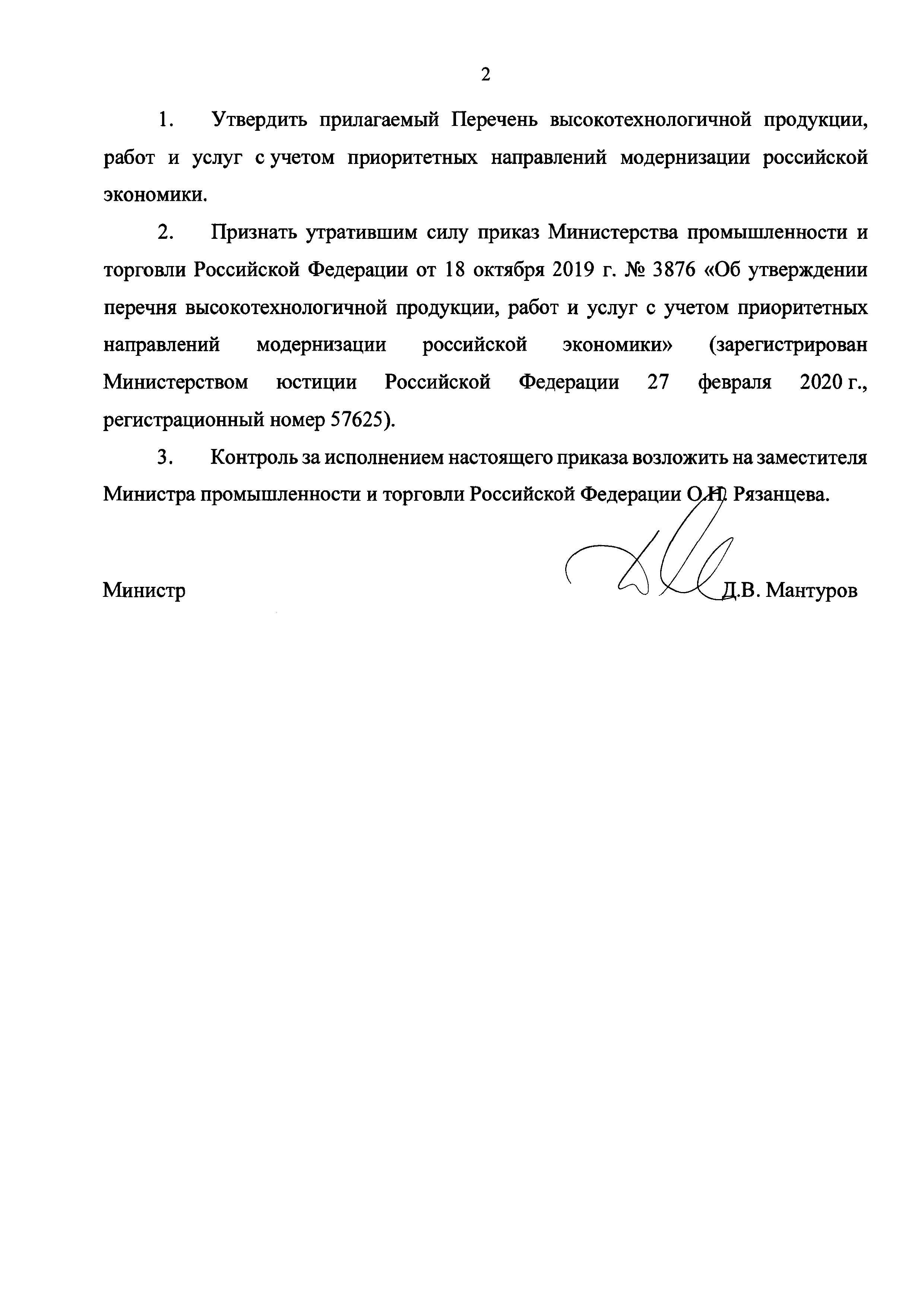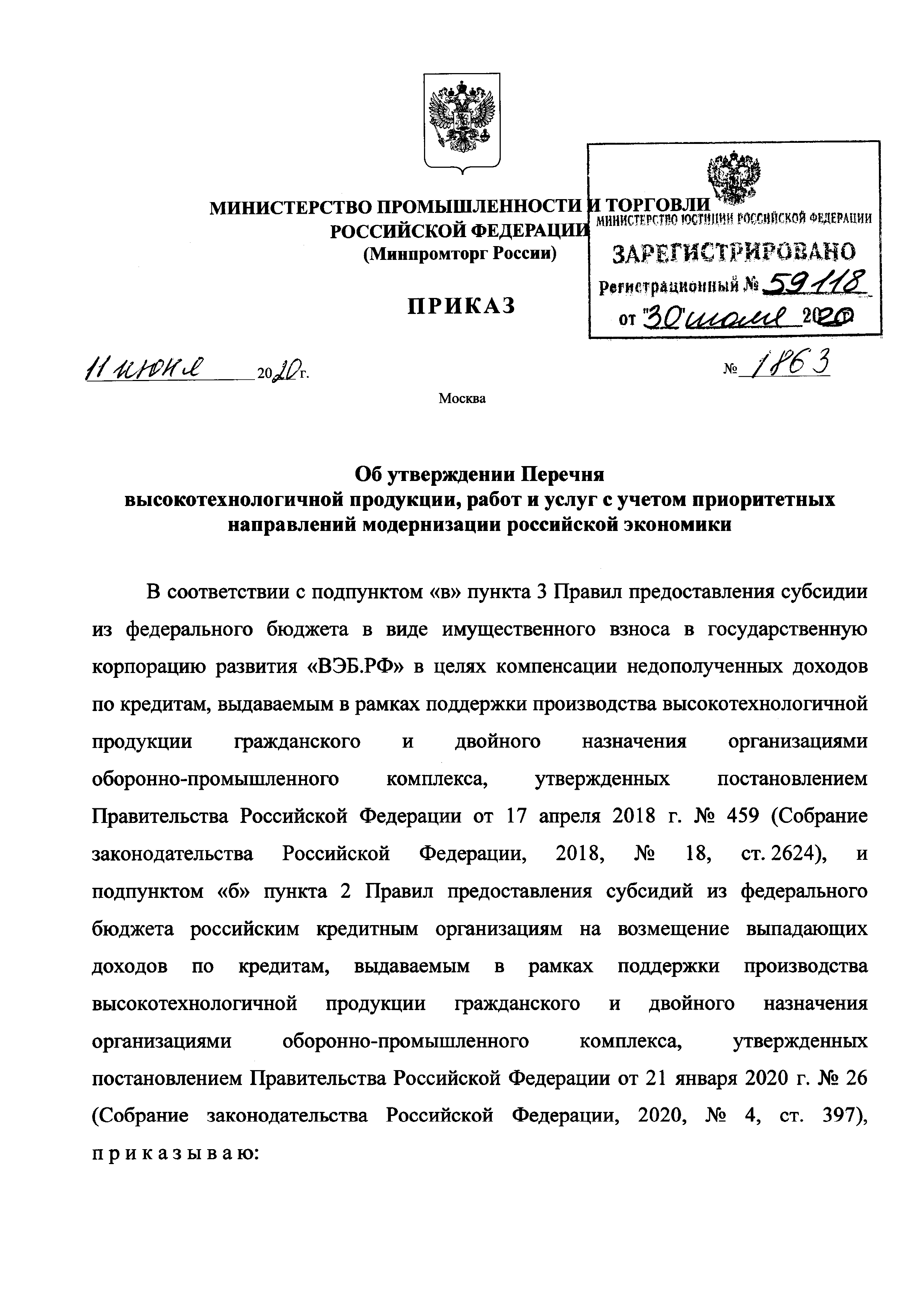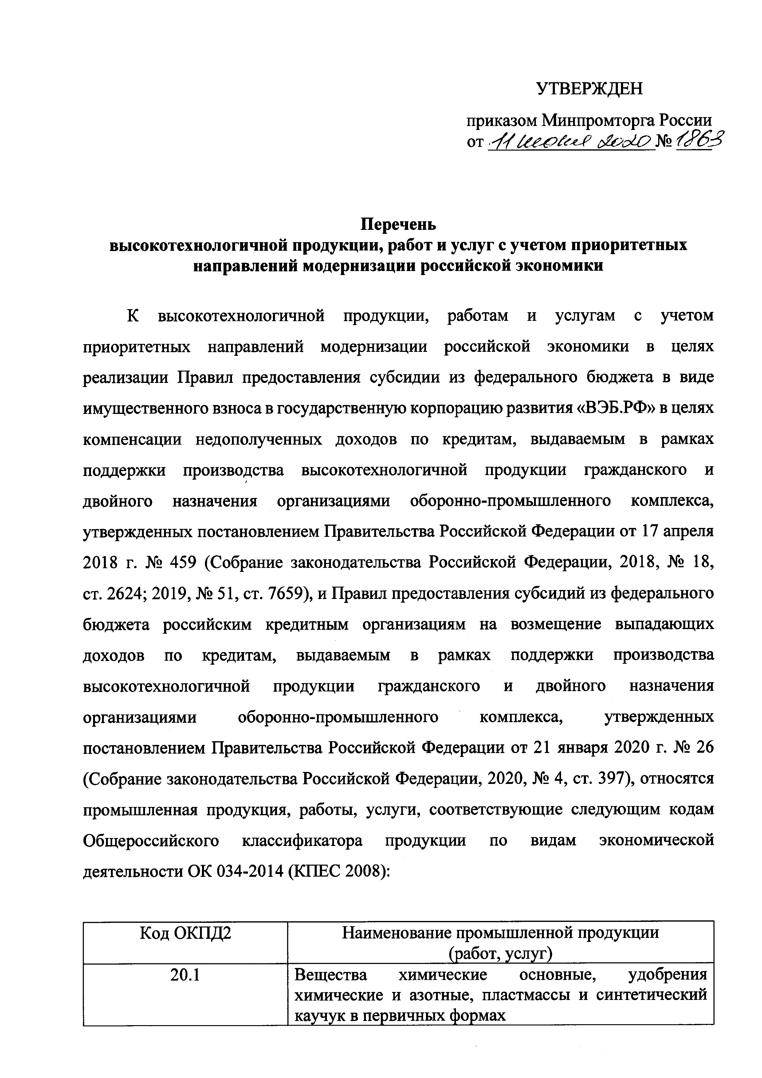 Перечень высокотехнологичной продукции, работ и услуг с учетом приоритетных направлений модернизации российской экономики| Статус: | действует | | Название рус.: | Перечень высокотехнологичной продукции, работ и услуг с учетом приоритетных направлений модернизации российской экономики | | Дата добавления в базу: | 01.01.2021 | | Дата актуализации: | 01.01.2021 | | Дата введения: | 10.08.2020 | | Утверждён: | 11.06.2020 Министерство промышленности и торговли РФ (1863)