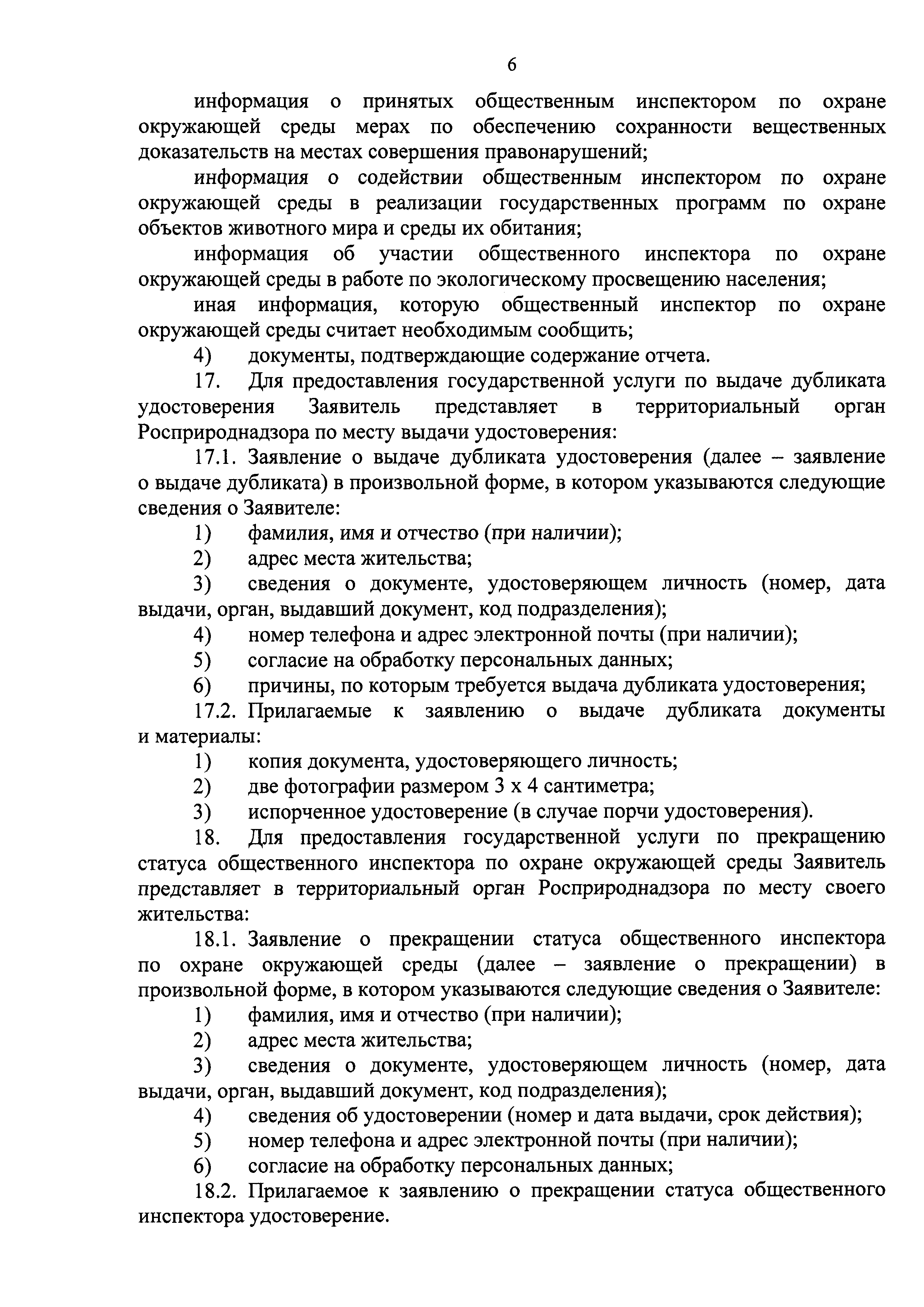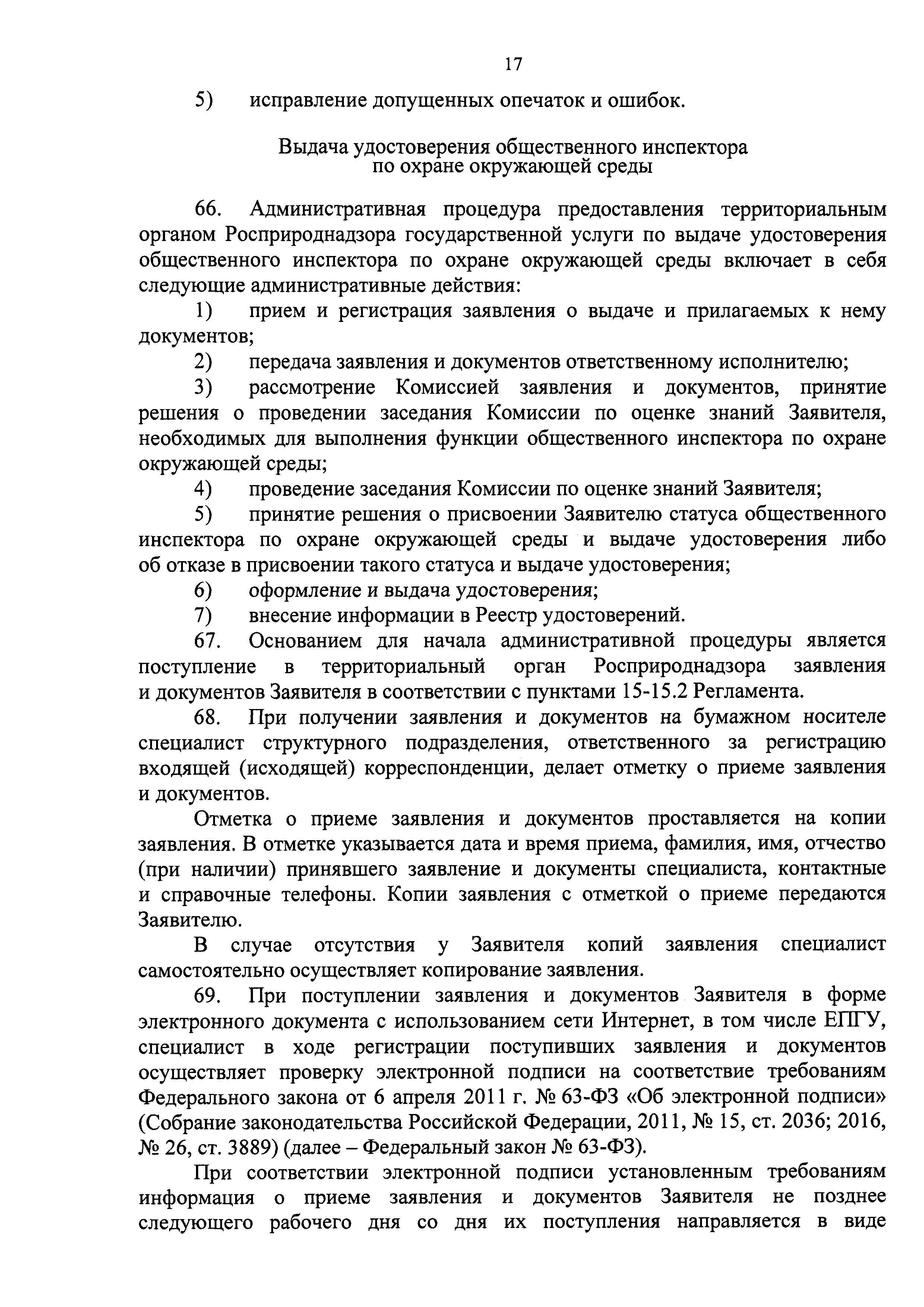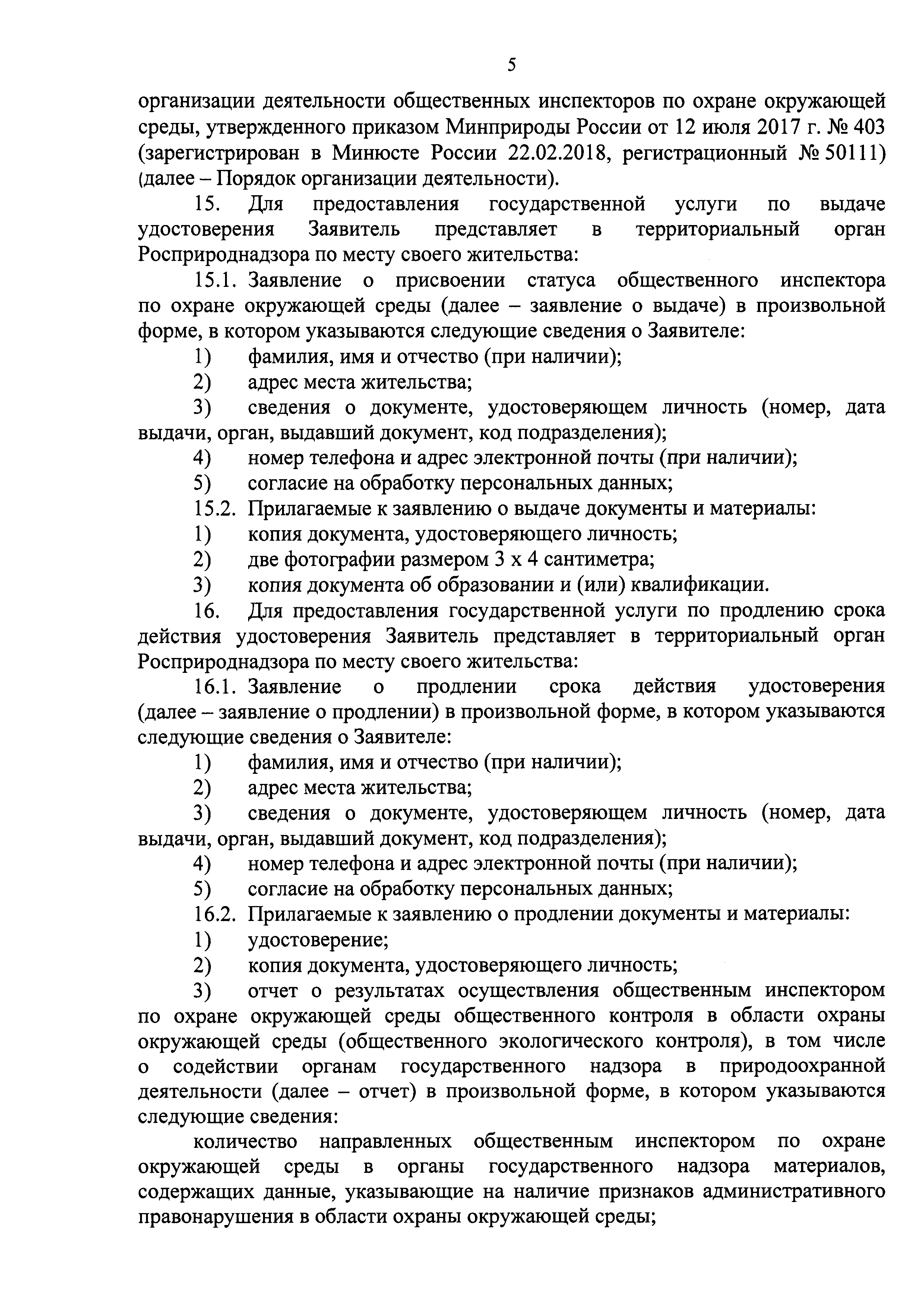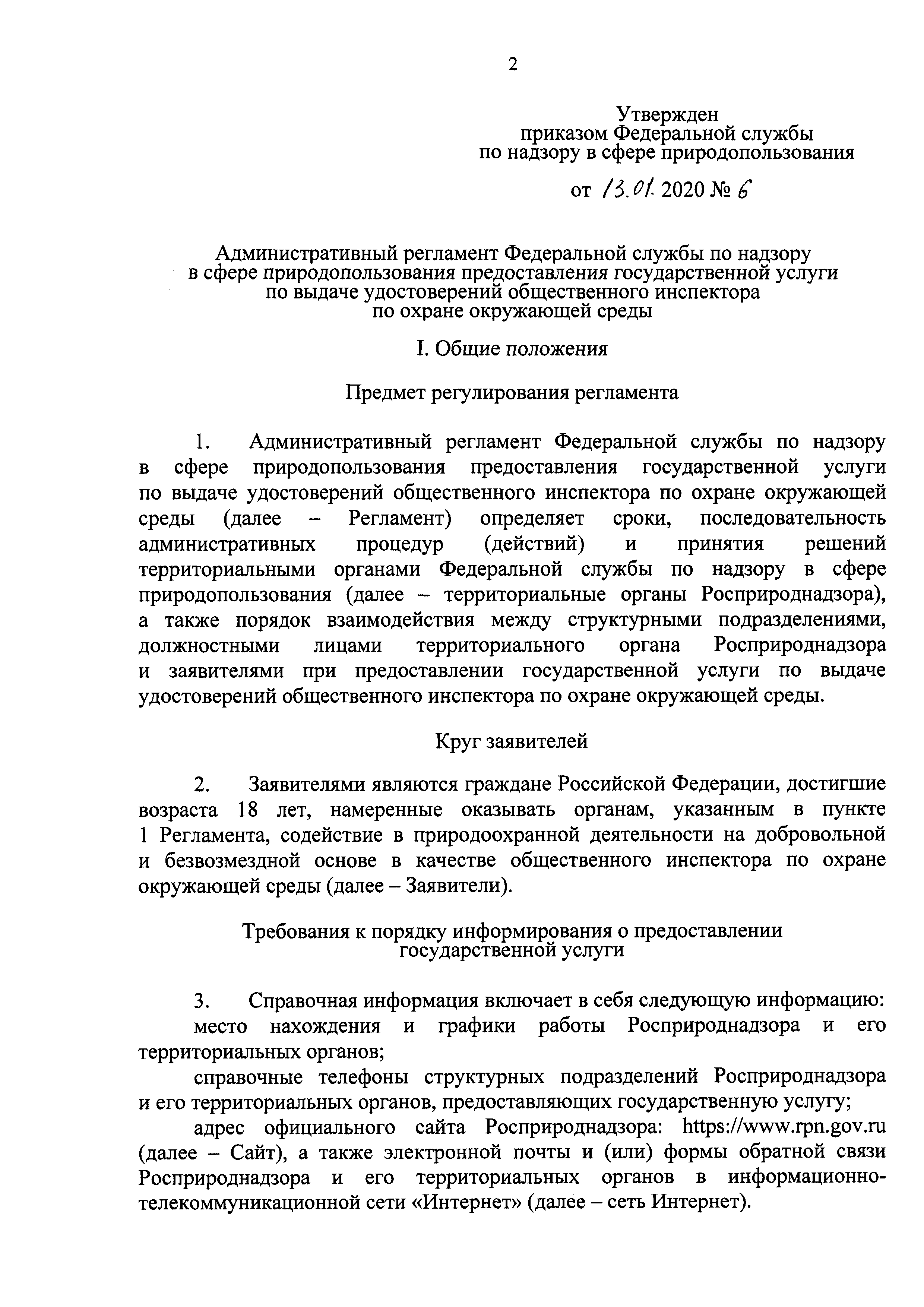 | Область применения: | Административный регламент Федеральной службы по надзору в сфере природопользования предоставления государственной услуги по выдаче удостоверений общественного инспектора по охране окружающей среды определяет сроки, последовательность административных процедур (действий) и принятия решений территориальными органами Федеральной службы по надзору в сфере природопользования, а также порядок взаимодействия между структурными подразделениями, должностными лицами территориального органа Росприроднадзора и заявителями при предоставлении государственной услуги по выдаче удостоверений общественного инспектора по охране окружающей среды. |
