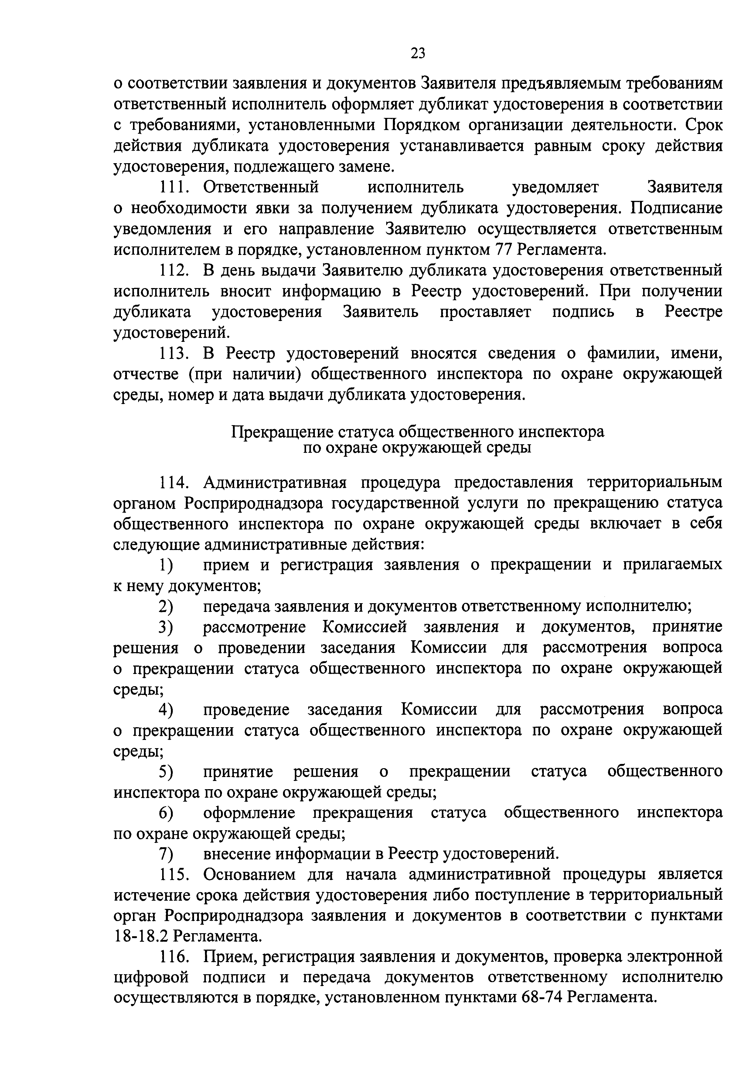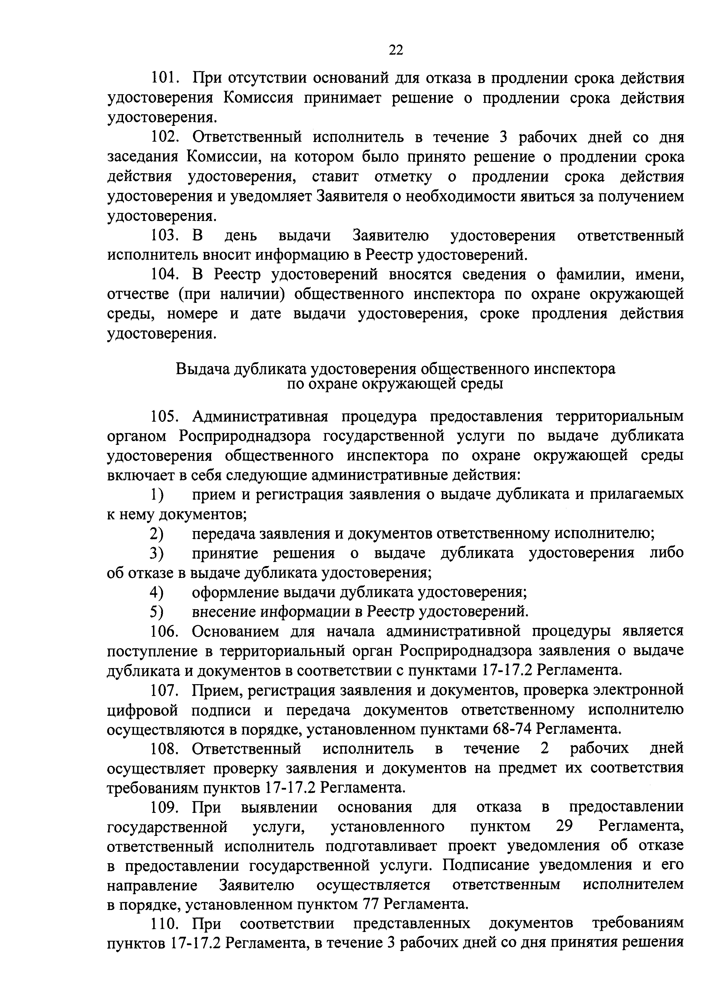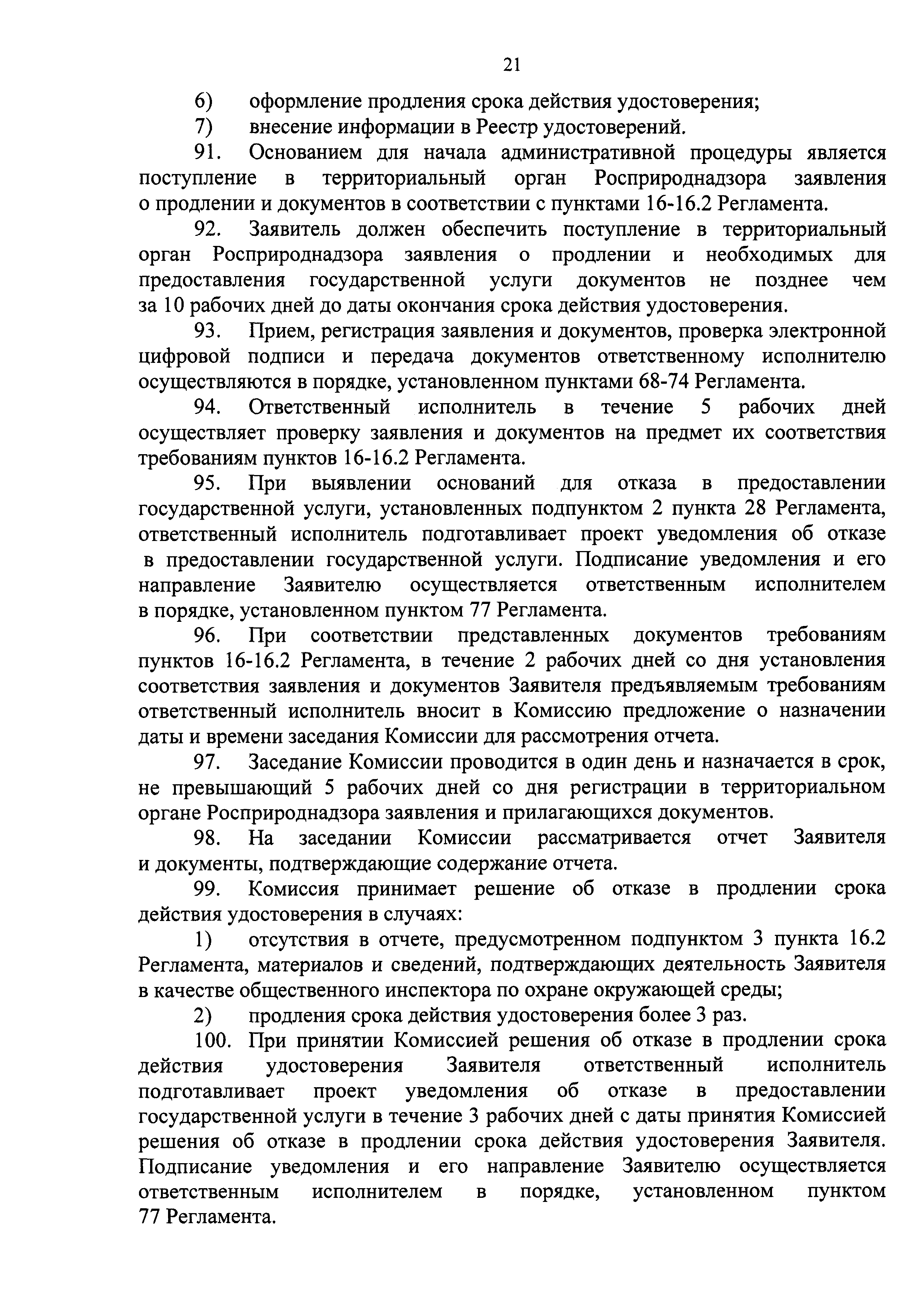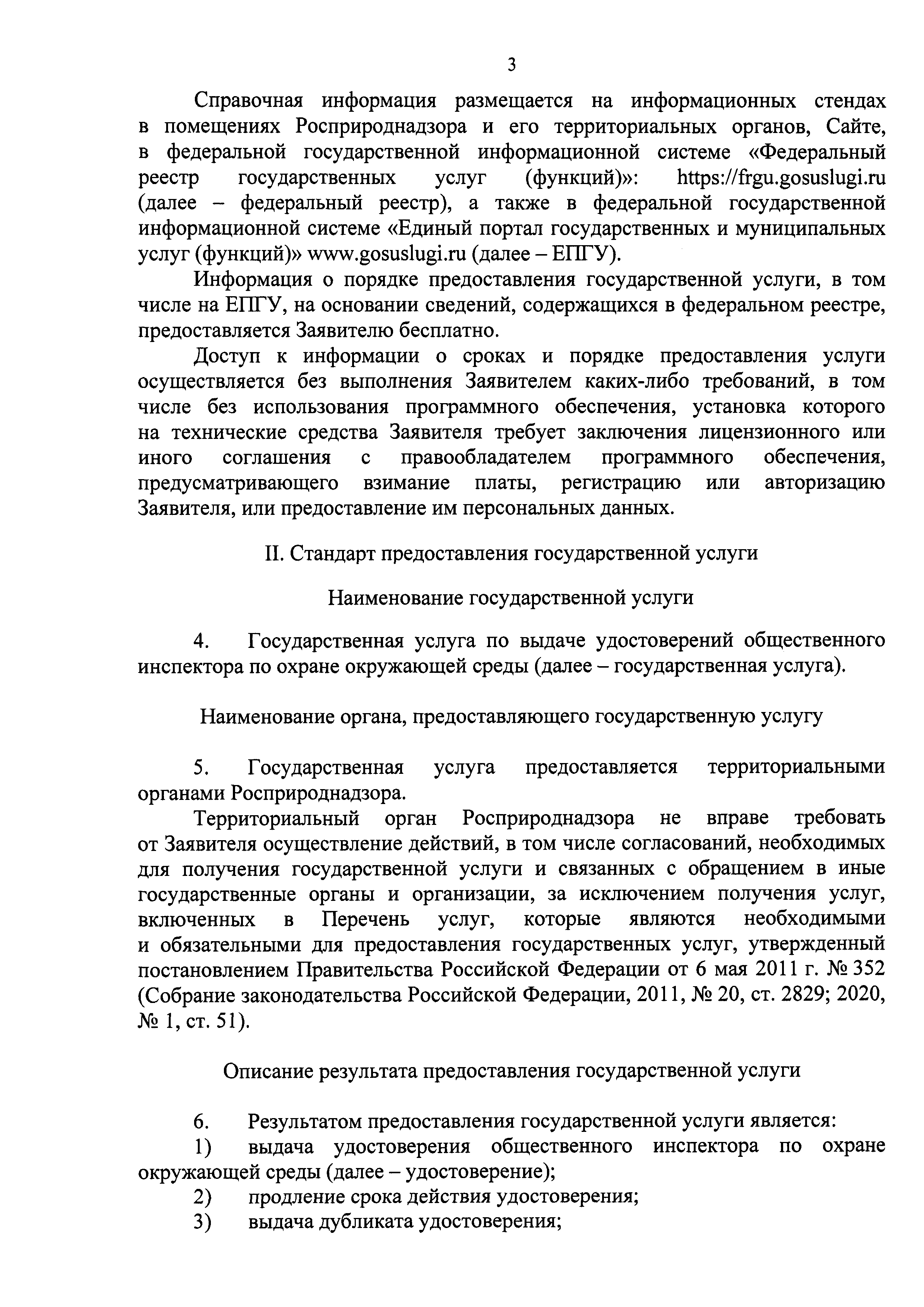 | Область применения: | Административный регламент Федеральной службы по надзору в сфере природопользования предоставления государственной услуги по выдаче удостоверений общественного инспектора по охране окружающей среды определяет сроки, последовательность административных процедур (действий) и принятия решений территориальными органами Федеральной службы по надзору в сфере природопользования, а также порядок взаимодействия между структурными подразделениями, должностными лицами территориального органа Росприроднадзора и заявителями при предоставлении государственной услуги по выдаче удостоверений общественного инспектора по охране окружающей среды. |