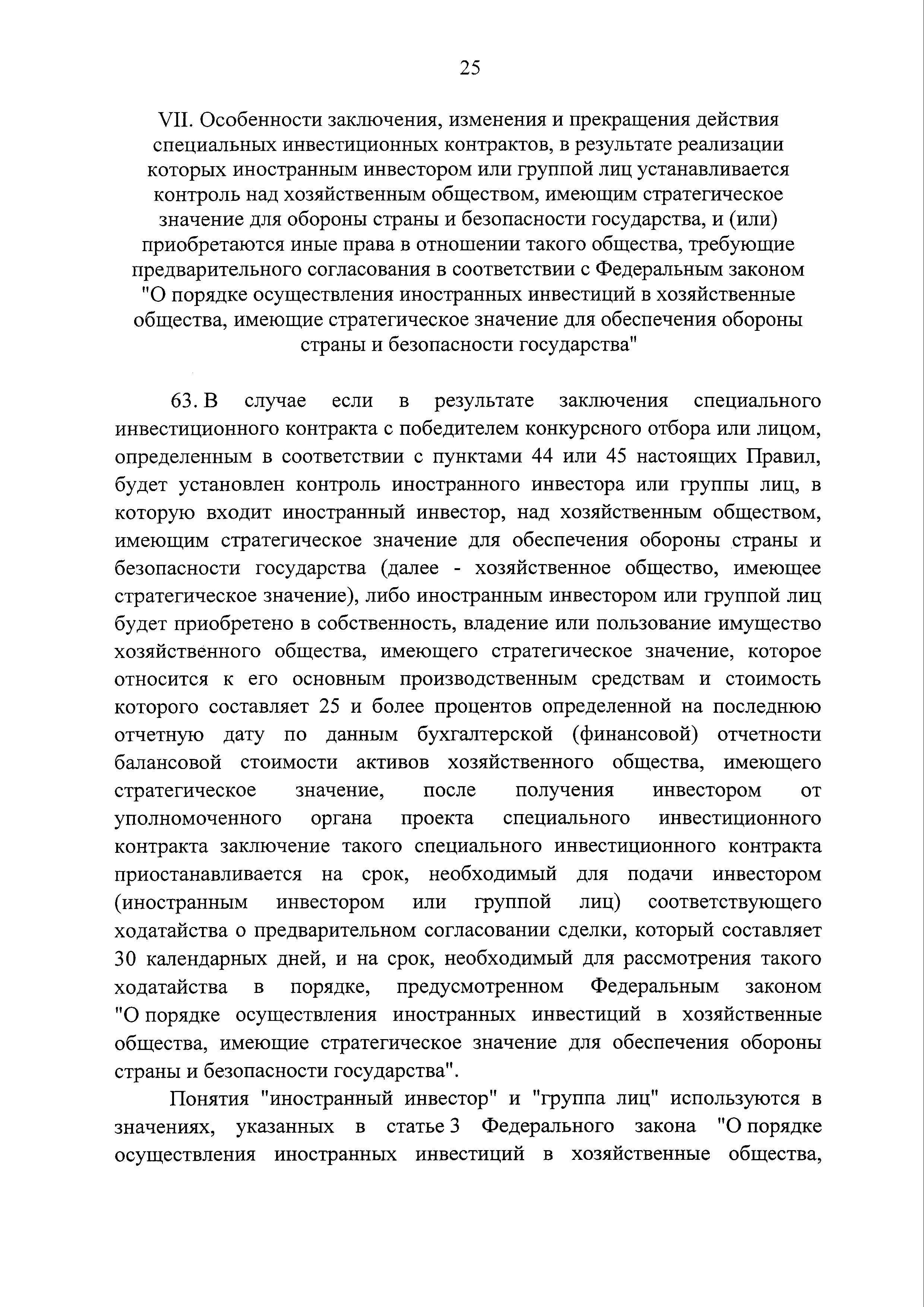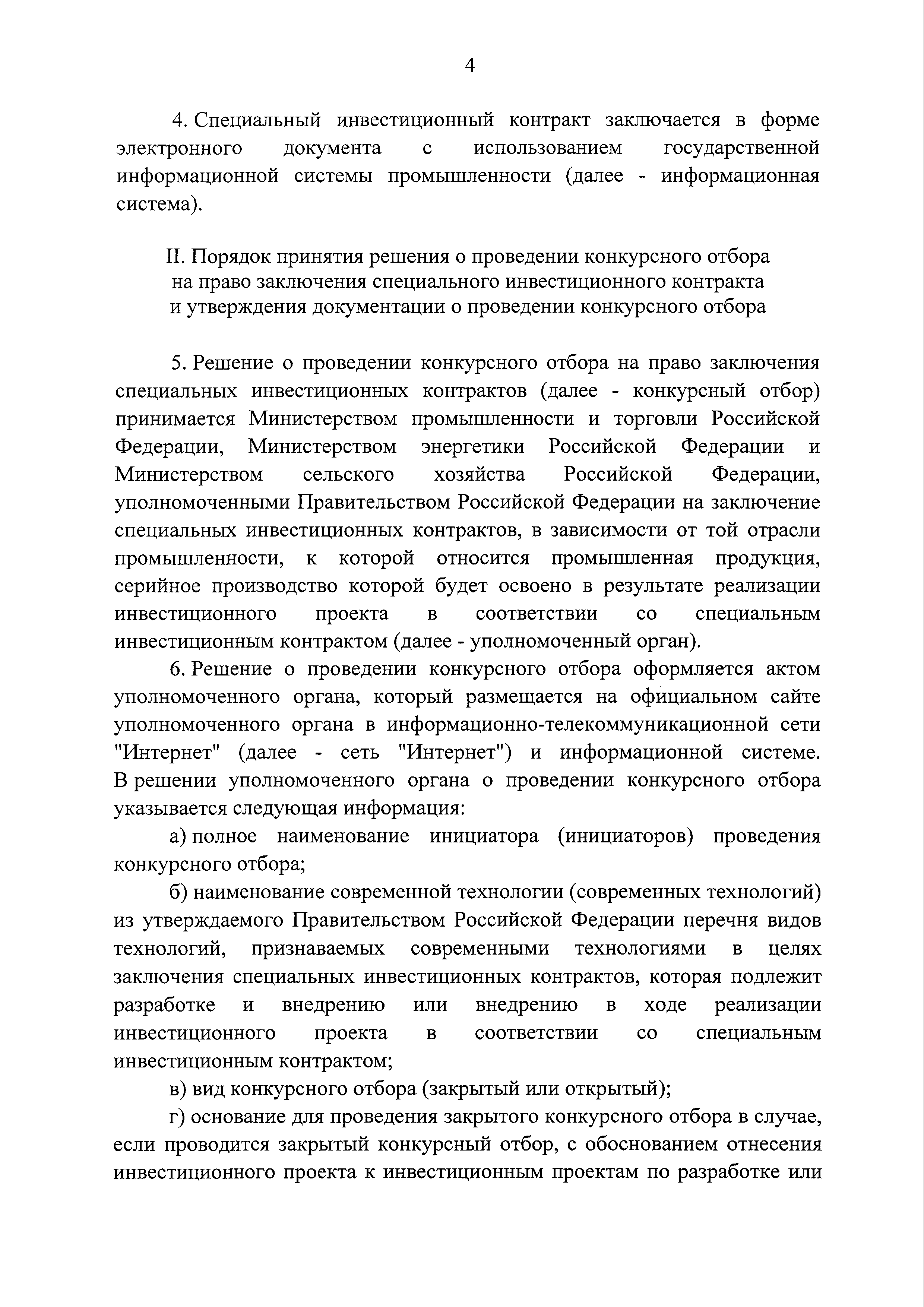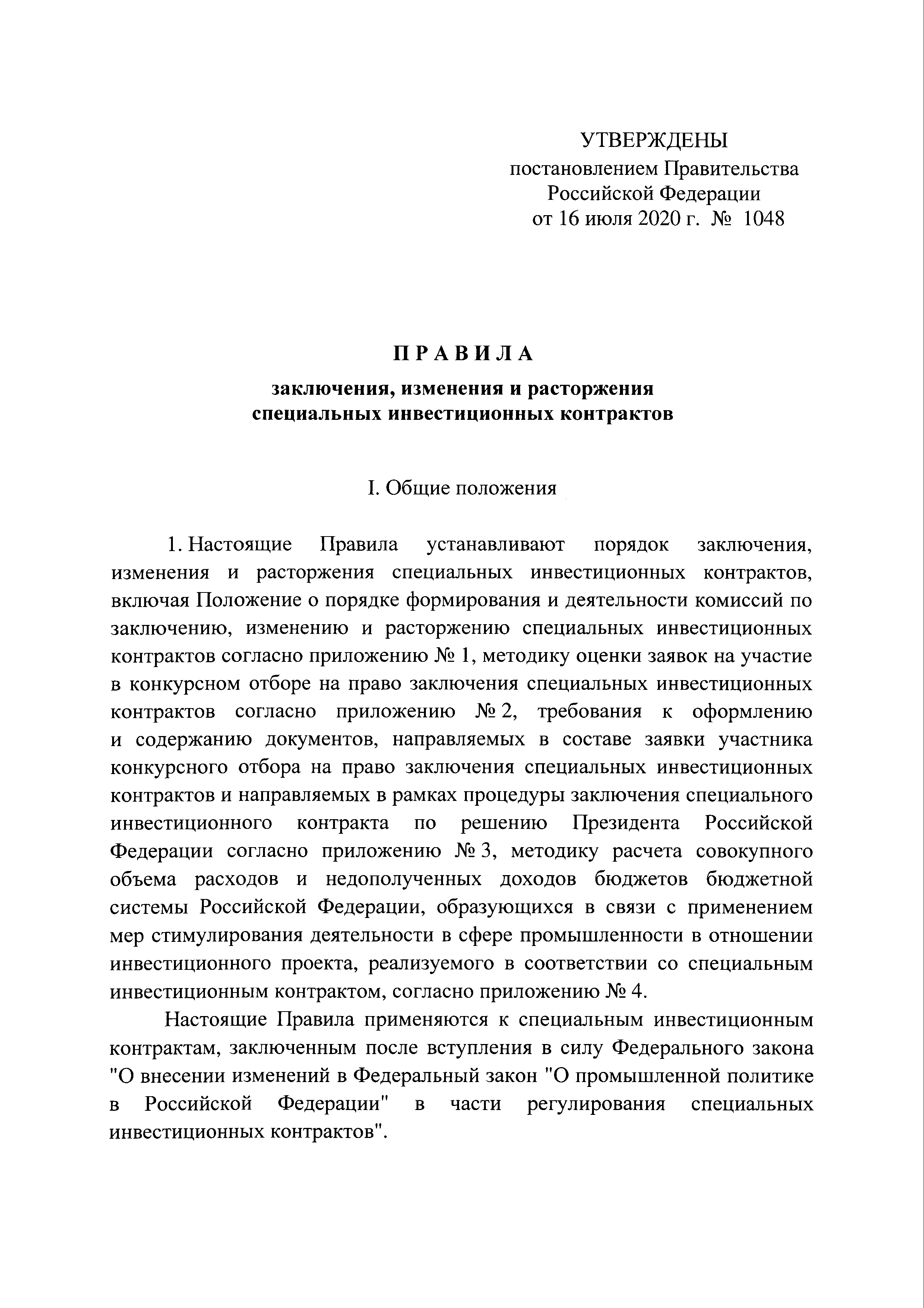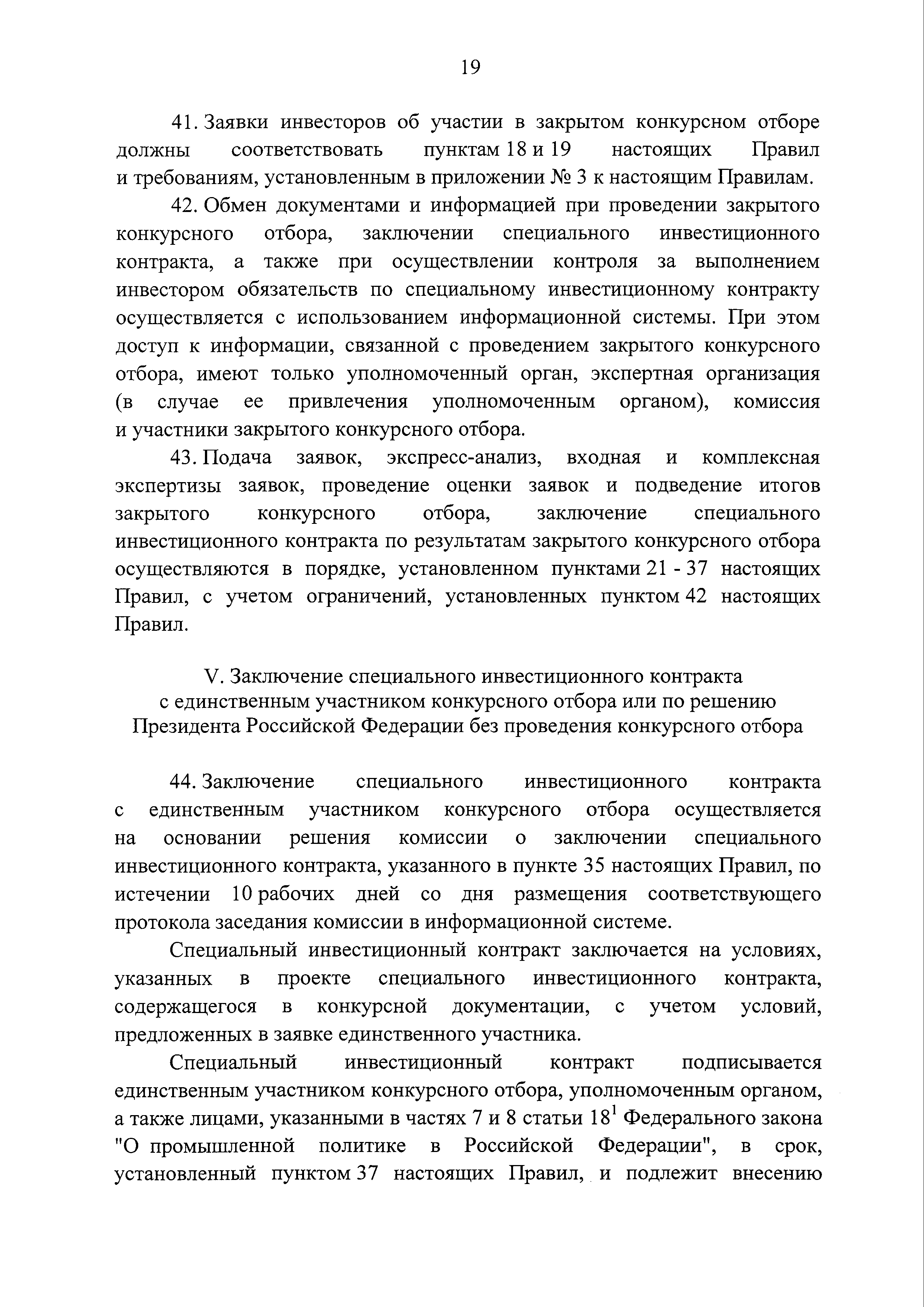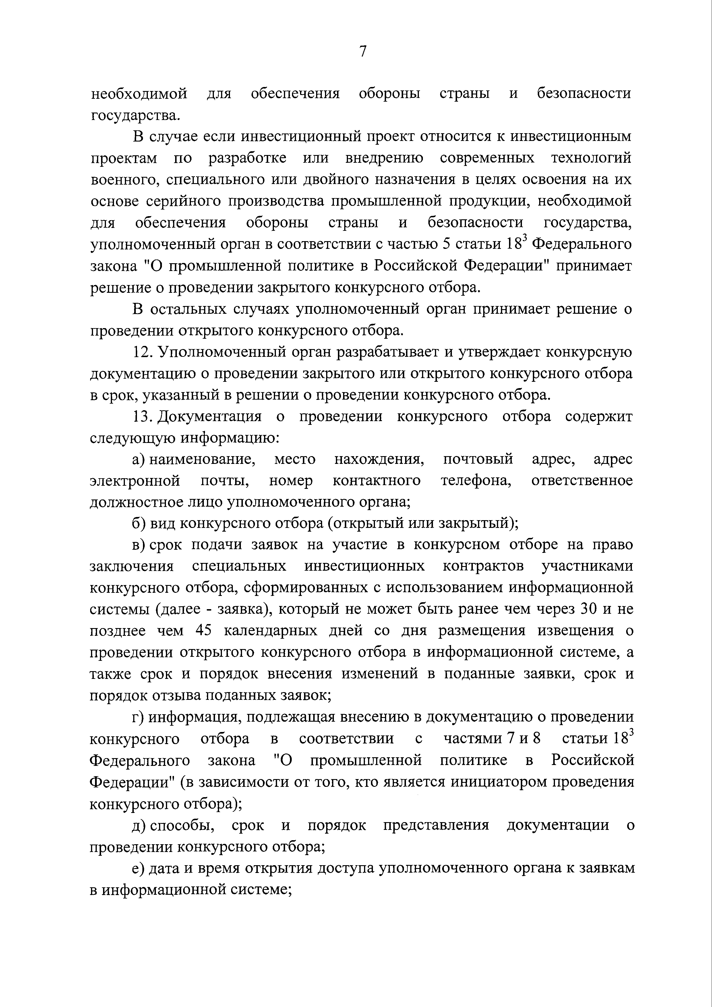 | Оглавление: | I. Общие положения II. Порядок принятия решения о проведении конкурсного отбора на право заключения специального инвестиционного контракта и утверждения документации о проведении конкурсного отбора III. Порядок проведения открытых конкурсных отборов и заключения специального инвестиционного контракта по результатам проведения открытого конкурсного отбора IV. Порядок проведения закрытых конкурсных отборов и заключения специального инвестиционного контракта по результатам проведения закрытого конкурсного отбора V. Заключение специального инвестиционного контракта с единственным участником конкурсного отбора или по решению Президента Российской Федерации без проведения конкурсного отбора VI. Порядок изменения и расторжения специальных инвестиционных контрактов VII. Особенности заключения, изменения и прекращения действия специальных инвестиционных контрактов, в результате реализации которых иностранным инвестором или группой лиц устанавливается контроль над хозяйственным обществом, имеющим стратегическое значение для обороны страны и безопасности государства, и (или) приобретаются иные права в отношении такого общества, требующие предварительного согласования в соответствии с Федеральным законом "О порядке осуществления иностранных инвестиций в хозяйственные общества, имеющие стратегическое значение для обеспечения обороны страны и безопасности государства" Приложение № 1. Положение о порядке формирования и деятельности комиссий по заключению, изменению и расторжению специальных инвестиционных контрактов Приложение № 2. Методика оценки заявок на участие в конкурсном отборе на право заключения специальных инвестиционных контрактов Приложение № 3. Требования к оформлению и содержанию документов, направляемых в составе заявки участника конкурсного отбора на право заключения специальных инвестиционных контрактов и направляемых в рамках процедуры заключения специального инвестиционного контракта по решению Президента Российской Федерации Приложение. Форма плана мероприятий ("дорожной карты") по разработке и внедрению или внедрению технологии и серийному производству промышленной продукции в ходе реализации инвестиционного проекта Приложение № 4. Методика расчета совокупного объема расходов и недополученных доходов бюджетов бюджетной системы Российской Федерации, образующихся в связи с применением мер стимулирования деятельности в сфере промышленности в отношении инвестиционного проекта, реализуемого в соответствии со специальным инвестиционным контрактом |