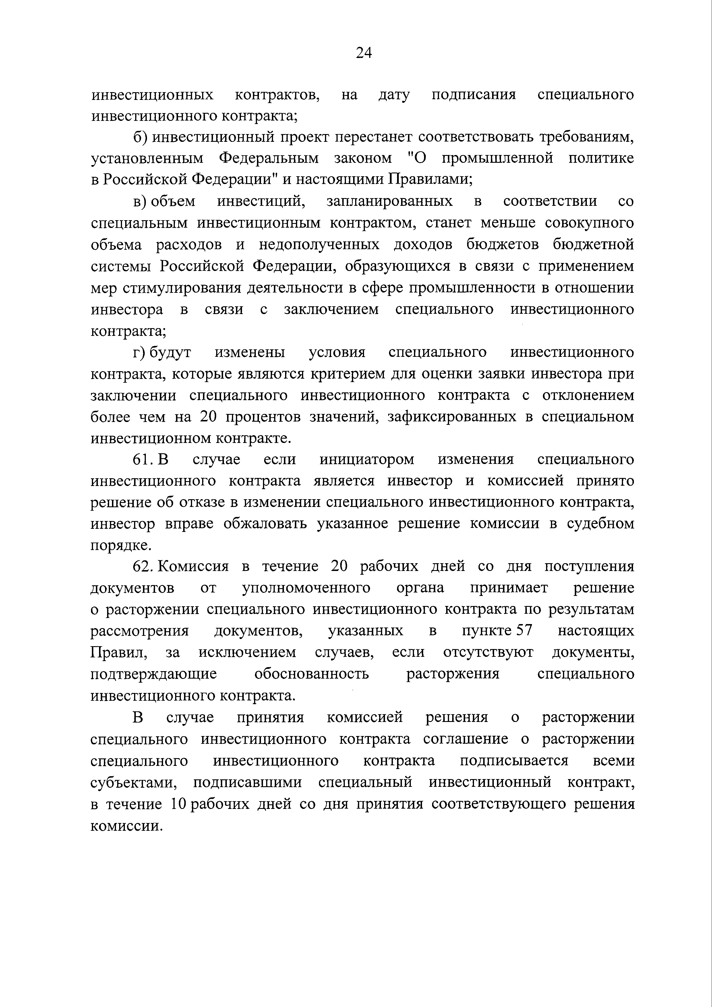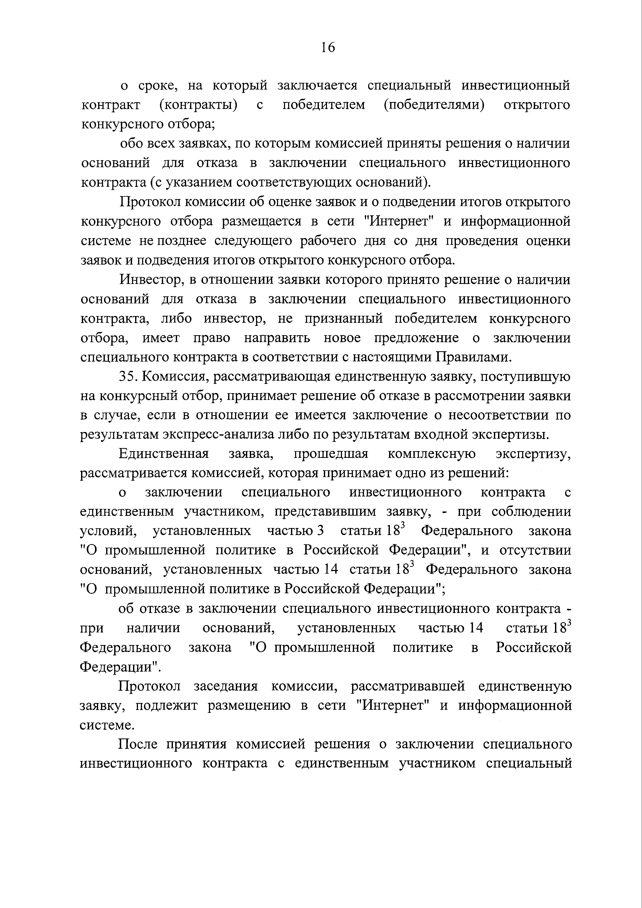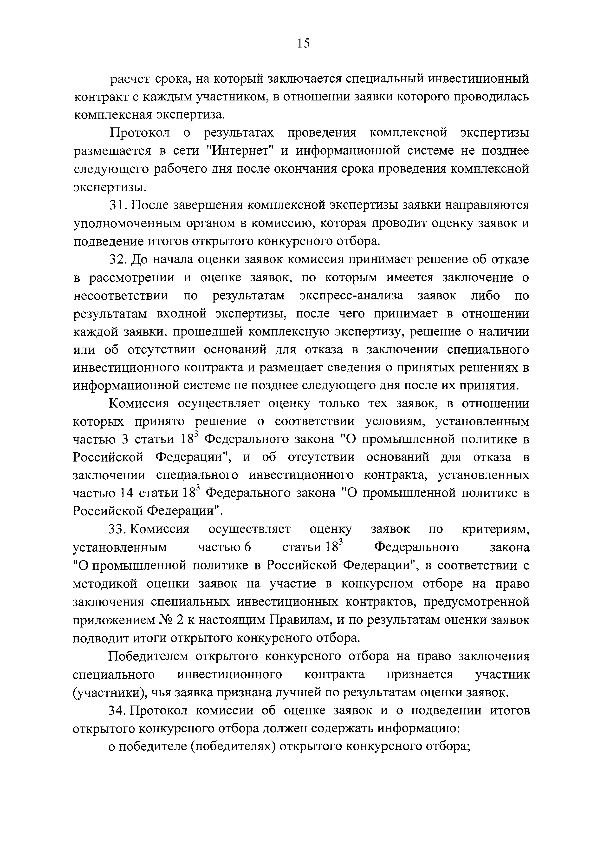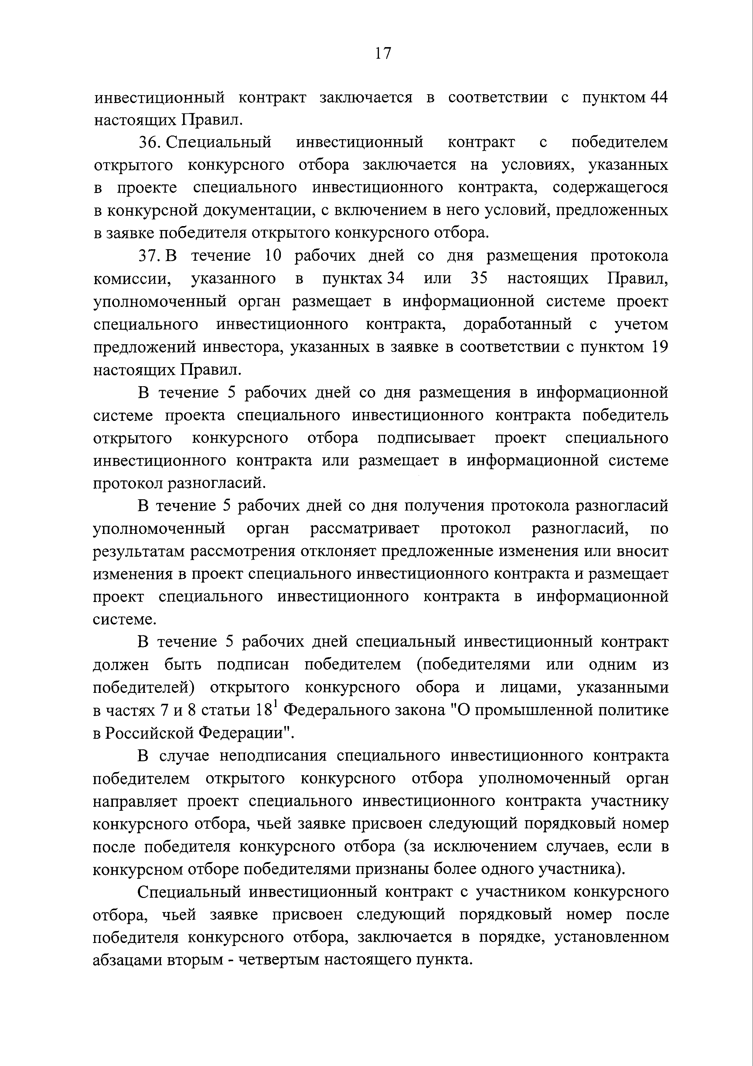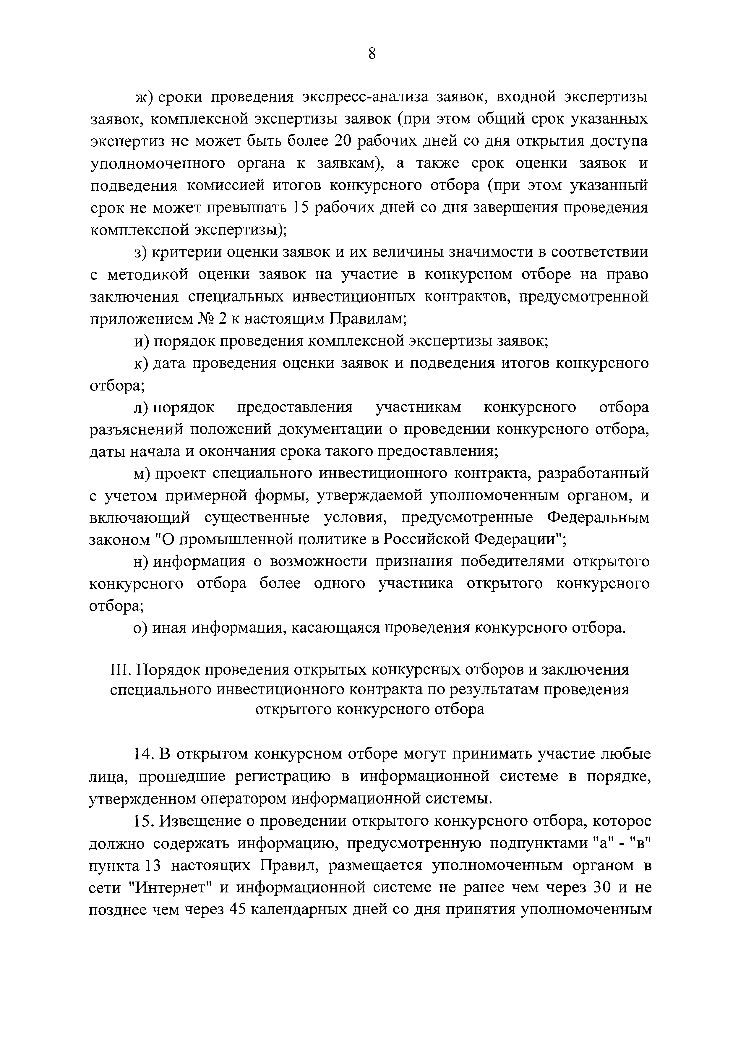| Оглавление: | I. Общие положения II. Порядок принятия решения о проведении конкурсного отбора на право заключения специального инвестиционного контракта и утверждения документации о проведении конкурсного отбора III. Порядок проведения открытых конкурсных отборов и заключения специального инвестиционного контракта по результатам проведения открытого конкурсного отбора IV. Порядок проведения закрытых конкурсных отборов и заключения специального инвестиционного контракта по результатам проведения закрытого конкурсного отбора V. Заключение специального инвестиционного контракта с единственным участником конкурсного отбора или по решению Президента Российской Федерации без проведения конкурсного отбора VI. Порядок изменения и расторжения специальных инвестиционных контрактов VII. Особенности заключения, изменения и прекращения действия специальных инвестиционных контрактов, в результате реализации которых иностранным инвестором или группой лиц устанавливается контроль над хозяйственным обществом, имеющим стратегическое значение для обороны страны и безопасности государства, и (или) приобретаются иные права в отношении такого общества, требующие предварительного согласования в соответствии с Федеральным законом "О порядке осуществления иностранных инвестиций в хозяйственные общества, имеющие стратегическое значение для обеспечения обороны страны и безопасности государства" Приложение № 1. Положение о порядке формирования и деятельности комиссий по заключению, изменению и расторжению специальных инвестиционных контрактов Приложение № 2. Методика оценки заявок на участие в конкурсном отборе на право заключения специальных инвестиционных контрактов Приложение № 3. Требования к оформлению и содержанию документов, направляемых в составе заявки участника конкурсного отбора на право заключения специальных инвестиционных контрактов и направляемых в рамках процедуры заключения специального инвестиционного контракта по решению Президента Российской Федерации Приложение. Форма плана мероприятий ("дорожной карты") по разработке и внедрению или внедрению технологии и серийному производству промышленной продукции в ходе реализации инвестиционного проекта Приложение № 4. Методика расчета совокупного объема расходов и недополученных доходов бюджетов бюджетной системы Российской Федерации, образующихся в связи с применением мер стимулирования деятельности в сфере промышленности в отношении инвестиционного проекта, реализуемого в соответствии со специальным инвестиционным контрактом |