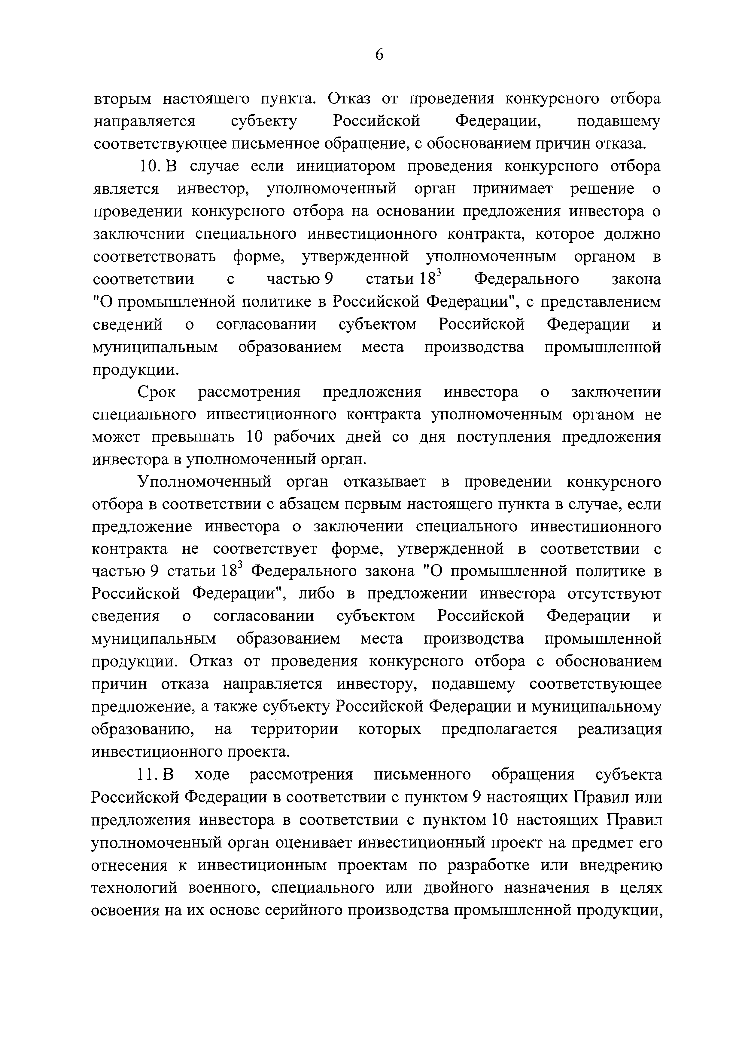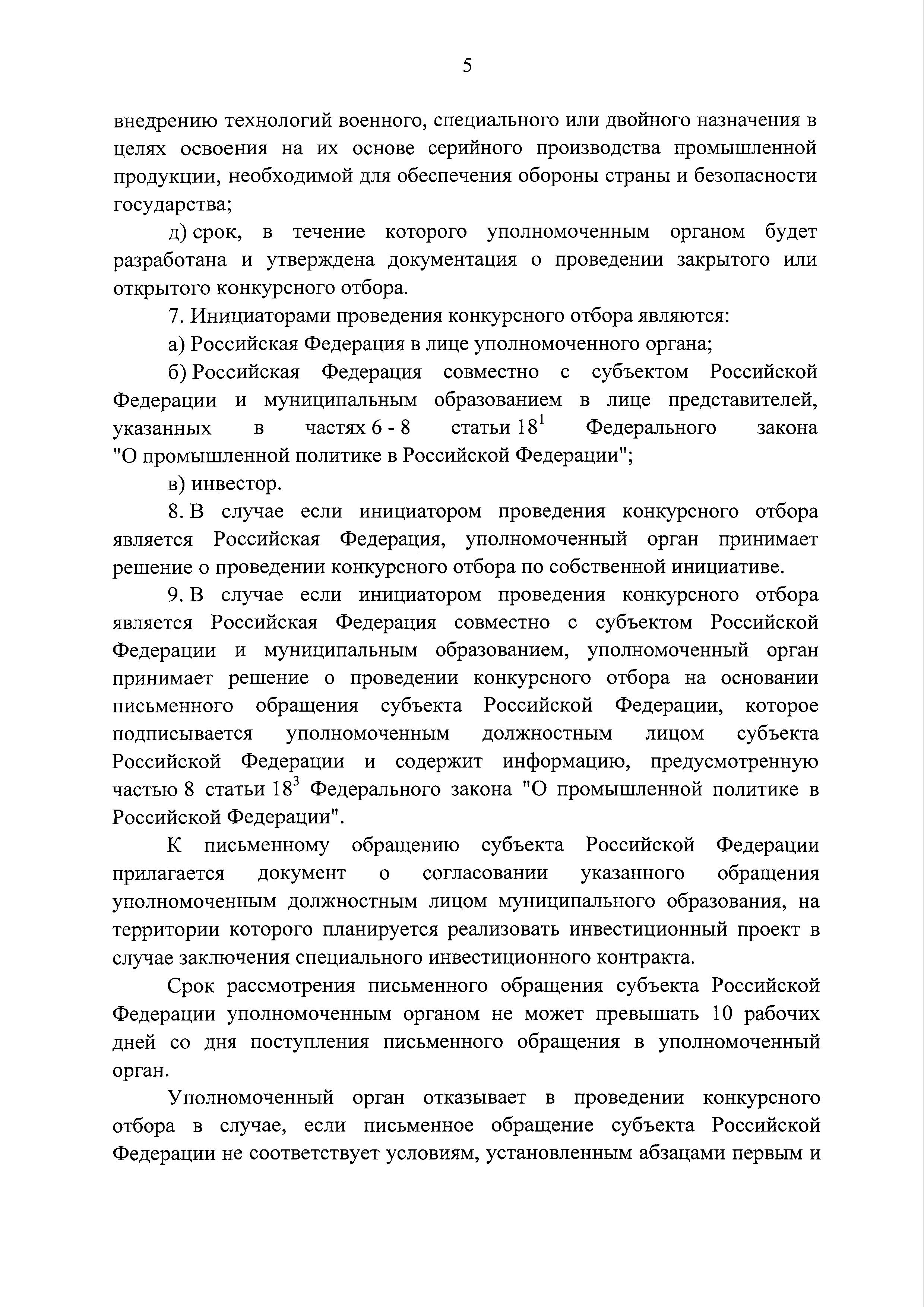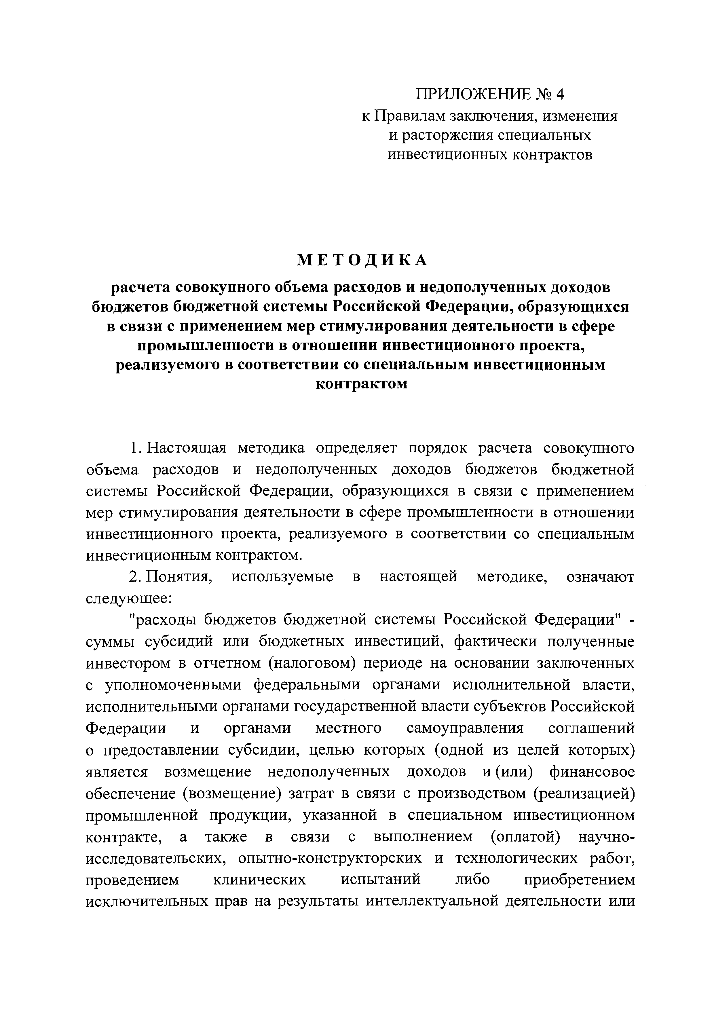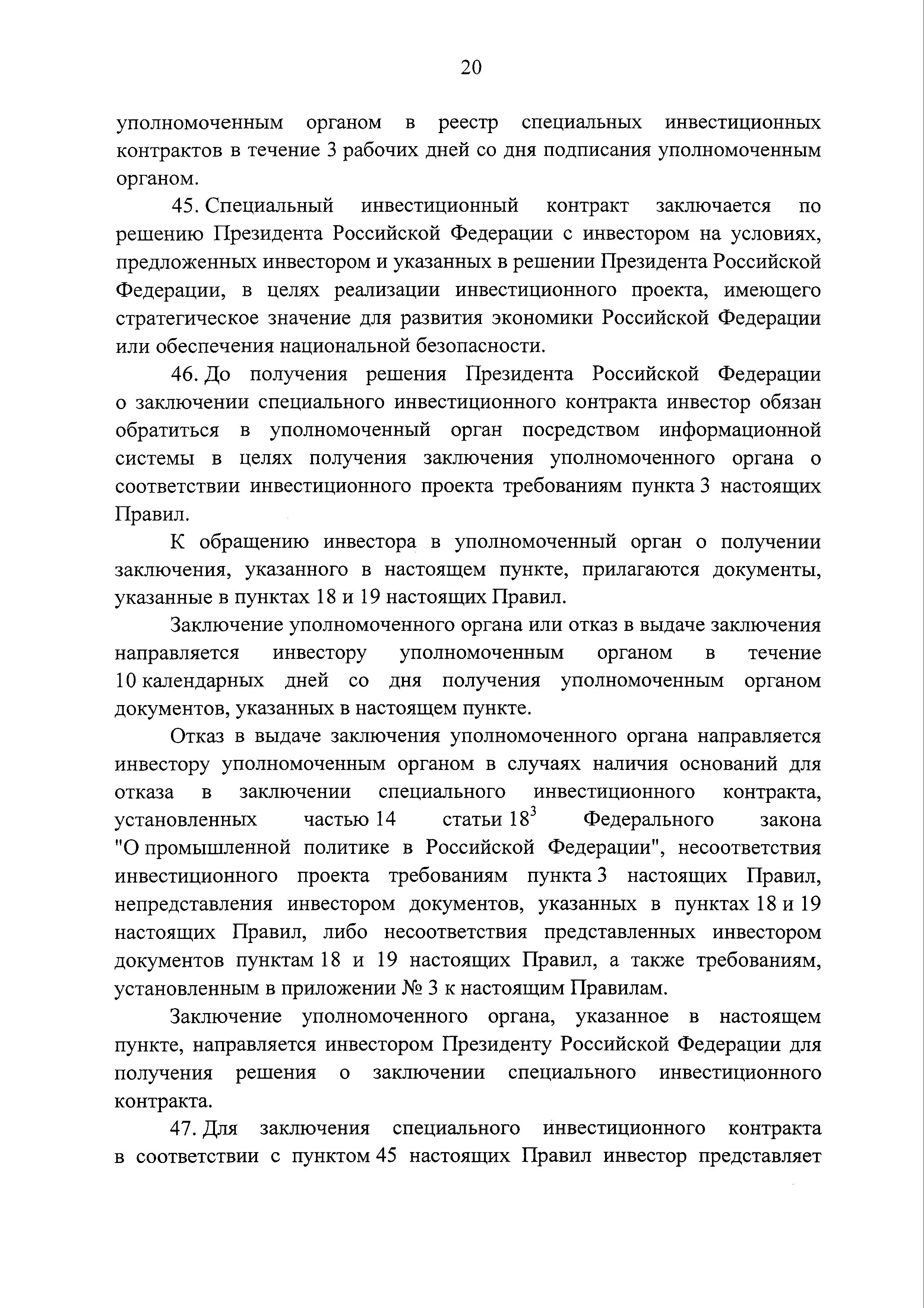 | Оглавление: | I. Общие положения II. Порядок принятия решения о проведении конкурсного отбора на право заключения специального инвестиционного контракта и утверждения документации о проведении конкурсного отбора III. Порядок проведения открытых конкурсных отборов и заключения специального инвестиционного контракта по результатам проведения открытого конкурсного отбора IV. Порядок проведения закрытых конкурсных отборов и заключения специального инвестиционного контракта по результатам проведения закрытого конкурсного отбора V. Заключение специального инвестиционного контракта с единственным участником конкурсного отбора или по решению Президента Российской Федерации без проведения конкурсного отбора VI. Порядок изменения и расторжения специальных инвестиционных контрактов VII. Особенности заключения, изменения и прекращения действия специальных инвестиционных контрактов, в результате реализации которых иностранным инвестором или группой лиц устанавливается контроль над хозяйственным обществом, имеющим стратегическое значение для обороны страны и безопасности государства, и (или) приобретаются иные права в отношении такого общества, требующие предварительного согласования в соответствии с Федеральным законом "О порядке осуществления иностранных инвестиций в хозяйственные общества, имеющие стратегическое значение для обеспечения обороны страны и безопасности государства" Приложение № 1. Положение о порядке формирования и деятельности комиссий по заключению, изменению и расторжению специальных инвестиционных контрактов Приложение № 2. Методика оценки заявок на участие в конкурсном отборе на право заключения специальных инвестиционных контрактов Приложение № 3. Требования к оформлению и содержанию документов, направляемых в составе заявки участника конкурсного отбора на право заключения специальных инвестиционных контрактов и направляемых в рамках процедуры заключения специального инвестиционного контракта по решению Президента Российской Федерации Приложение. Форма плана мероприятий ("дорожной карты") по разработке и внедрению или внедрению технологии и серийному производству промышленной продукции в ходе реализации инвестиционного проекта Приложение № 4. Методика расчета совокупного объема расходов и недополученных доходов бюджетов бюджетной системы Российской Федерации, образующихся в связи с применением мер стимулирования деятельности в сфере промышленности в отношении инвестиционного проекта, реализуемого в соответствии со специальным инвестиционным контрактом |