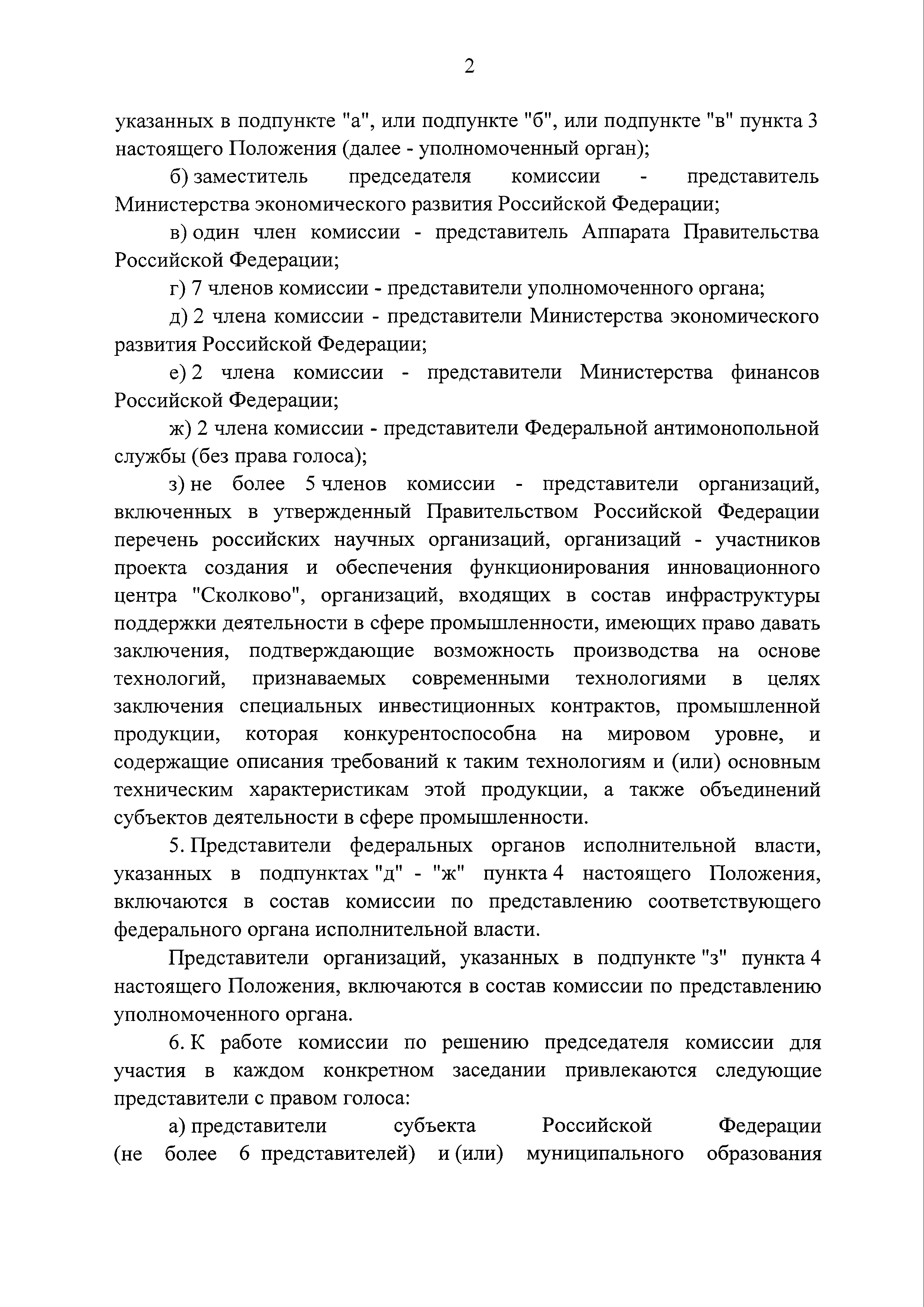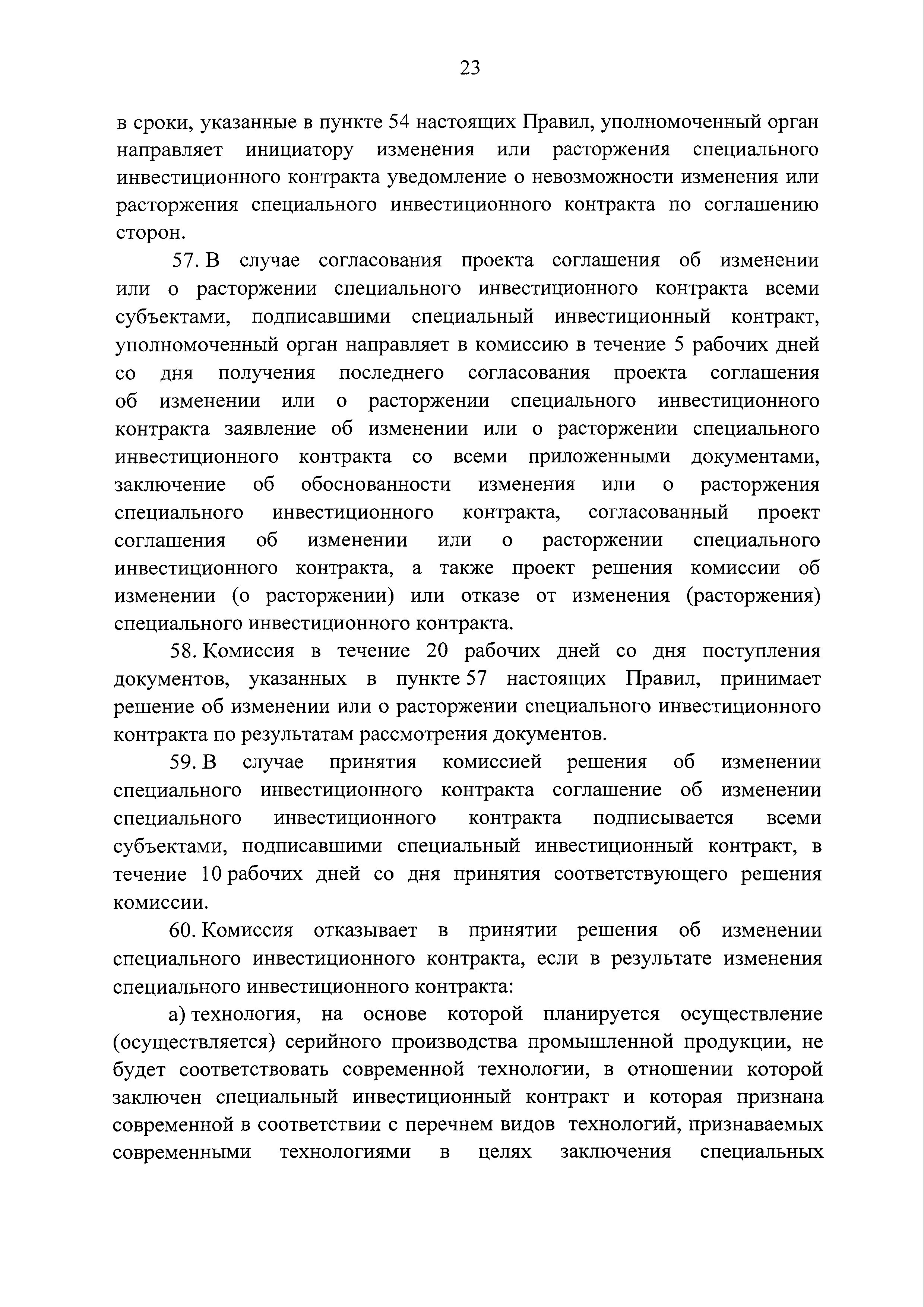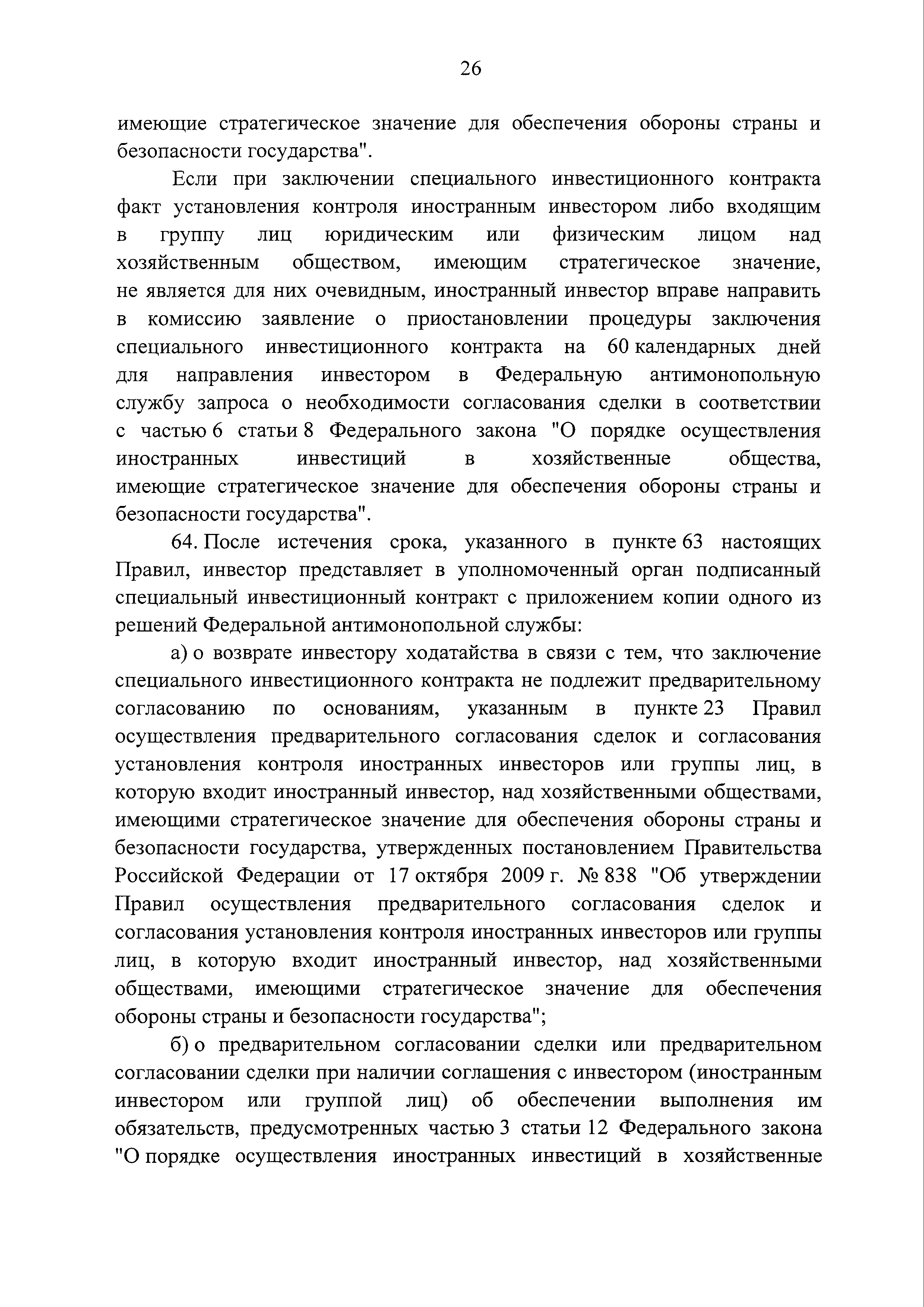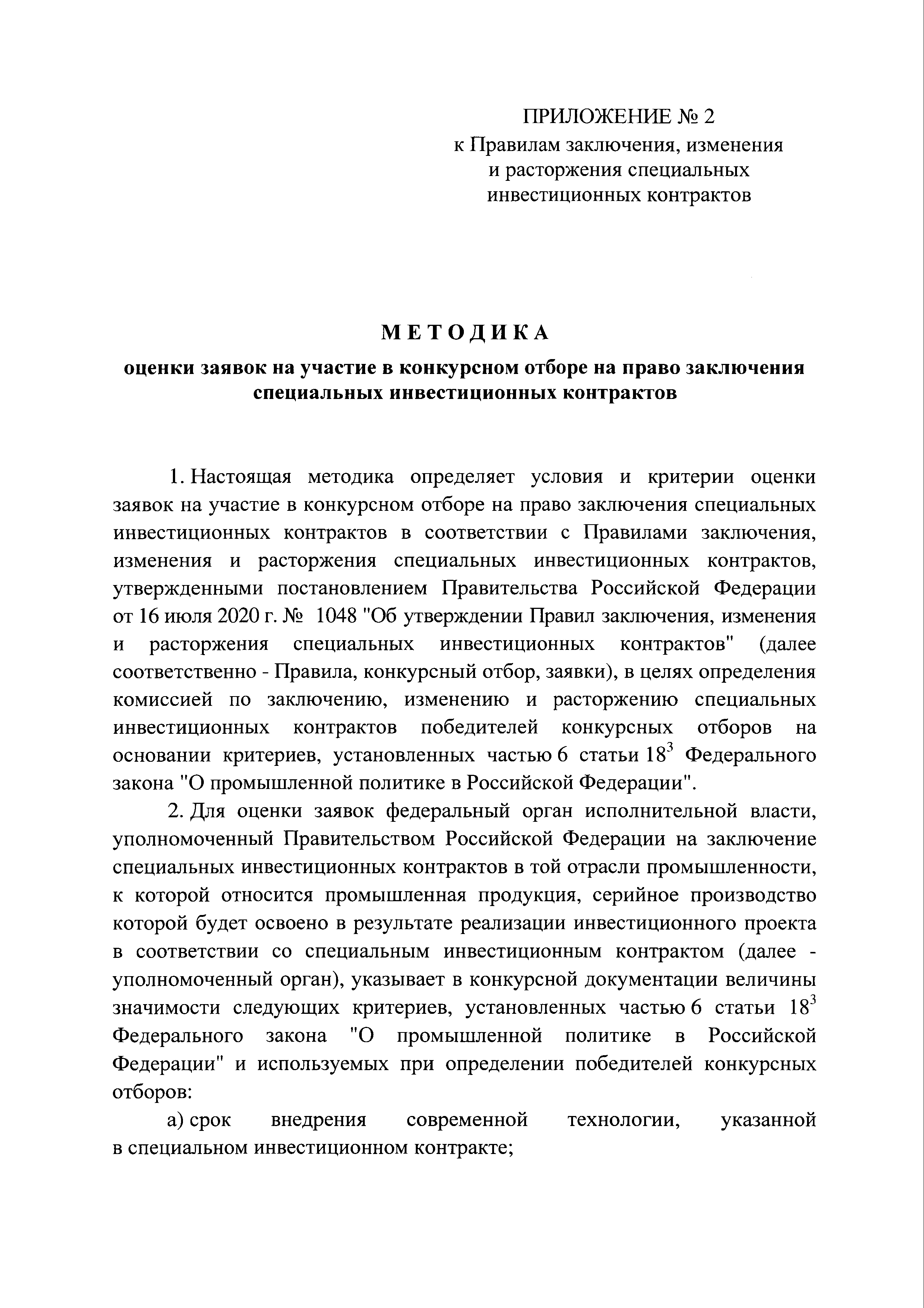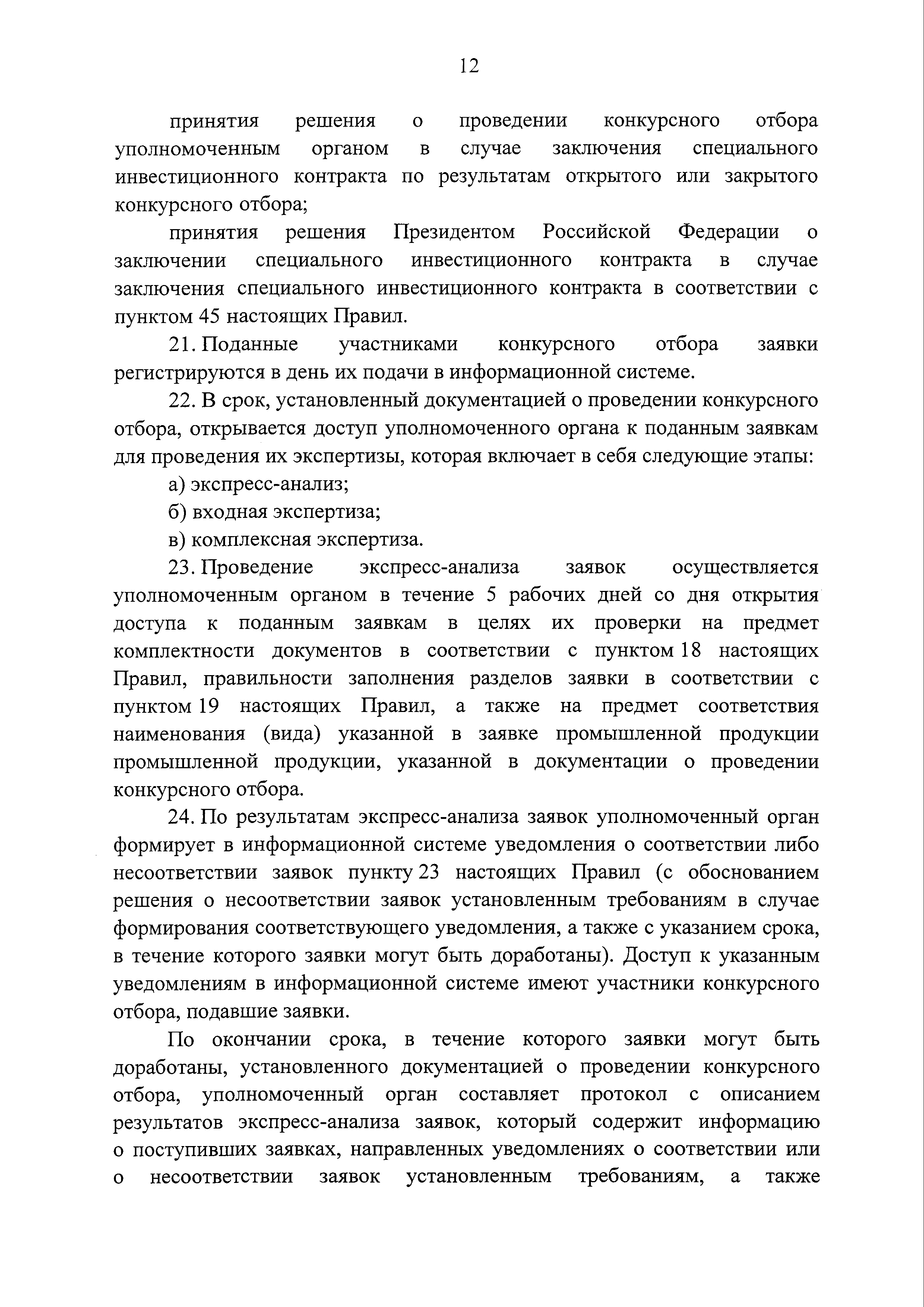 | Оглавление: | I. Общие положения II. Порядок принятия решения о проведении конкурсного отбора на право заключения специального инвестиционного контракта и утверждения документации о проведении конкурсного отбора III. Порядок проведения открытых конкурсных отборов и заключения специального инвестиционного контракта по результатам проведения открытого конкурсного отбора IV. Порядок проведения закрытых конкурсных отборов и заключения специального инвестиционного контракта по результатам проведения закрытого конкурсного отбора V. Заключение специального инвестиционного контракта с единственным участником конкурсного отбора или по решению Президента Российской Федерации без проведения конкурсного отбора VI. Порядок изменения и расторжения специальных инвестиционных контрактов VII. Особенности заключения, изменения и прекращения действия специальных инвестиционных контрактов, в результате реализации которых иностранным инвестором или группой лиц устанавливается контроль над хозяйственным обществом, имеющим стратегическое значение для обороны страны и безопасности государства, и (или) приобретаются иные права в отношении такого общества, требующие предварительного согласования в соответствии с Федеральным законом "О порядке осуществления иностранных инвестиций в хозяйственные общества, имеющие стратегическое значение для обеспечения обороны страны и безопасности государства" Приложение № 1. Положение о порядке формирования и деятельности комиссий по заключению, изменению и расторжению специальных инвестиционных контрактов Приложение № 2. Методика оценки заявок на участие в конкурсном отборе на право заключения специальных инвестиционных контрактов Приложение № 3. Требования к оформлению и содержанию документов, направляемых в составе заявки участника конкурсного отбора на право заключения специальных инвестиционных контрактов и направляемых в рамках процедуры заключения специального инвестиционного контракта по решению Президента Российской Федерации Приложение. Форма плана мероприятий ("дорожной карты") по разработке и внедрению или внедрению технологии и серийному производству промышленной продукции в ходе реализации инвестиционного проекта Приложение № 4. Методика расчета совокупного объема расходов и недополученных доходов бюджетов бюджетной системы Российской Федерации, образующихся в связи с применением мер стимулирования деятельности в сфере промышленности в отношении инвестиционного проекта, реализуемого в соответствии со специальным инвестиционным контрактом |