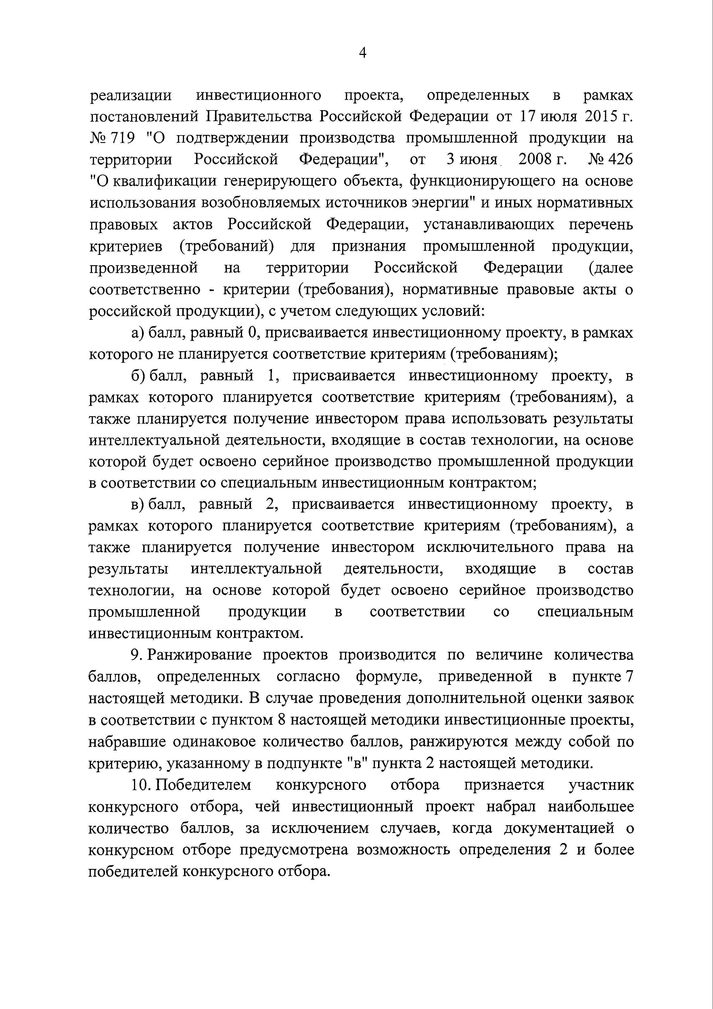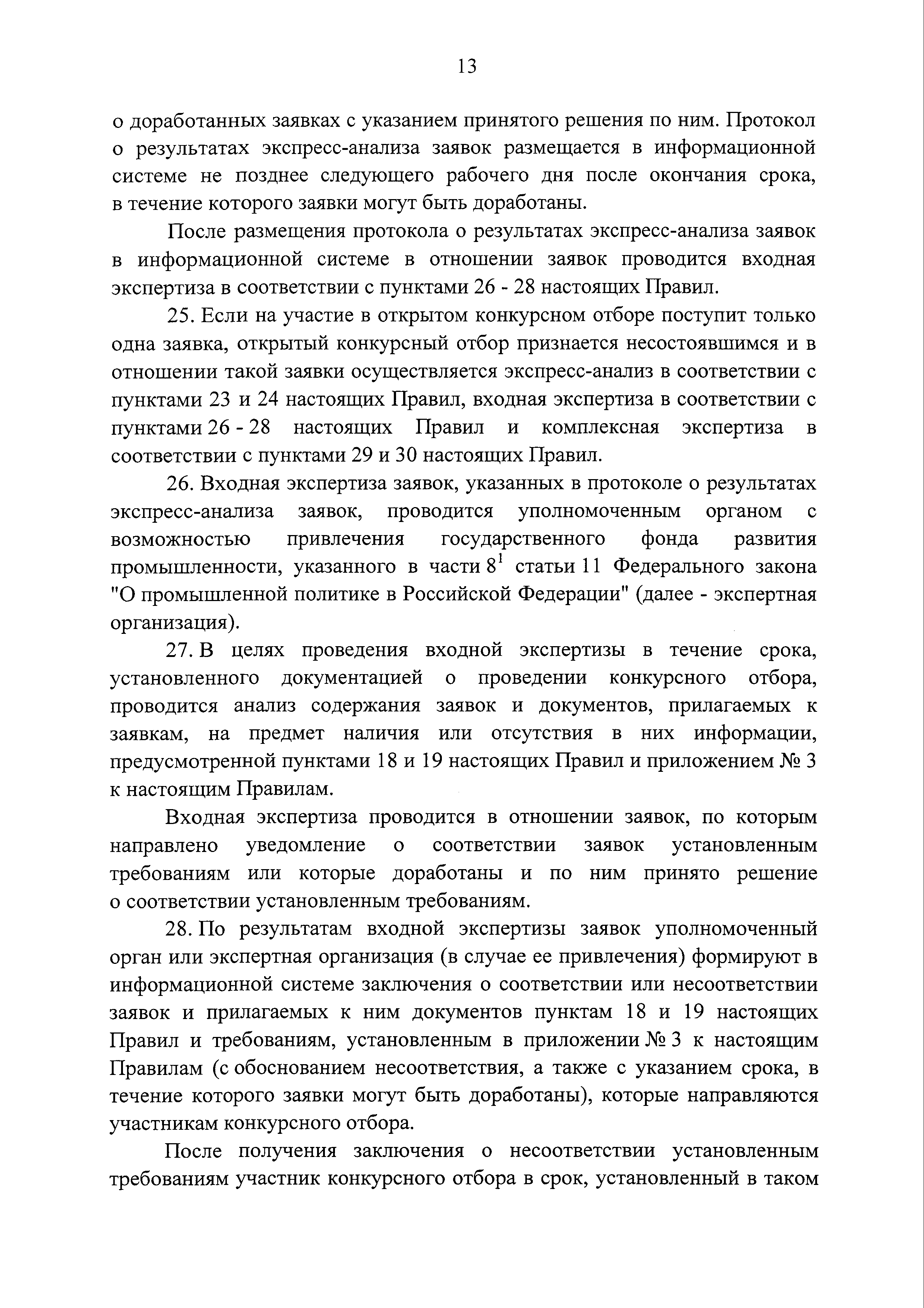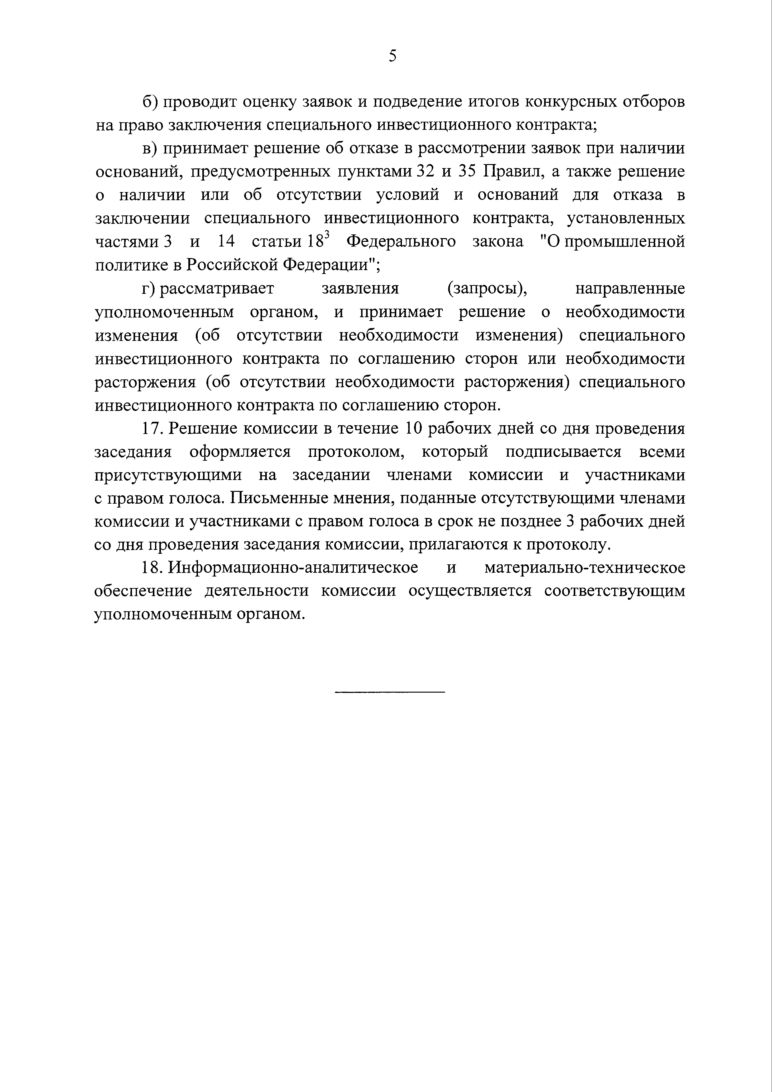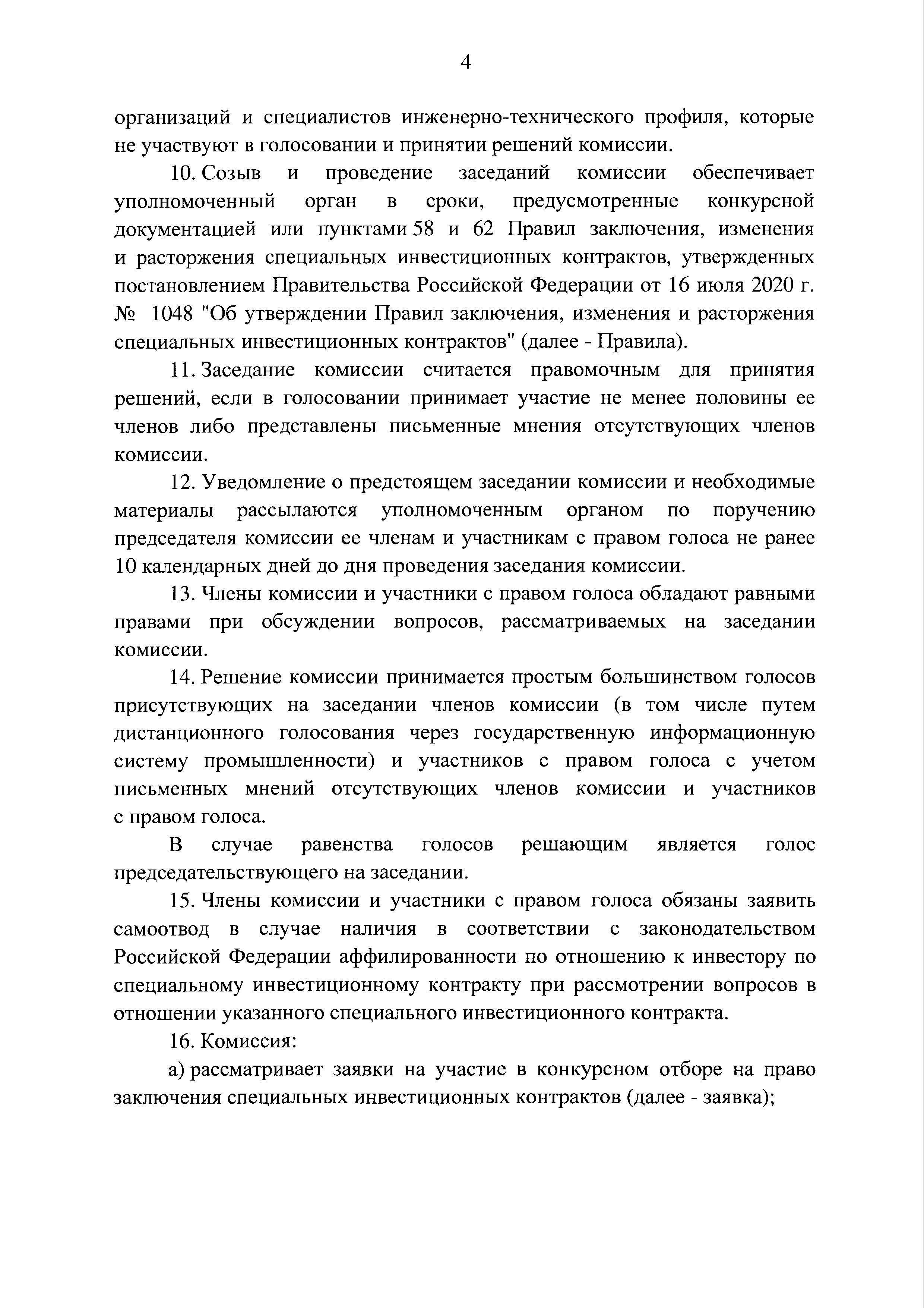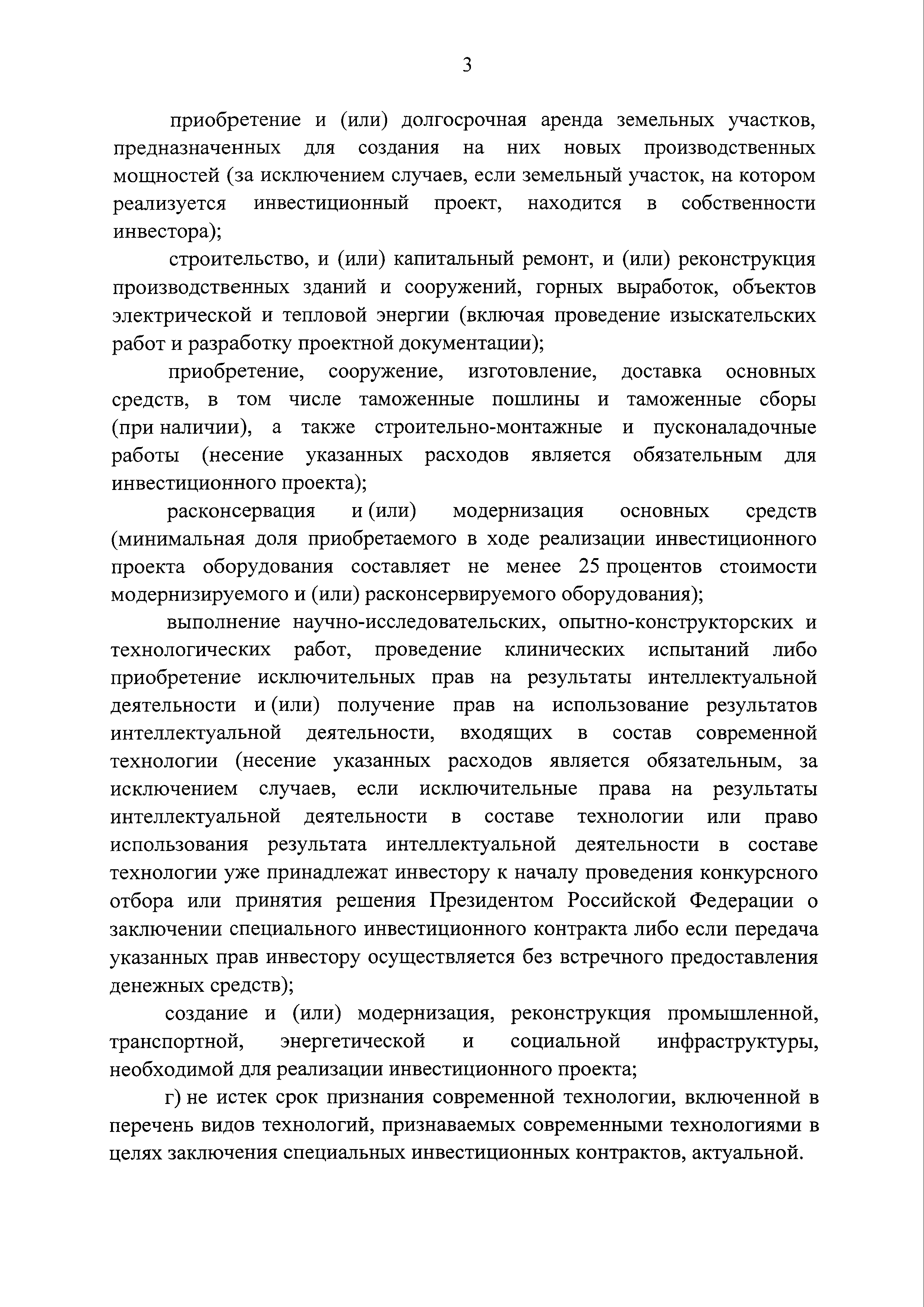 | Оглавление: | I. Общие положения II. Порядок принятия решения о проведении конкурсного отбора на право заключения специального инвестиционного контракта и утверждения документации о проведении конкурсного отбора III. Порядок проведения открытых конкурсных отборов и заключения специального инвестиционного контракта по результатам проведения открытого конкурсного отбора IV. Порядок проведения закрытых конкурсных отборов и заключения специального инвестиционного контракта по результатам проведения закрытого конкурсного отбора V. Заключение специального инвестиционного контракта с единственным участником конкурсного отбора или по решению Президента Российской Федерации без проведения конкурсного отбора VI. Порядок изменения и расторжения специальных инвестиционных контрактов VII. Особенности заключения, изменения и прекращения действия специальных инвестиционных контрактов, в результате реализации которых иностранным инвестором или группой лиц устанавливается контроль над хозяйственным обществом, имеющим стратегическое значение для обороны страны и безопасности государства, и (или) приобретаются иные права в отношении такого общества, требующие предварительного согласования в соответствии с Федеральным законом "О порядке осуществления иностранных инвестиций в хозяйственные общества, имеющие стратегическое значение для обеспечения обороны страны и безопасности государства" Приложение № 1. Положение о порядке формирования и деятельности комиссий по заключению, изменению и расторжению специальных инвестиционных контрактов Приложение № 2. Методика оценки заявок на участие в конкурсном отборе на право заключения специальных инвестиционных контрактов Приложение № 3. Требования к оформлению и содержанию документов, направляемых в составе заявки участника конкурсного отбора на право заключения специальных инвестиционных контрактов и направляемых в рамках процедуры заключения специального инвестиционного контракта по решению Президента Российской Федерации Приложение. Форма плана мероприятий ("дорожной карты") по разработке и внедрению или внедрению технологии и серийному производству промышленной продукции в ходе реализации инвестиционного проекта Приложение № 4. Методика расчета совокупного объема расходов и недополученных доходов бюджетов бюджетной системы Российской Федерации, образующихся в связи с применением мер стимулирования деятельности в сфере промышленности в отношении инвестиционного проекта, реализуемого в соответствии со специальным инвестиционным контрактом |