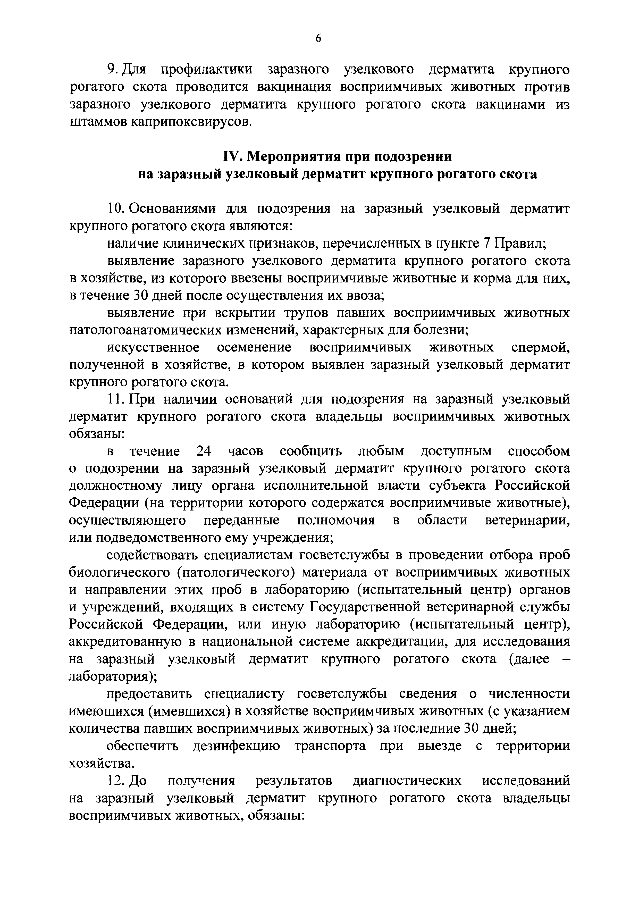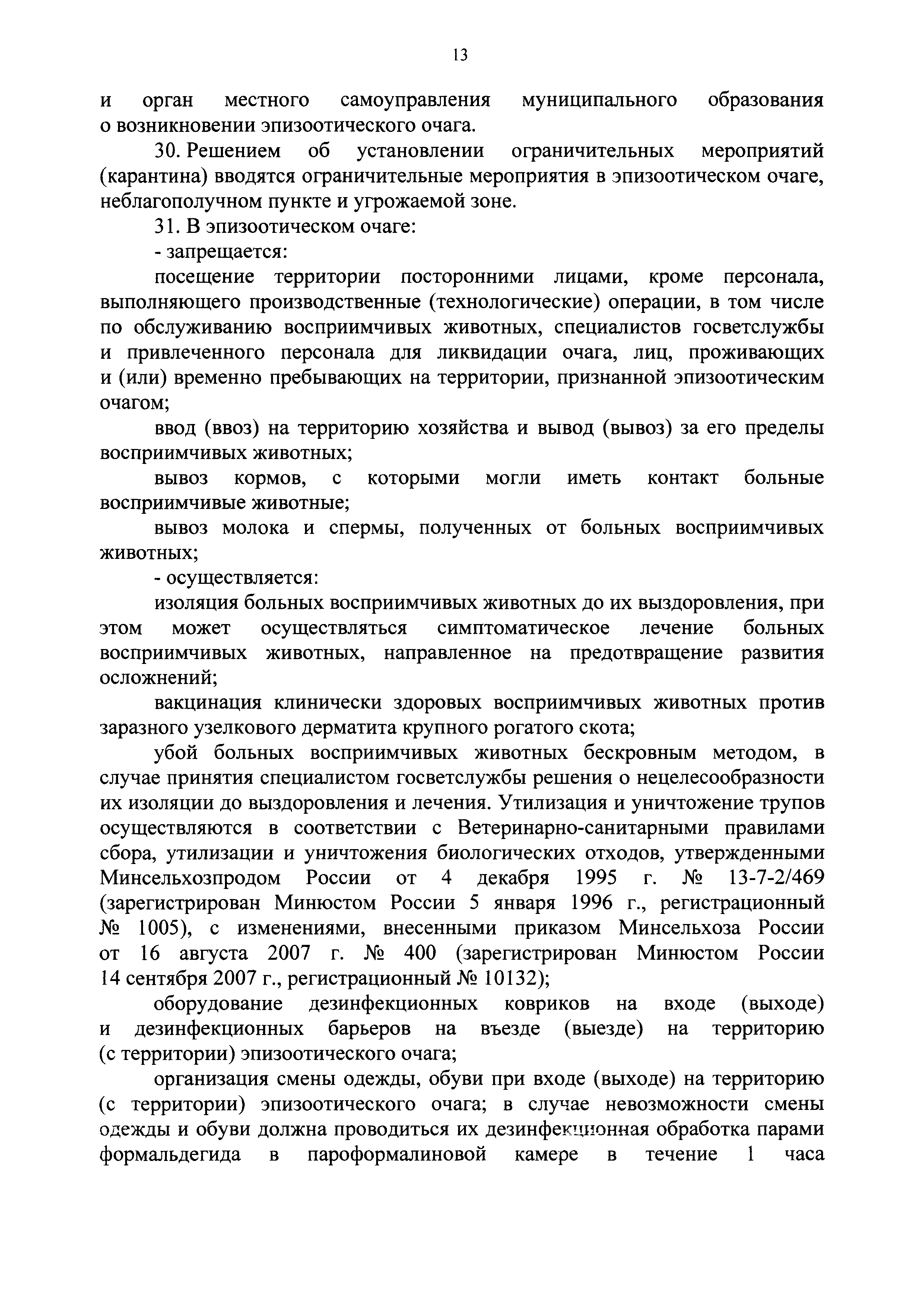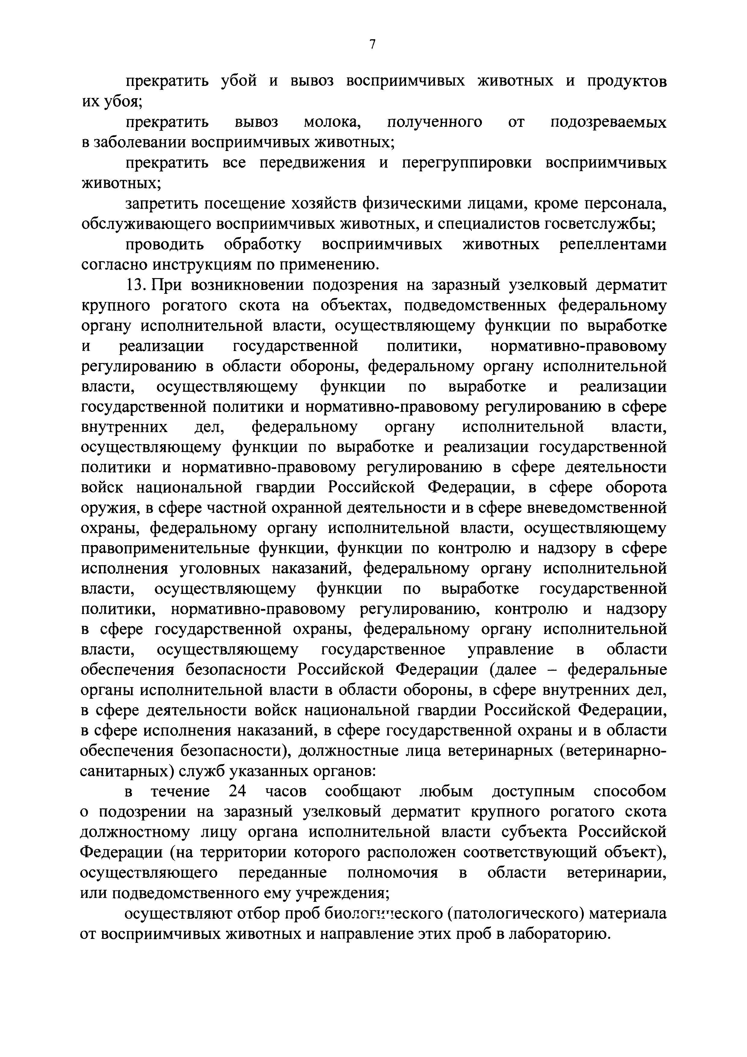 Ветеринарные правила осуществления профилактических, диагностических, лечебных, ограничительных и иных мероприятий, установления и отмены карантина и иных ограничений, направленных на предотвращение распространения и ликвидацию очагов заразного узелкового дерматита крупного рогатого скота| Статус: | действует | | Название рус.: | Ветеринарные правила осуществления профилактических, диагностических, лечебных, ограничительных и иных мероприятий, установления и отмены карантина и иных ограничений, направленных на предотвращение распространения и ликвидацию очагов заразного узелкового дерматита крупного рогатого скота | | Дата добавления в базу: | 01.01.2021 | | Дата актуализации: | 01.01.2021 | | Оглавление: | I. Область применения II. Общая характеристика заразного узелкового дерматита крупного рогатого скота III. Профилактические мероприятия IV. Мероприятия при подозрении на заразный узелковый дерматит крупного рогатого скота V. Диагностические мероприятия VI. Установление карантина, ограничительные, лечебные и иные мероприятия, направленные на ликвидацию очагов заразного узелкового дерматита крупного рогатого скота, а также на предотвращение его распространения VII. Отмена карантина и последующие ограничения | | Утверждён: | 05.04.2017 Минсельхоз России (Russian Federation Minselkhoz 166)
