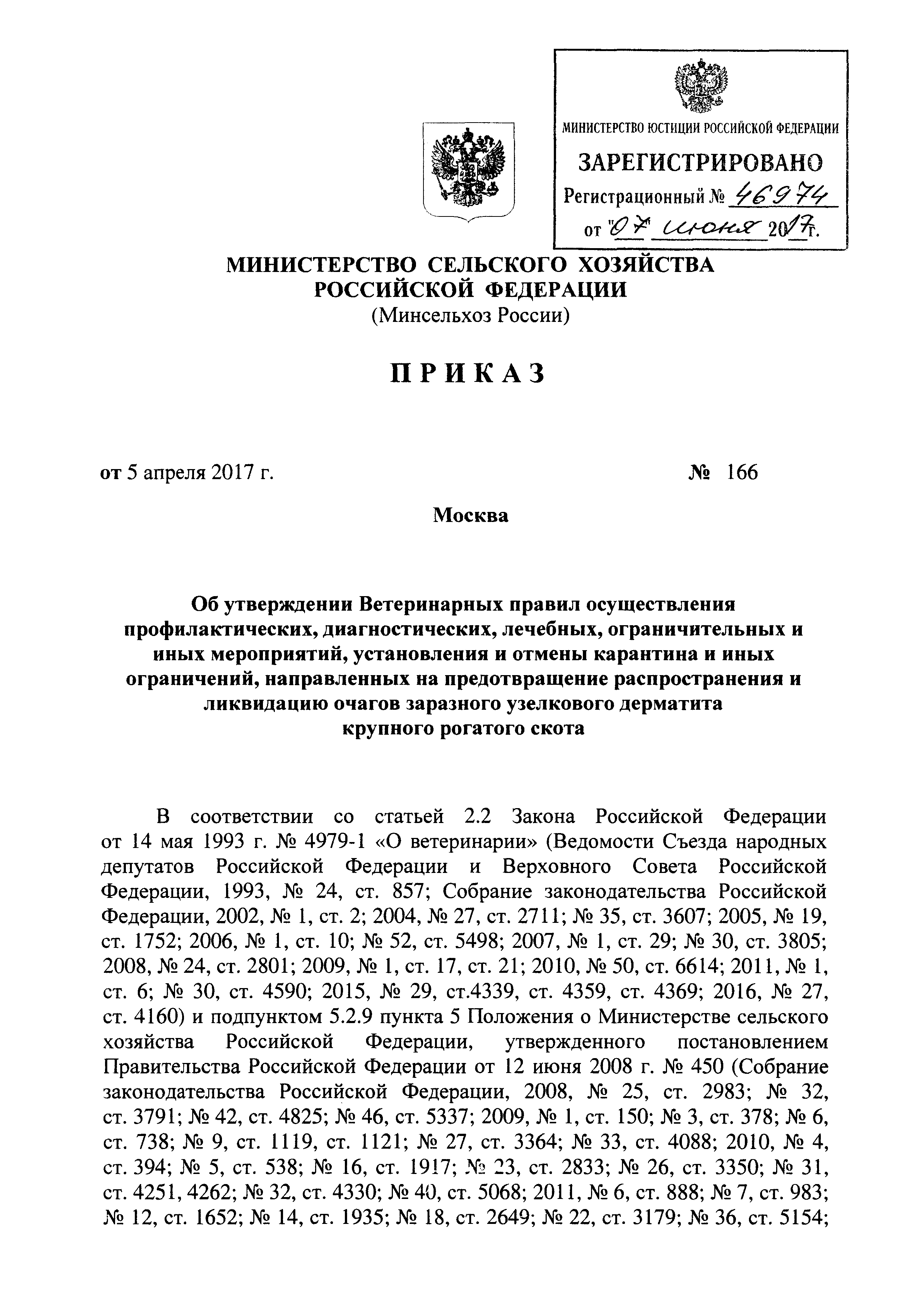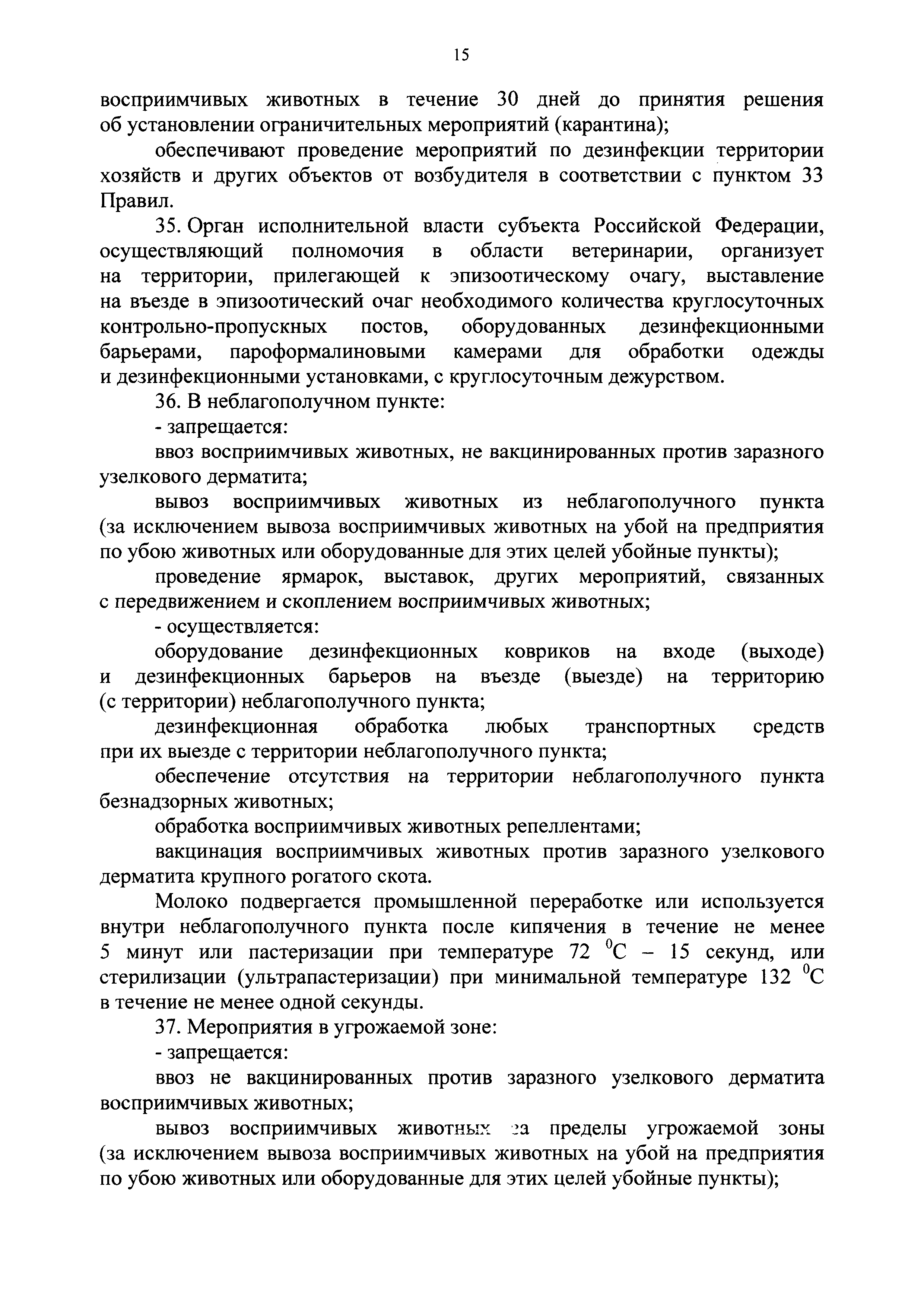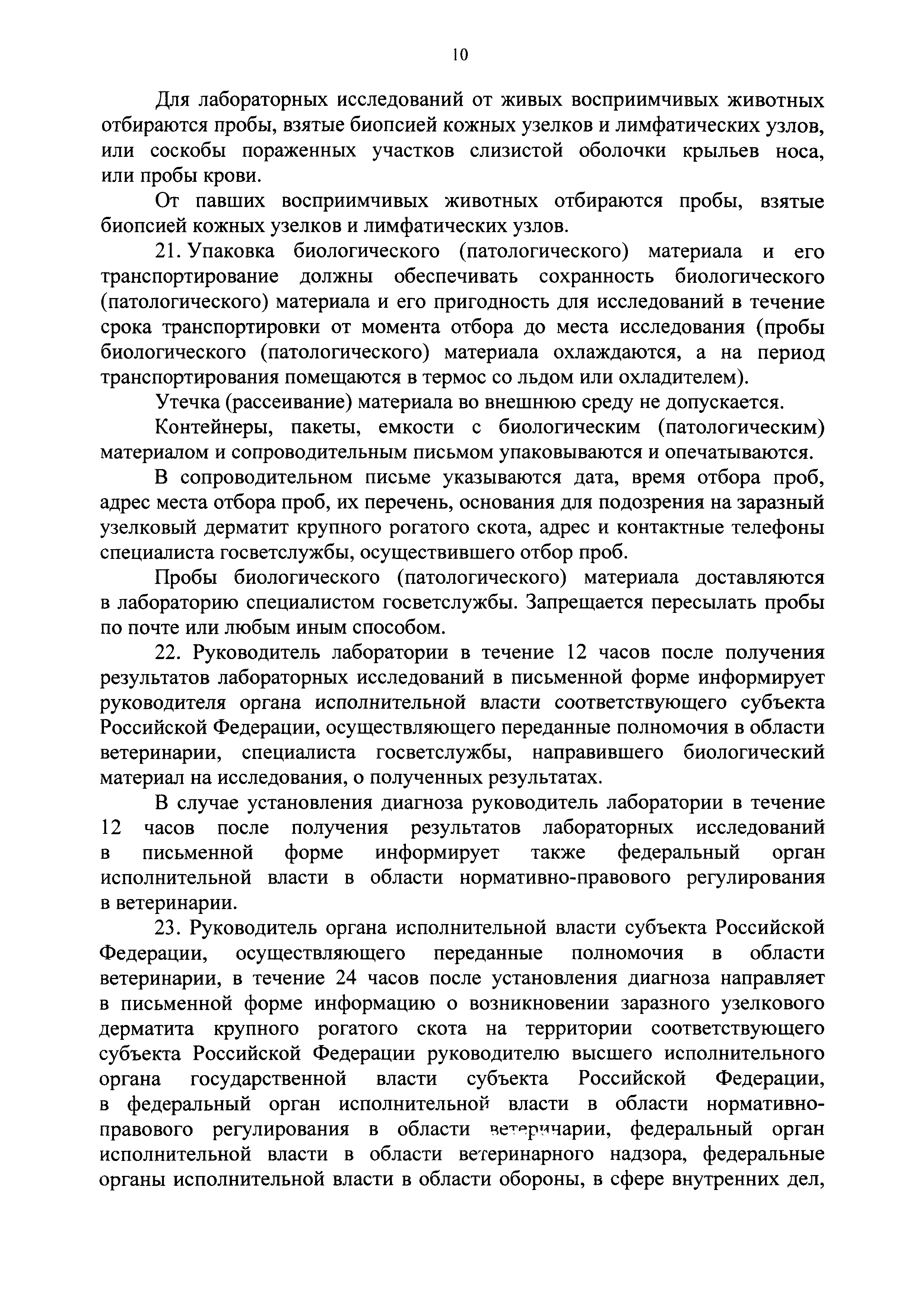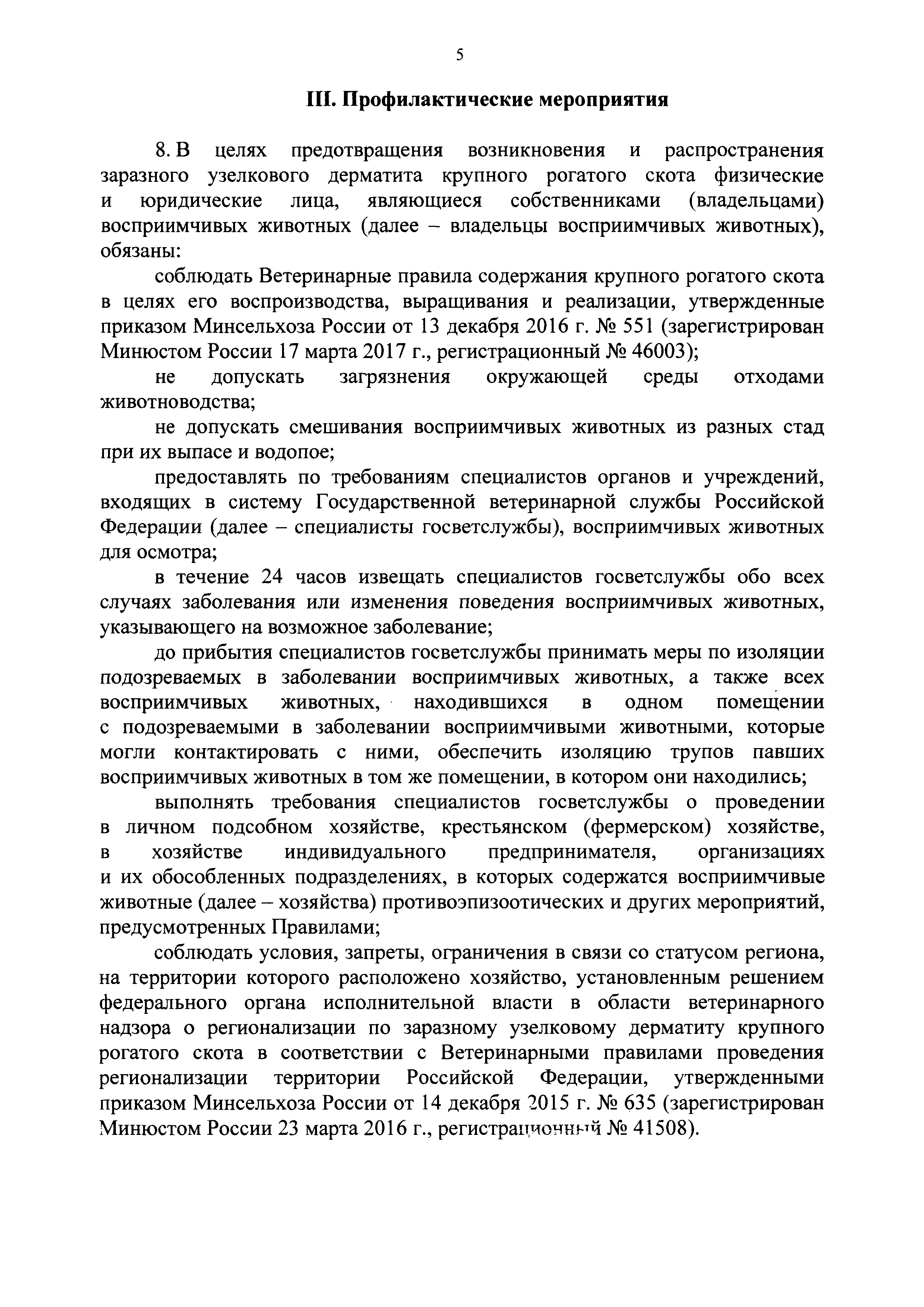 Ветеринарные правила осуществления профилактических, диагностических, лечебных, ограничительных и иных мероприятий, установления и отмены карантина и иных ограничений, направленных на предотвращение распространения и ликвидацию очагов заразного узелкового дерматита крупного рогатого скота| Статус: | действует | | Название рус.: | Ветеринарные правила осуществления профилактических, диагностических, лечебных, ограничительных и иных мероприятий, установления и отмены карантина и иных ограничений, направленных на предотвращение распространения и ликвидацию очагов заразного узелкового дерматита крупного рогатого скота | | Дата добавления в базу: | 01.01.2021 | | Дата актуализации: | 01.01.2021 | | Оглавление: | I. Область применения II. Общая характеристика заразного узелкового дерматита крупного рогатого скота III. Профилактические мероприятия IV. Мероприятия при подозрении на заразный узелковый дерматит крупного рогатого скота V. Диагностические мероприятия VI. Установление карантина, ограничительные, лечебные и иные мероприятия, направленные на ликвидацию очагов заразного узелкового дерматита крупного рогатого скота, а также на предотвращение его распространения VII. Отмена карантина и последующие ограничения | | Утверждён: | 05.04.2017 Минсельхоз России (Russian Federation Minselkhoz 166)