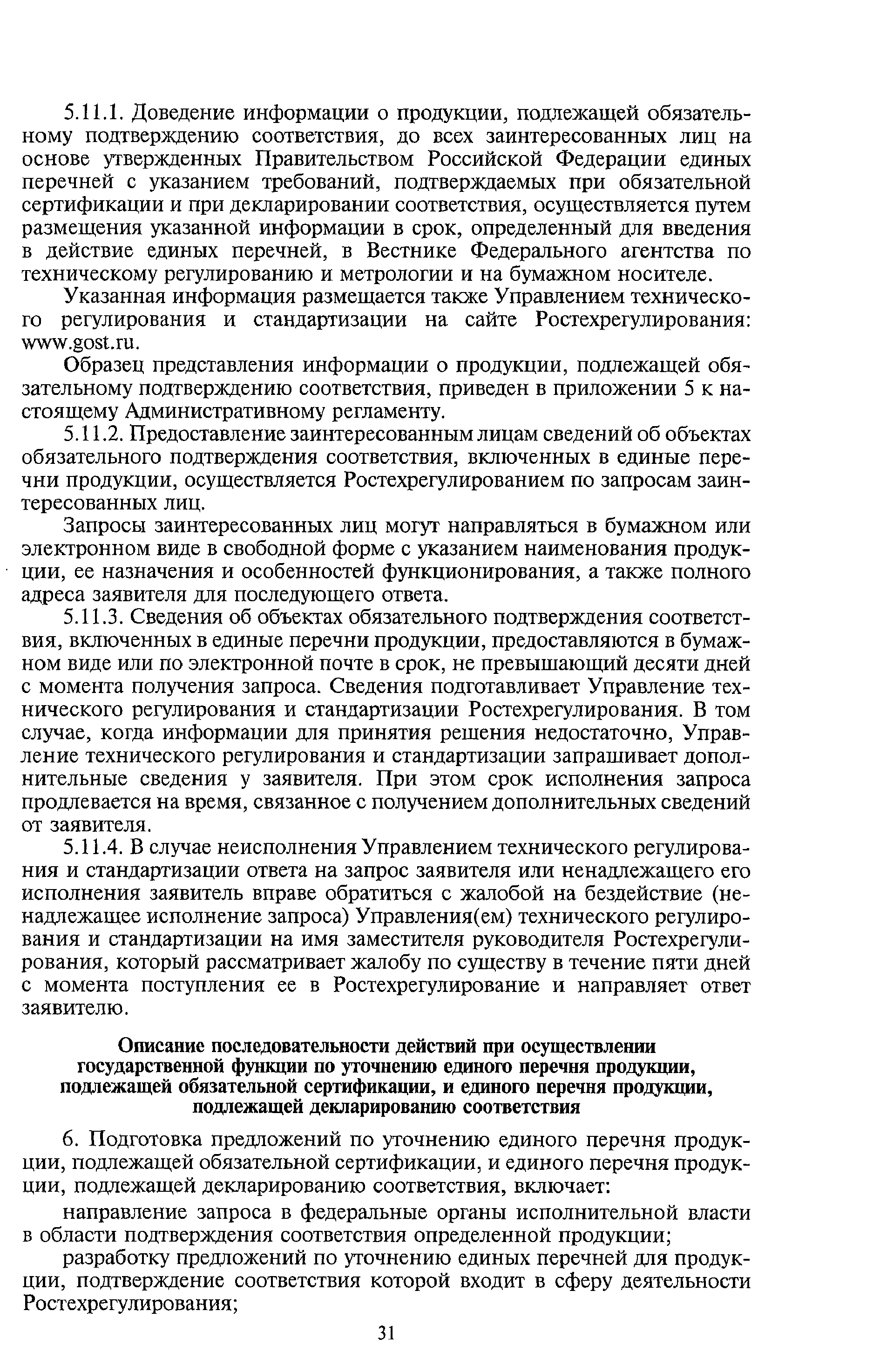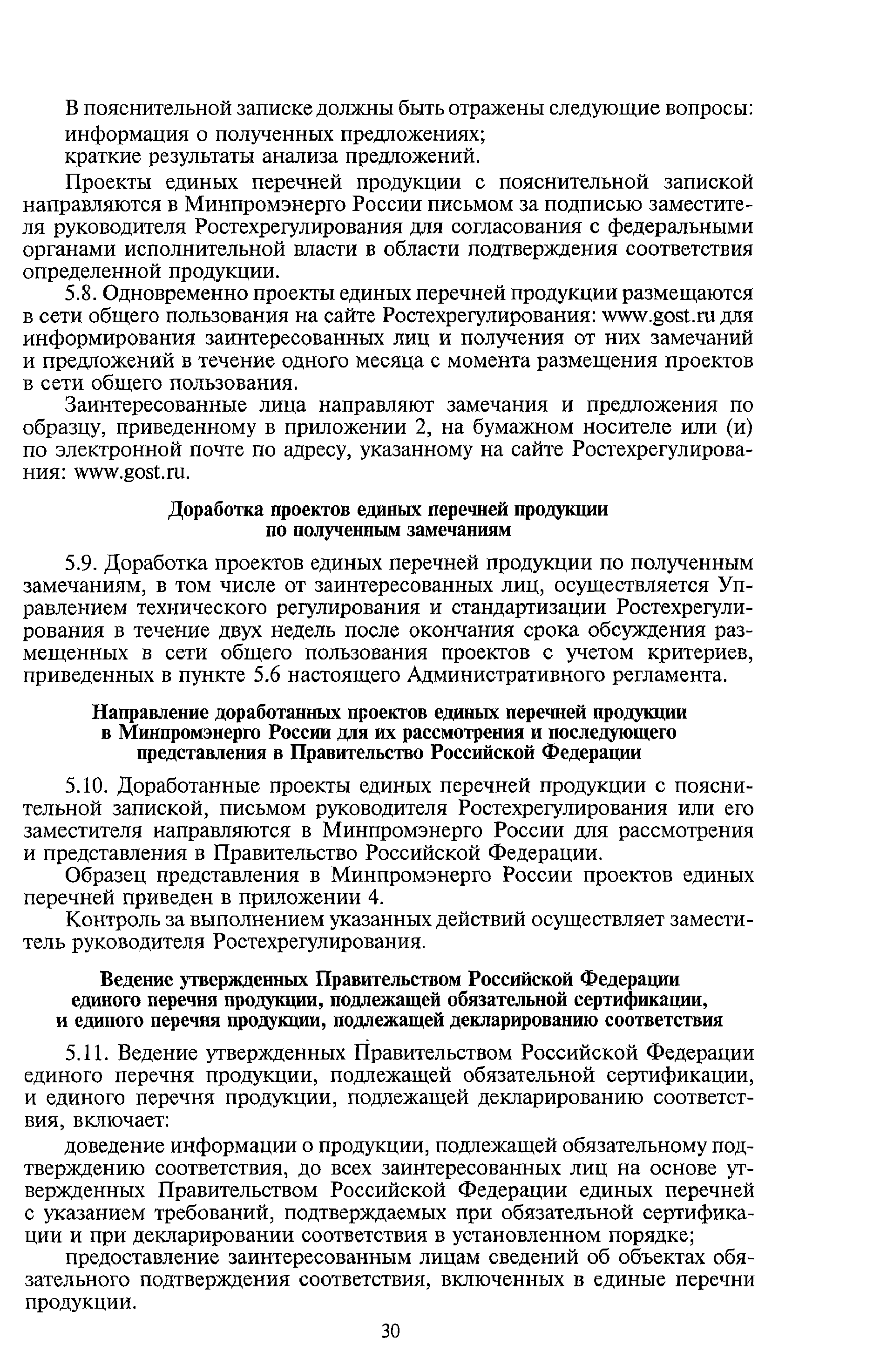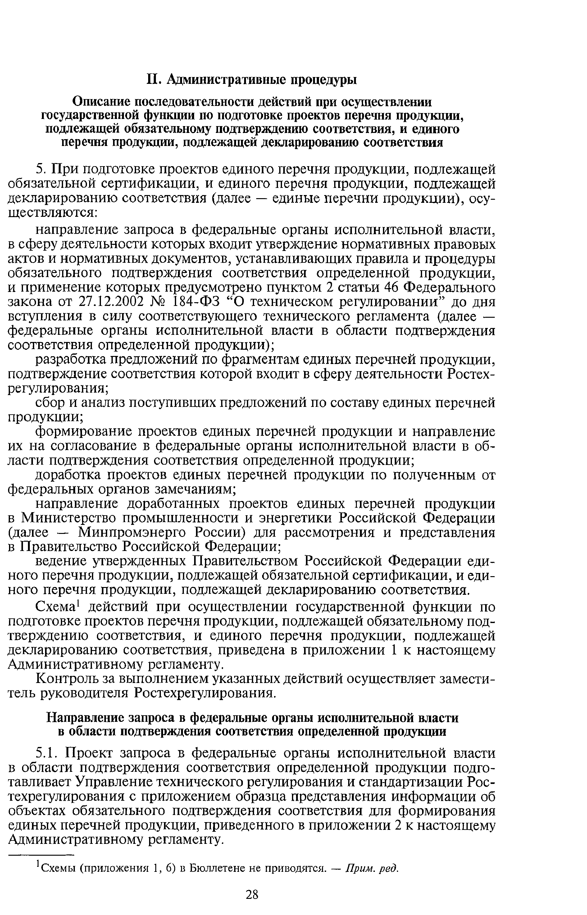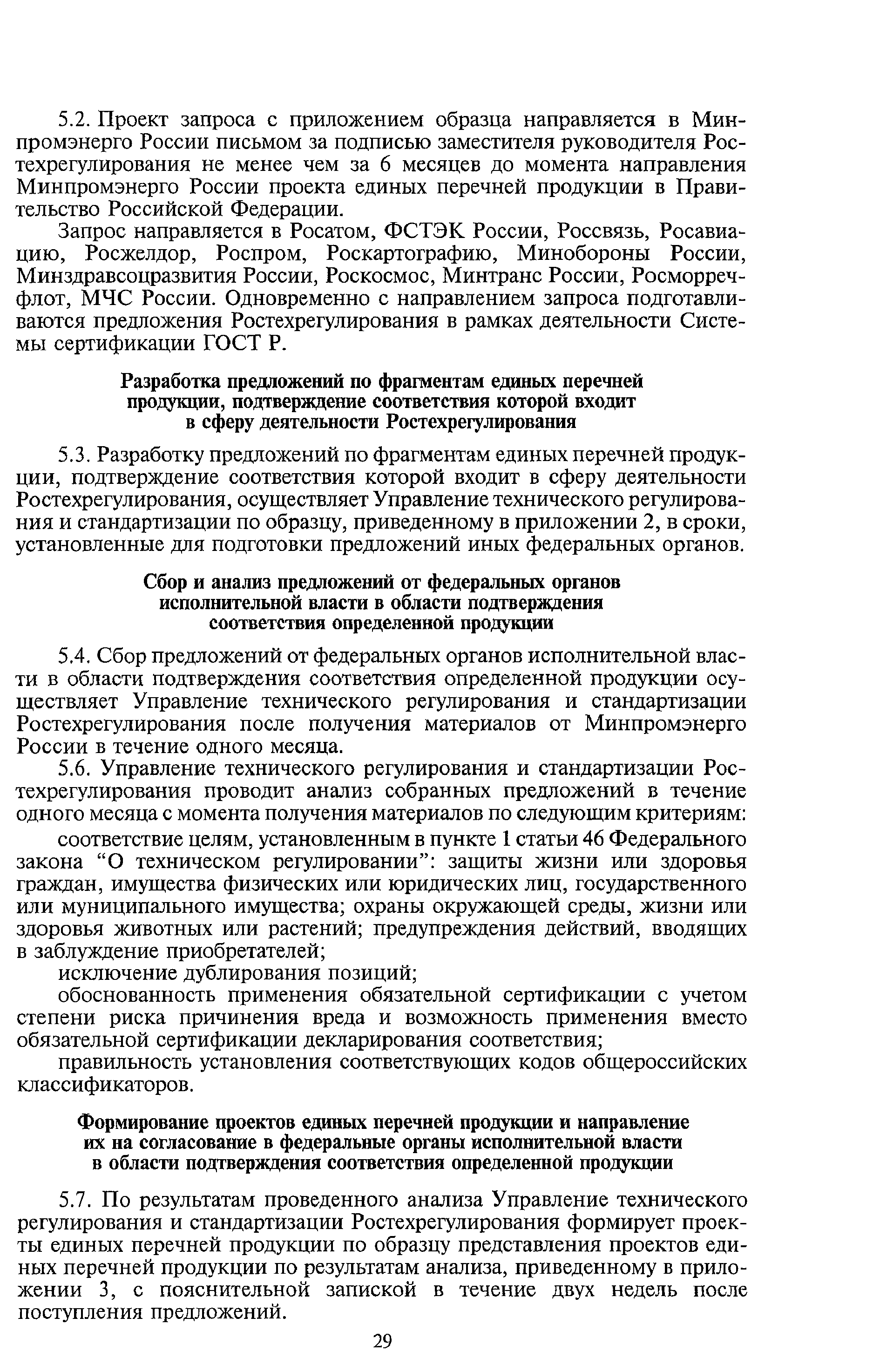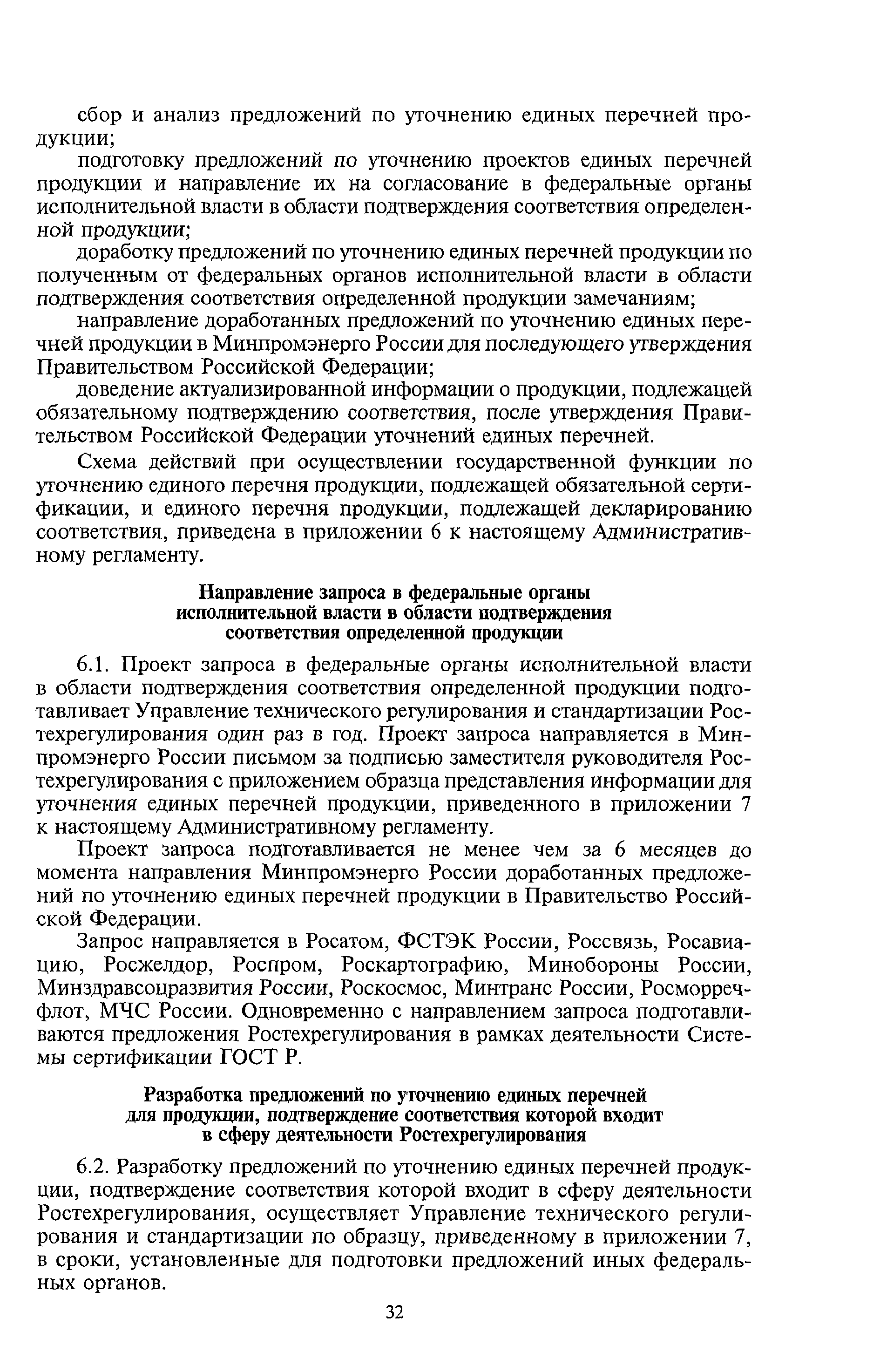 | Оглавление: | I. Общие положения II. Административные процедуры Приложение 1. Схема действий при осуществлении государственной функции по подготовке проектов перечня продукции, подлежащей обязательному подтверждению соответствия, и единого перечня продукции, подлежащей декларированию соответствия Приложение 2. Образец представления информации об объектах обязательного подтверждения соответствия для формирования единых перечней продукции Приложение 3. Образец представления проектов единых перечней продукции по результатам анализа Приложение 4. Образец представления в Минпроэнерго РФ проектов единых перечней продукции Приложение 5. Образец представления информации о продукции, подлежащей обязательному подтверждению соответствия Приложение 6. Схема действий при осуществлении государственной функции по уточнению перечня продукции, подлежащей обязательной сертификации, и единого перечня продукции, подлежащей декларированию соответствия Приложение 7. Образец представления информации для уточнения единых перечней продукции Приложение 8. Образец представления проекта предложений по уточнению единых перечней продукции |
