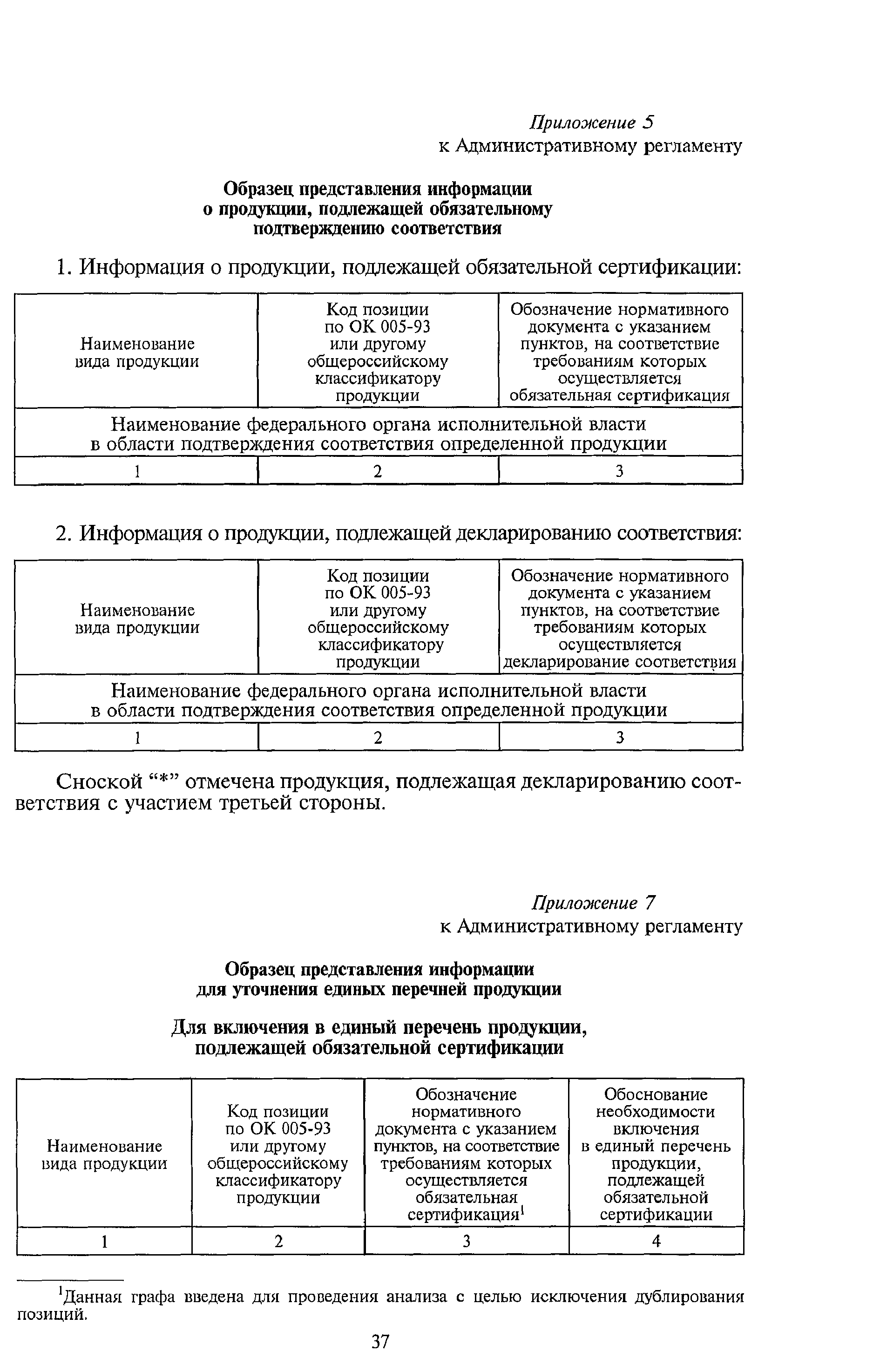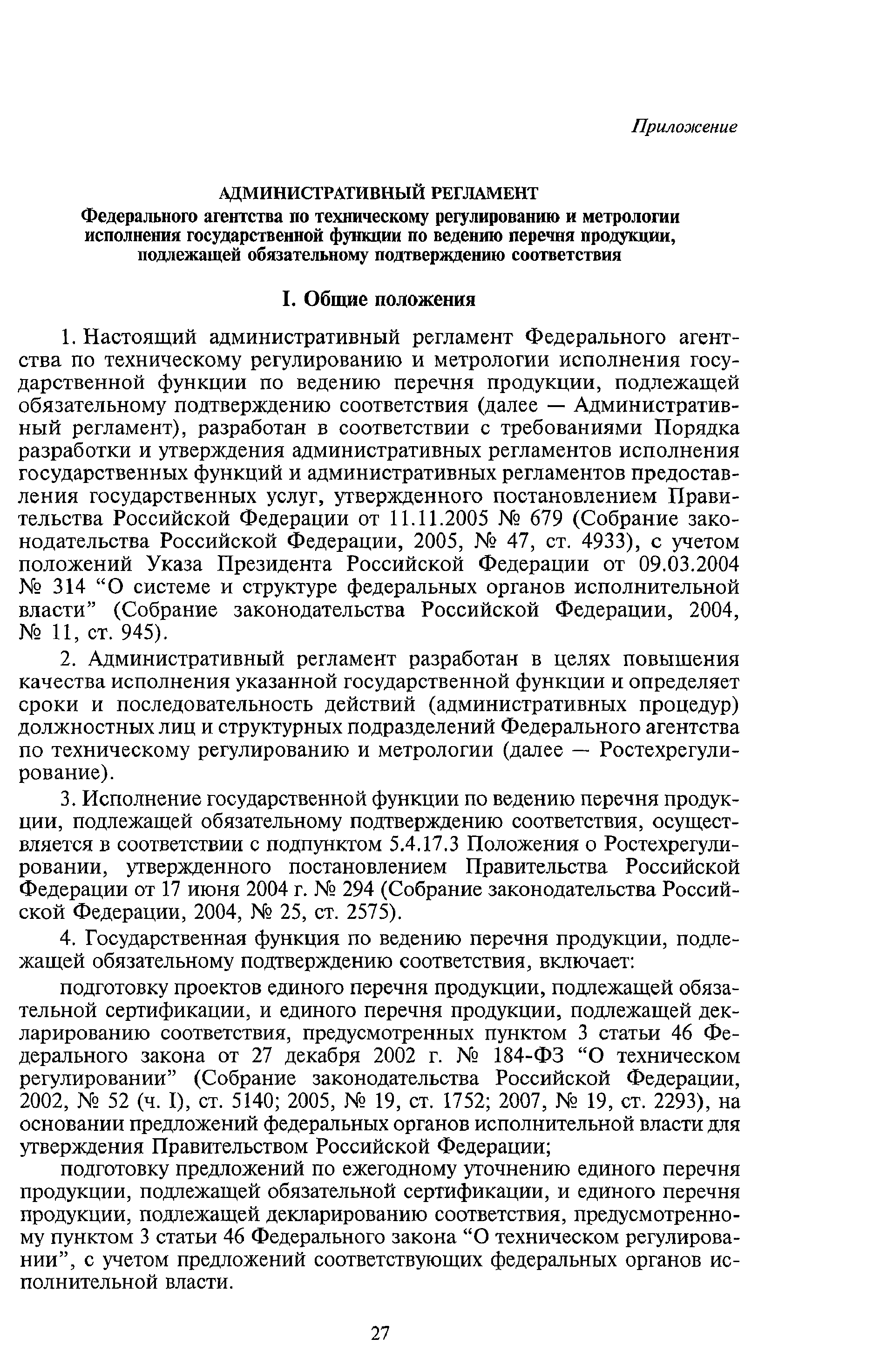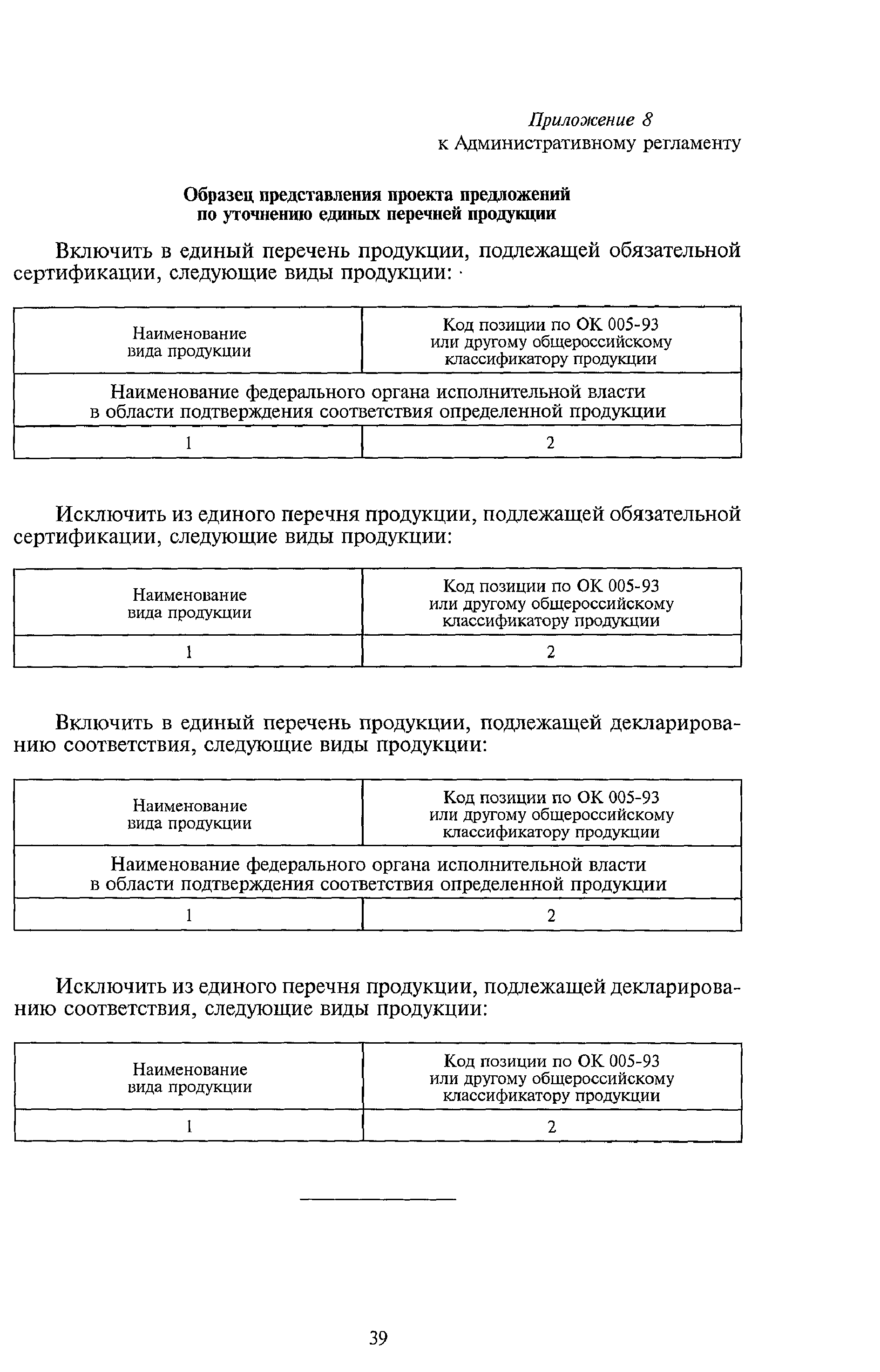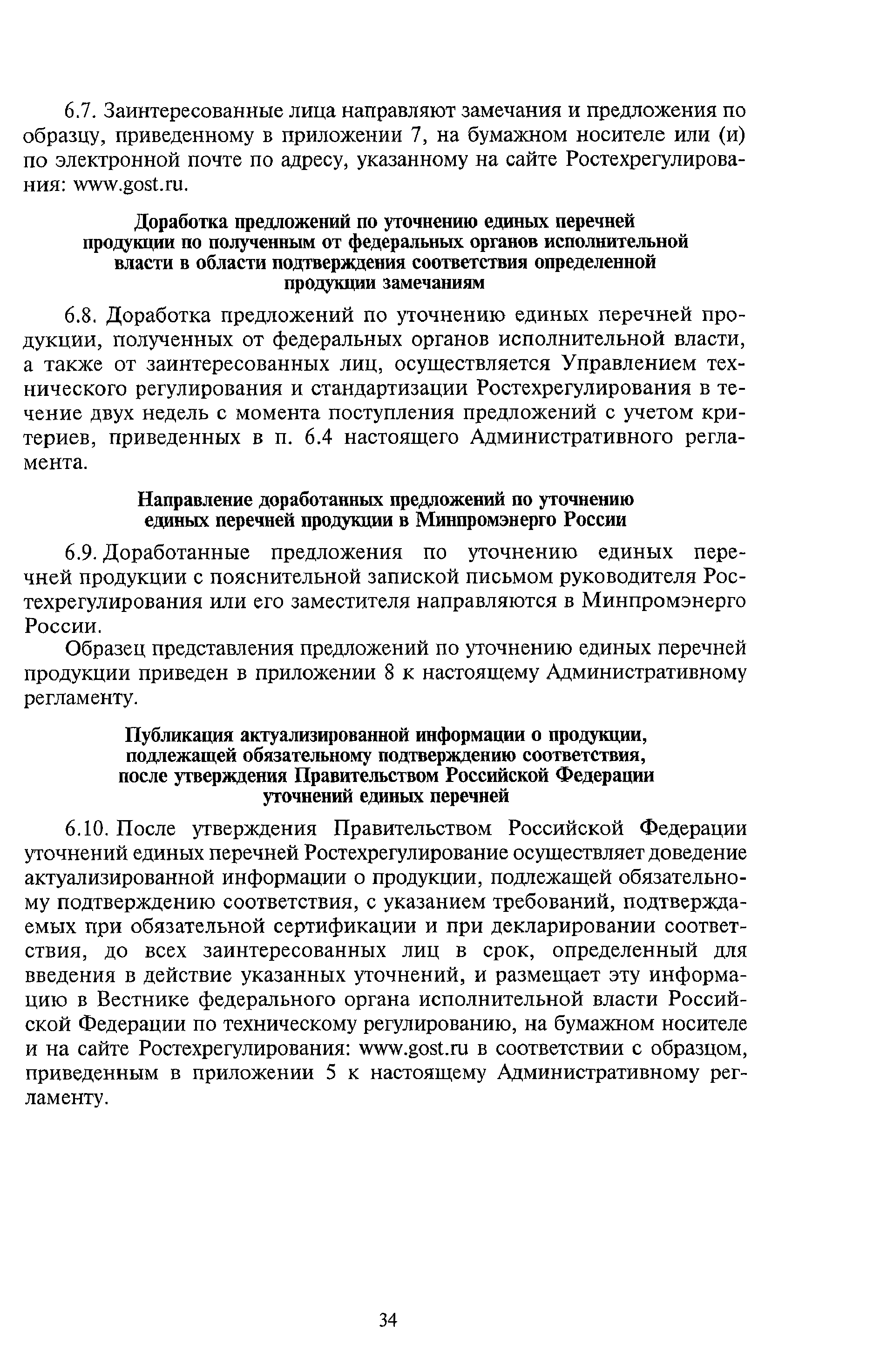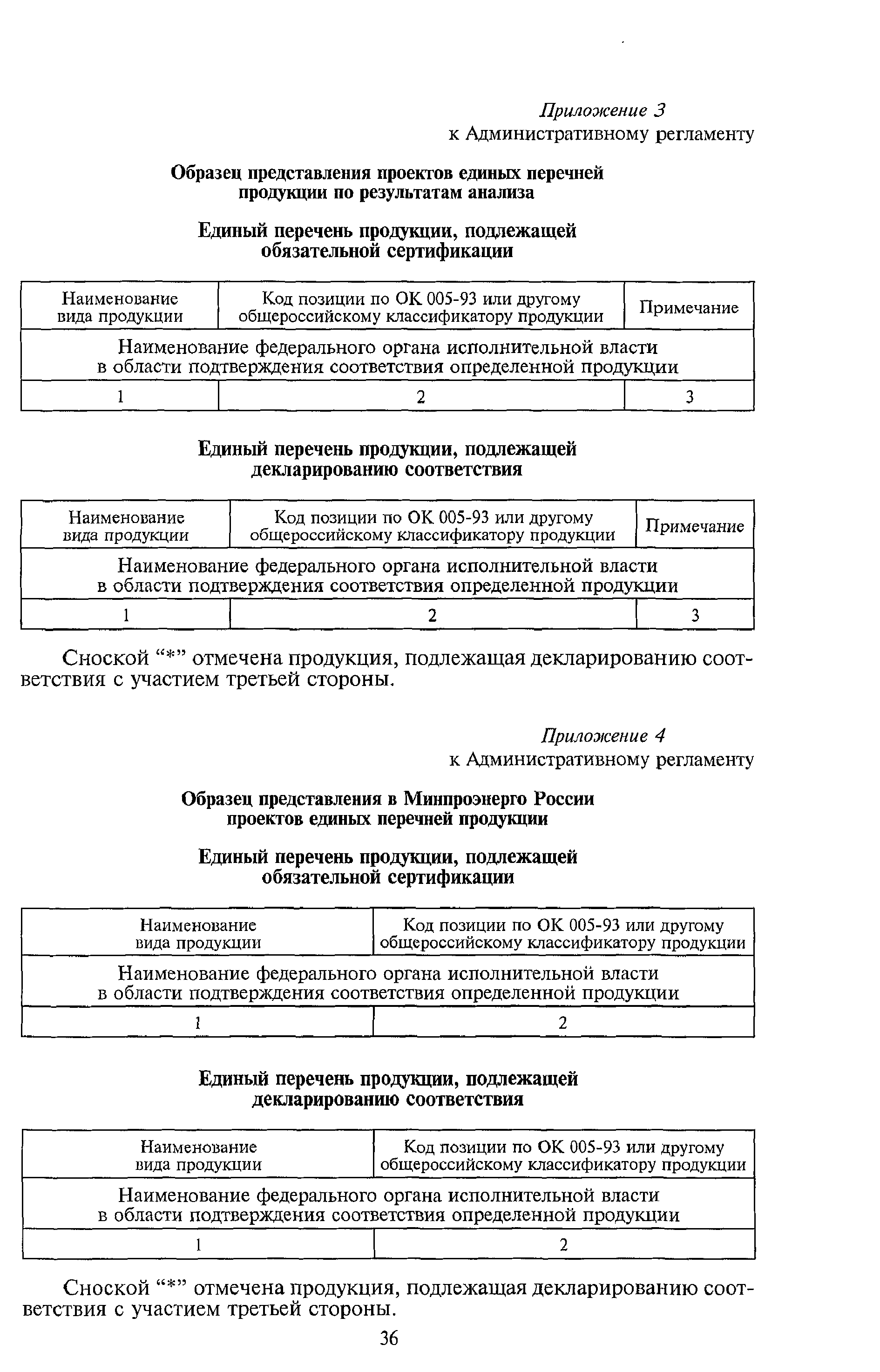| Оглавление: | I. Общие положения II. Административные процедуры Приложение 1. Схема действий при осуществлении государственной функции по подготовке проектов перечня продукции, подлежащей обязательному подтверждению соответствия, и единого перечня продукции, подлежащей декларированию соответствия Приложение 2. Образец представления информации об объектах обязательного подтверждения соответствия для формирования единых перечней продукции Приложение 3. Образец представления проектов единых перечней продукции по результатам анализа Приложение 4. Образец представления в Минпроэнерго РФ проектов единых перечней продукции Приложение 5. Образец представления информации о продукции, подлежащей обязательному подтверждению соответствия Приложение 6. Схема действий при осуществлении государственной функции по уточнению перечня продукции, подлежащей обязательной сертификации, и единого перечня продукции, подлежащей декларированию соответствия Приложение 7. Образец представления информации для уточнения единых перечней продукции Приложение 8. Образец представления проекта предложений по уточнению единых перечней продукции |