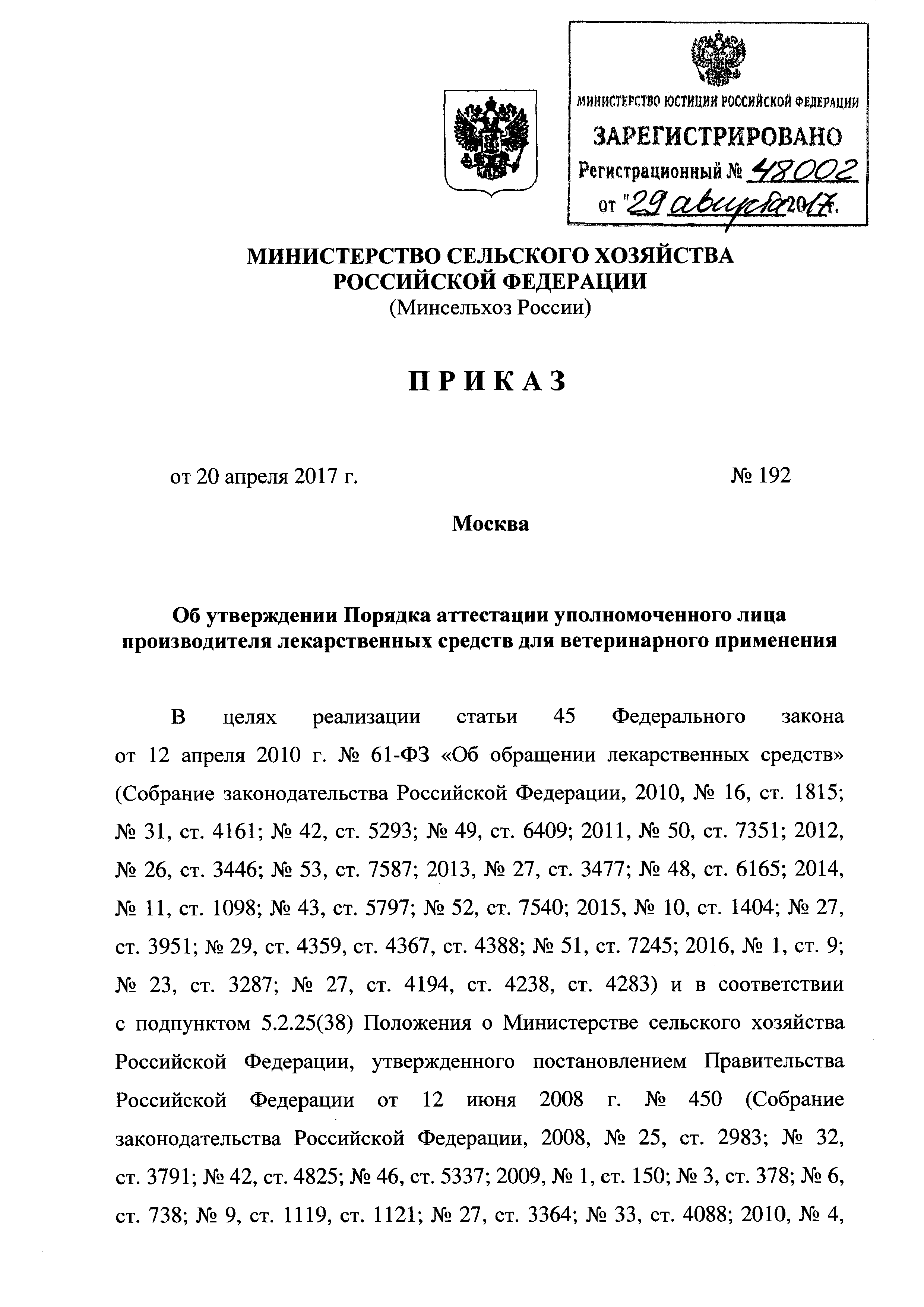| Утверждён: | 20.04.2017 Министерство сельского хозяйства Российской Федерации (192) Министерство сельского хозяйства и продовольствия РФ