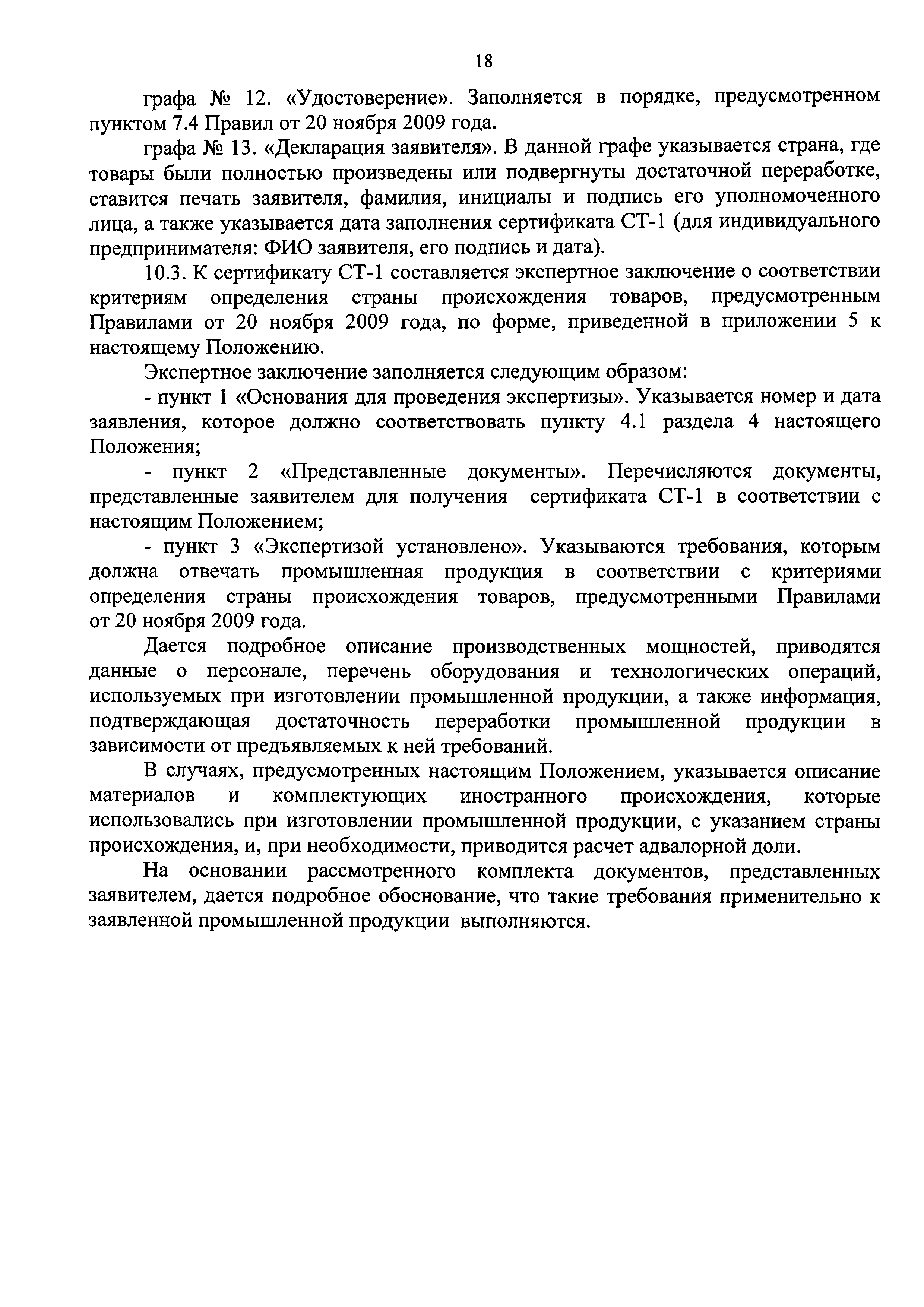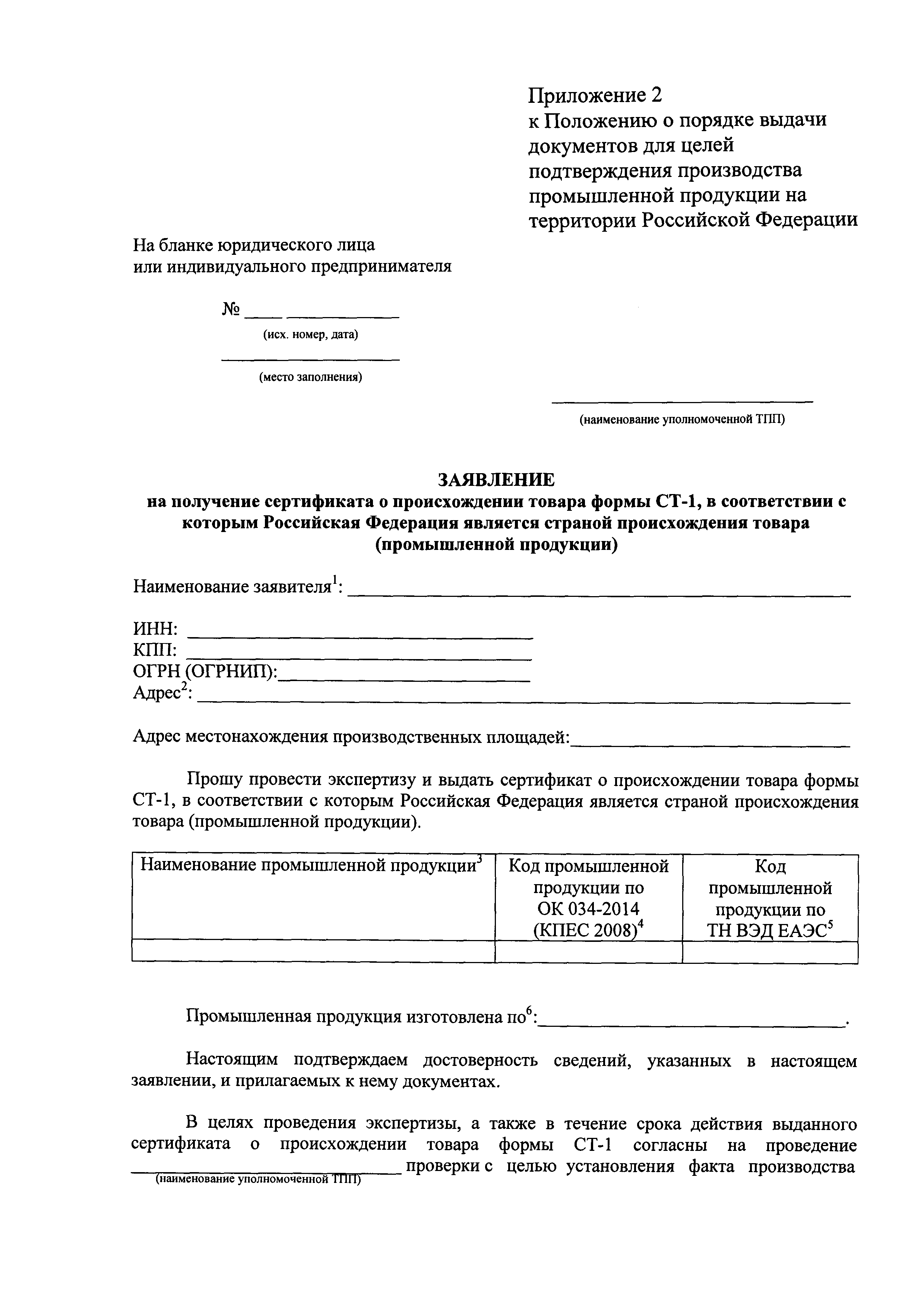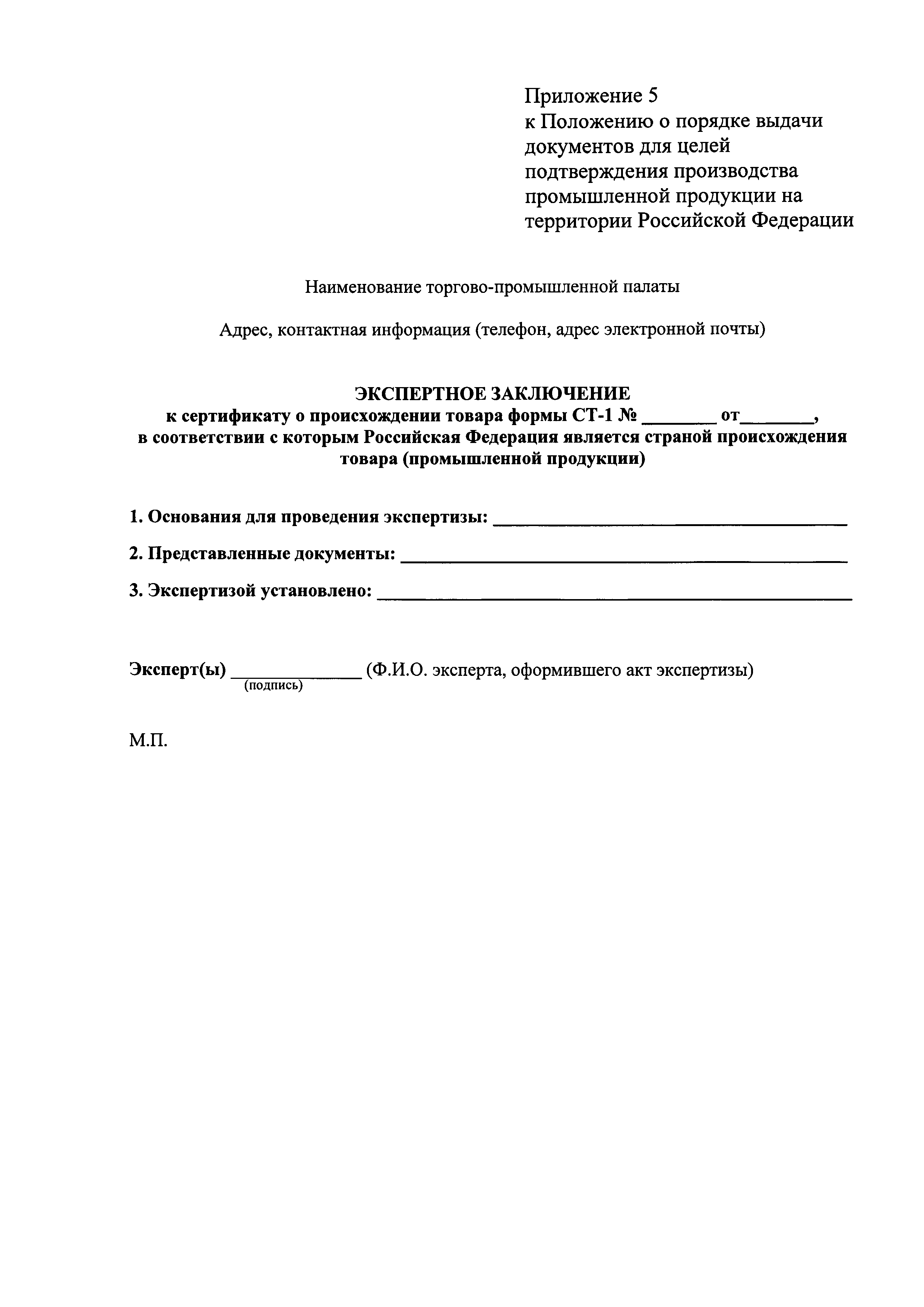 | Оглавление: | Раздел 1. Основные понятия, используемые в Положении Раздел 2. Общие положения Раздел 3. Условия и особенности выдачи актов экспертизы и сертификатов СТ-1 Раздел 4. Документы, необходимые для получения акта экспертизы или сертификата СТ-1 Раздел 5. Порядок представления заявителем сведений и документов для выдачи акта экспертизы Раздел 6. Порядок принятия и рассмотрения документов для выдачи актов экспертизы или сертификатов СТ-1 Раздел 7. Порядок проведения выездной проверки Раздел 8. Приостановление, возобновление или отмена действия акта экспертизы или сертификата СТ-1 Раздел 9. Форма и порядок заполнения акта экспертизы Раздел 10. Форма и порядок заполнения сертификата СТ-1 Приложение 1. Заявление на получение акта экспертизы о соответствии производимой промышленной продукции требованиям, предъявляемым в целях ее отнесения к продукции, произведенной на территории Российской Федерации Приложение. Опись документов на получение акта экспертизы о соответствии производимой промышленной продукции требованиям, предъявляемым в целях ее отнесения к продукции, произведенной на территории Российской Федерации Приложение 2. Заявление на получение сертификата о происхождении товара формы СТ-1, в соответствии с которым Российская Федерация является страной происхождения товара (промышленной продукции) Приложение. Опись документов на получение сертификата о происхождении товара формы СТ-1, в соответствии с которым Российская Федерация является страной происхождения товара (промышленной продукции) Приложение 3. Акт проверки Приложение 4. Акт экспертизы о соответствии производимой промышленной продукции требованиям, предъявляемым в целях ее отнесения к продукции, произведенной на территории Российской Федерации Приложение 5. Экспертное заключение к сертификату о происхождении товара формы СТ-1, в соответствии с которым Российская Федерация является страной происхождения товара (промышленной продукции) Приложение 6. Справка о деятельности предприятия |
